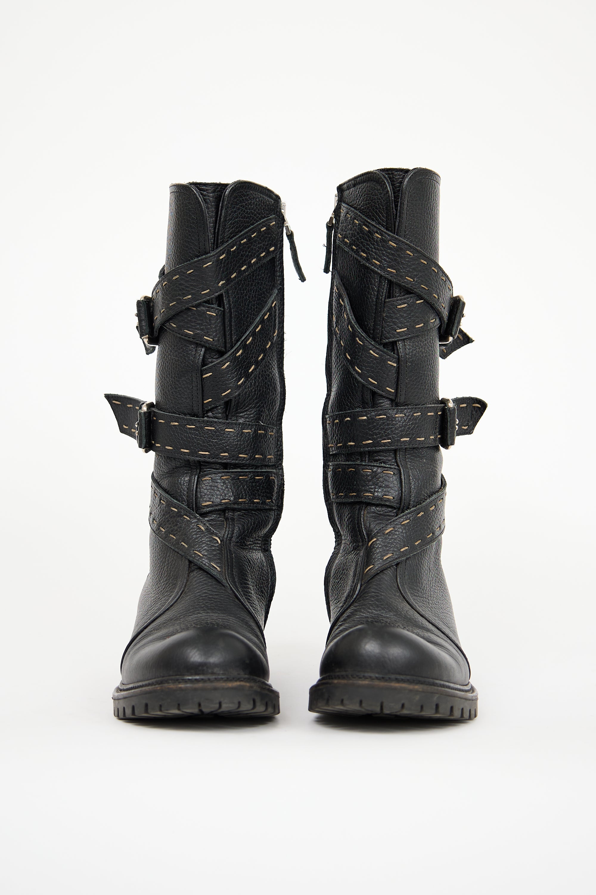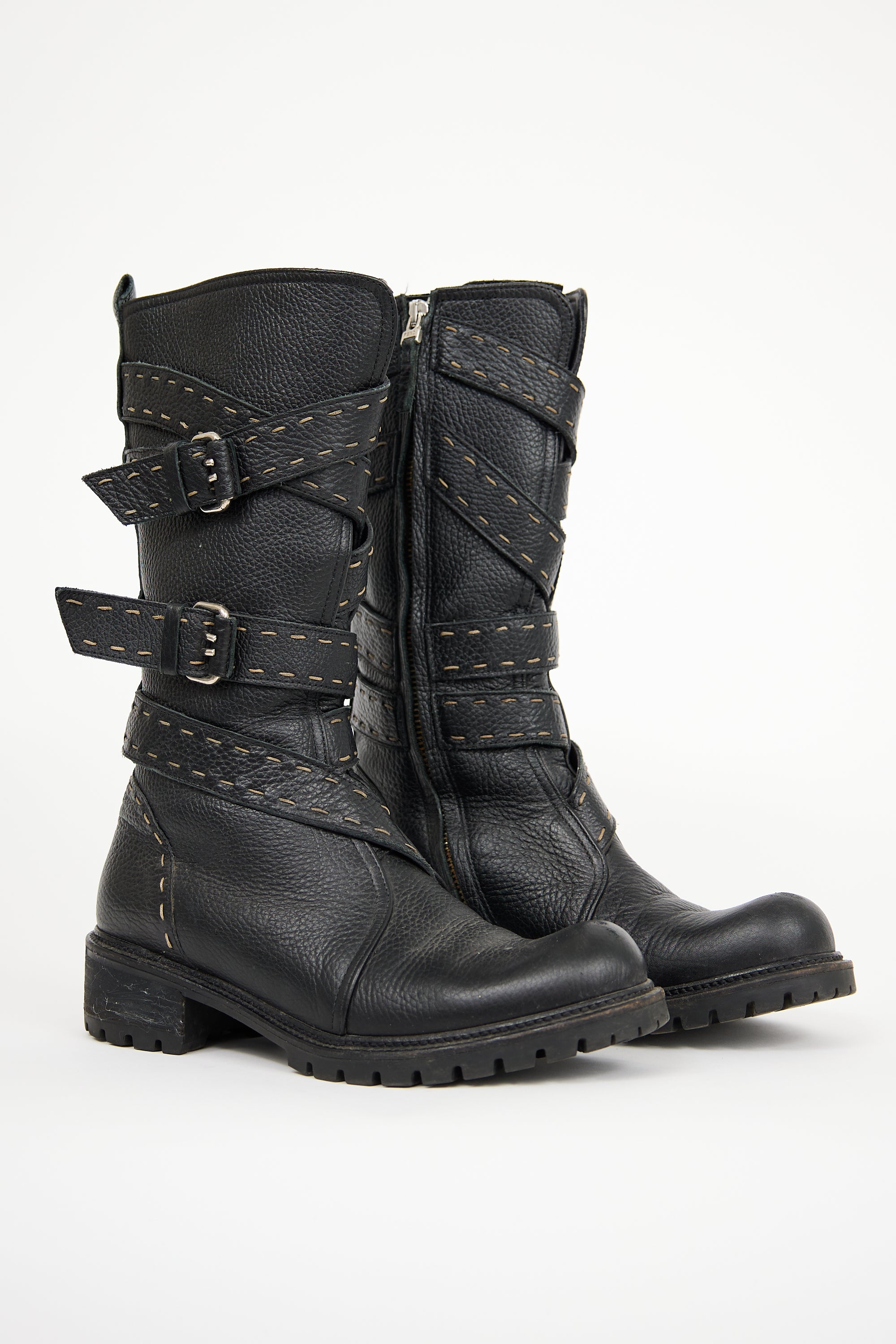 Pre-owned Fendi black leather combat boots featuring a rounded toe, wrap around straps with whipstitch and silver tone decorative buckles, and concealed zip closure at sides.