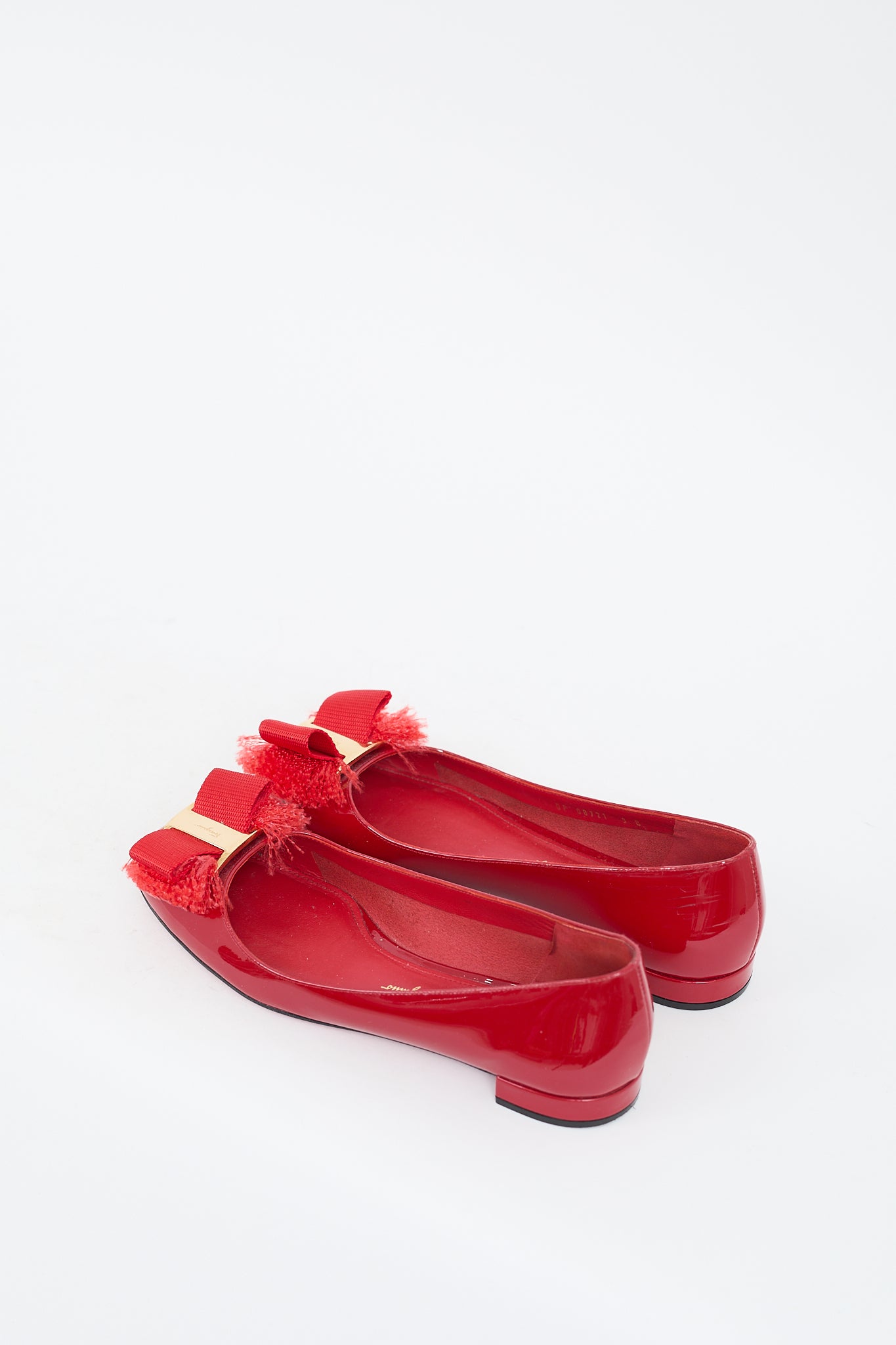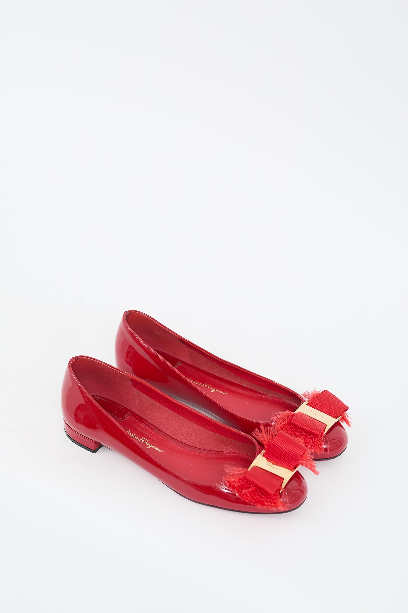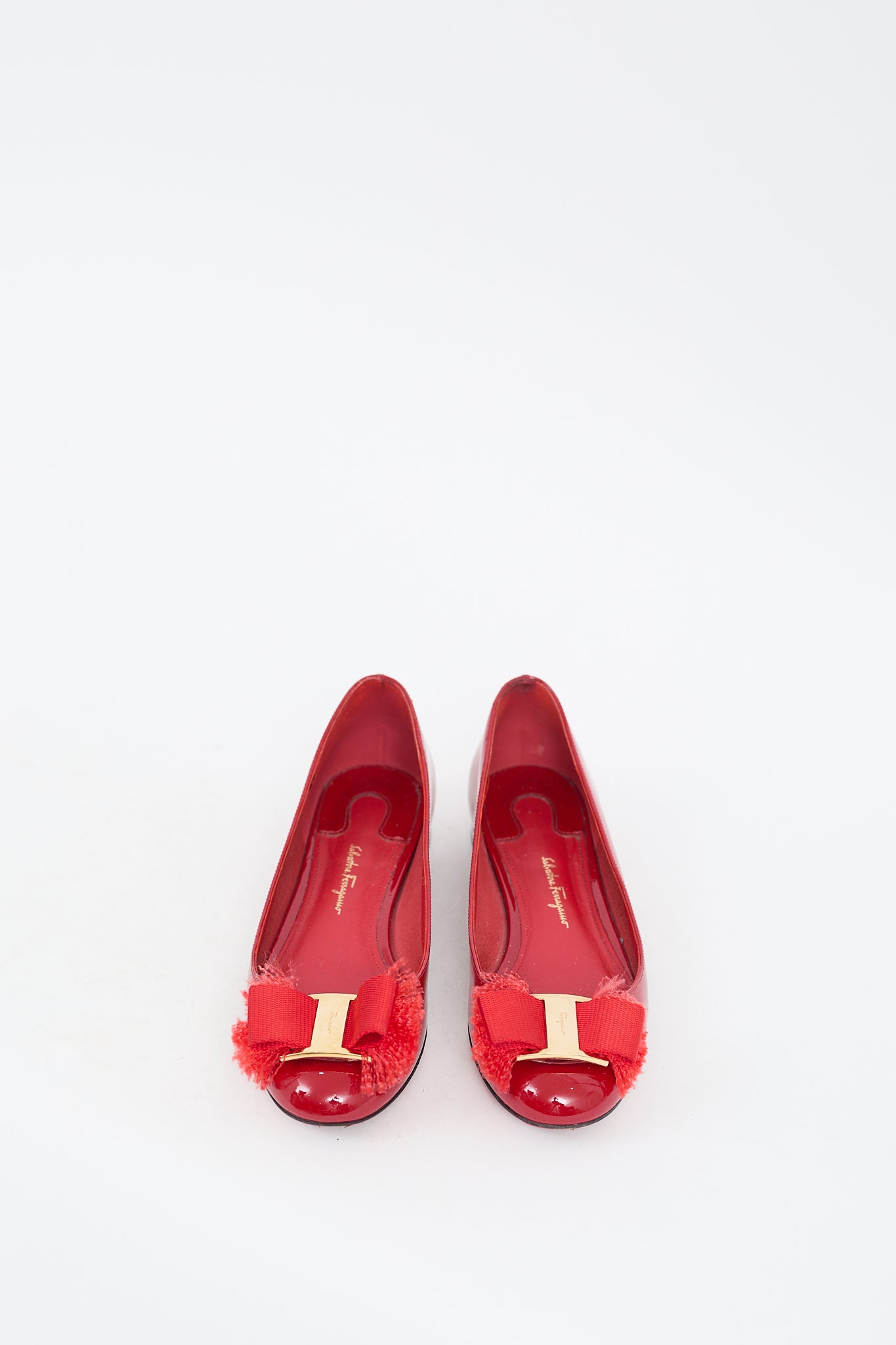 Pre-owned Ferragamo red Marlia ballet flats featuring a rounded toe, patent leather upper, fringe bow with gold tone etched logo hardware detail at vamp, and covered block heel.