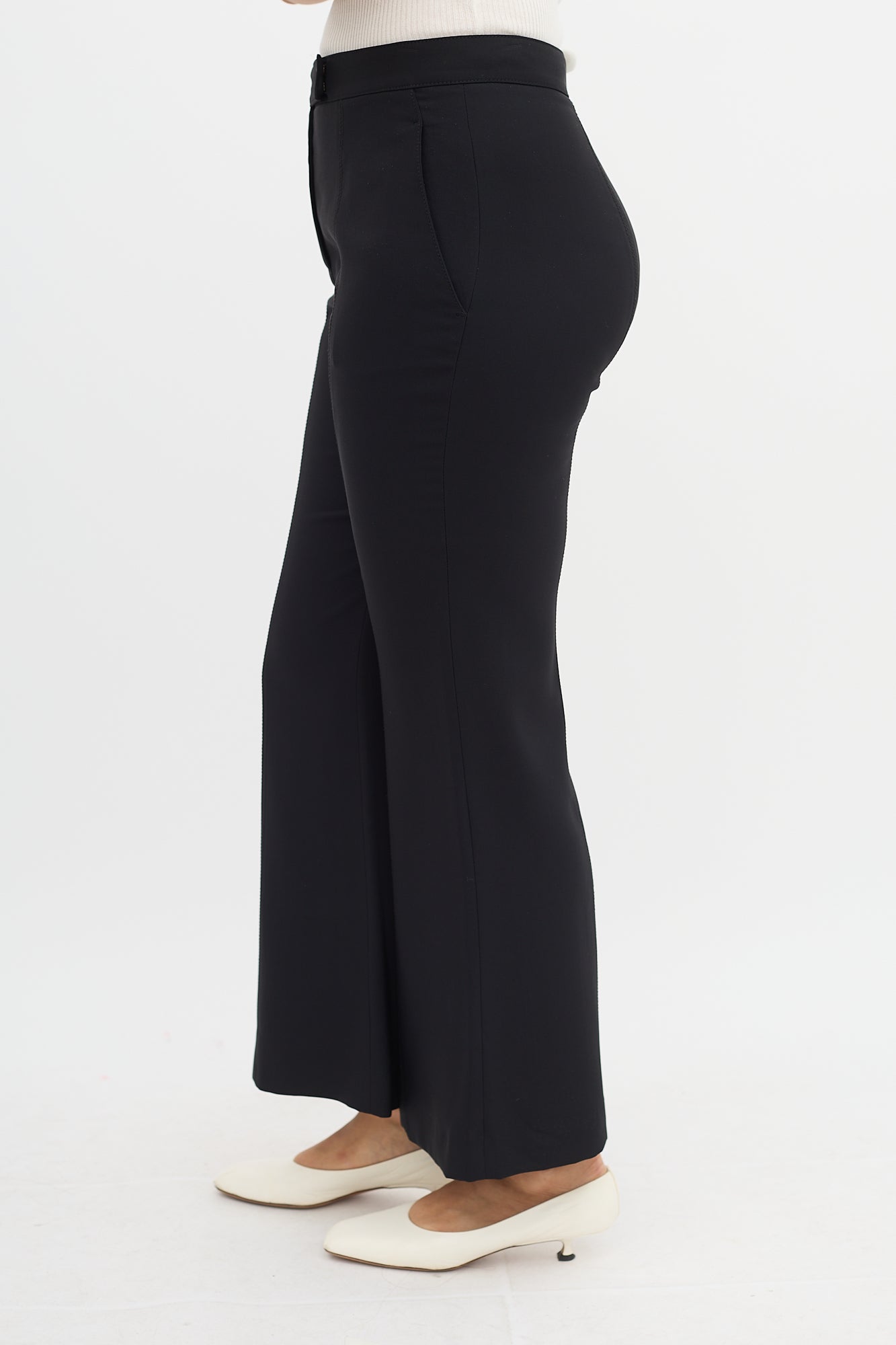 Pre-owned Gabriela Hearst black Leda trousers featuring high waist, flared leg, two front slash pockets, zip fly, and tonal topstitching. Clipped to fit model.