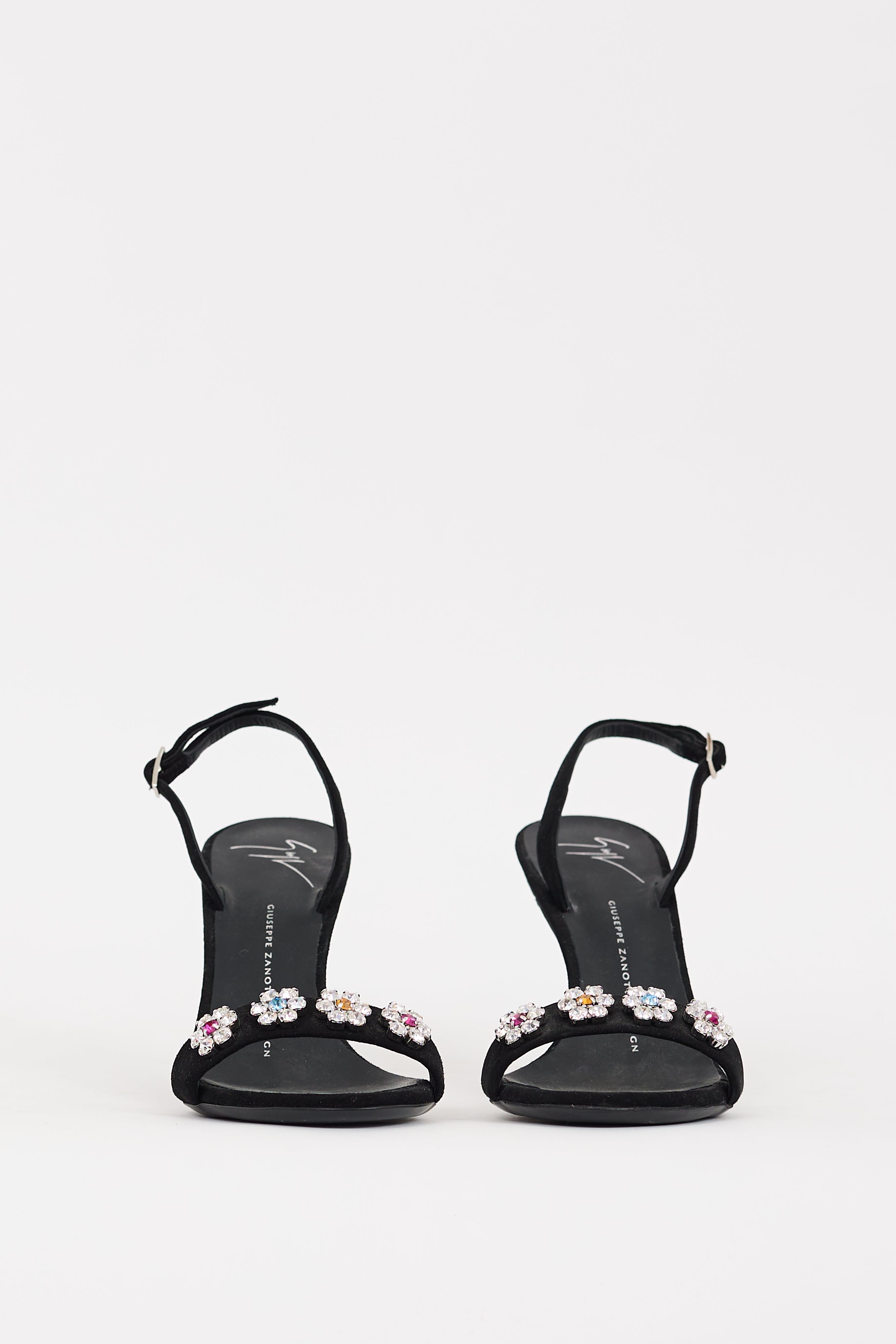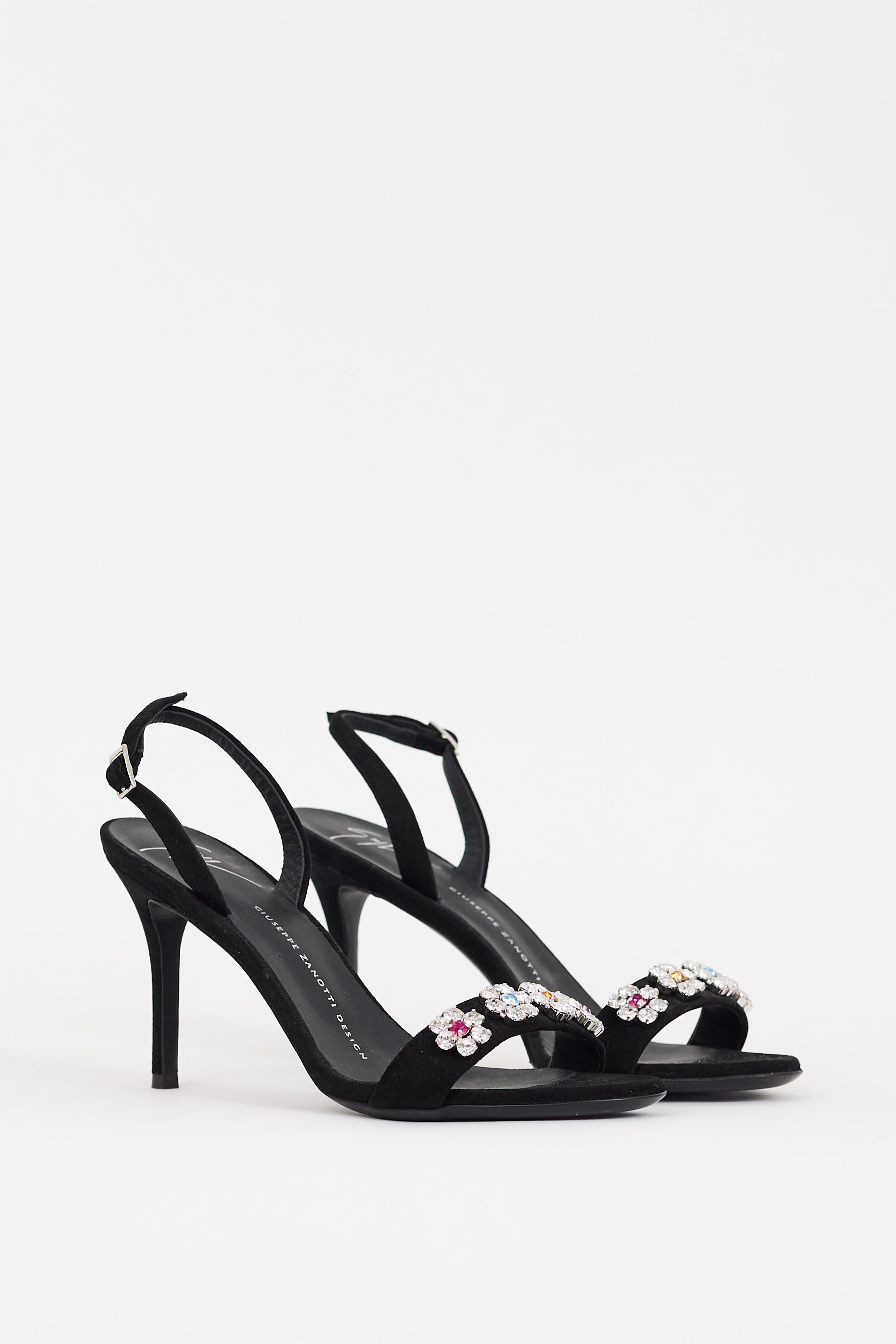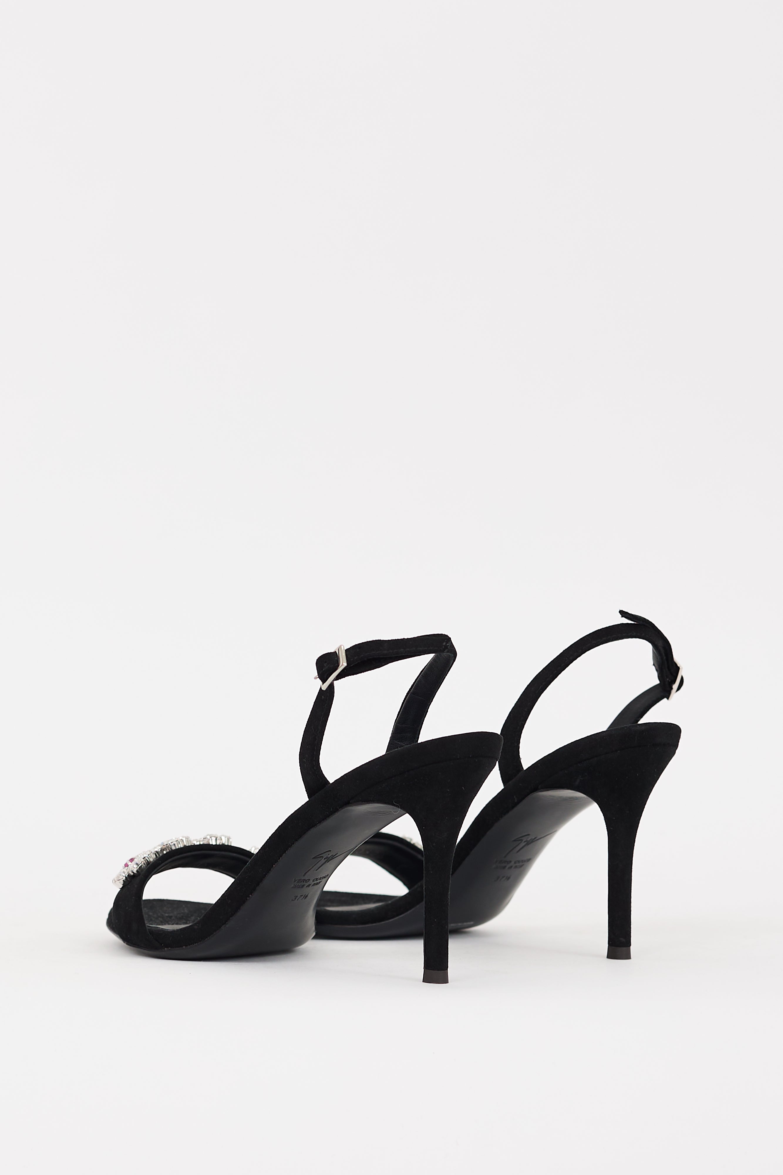 Pre-owned Giuseppe Zanotti black suede heels featuring open rounded toe, vamp strap with multicolour crystal embellishment, ankle strap with buckle fastening, and covered stiletto heel.