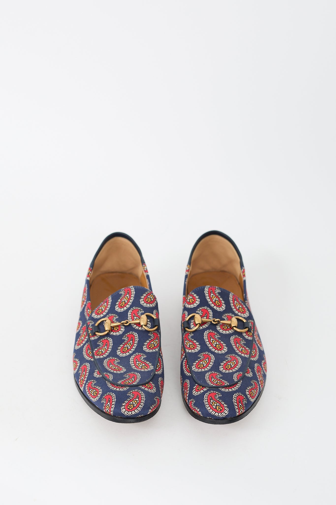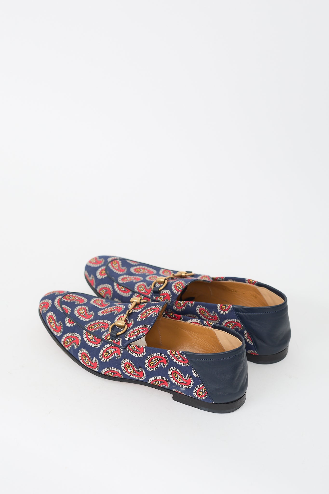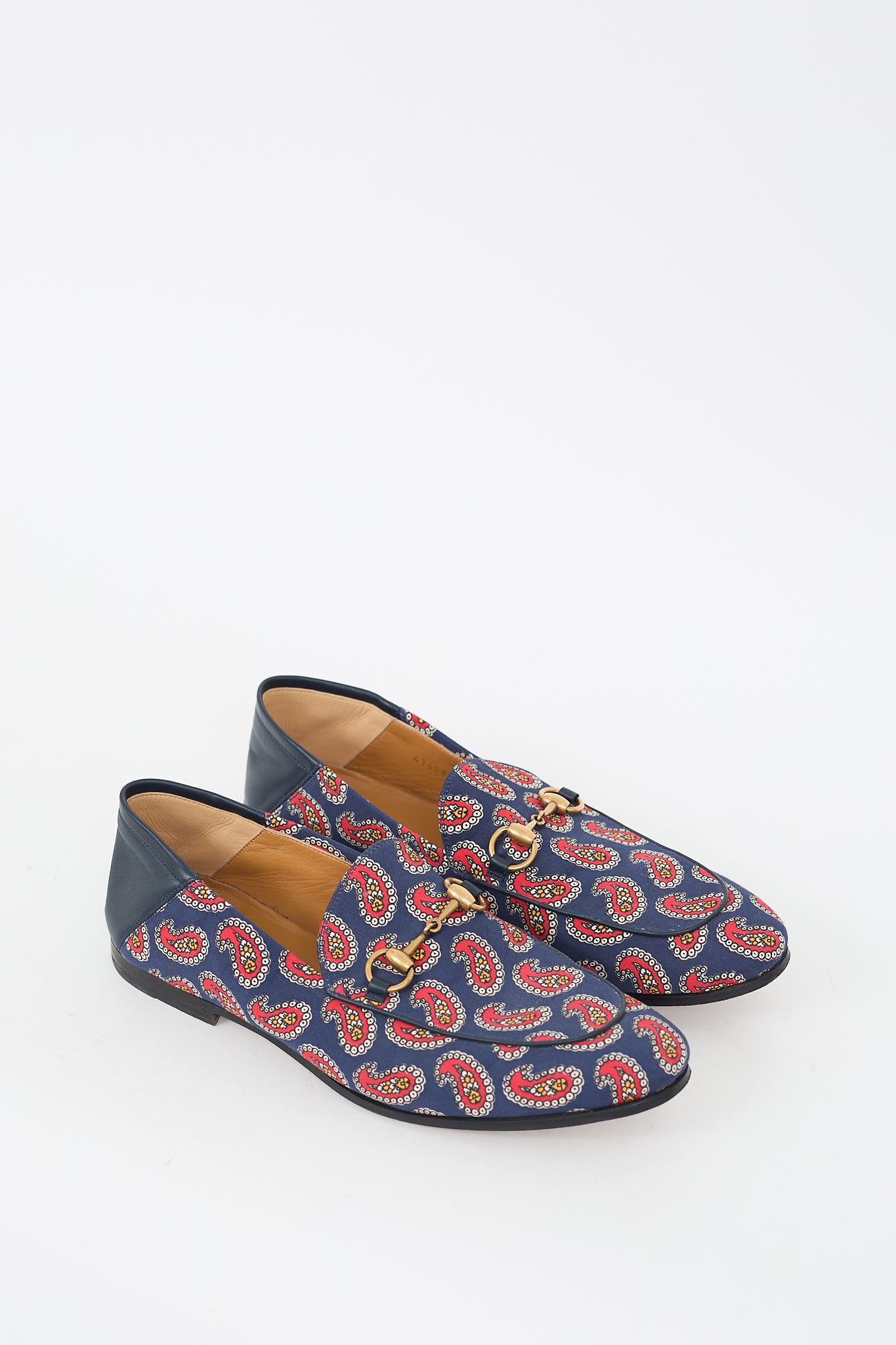 Pre-owned Gucci blue and red canvas Jordaan loafers featuring almond toe, paisley print upper, gold tone Horsebit at vamp, leather collapsible counter, slip on entry, and low stacked heel.