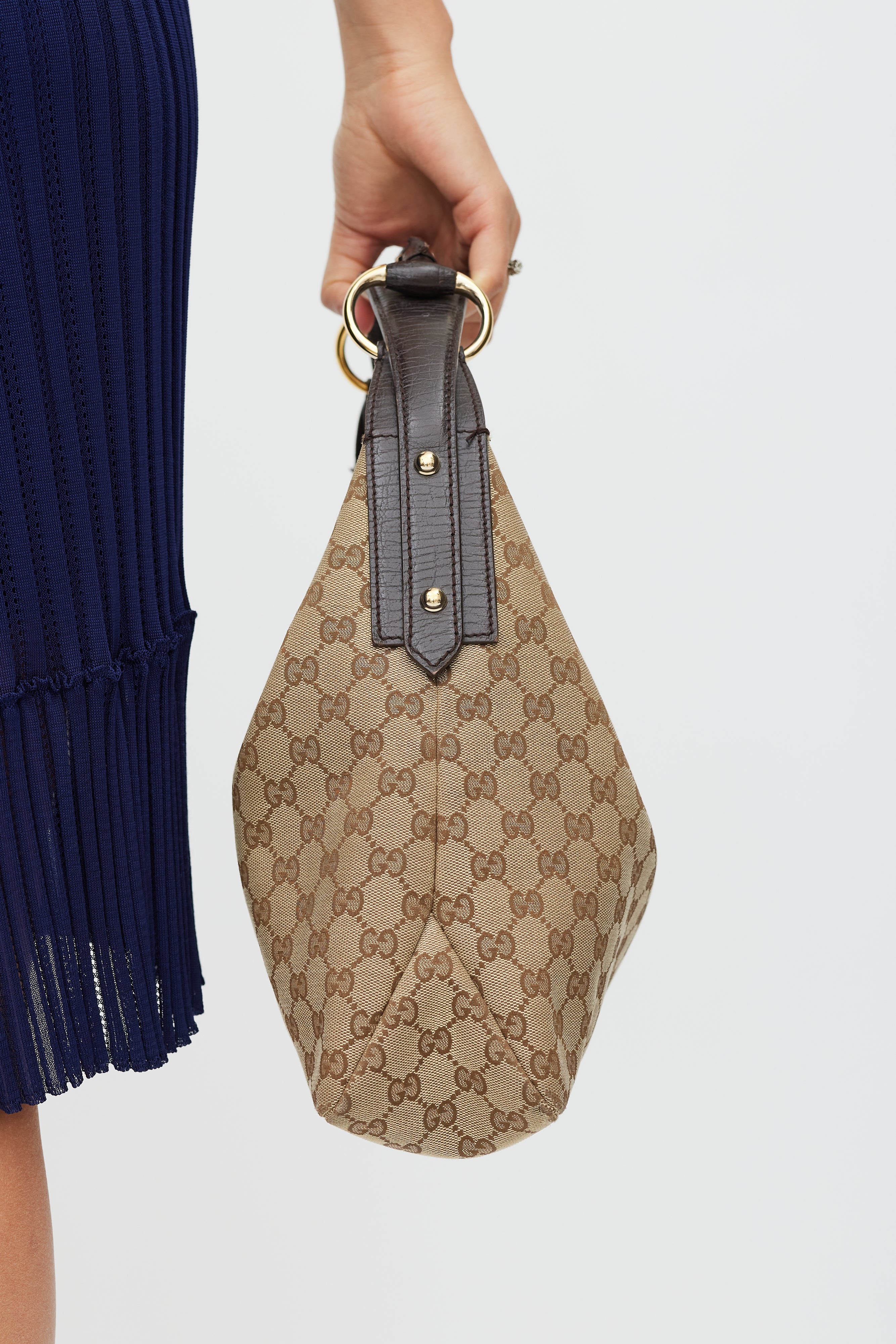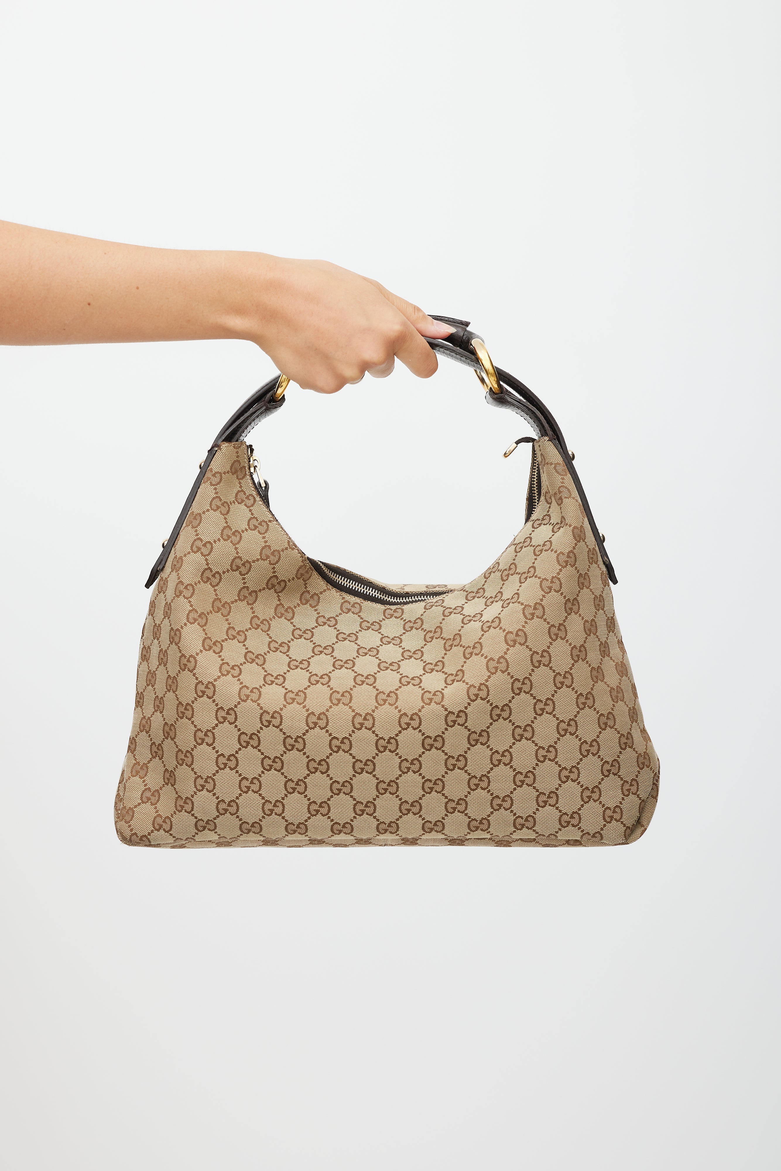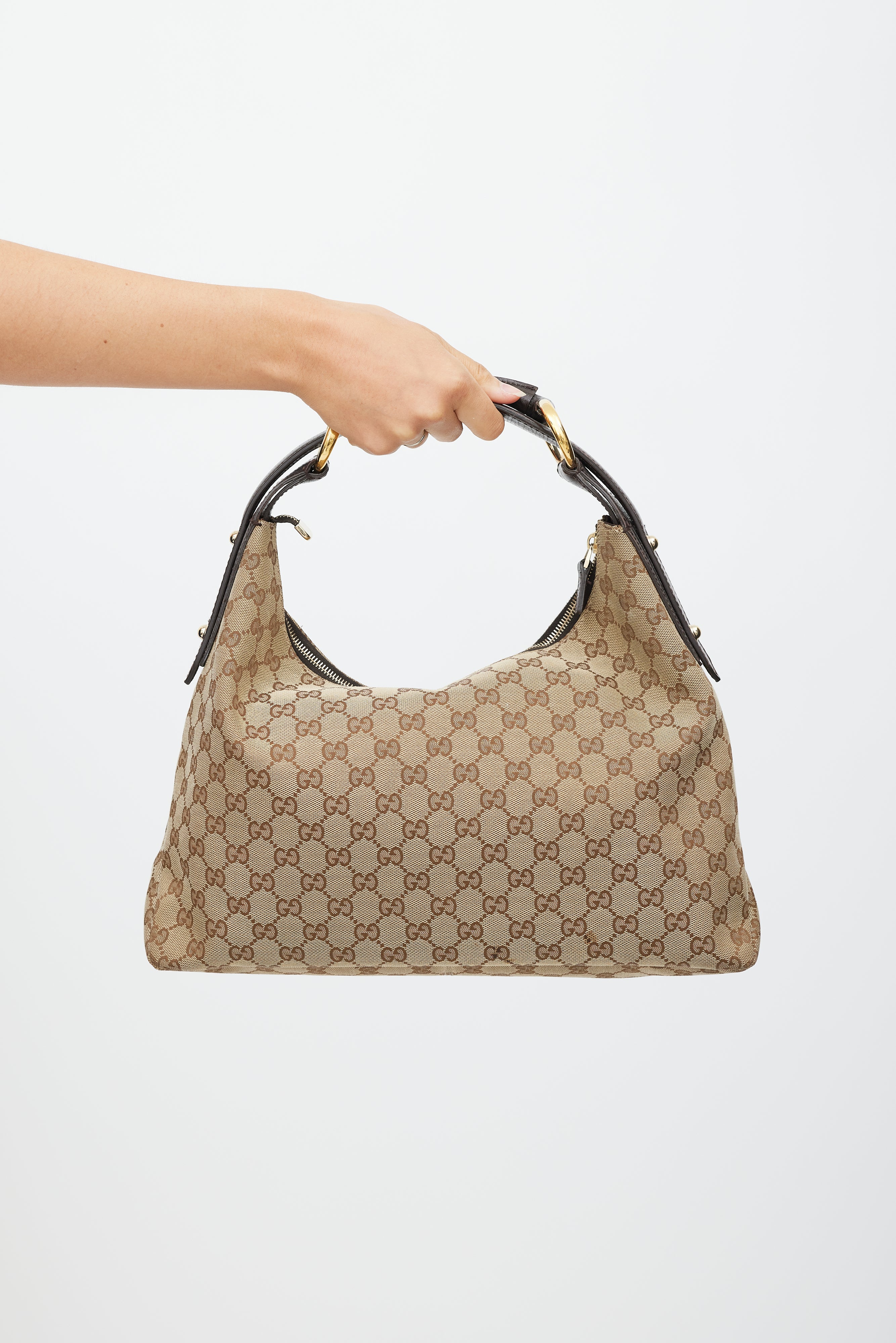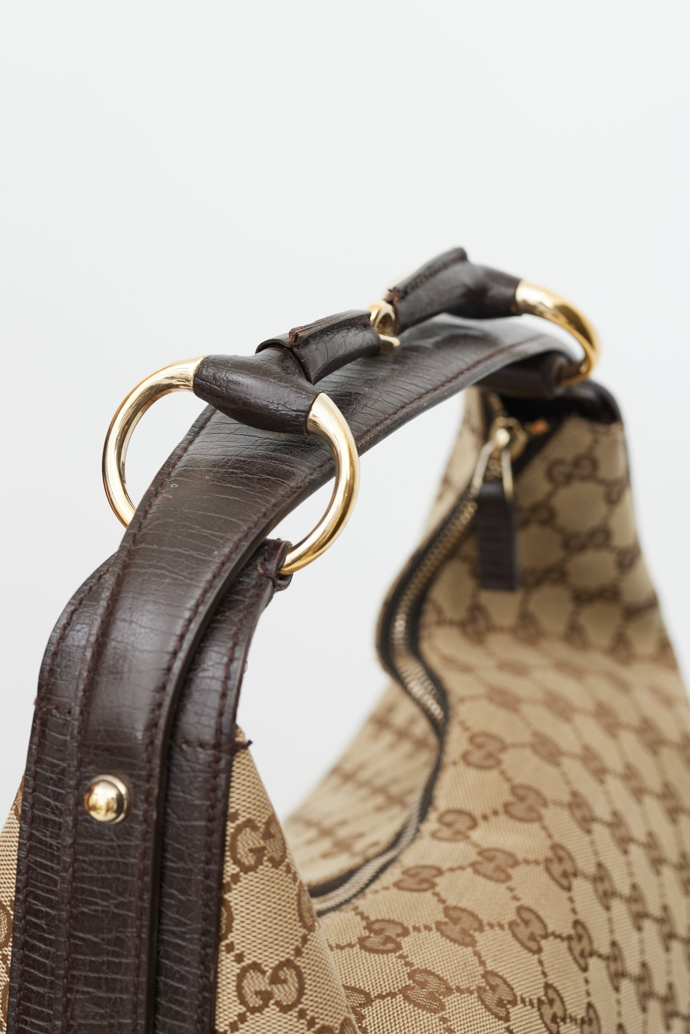 Pre-owned Gucci brown shoulder bag in GG monogram coated canvas featuring a leather shoulder strap with gold tone horsebit hardware, one main compartment with one zip pocket, and top zip closure.