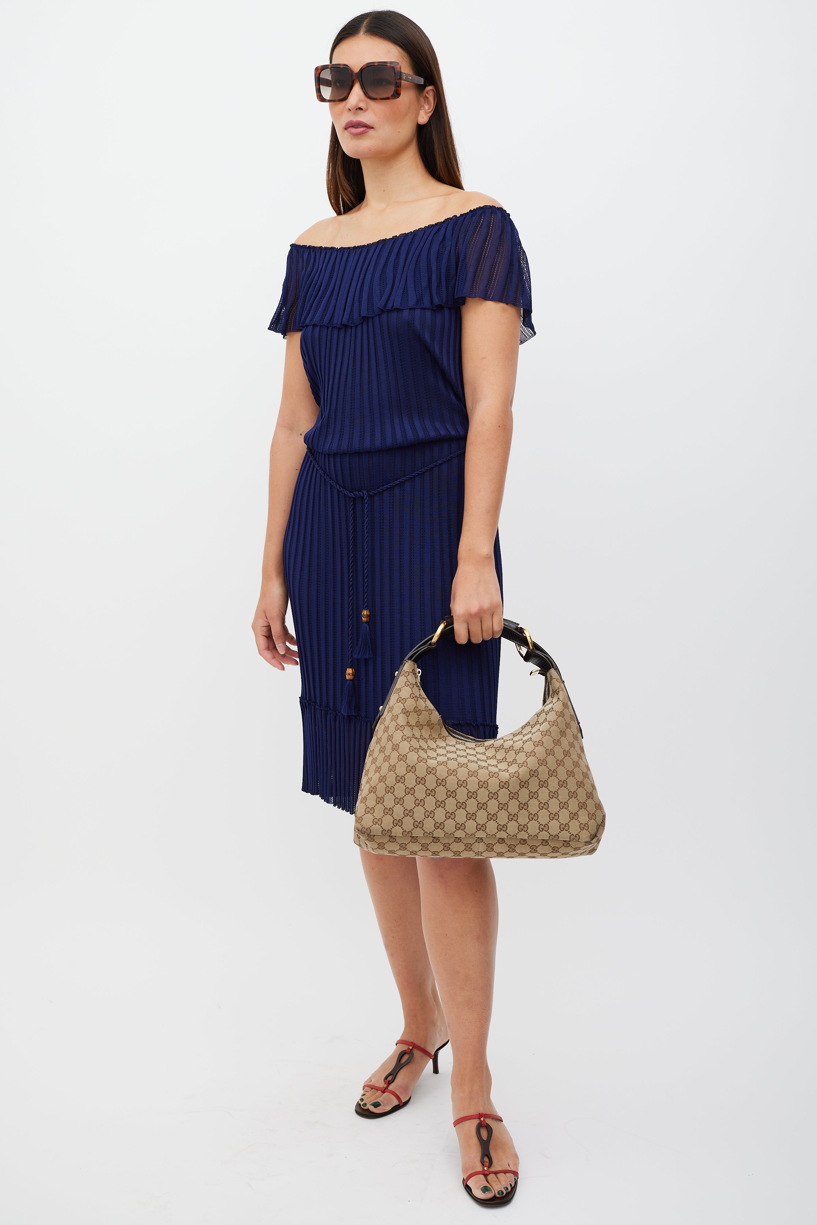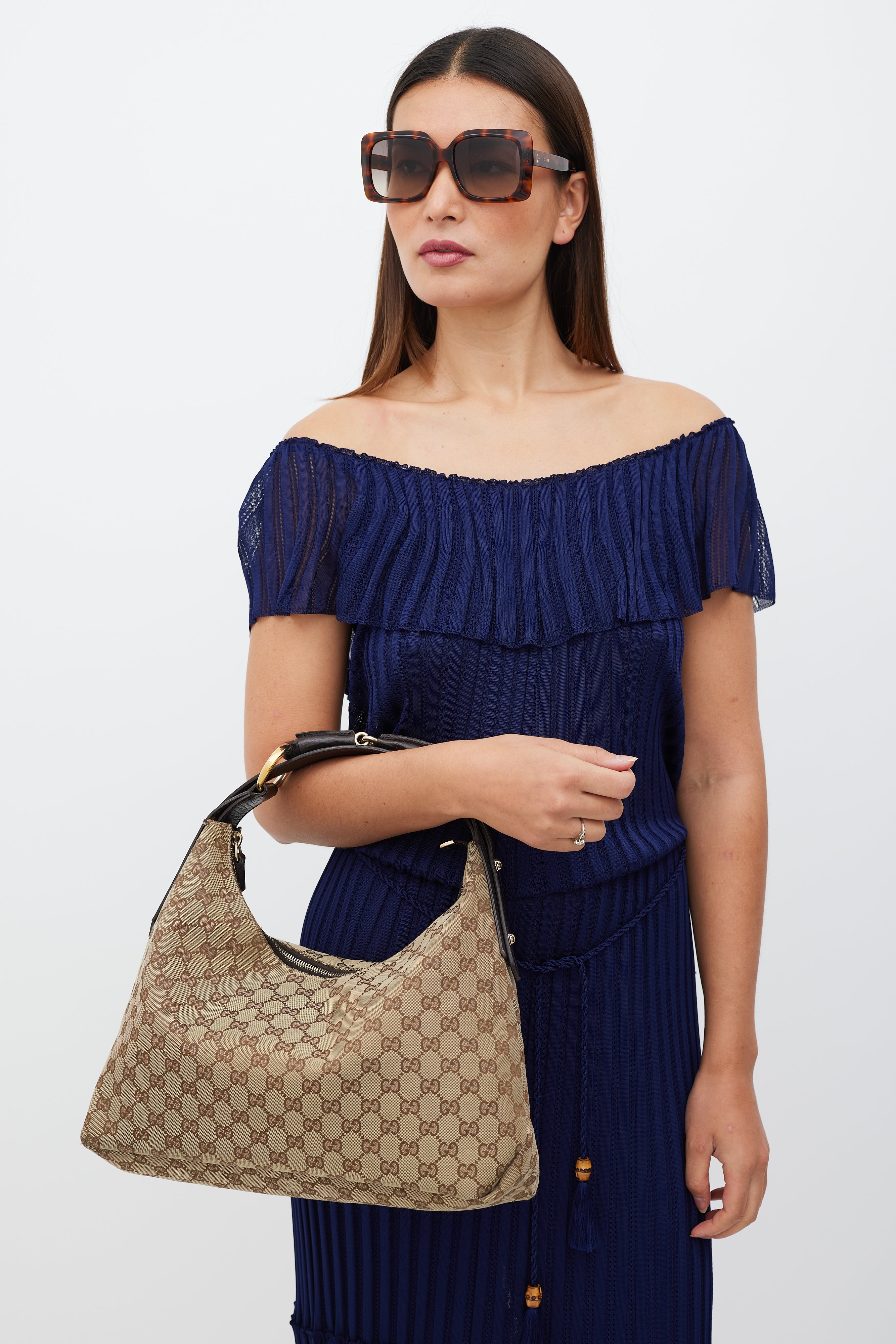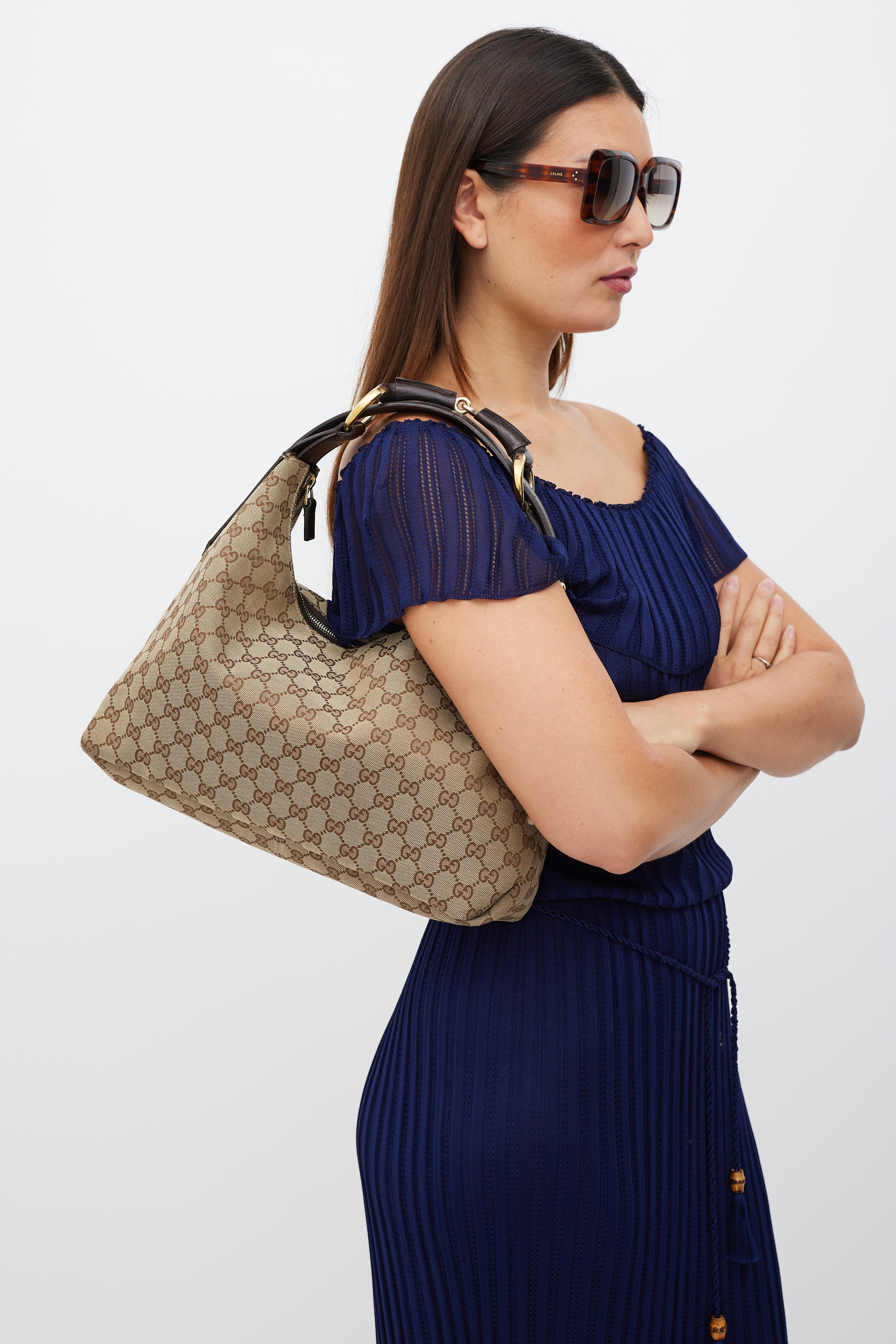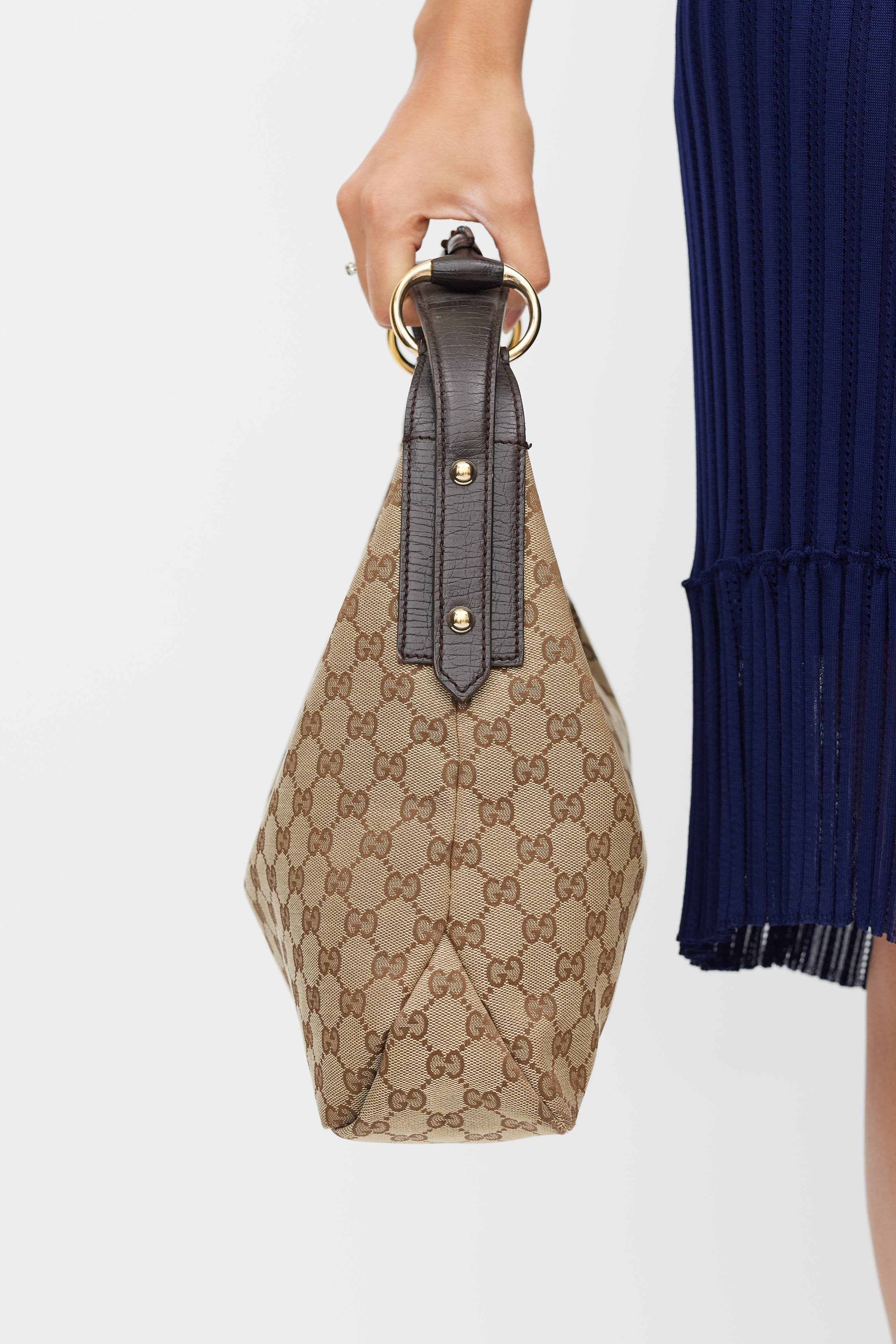 Pre-owned Gucci brown shoulder bag in GG monogram coated canvas featuring a leather shoulder strap with gold tone horsebit hardware, one main compartment with one zip pocket, and top zip closure.