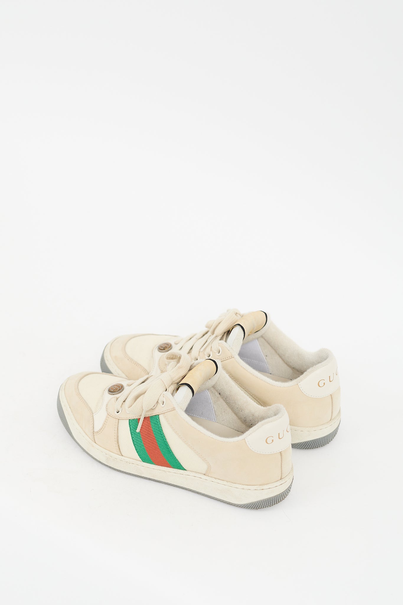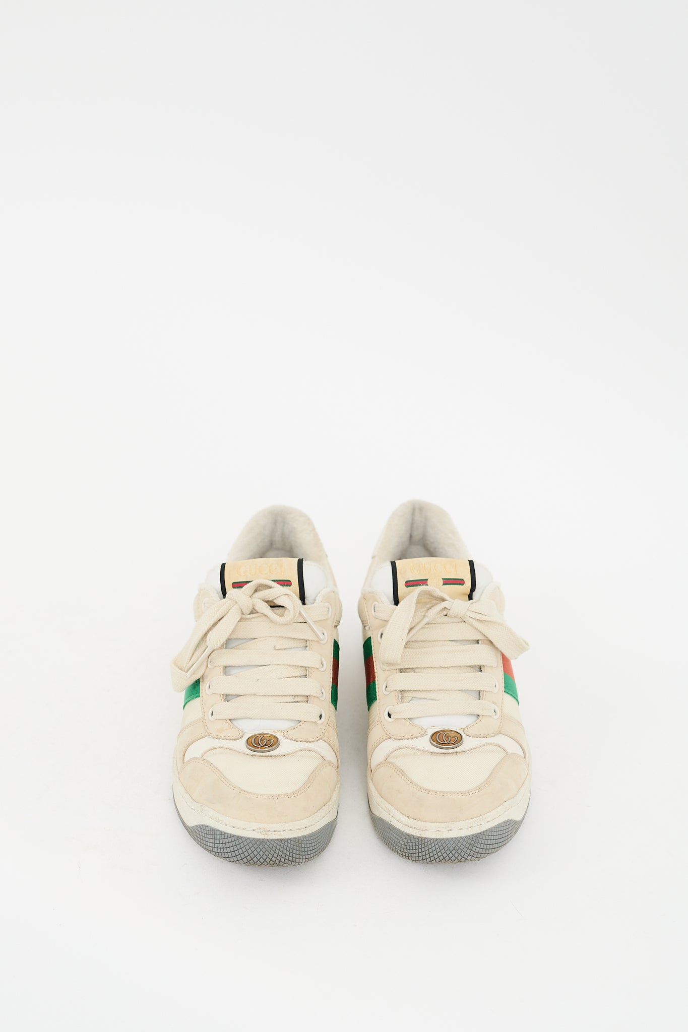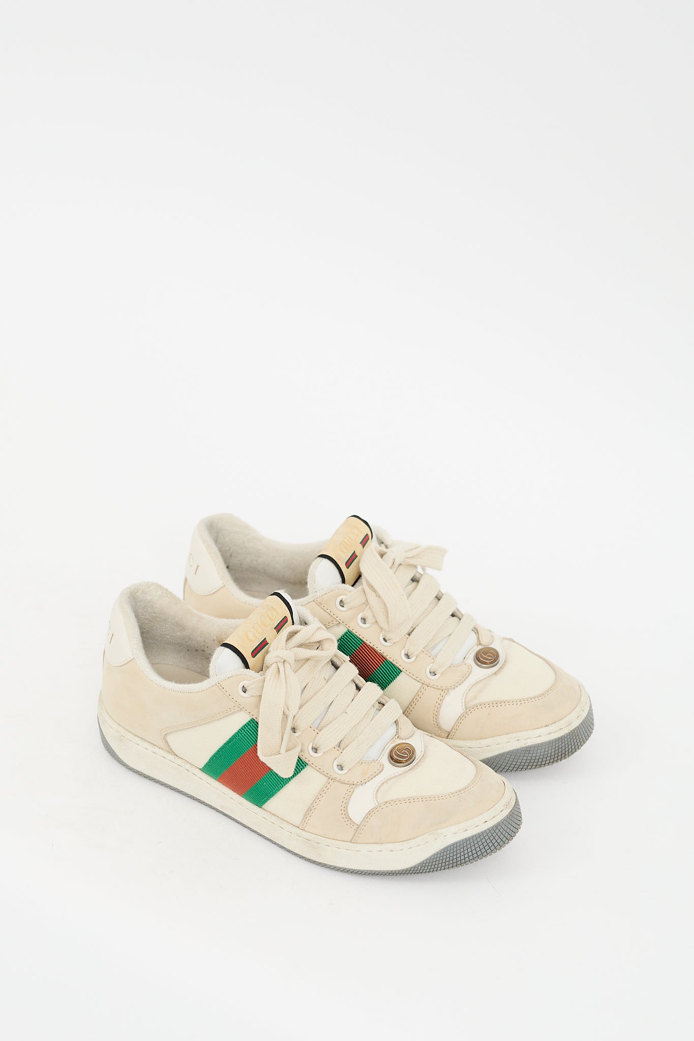 Pre-owned Gucci cream and multicolour Screener sneakers featuring rounded toe, GG logo hardware at vamp, lace up front, label at tongue, red and green signature grosgrain Web at sides, gold stamped logo at counter, terry interior, and rubber sole. Comes with original dust bag.