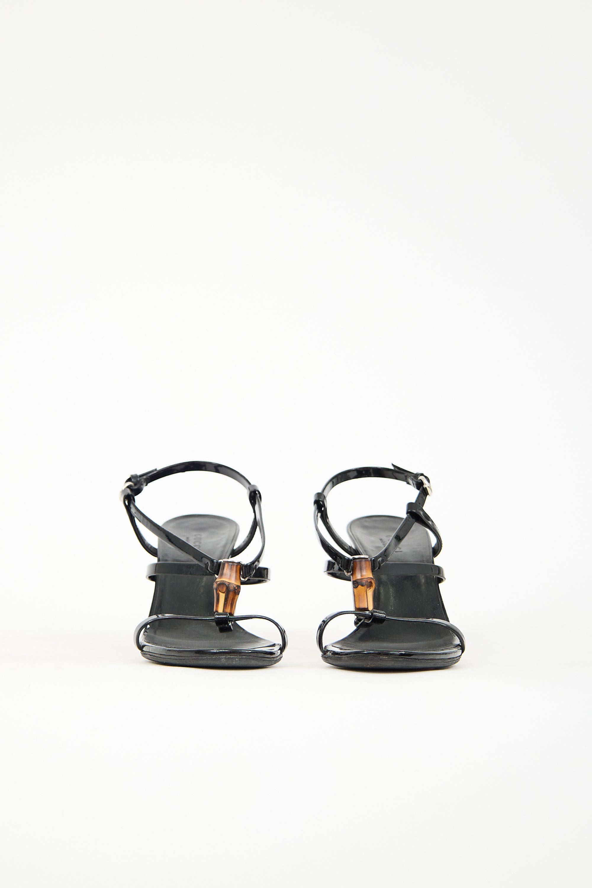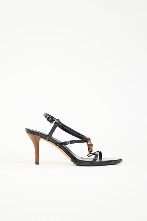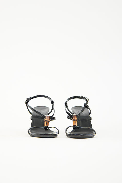Pre-owned Gucci black patent leather sandals featuring open rounded toe, bamboo embellished T-strap, silver tone hardware, adjustable ankle strap, and a wood heel.