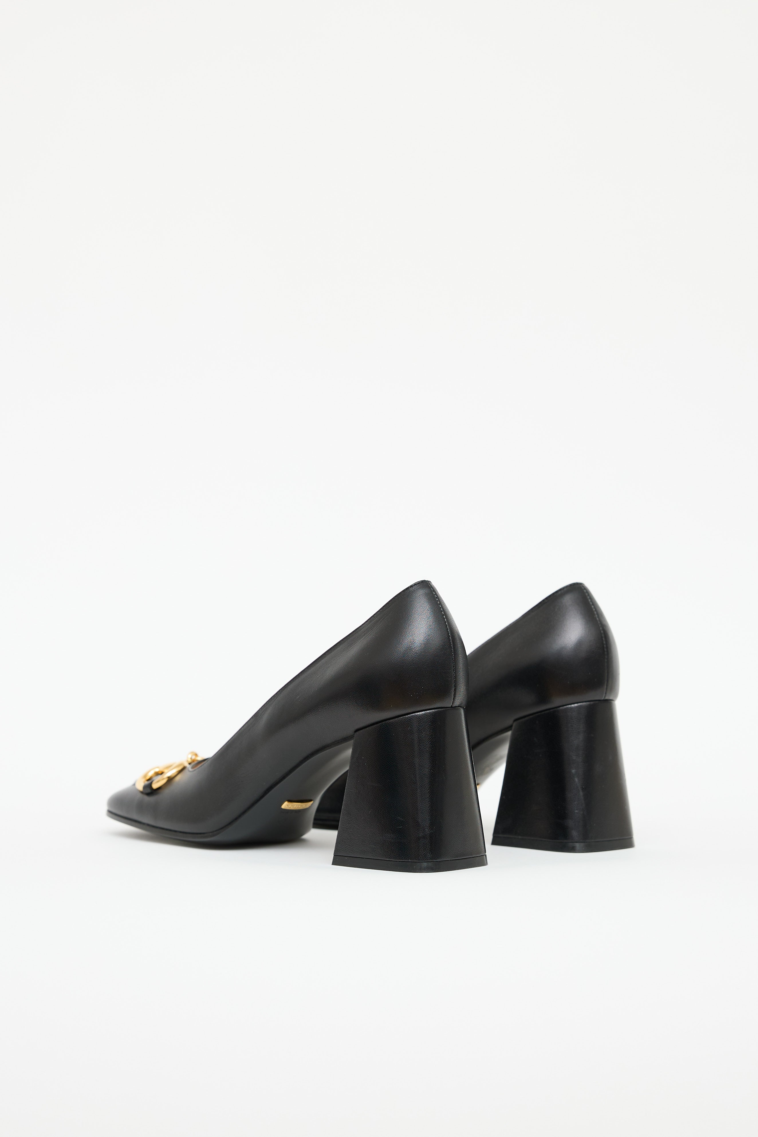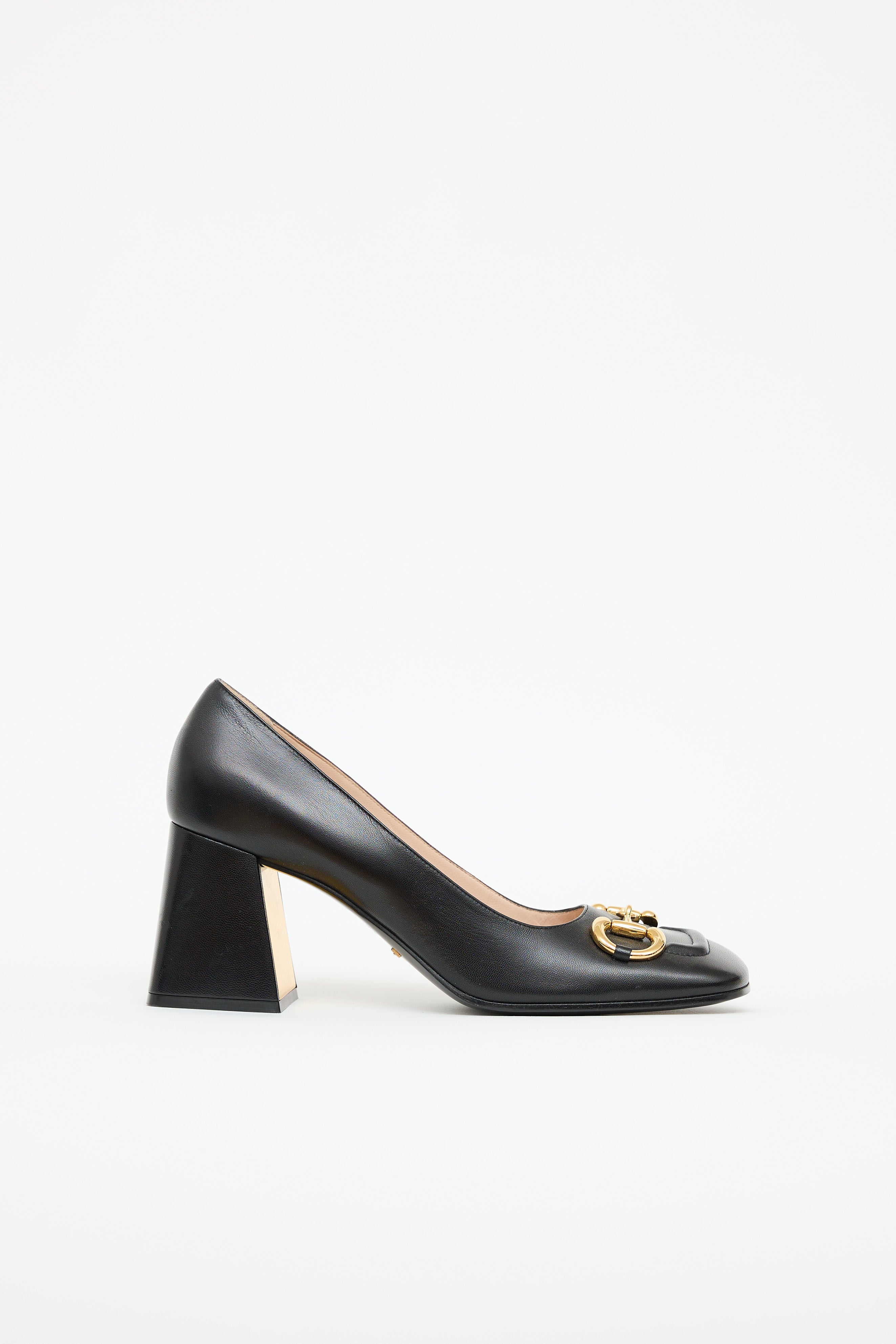 Pre-owned Gucci black heels featuring square toe, gold tone Horsebit on toe box and block heel with gold mirror finish on inner heel.