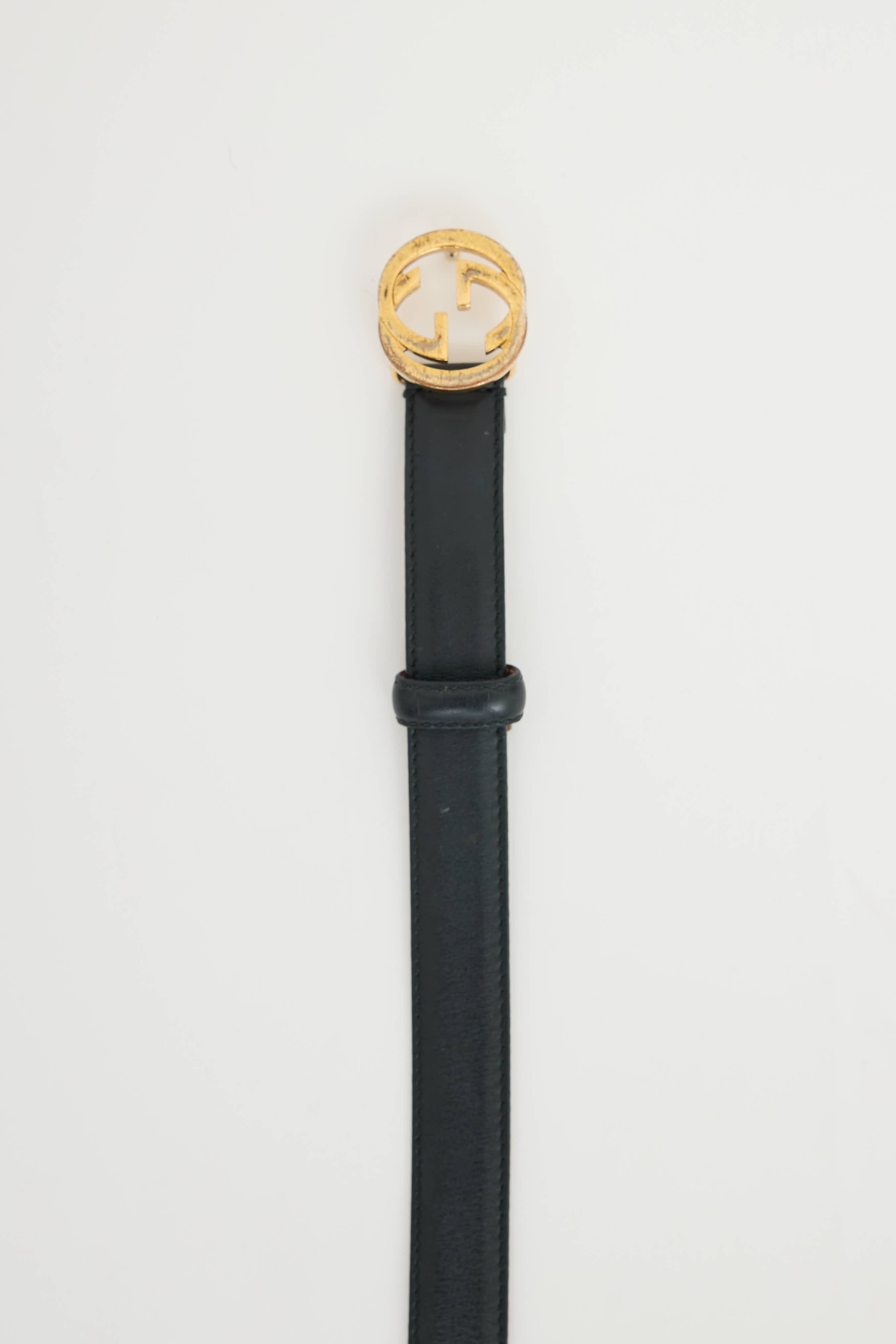Pre-owned Gucci black leather belt featuring gold tone interlocking GG buckle, push pin closure, and stamped logo at brown reverse.