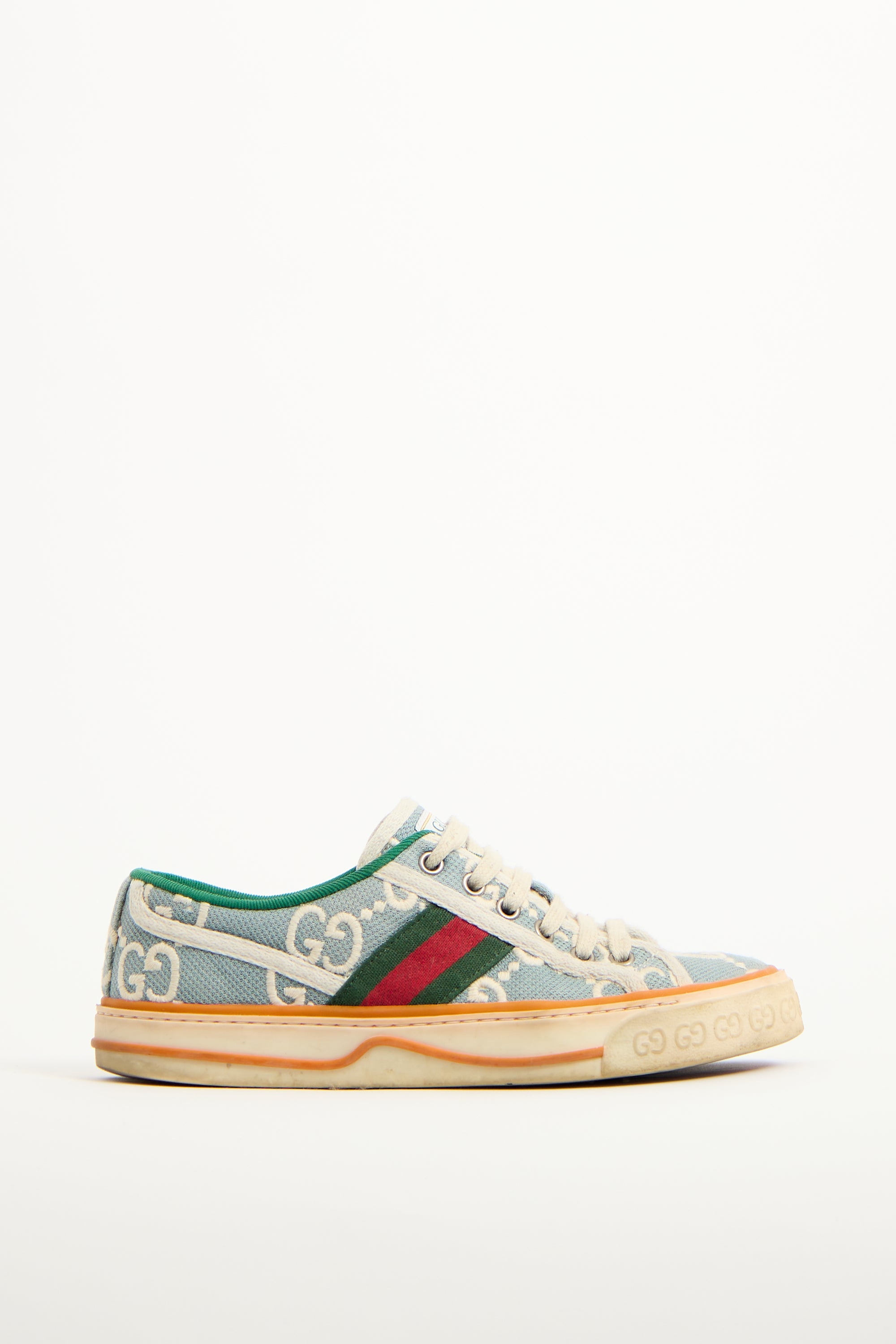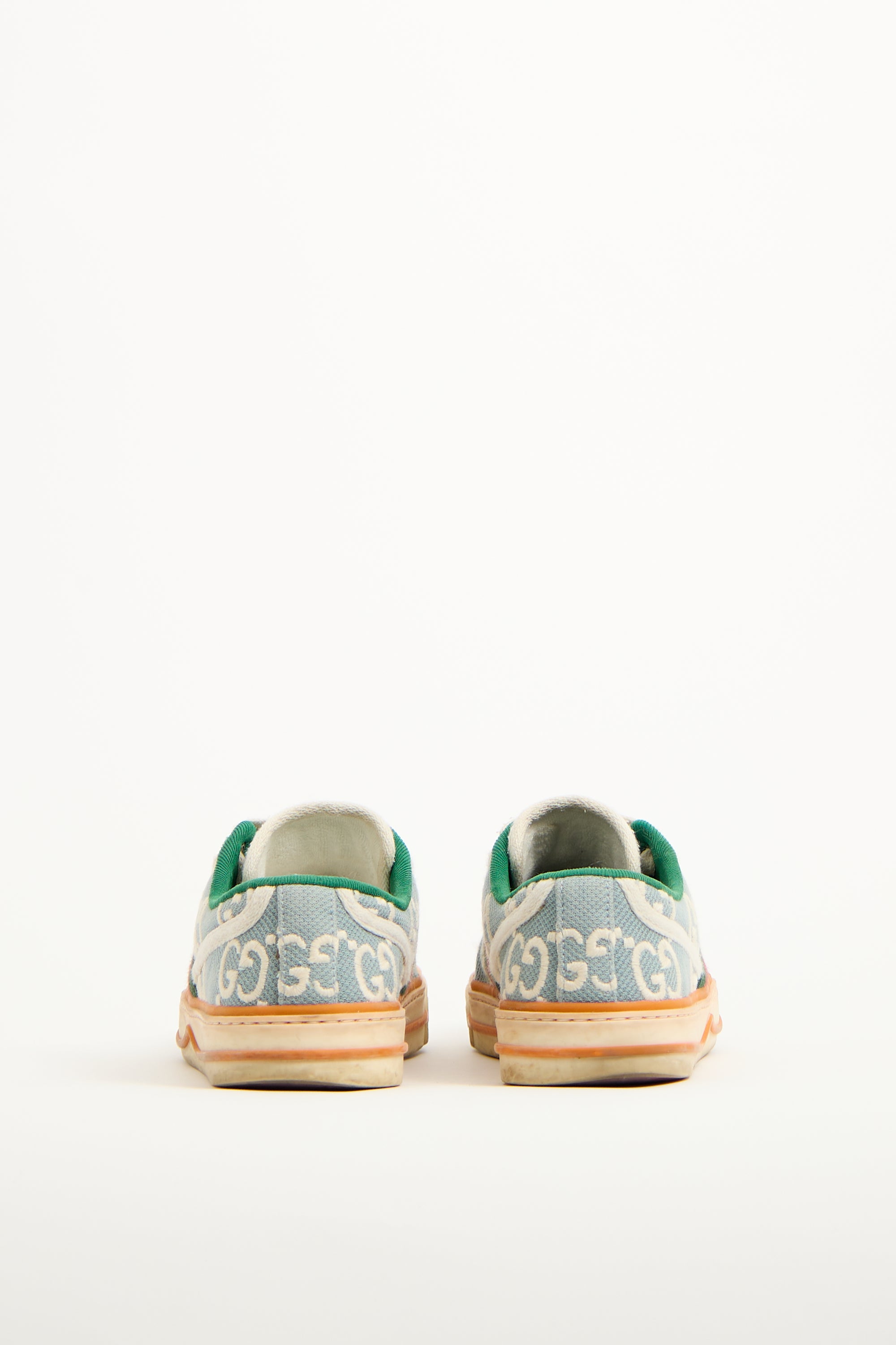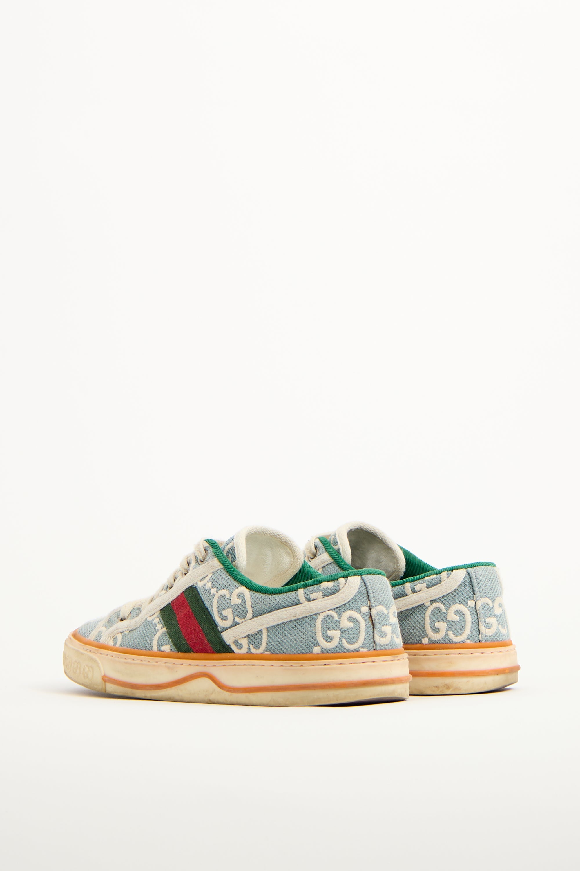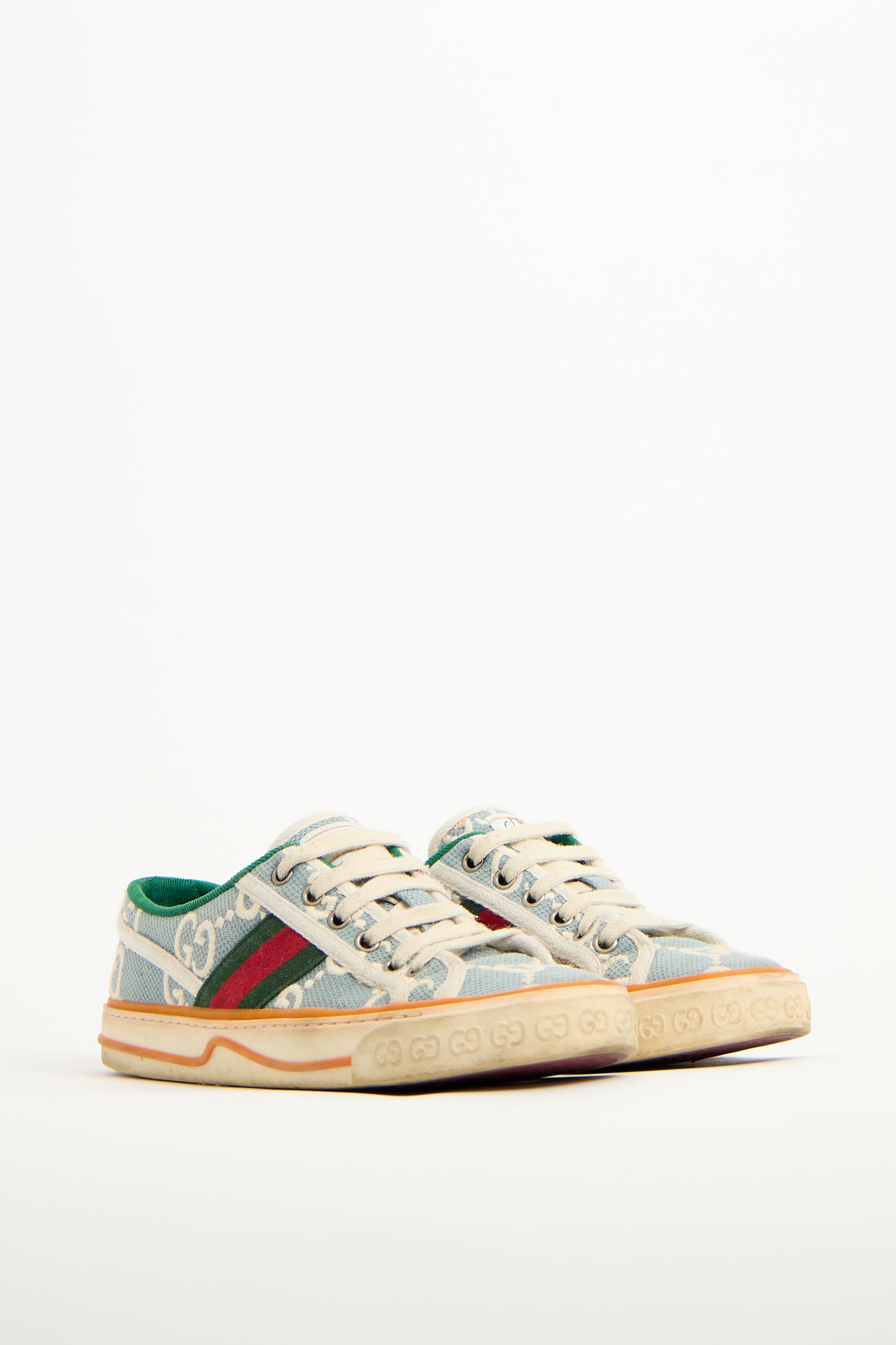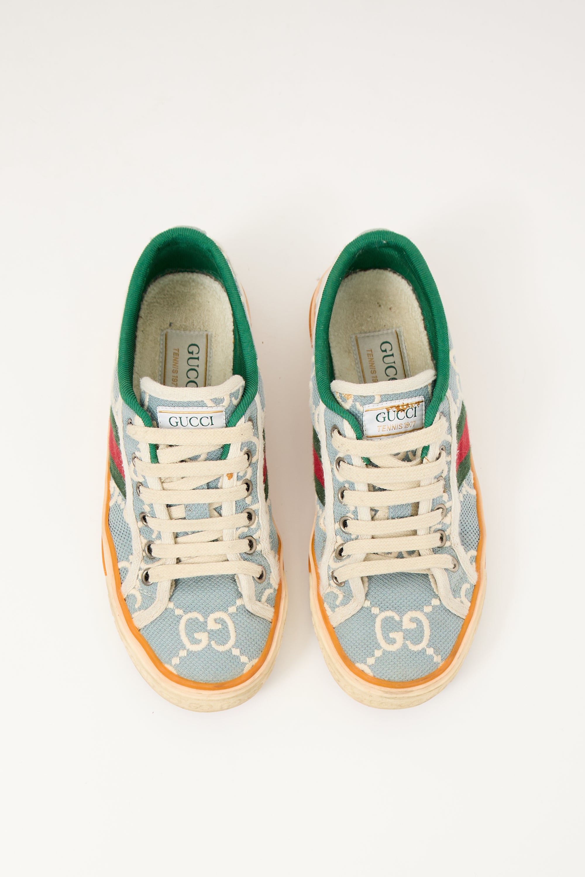 Pre-owned Gucci light blue Tennis 1977 sneakers featuring rounded toe, white embroidered GG monogram, lace up front, signature red and green webbing at sides, slip on entry, logo tag at tongue and insoles, and rubber midsole with debossed GG logo at toe.