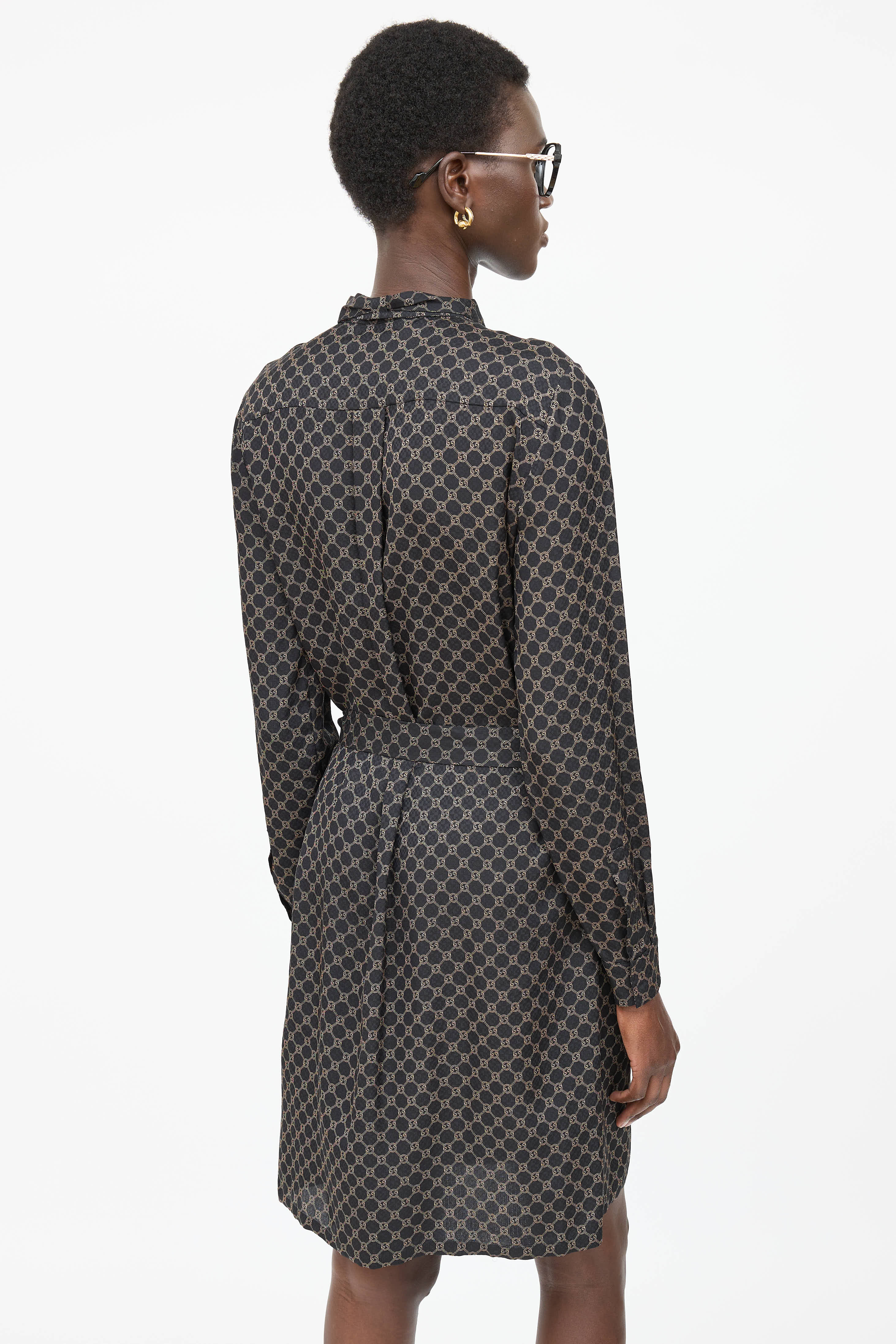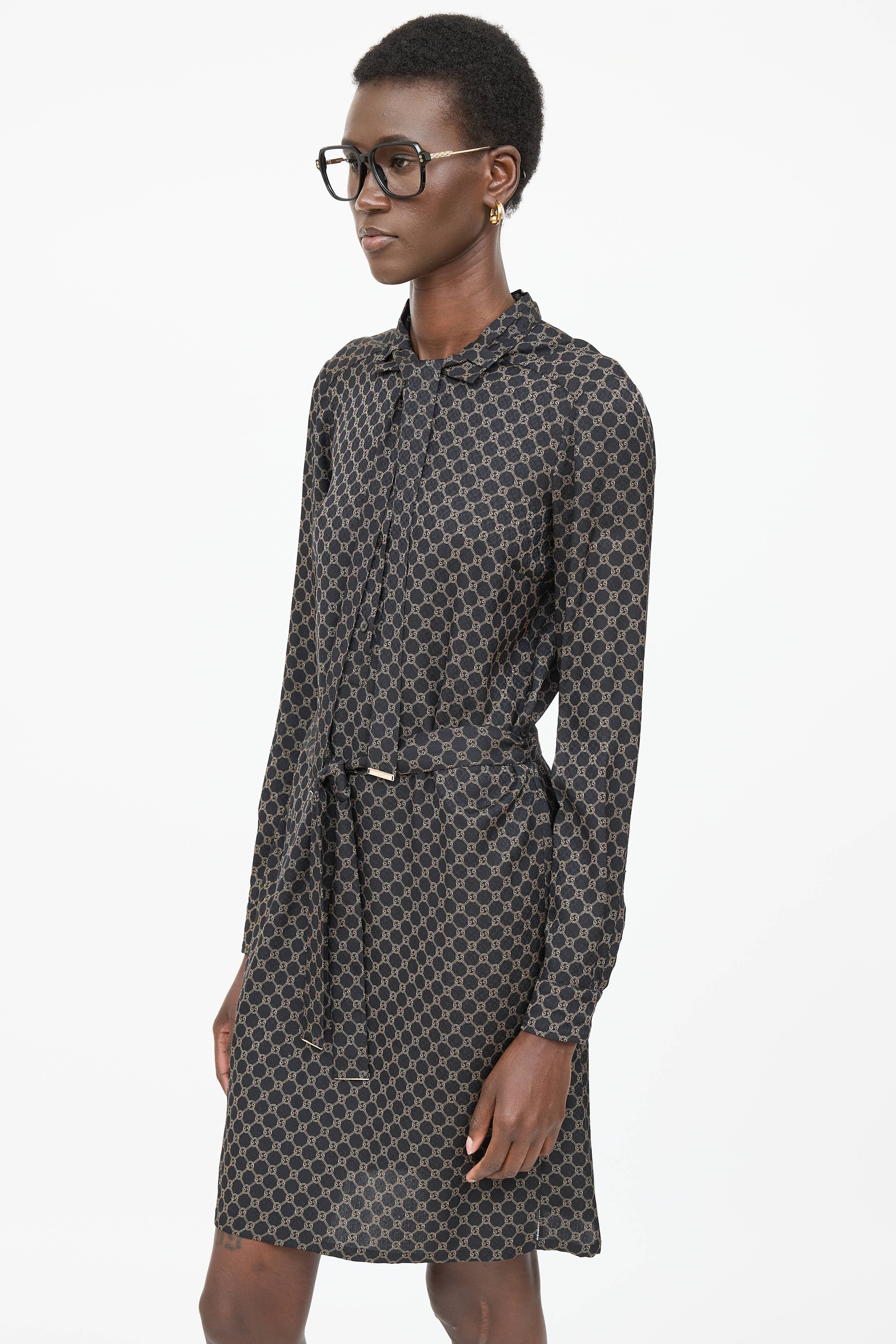 Pre-owned Gucci brown and black long sleeve dress featuring interlocking GG monogram, stand collar with gold tone hardware, detachable tie at neck with metal tips, three quarter button front, snap button cuffs, and tie at back.