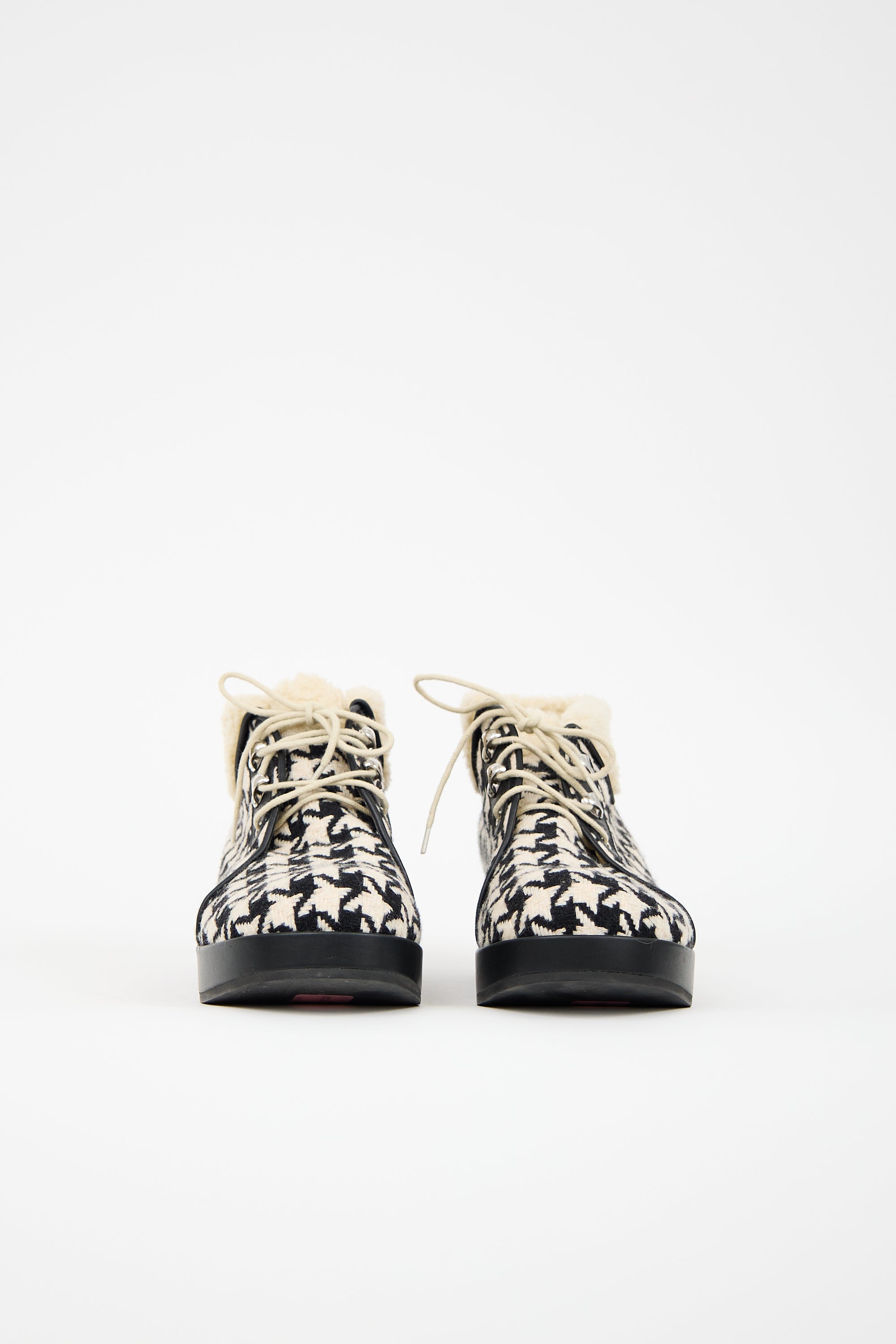 Pre-owned Gucci black and cream Victor ankle boots featuring rounded square toe, optical tweed with houndstooth pattern, lace up front, sherpa tongue panel and foldover topline, and covered platform midsole and block heel.