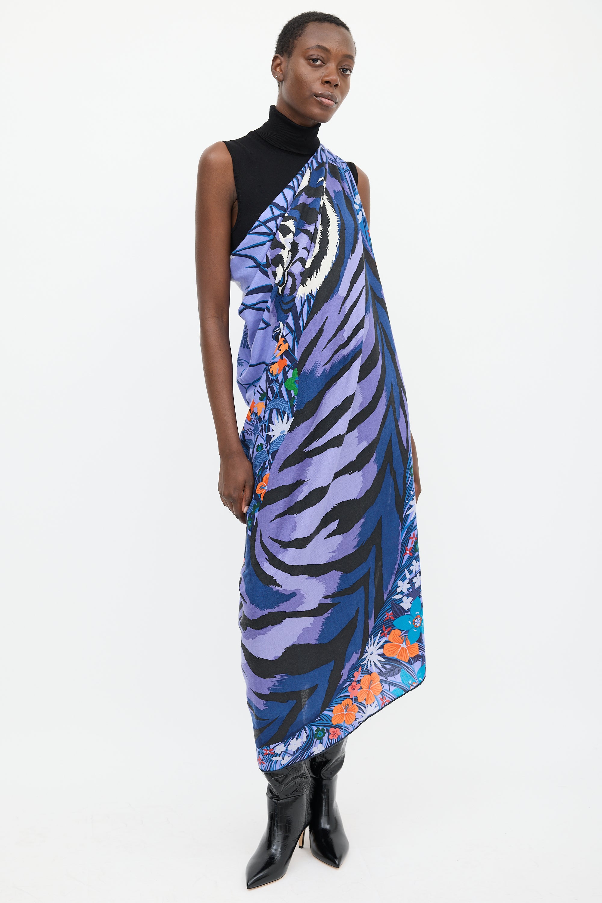 Pre-owned Hermès blue and multicolour cashmere and silk blend shawl featuring Tyger Tyger print by Alice Shirley, tiger and jungle motif, and hand rolled edges. Comes with original box.