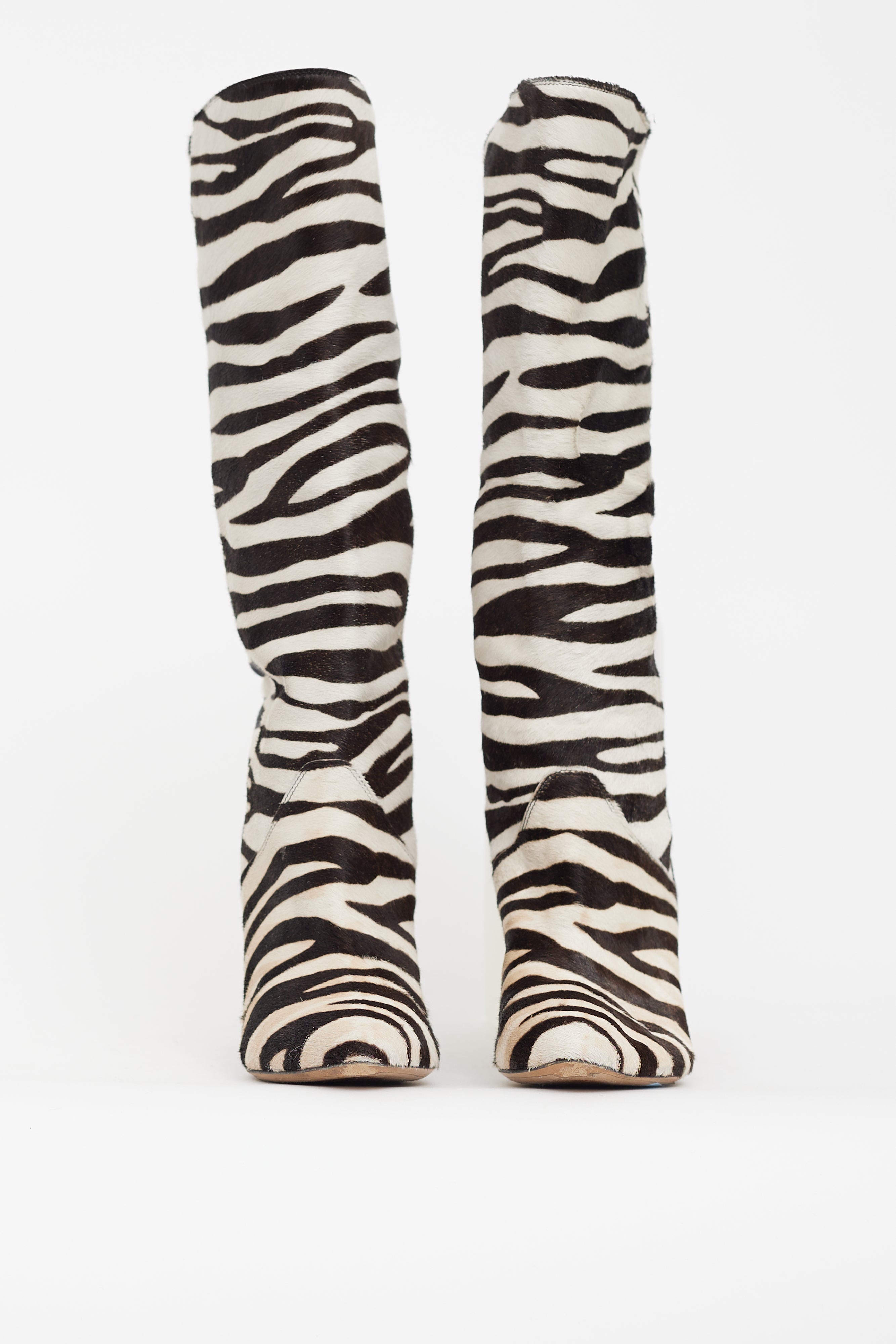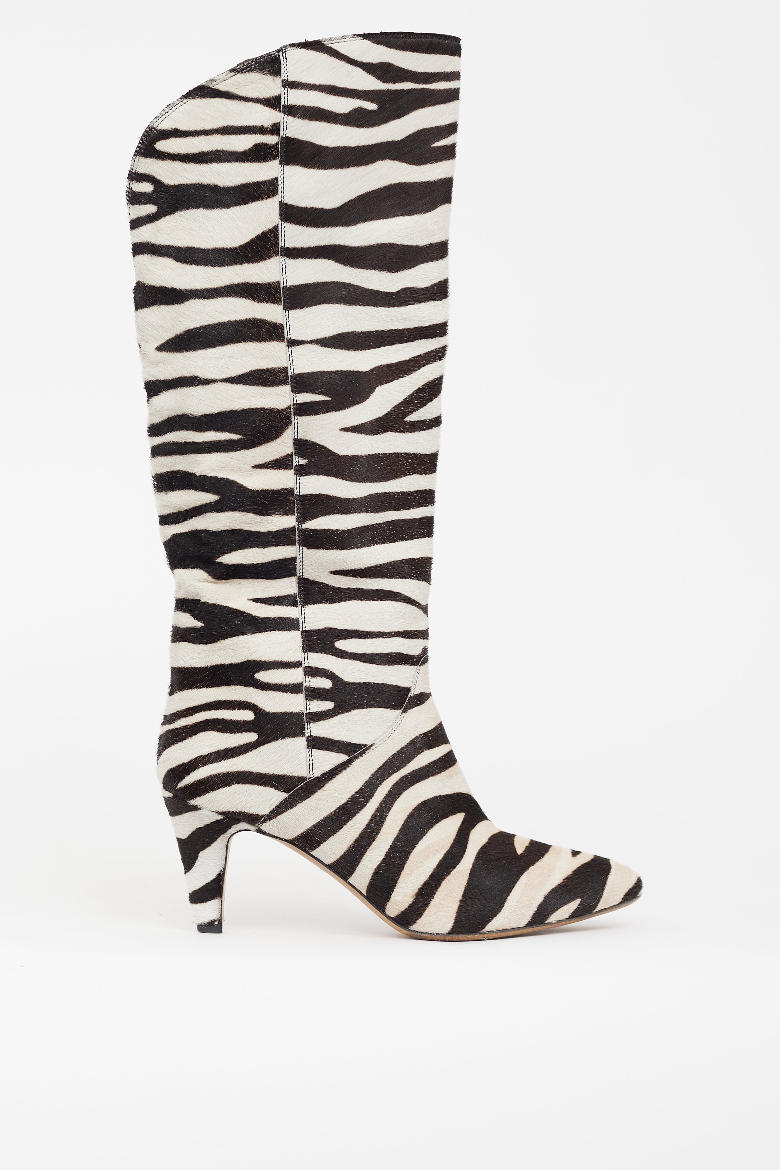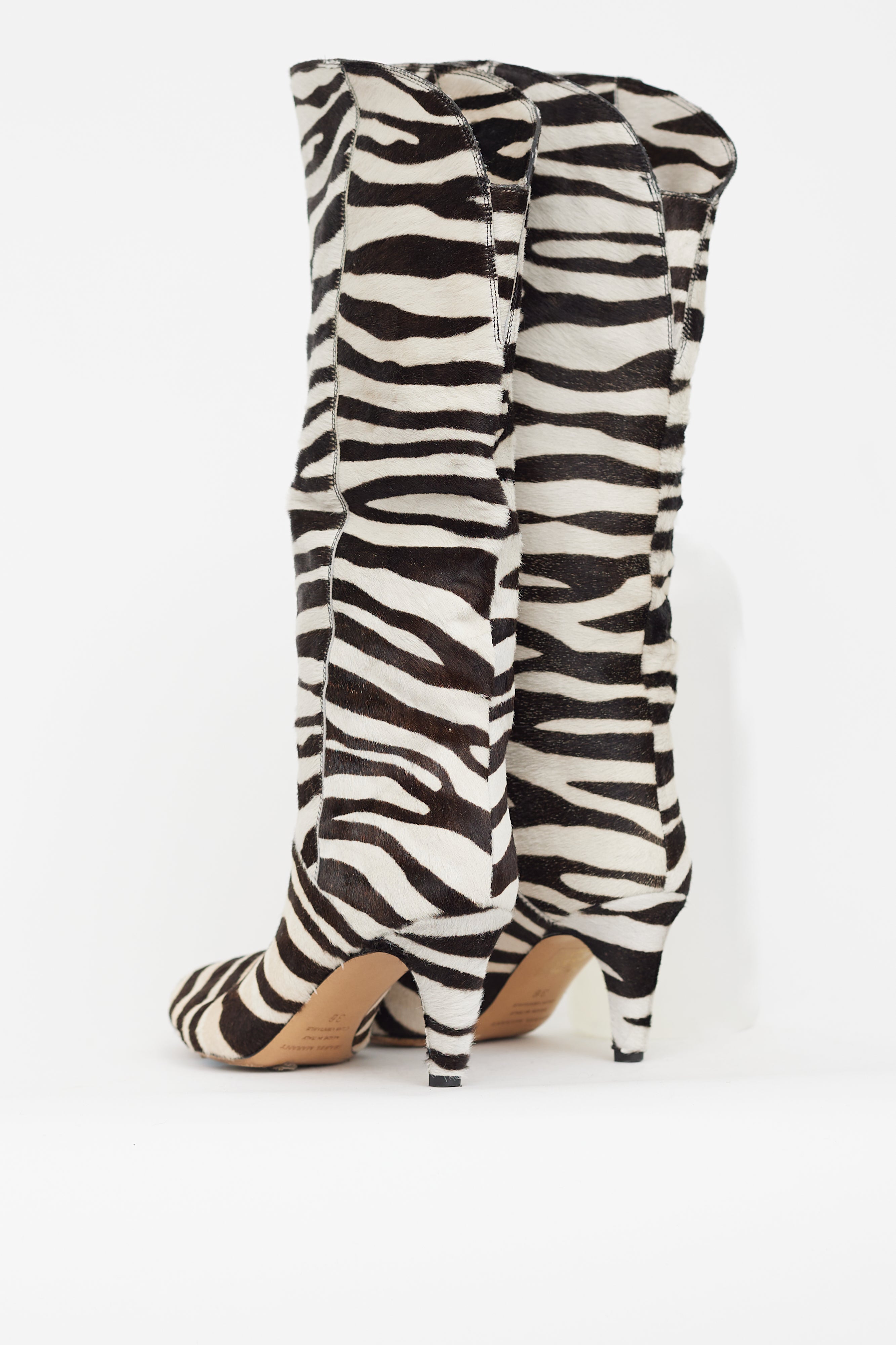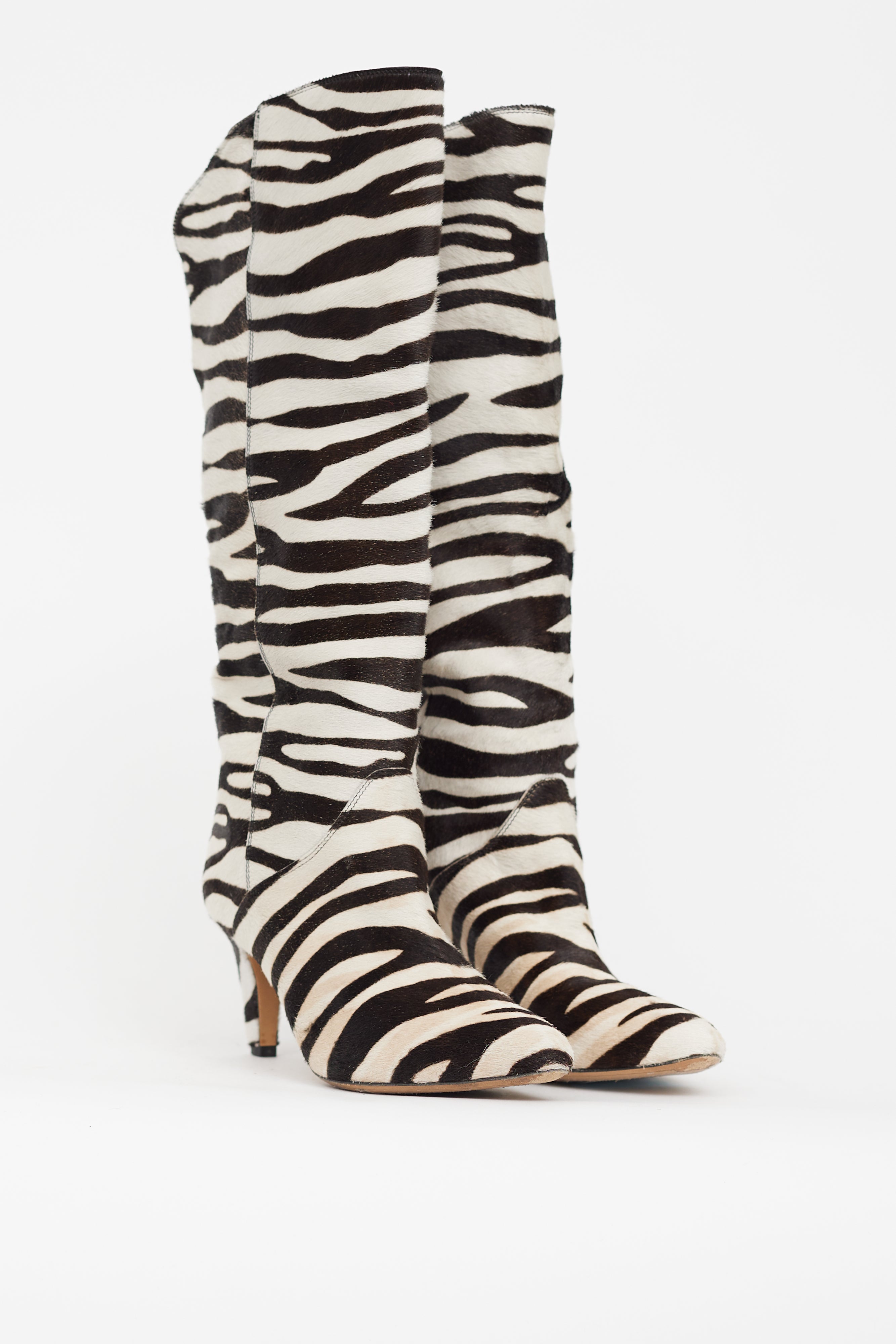 Pre-owned Isabel Marant white and brown zebra pony hair boots featuring pointed toe, curved collar, tapered heel and leather insole and outsole. Comes with original dust bag.