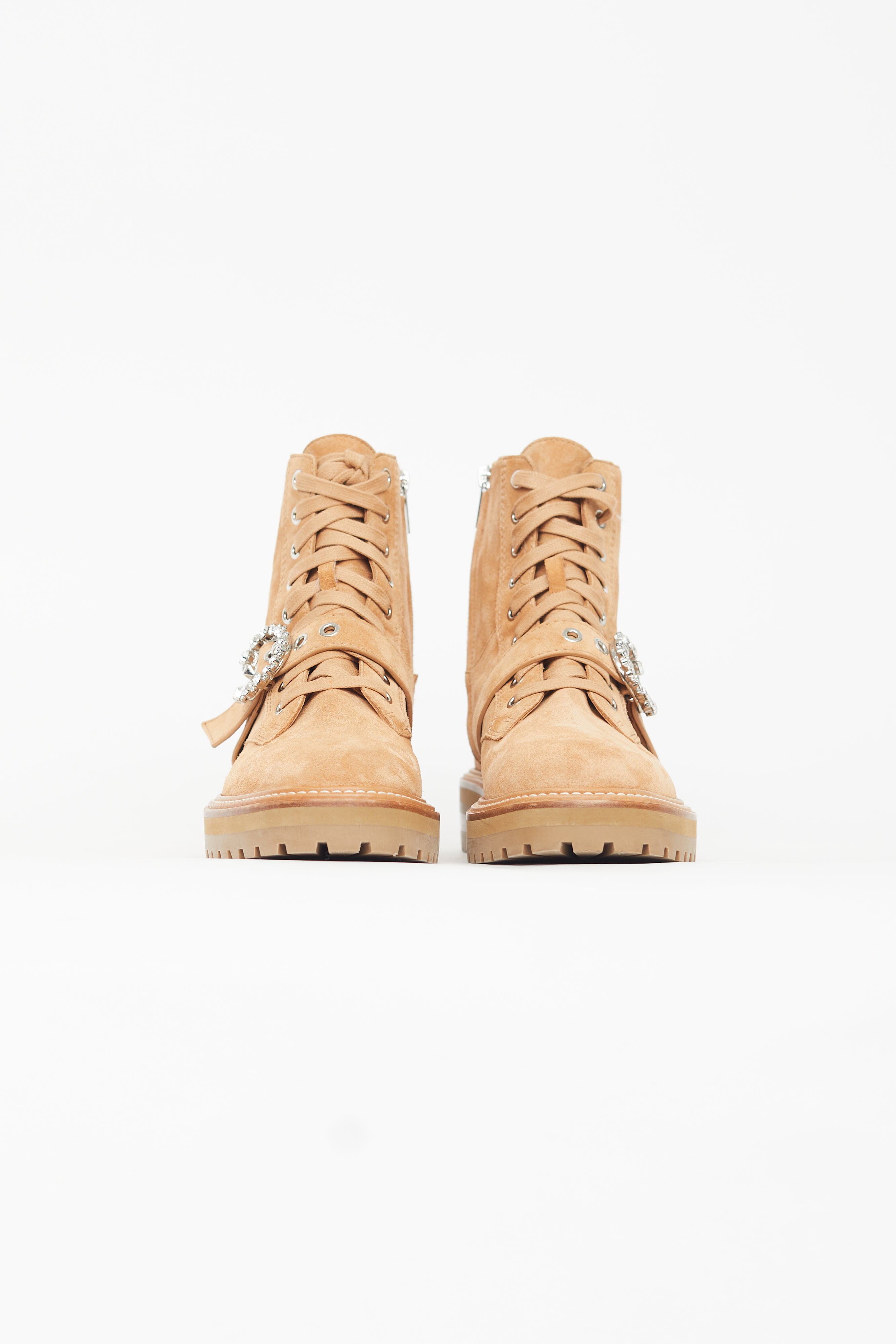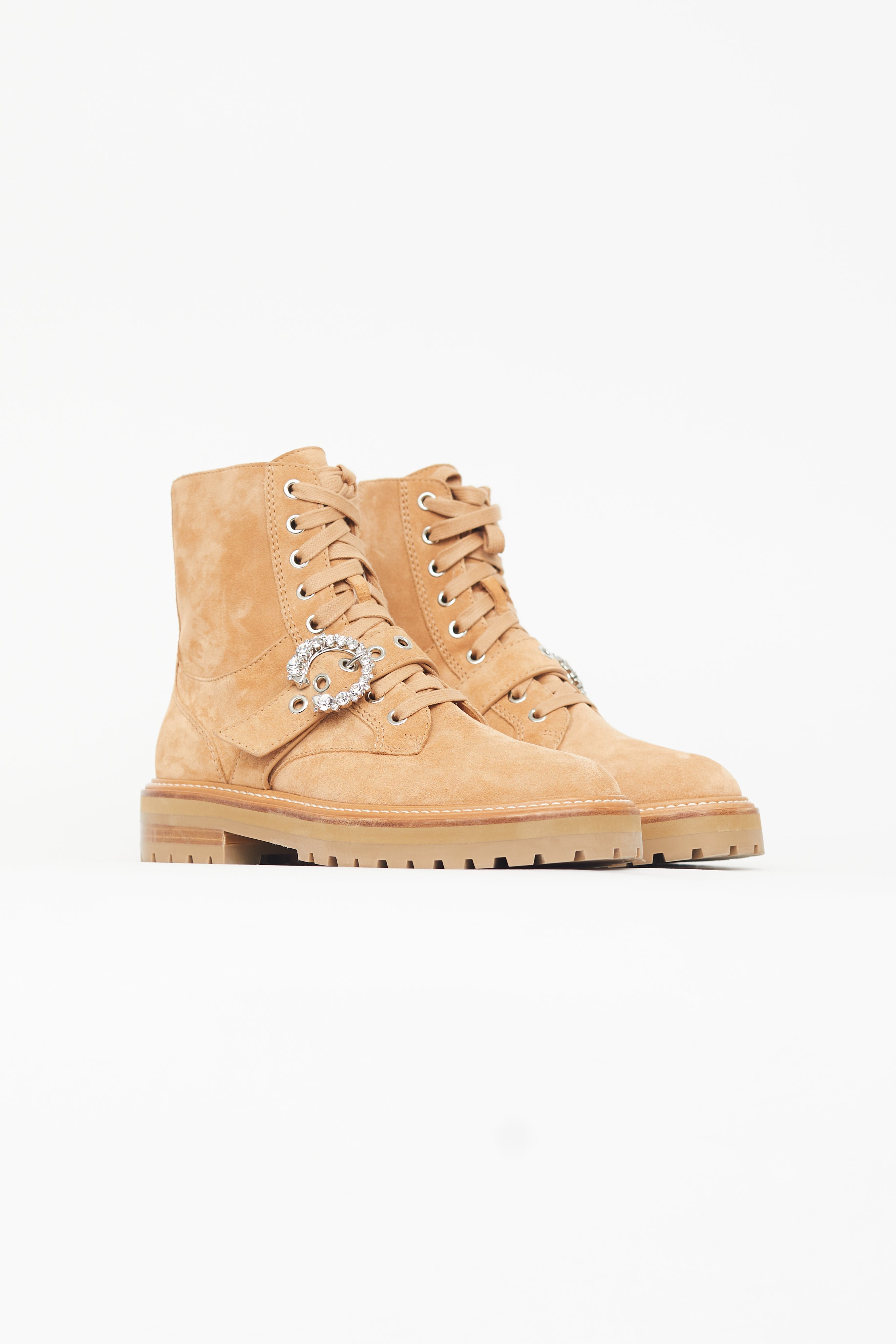Pre-owned Jimmy Choo beige Cora ankle boots featuring rounded toe, lace up vamp, buckle fastening across vamp with crystal embellished C buckle, zip closure at side, ankle high shaft, white stitch at midsole, and rubber treaded outsole.