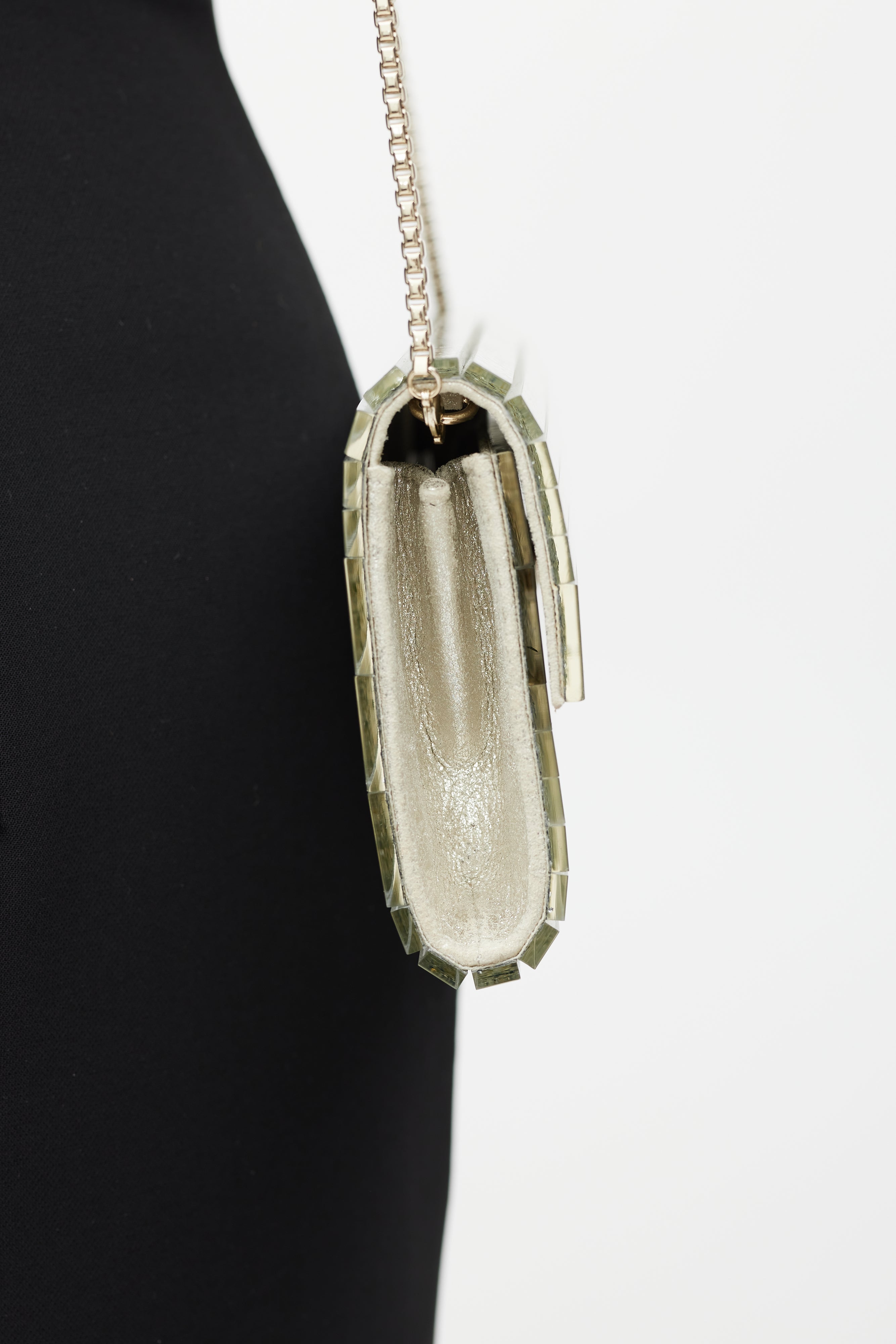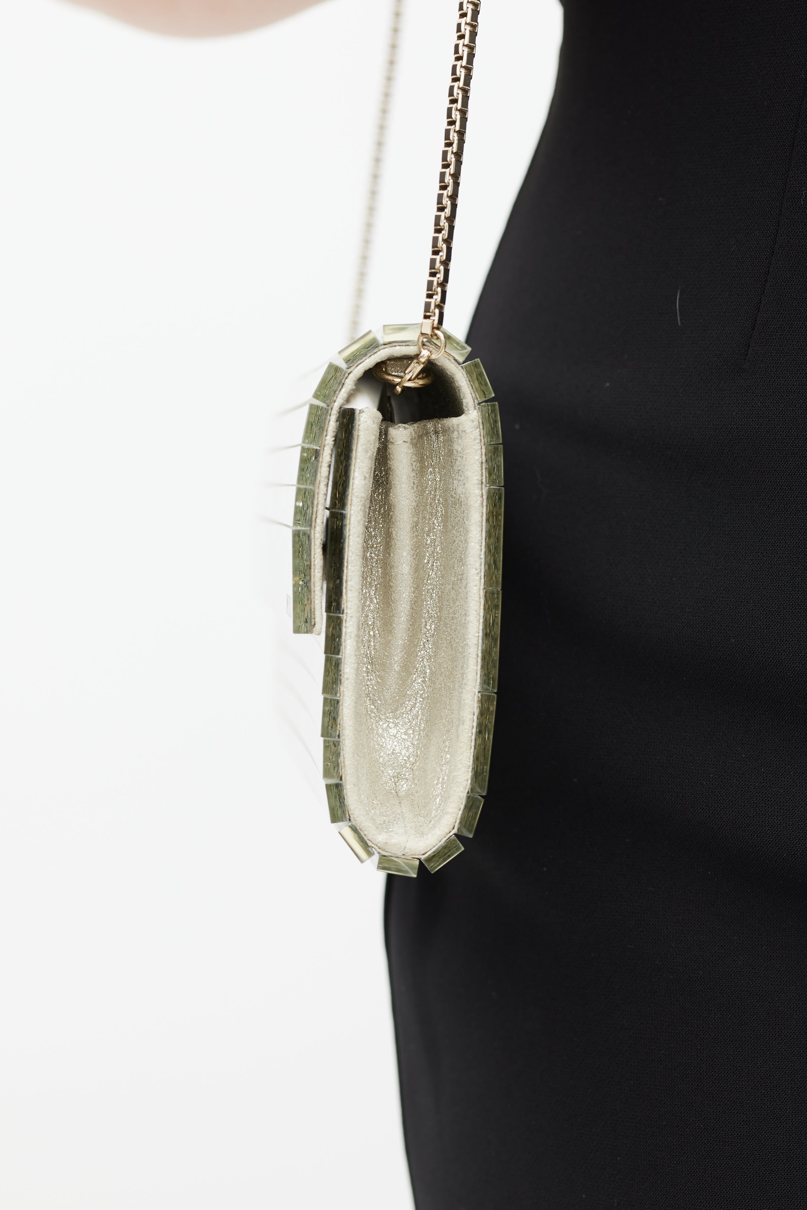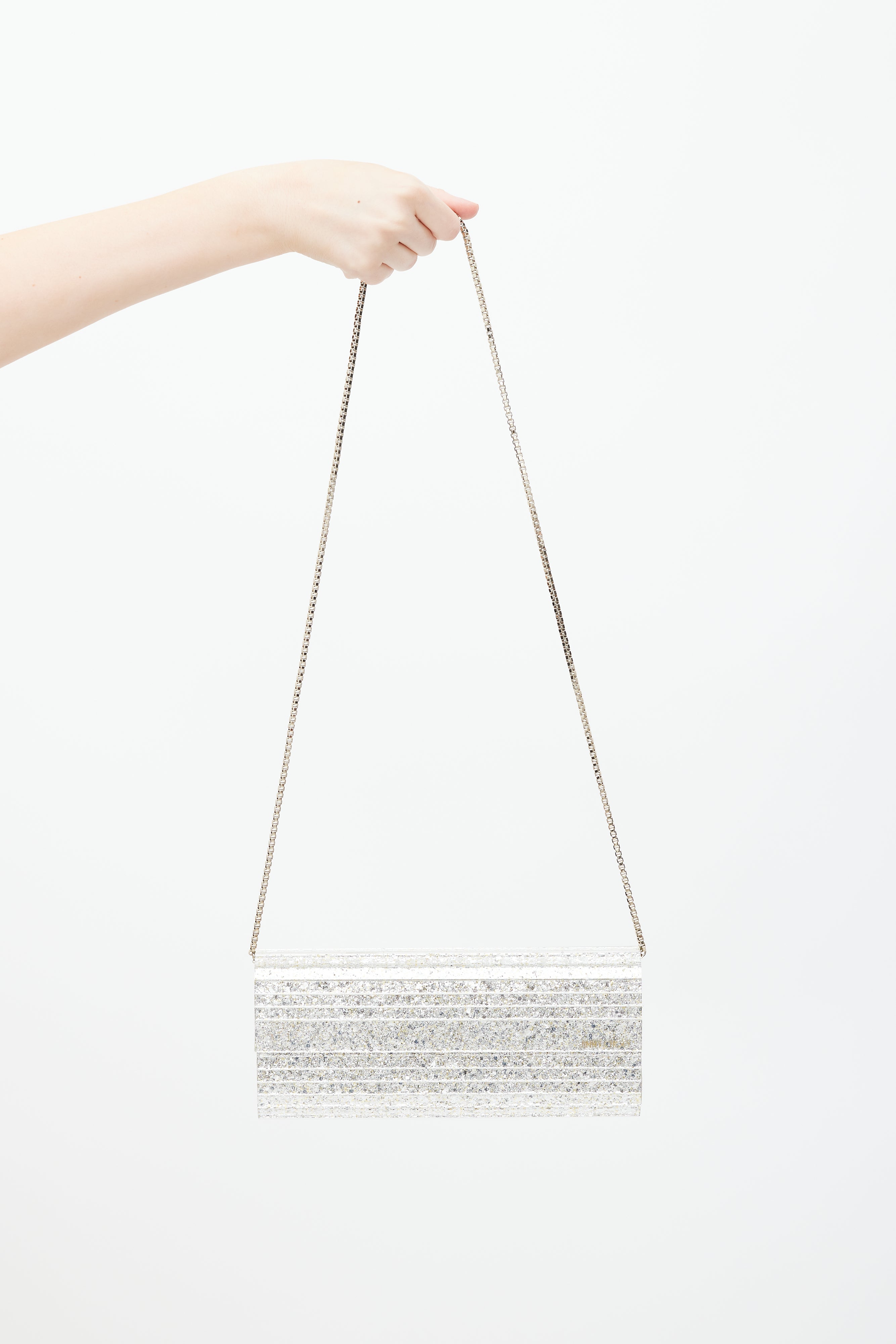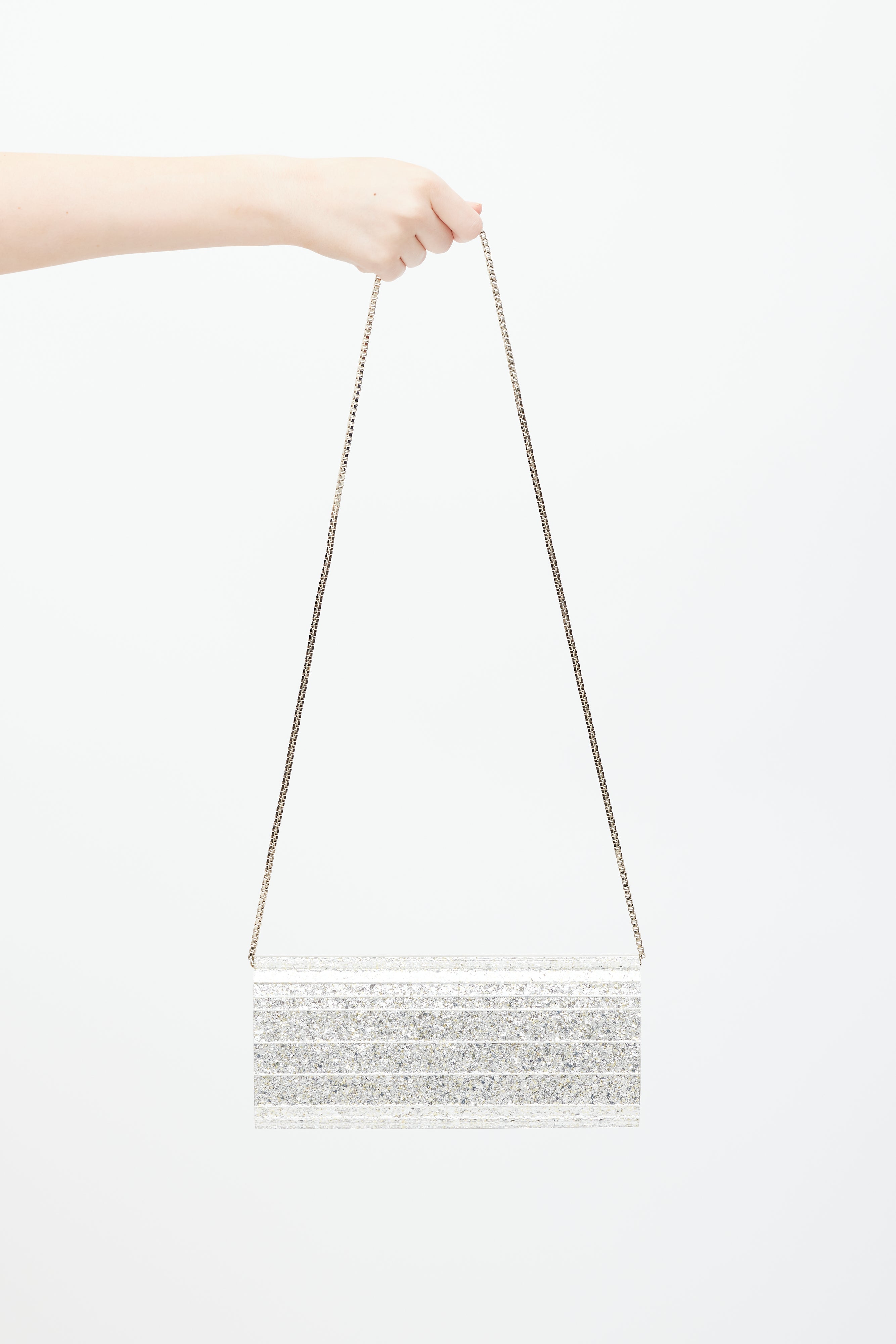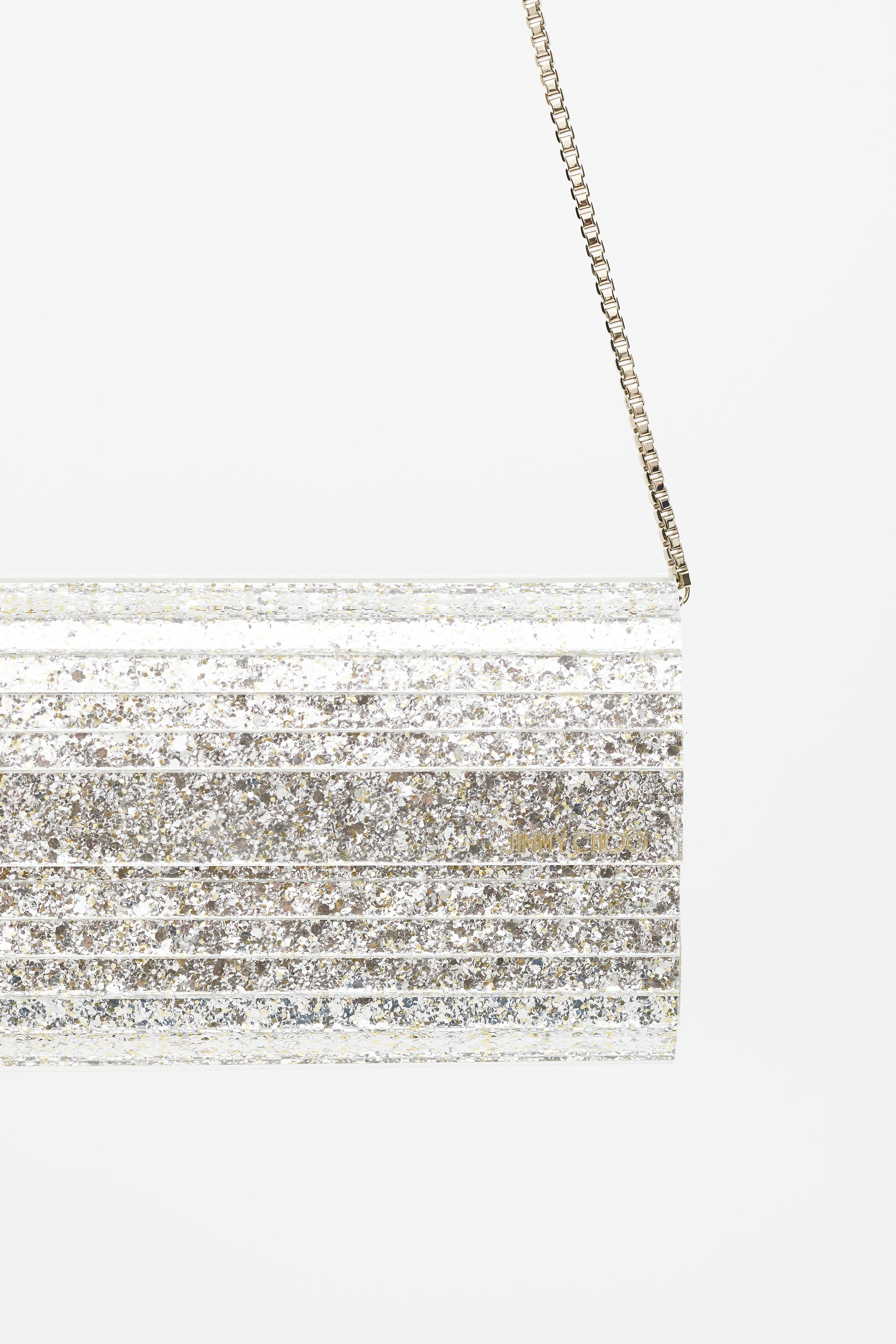 Pre-owned Jimmy Choo silver Sweetie glitter clutch featuring an embossed logo at front, top flap, one main compartment with one slip pocket, removable chainlink shoulder strap, and magnetic snap closure. Comes with original dust bag and box.