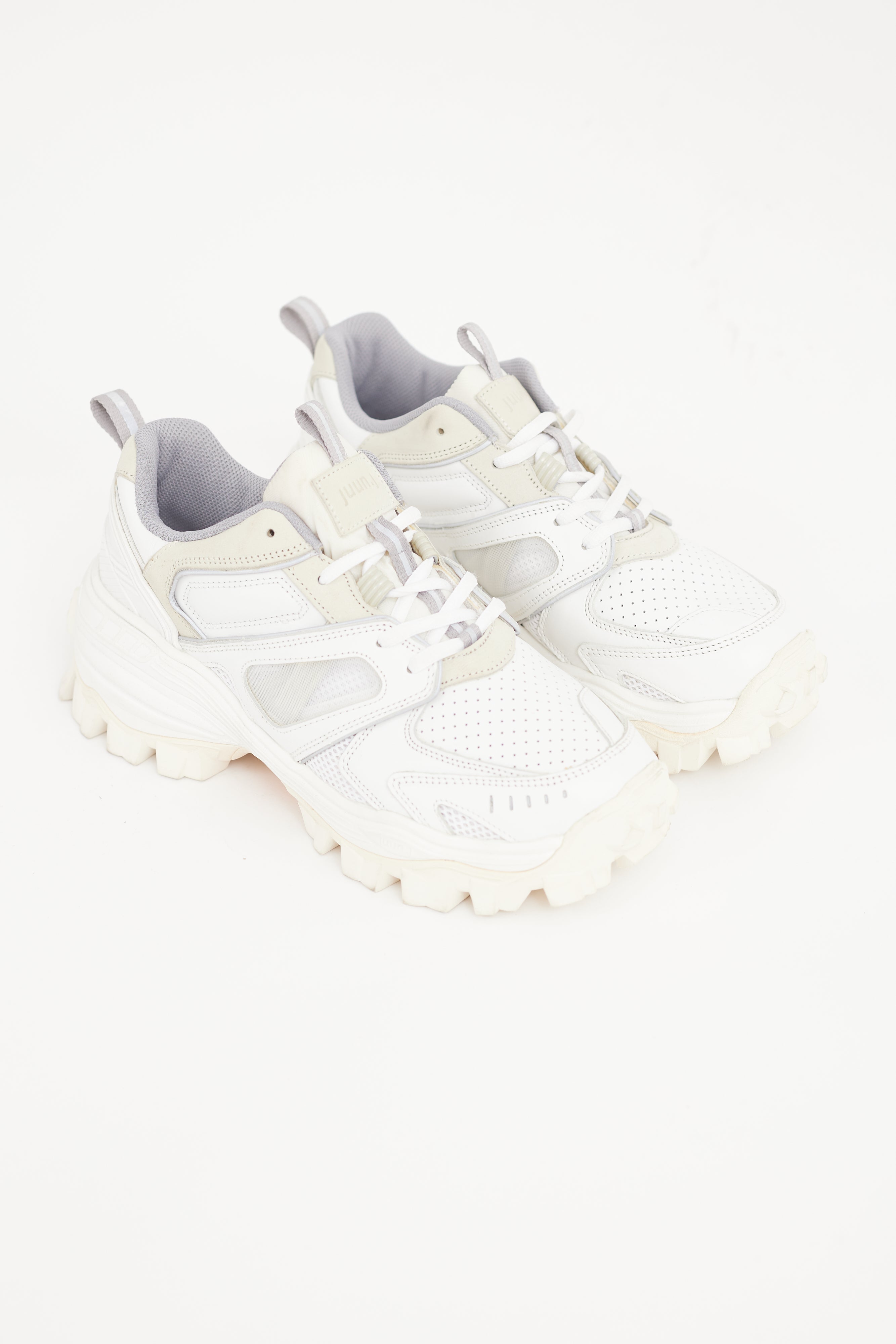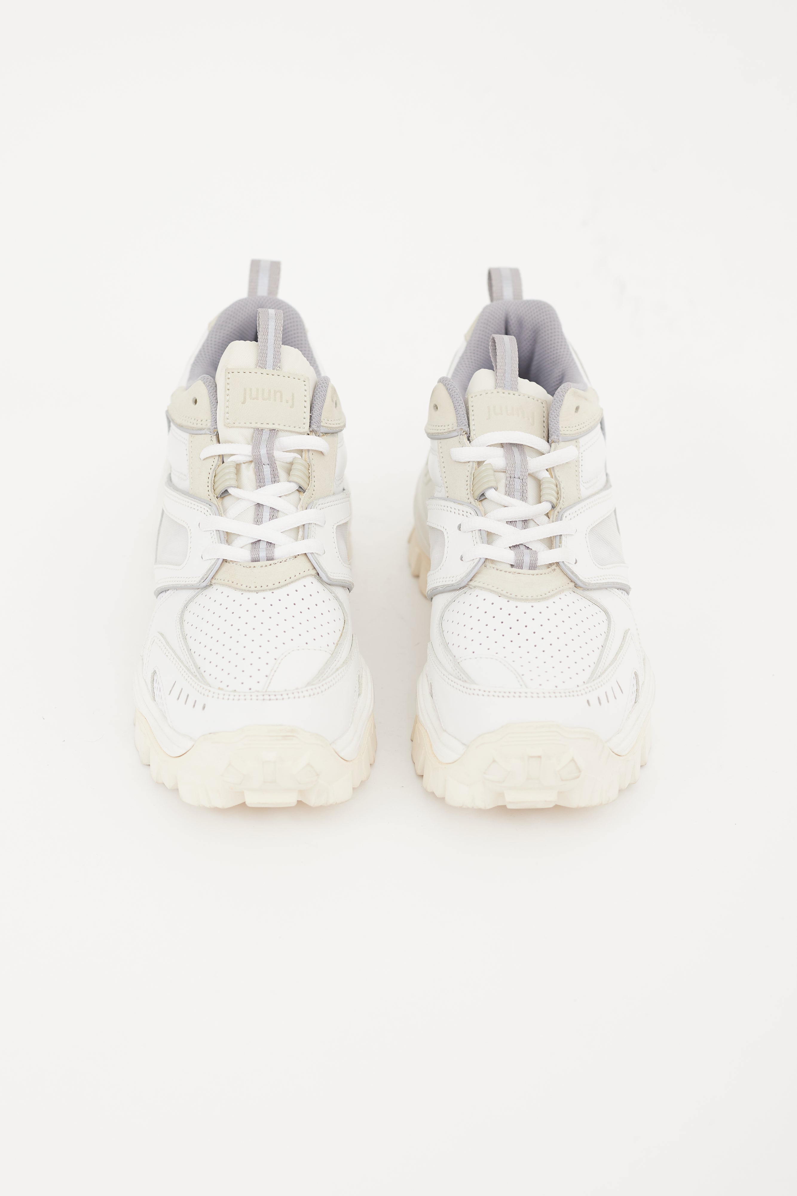 Pre-owned Juun.J beige leather sneakers featuring a round toe, beige panelling throughout, layered upper, chunky platform midsole, webbed pull tab at heel and tongue, debossed logo at heel, and lace up closure.