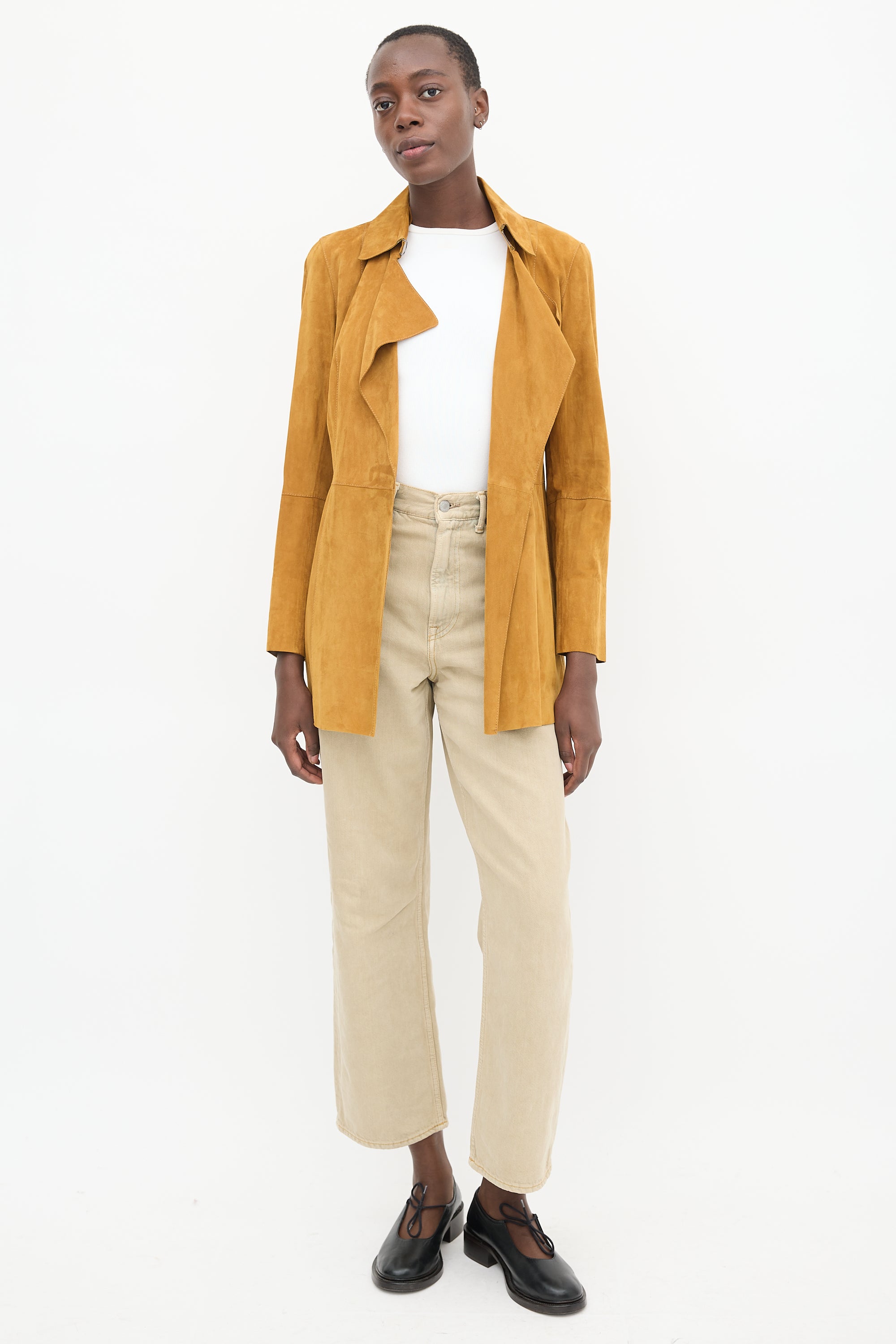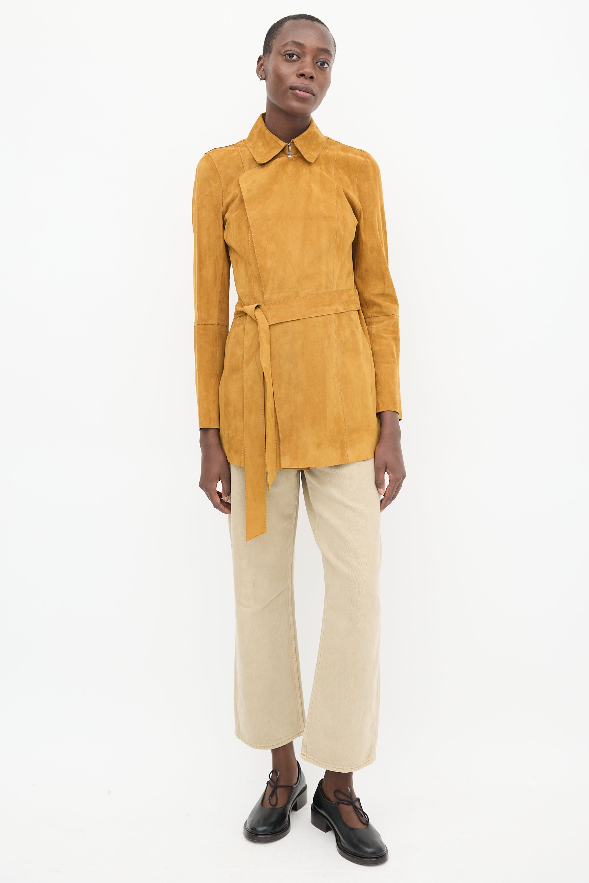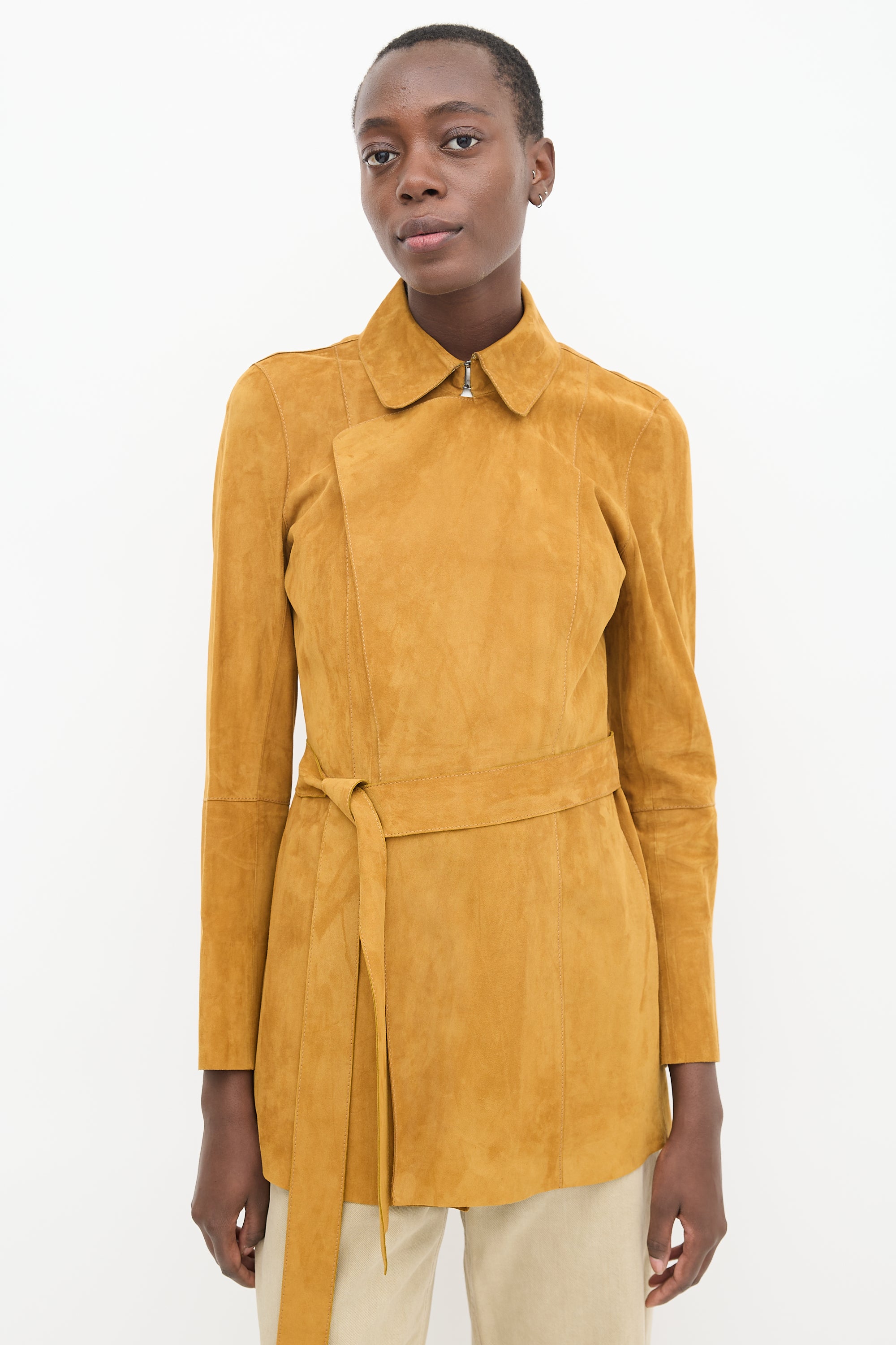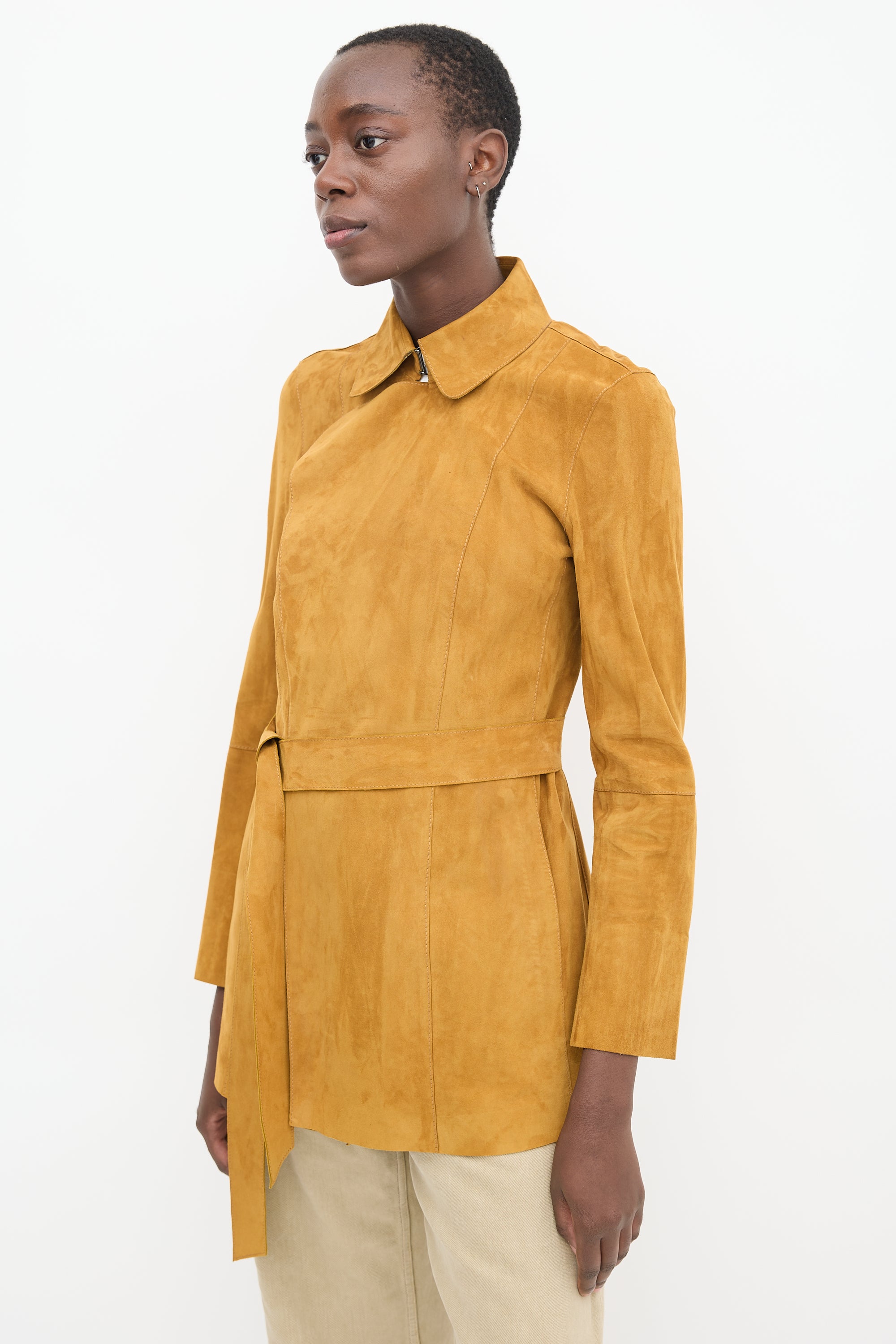Pre-owned Lafayette 148 brown suede jacket featuring a pointed collar, long sleeves with slit cuffs, two slip pockets at hip, tie belt at waist, and hook and eye closure.