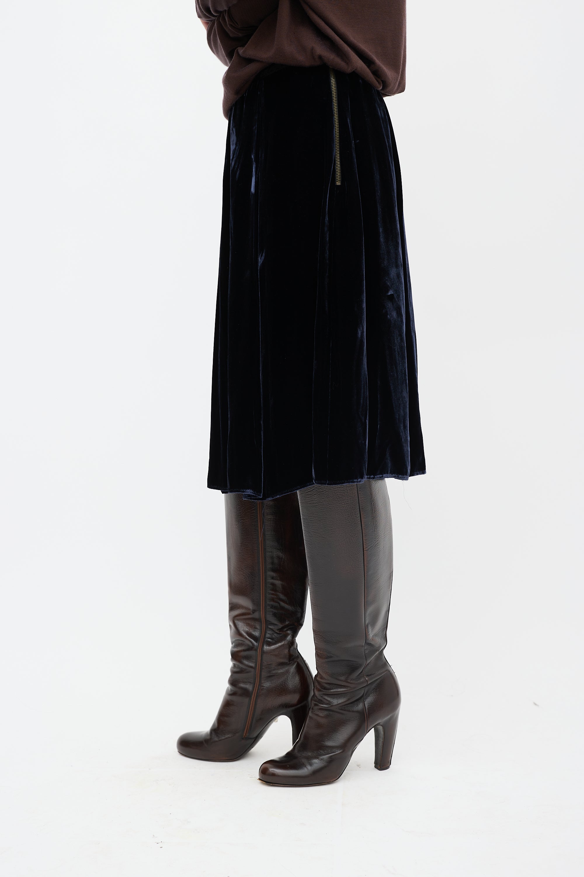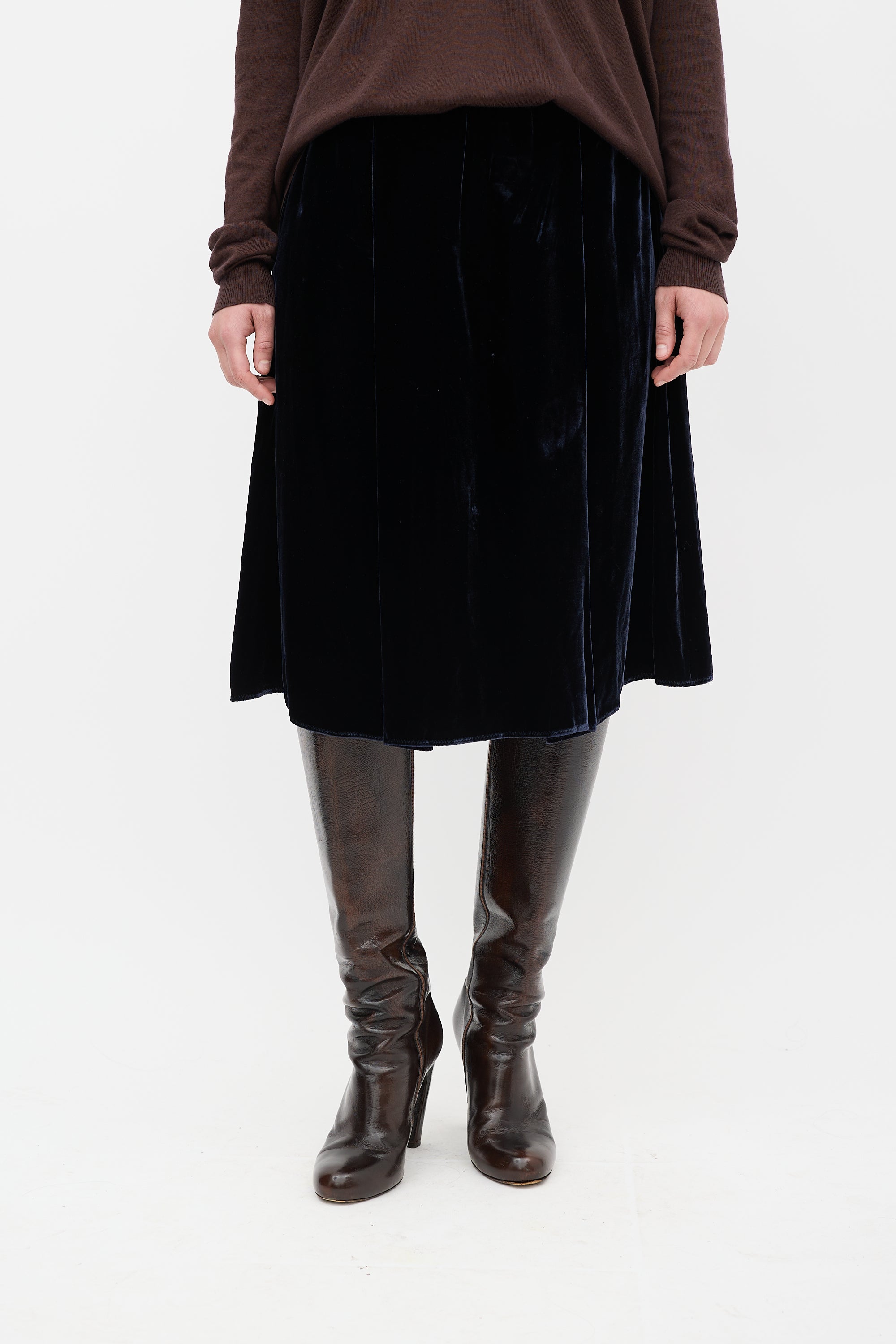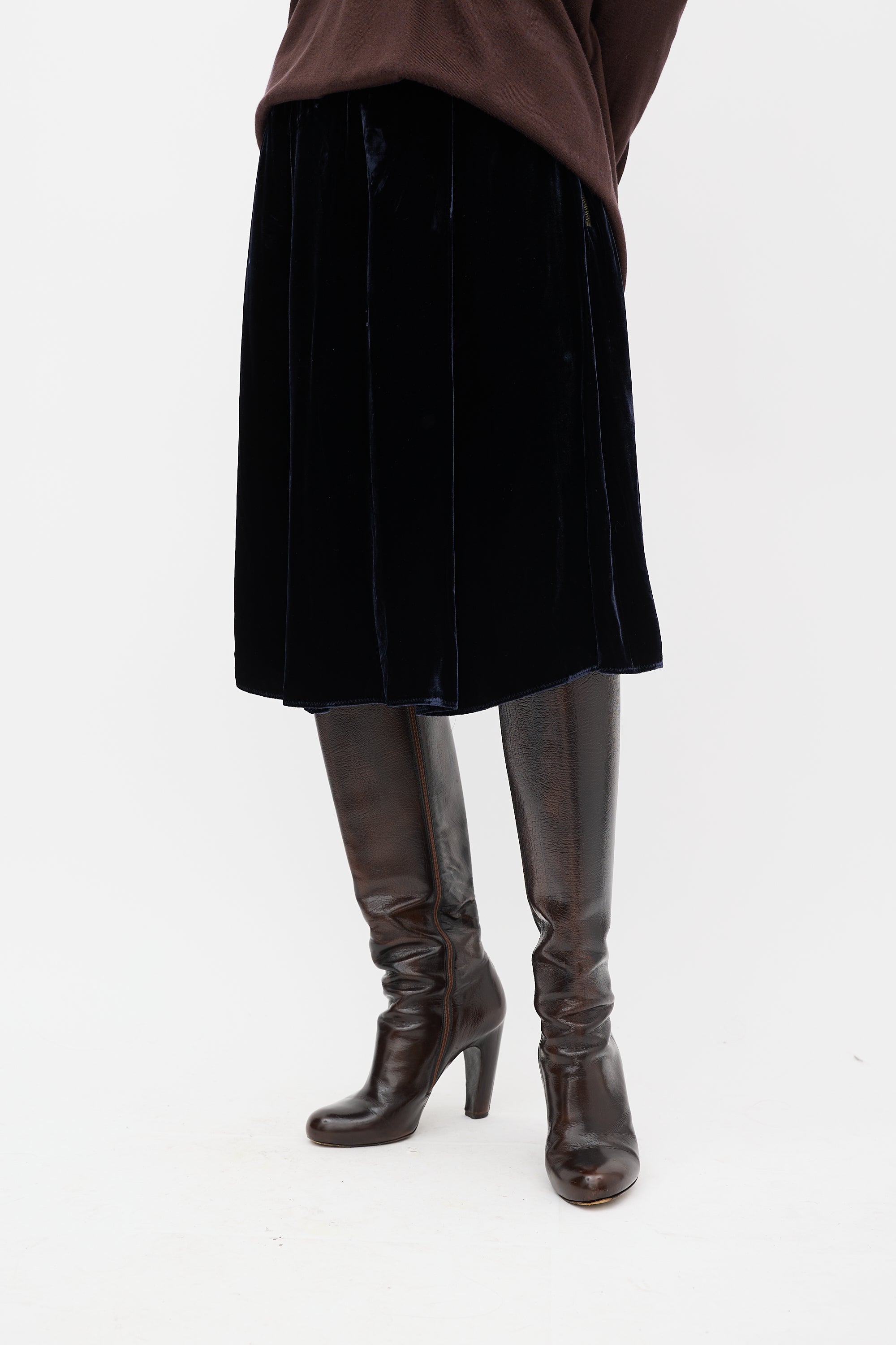Pre-owned Lanvin Winter 2006 navy velvet midi skirt featuring a high pleated waist and side zip closure. Lined.
