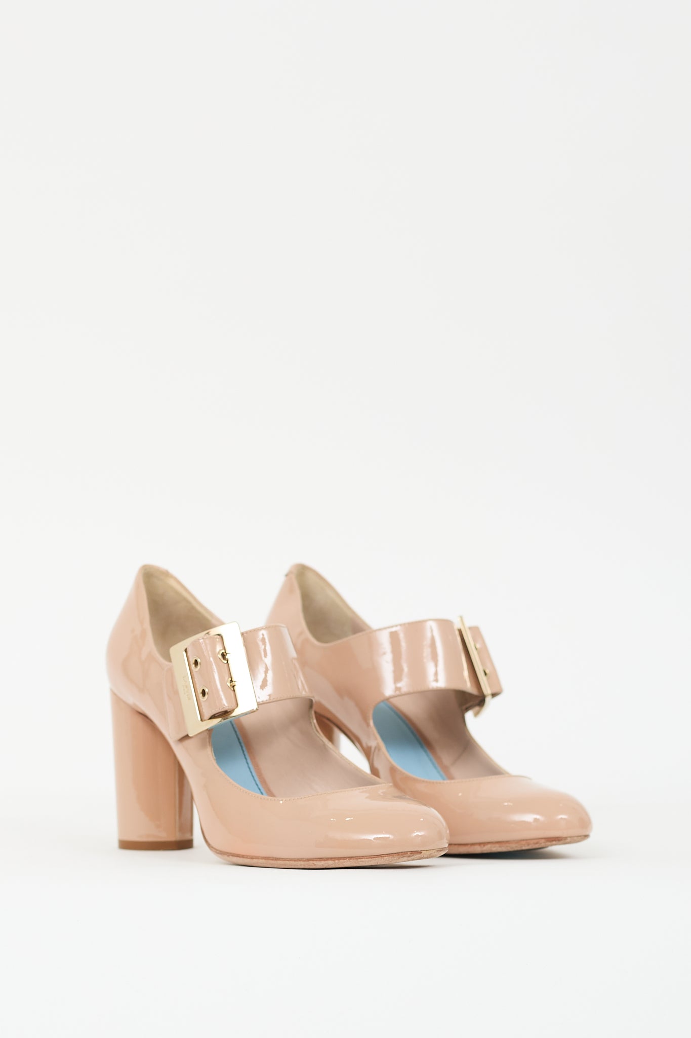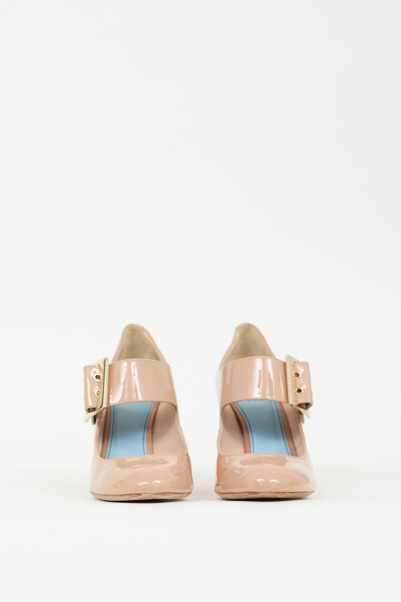 Pre-owned Lanvin beige patent leather mary jane pumps featuring rounded toe, adjustable strap with gold tone buckle fastening across upper, and covered cylindrical heel.