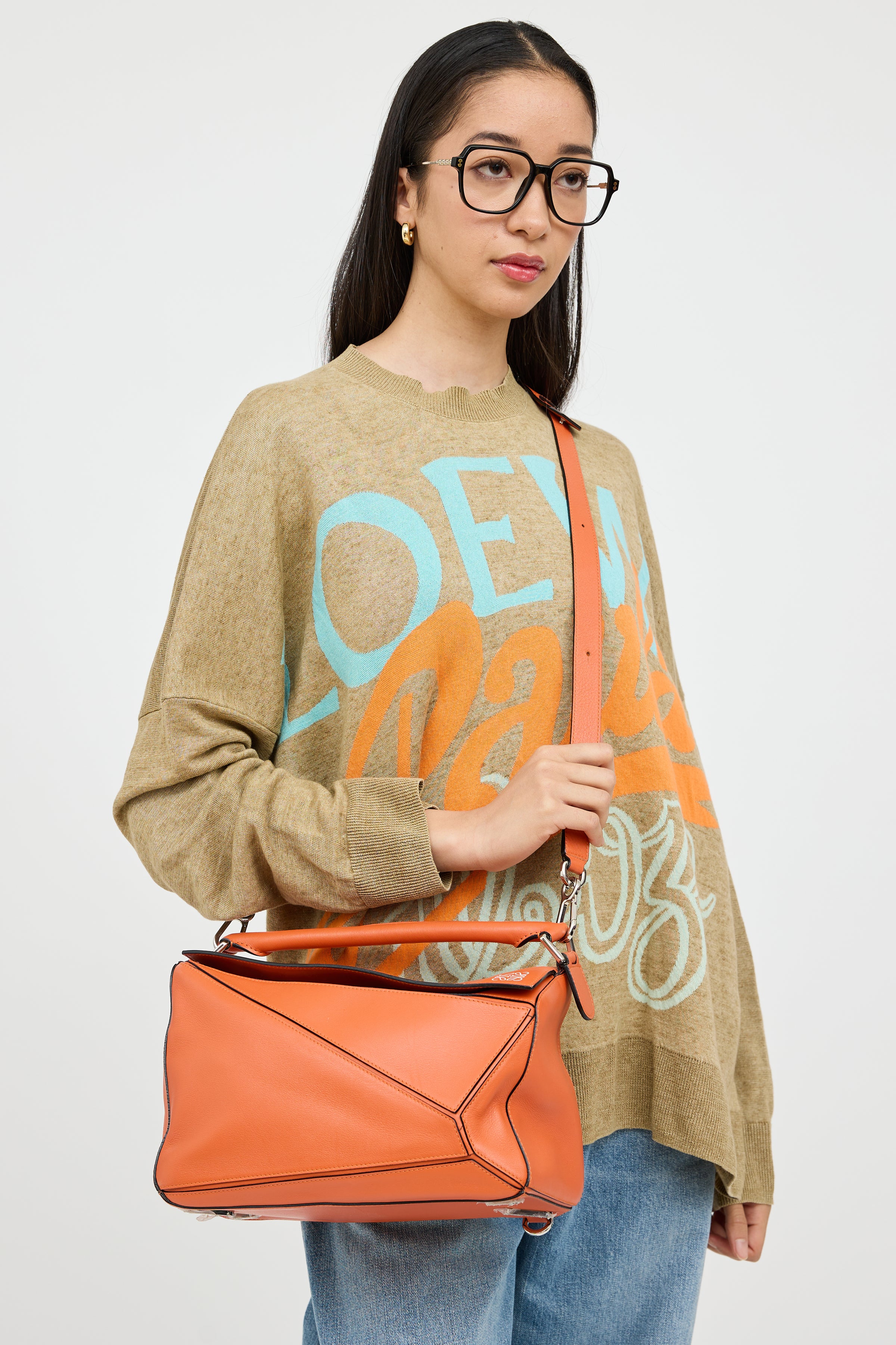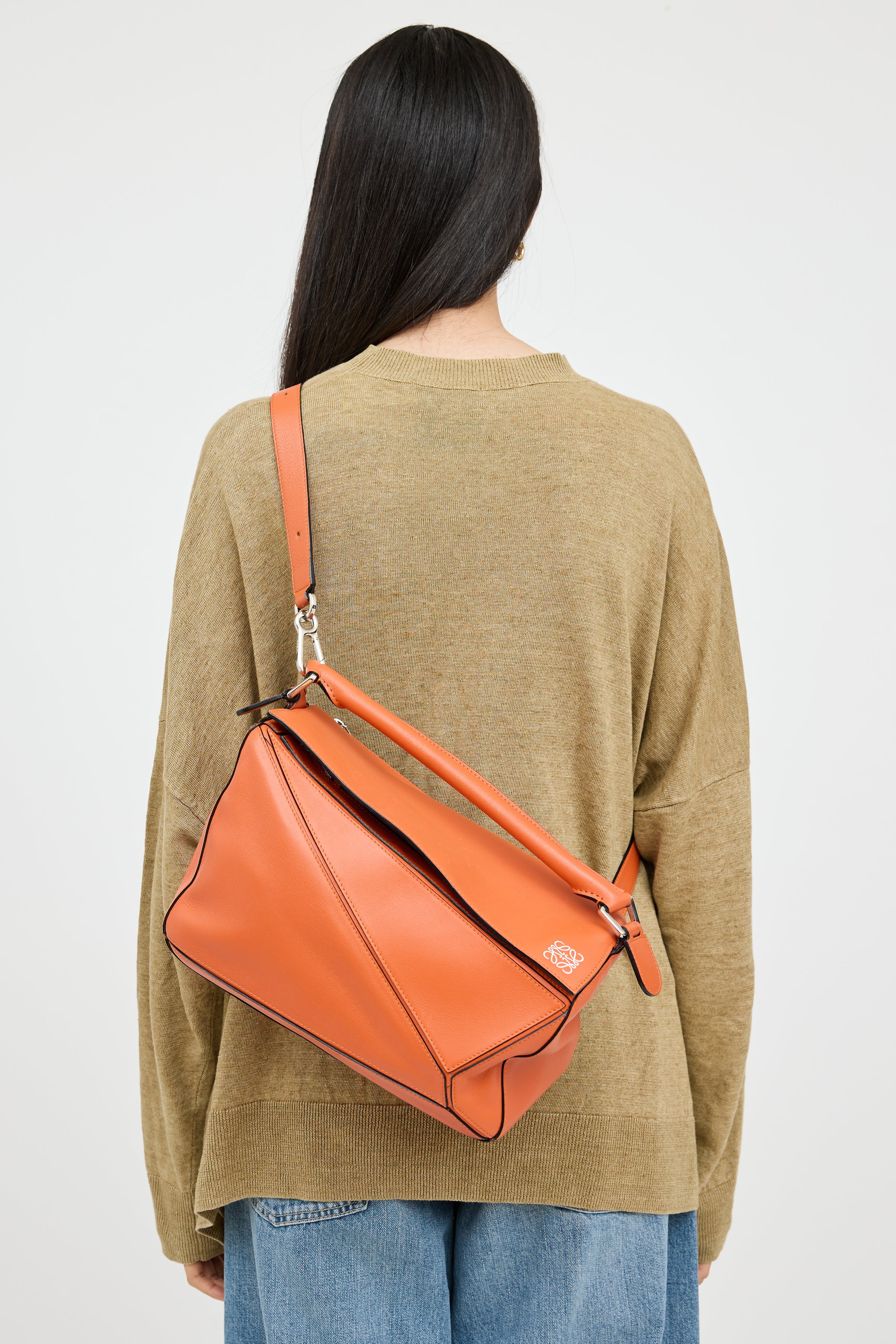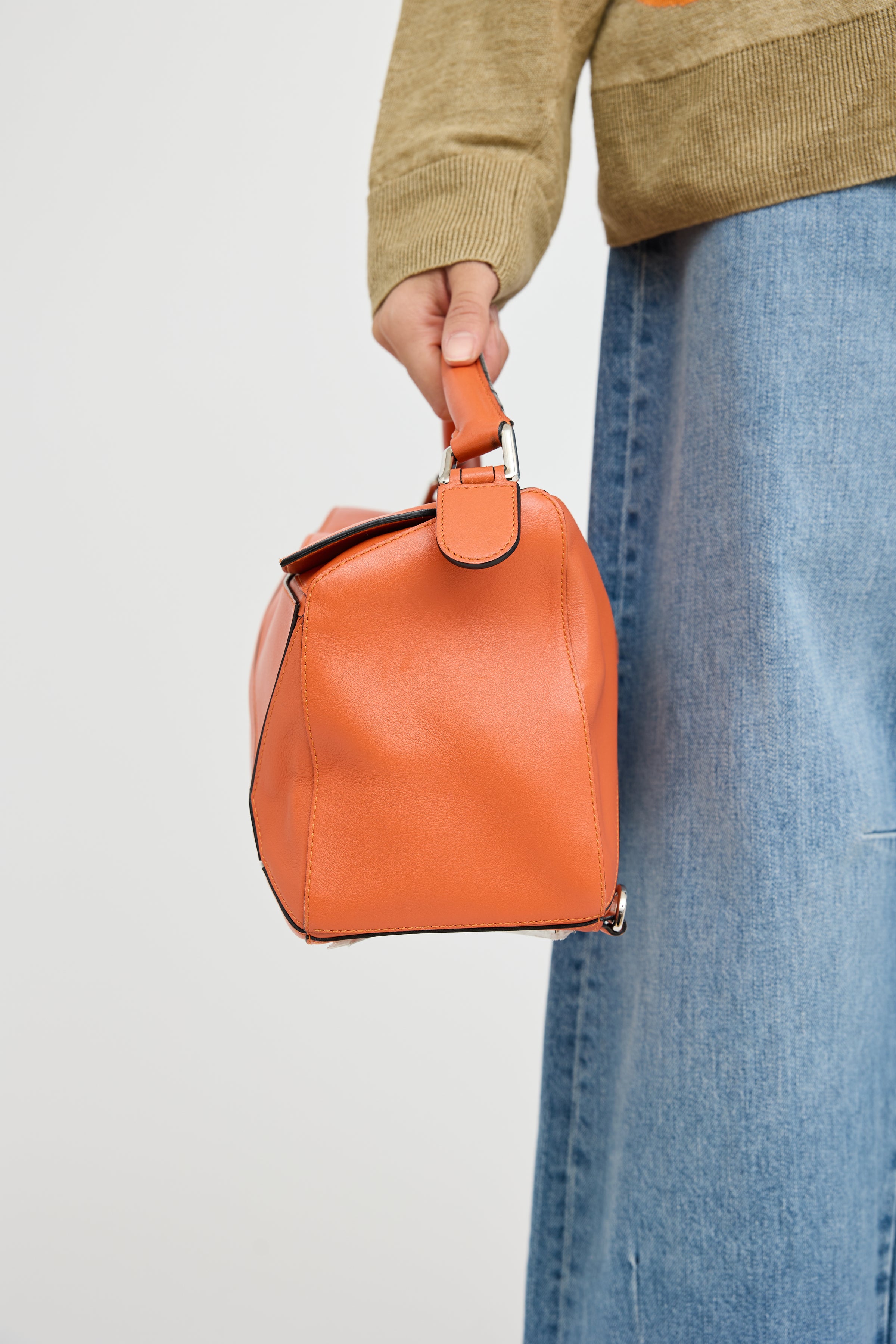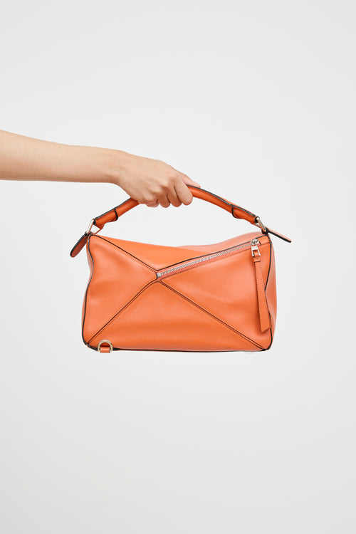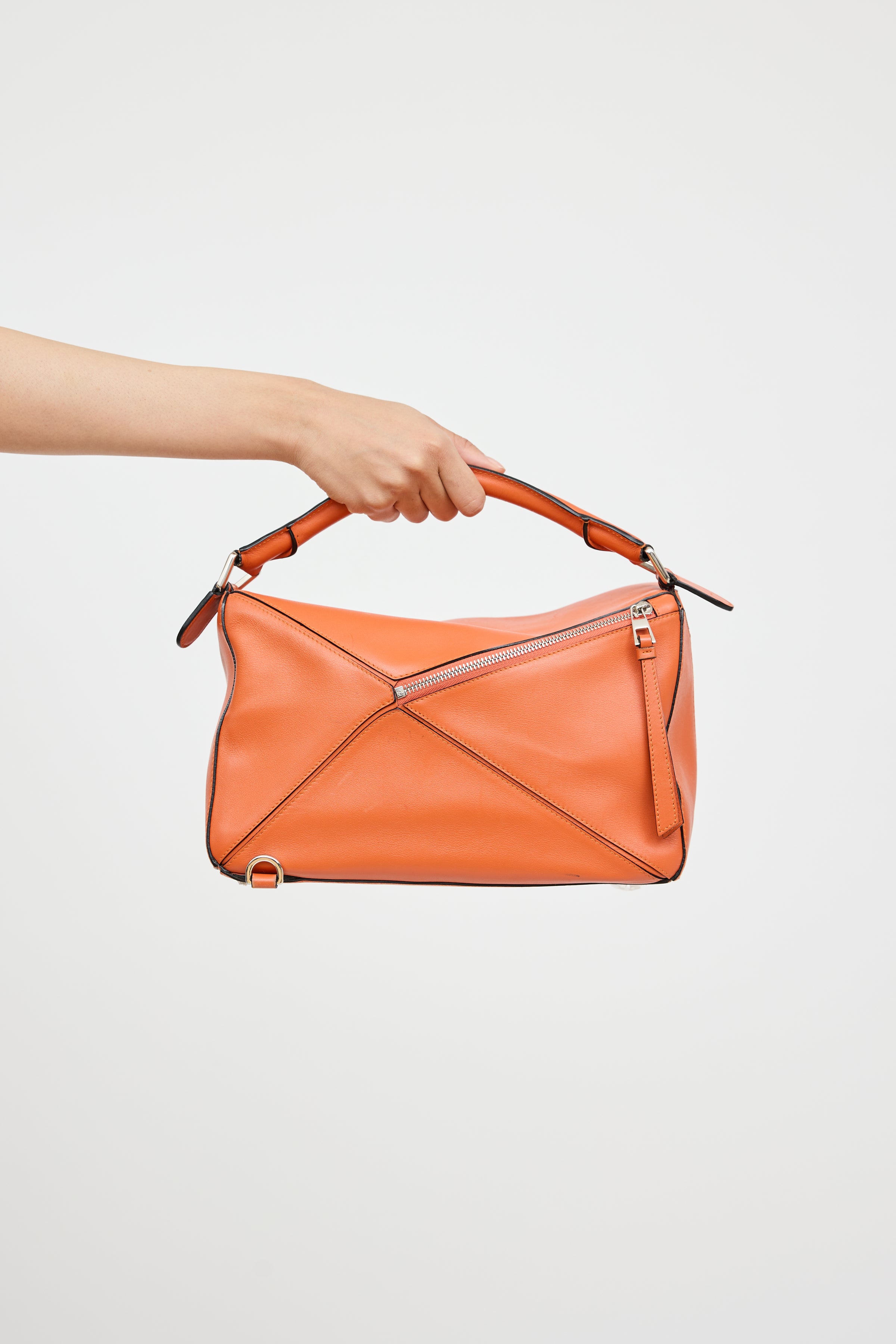 Pre-owned Loewe orange leather medium Puzzle bag featuring tonal stitching silver tone hardware, four protective feet at base, panel design, one zip pocket and D ring at back side, single rolled top handle, detachable and adjustable shoulder strap, top flap with white stamped logo, concealed top zip closure with long leather pull tab, and one canvas lined main compartment with two slip pockets.