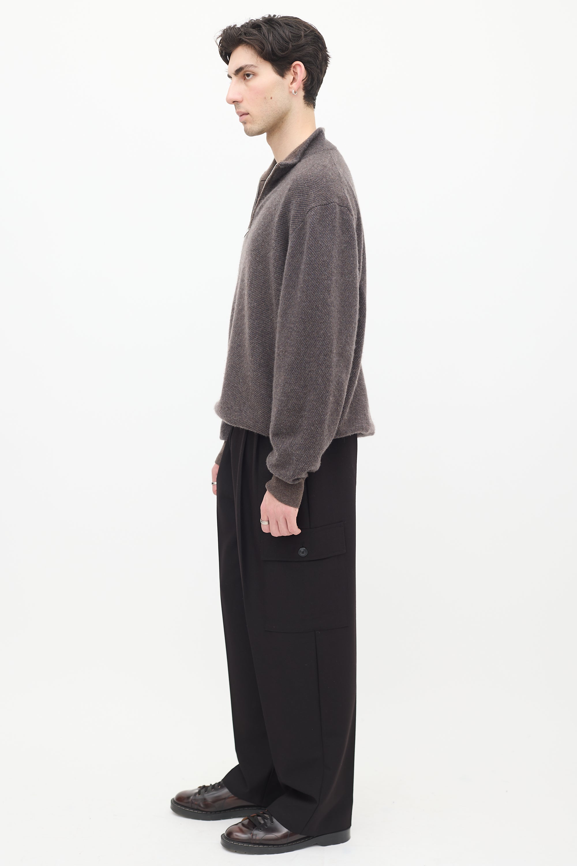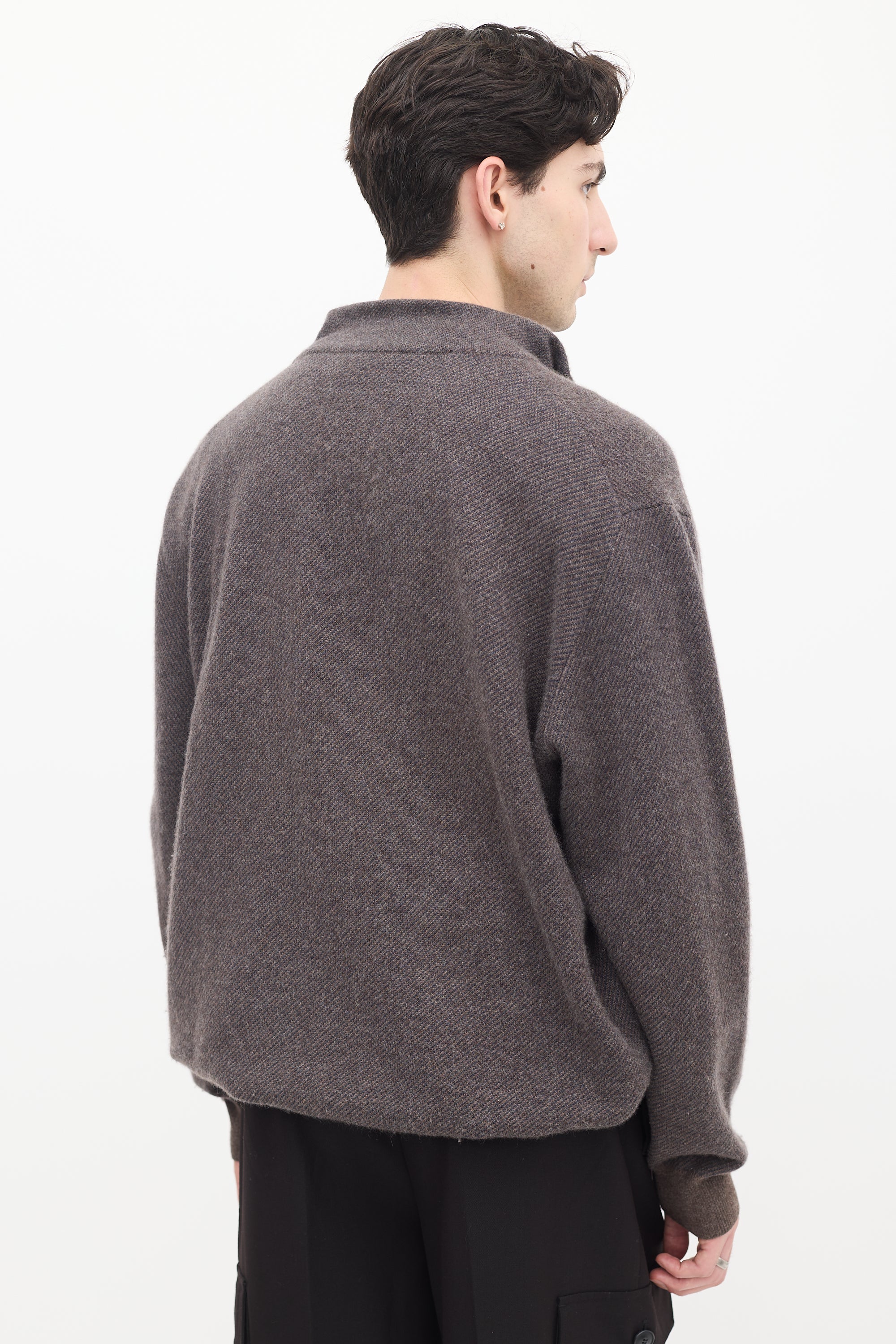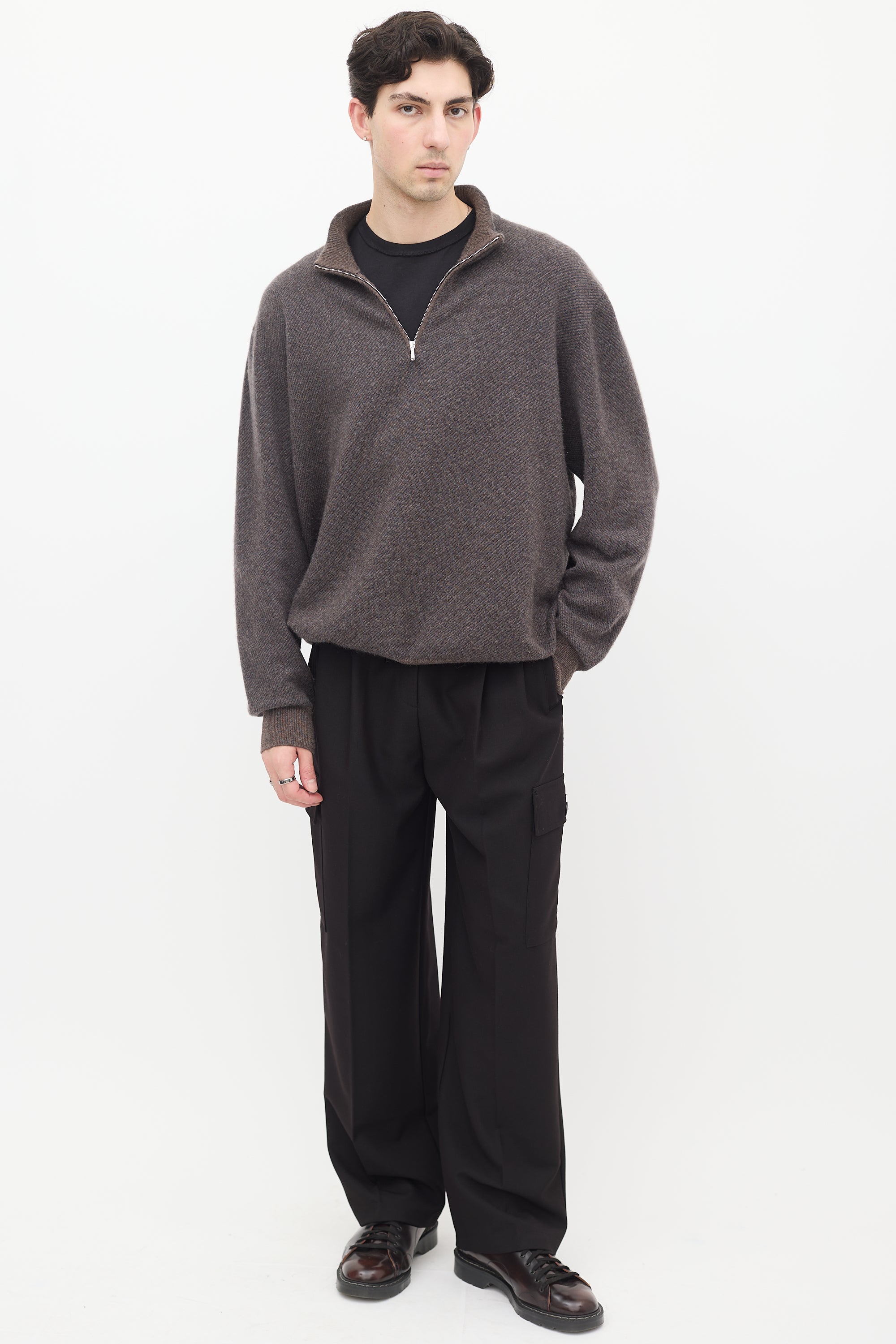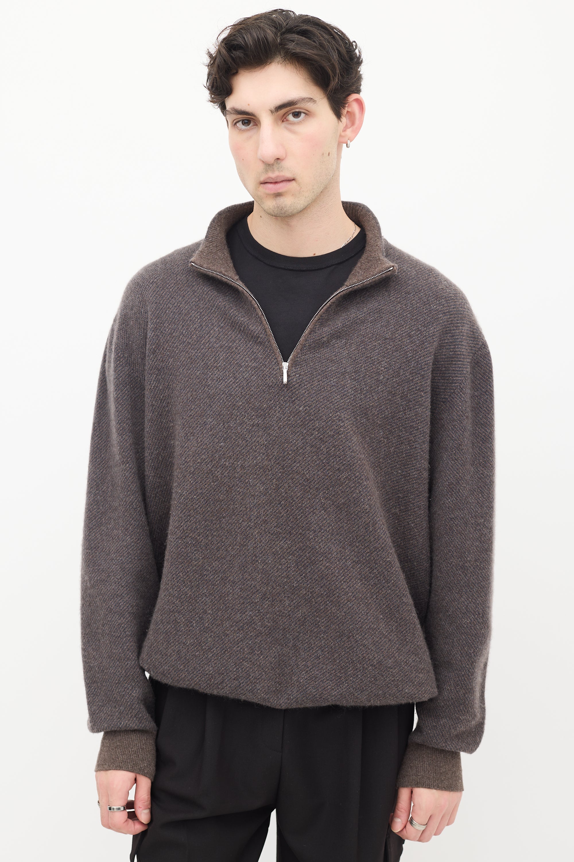 Pre-owned Loro Piana brown cashmere Roadster Pull sweater featuring high collar, quarter zip front, and ribbed cuffs and hem.