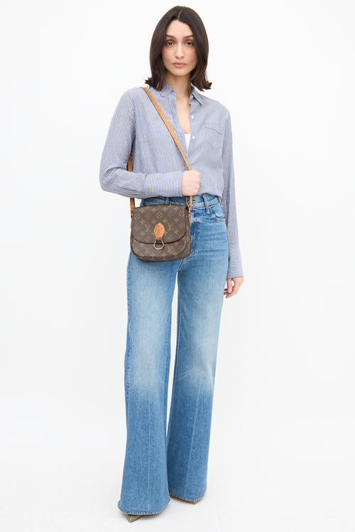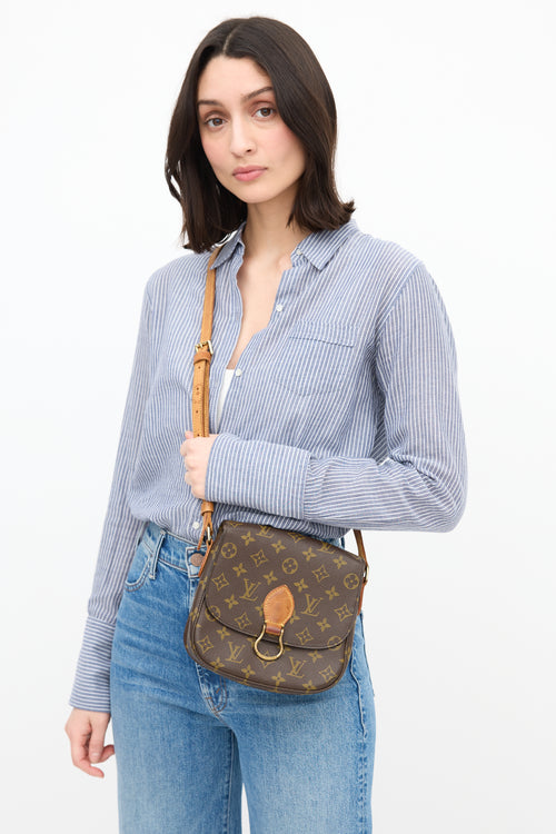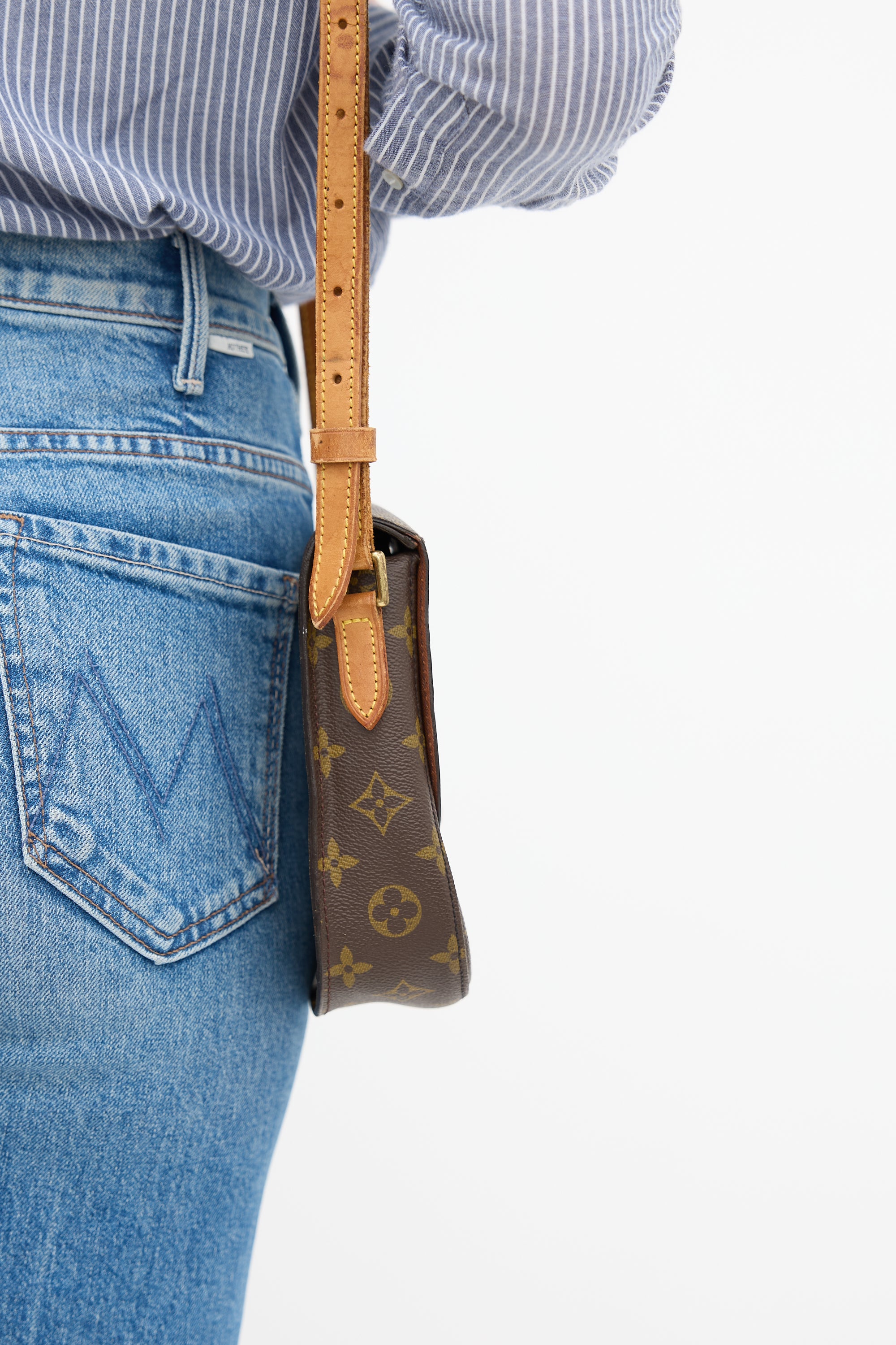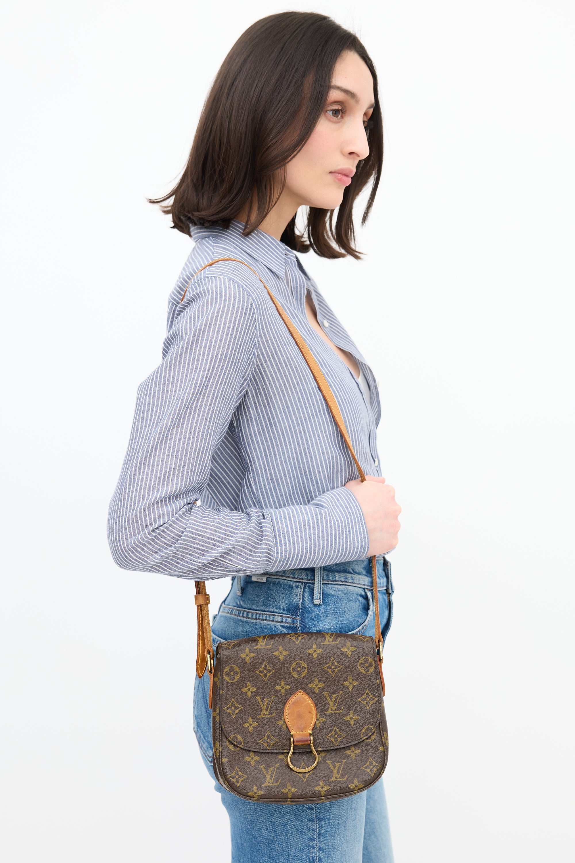 Pre-owned Louis Vuitton 1996 brown coated canvas Saint Cloud PM bag featuring signature monogram print, brown Vachetta leather details, adjustable shoulder strap, back slip pocket, front flap with logo hardware, snap button closure, and one lined main compartment with one zip pocket.