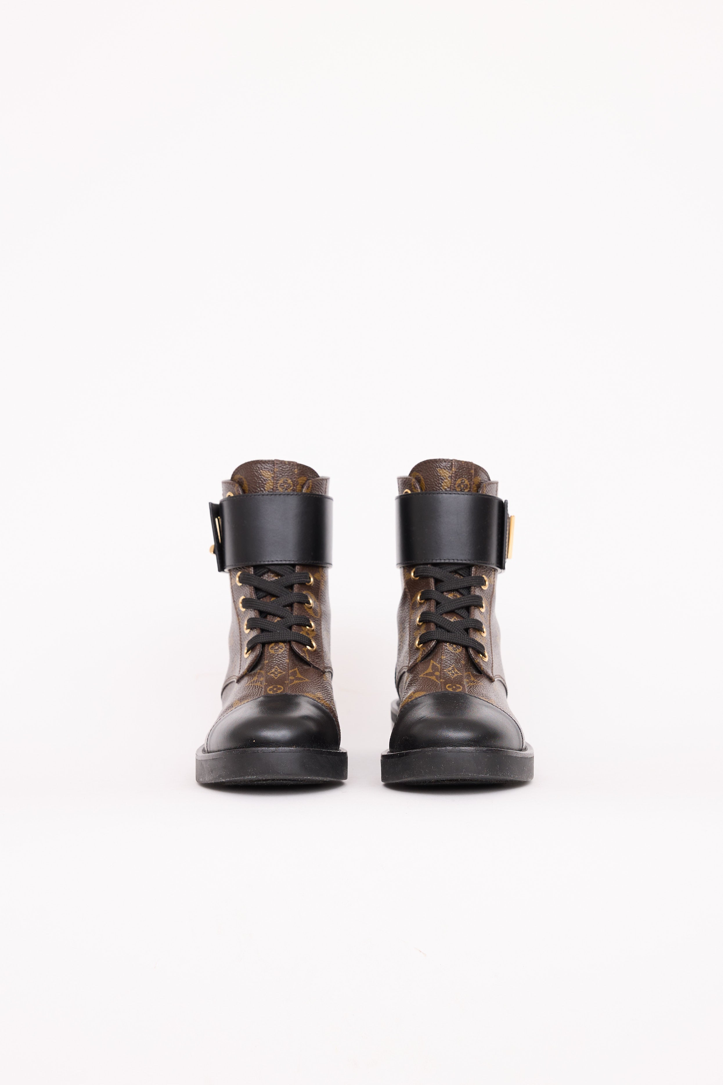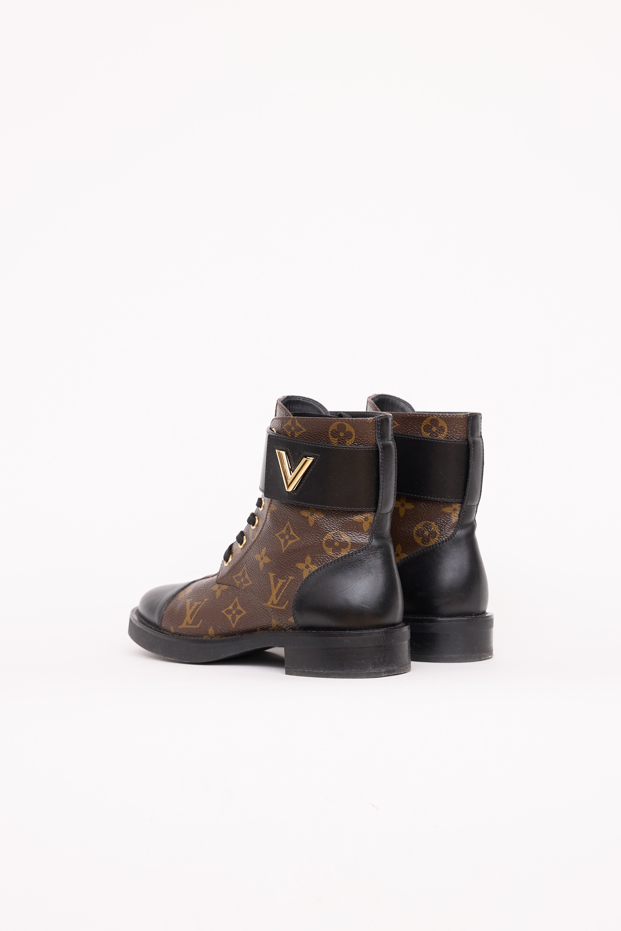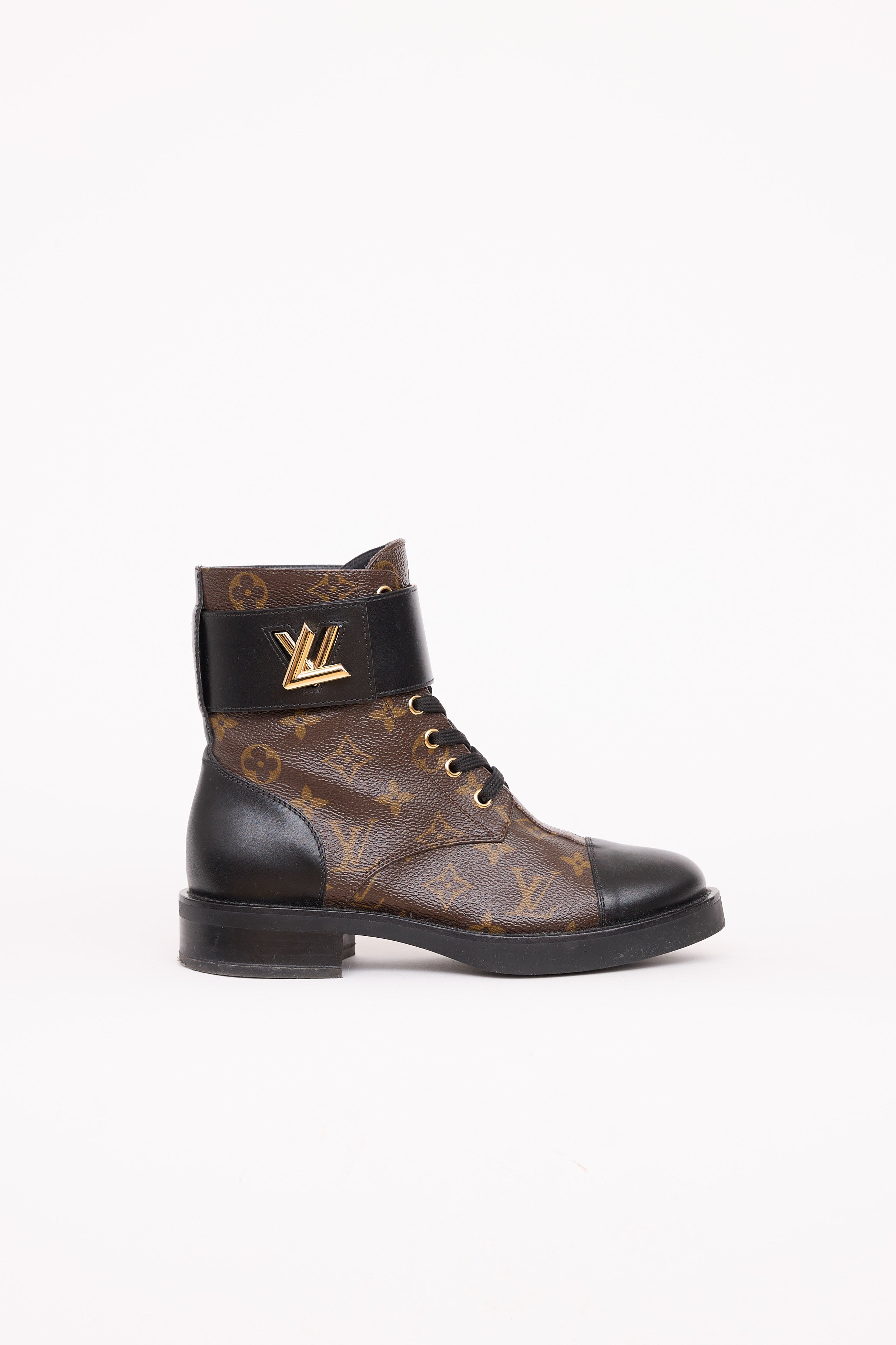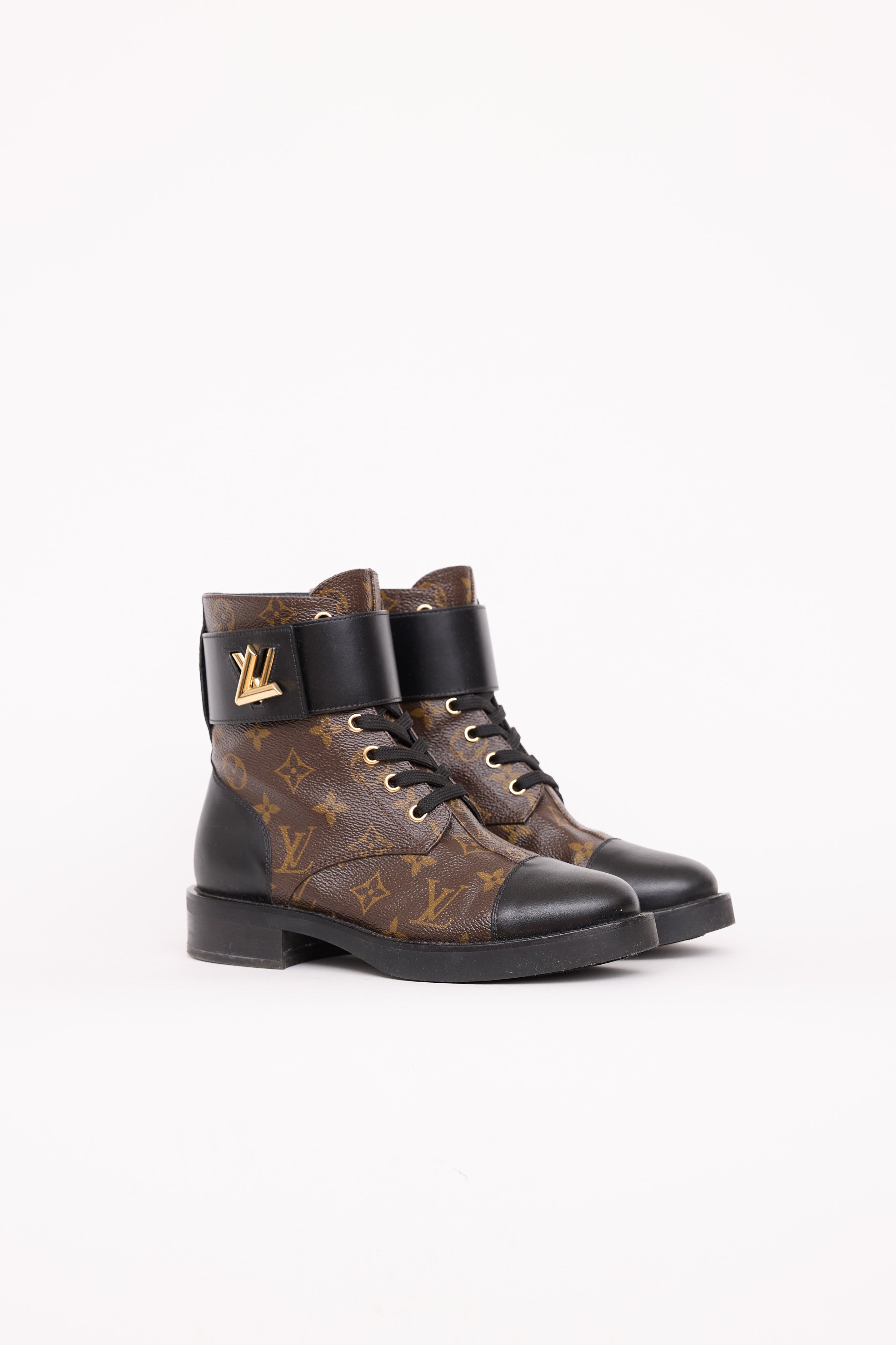 Pre-owned Louis Vuitton black and brown Wonderland Ranger boots featuring a round toe with black leather toe cap, brown coated canvas monogram upper, lace up front, black leather ankle strap with gold tone LV twist closure, and rubber outsole.