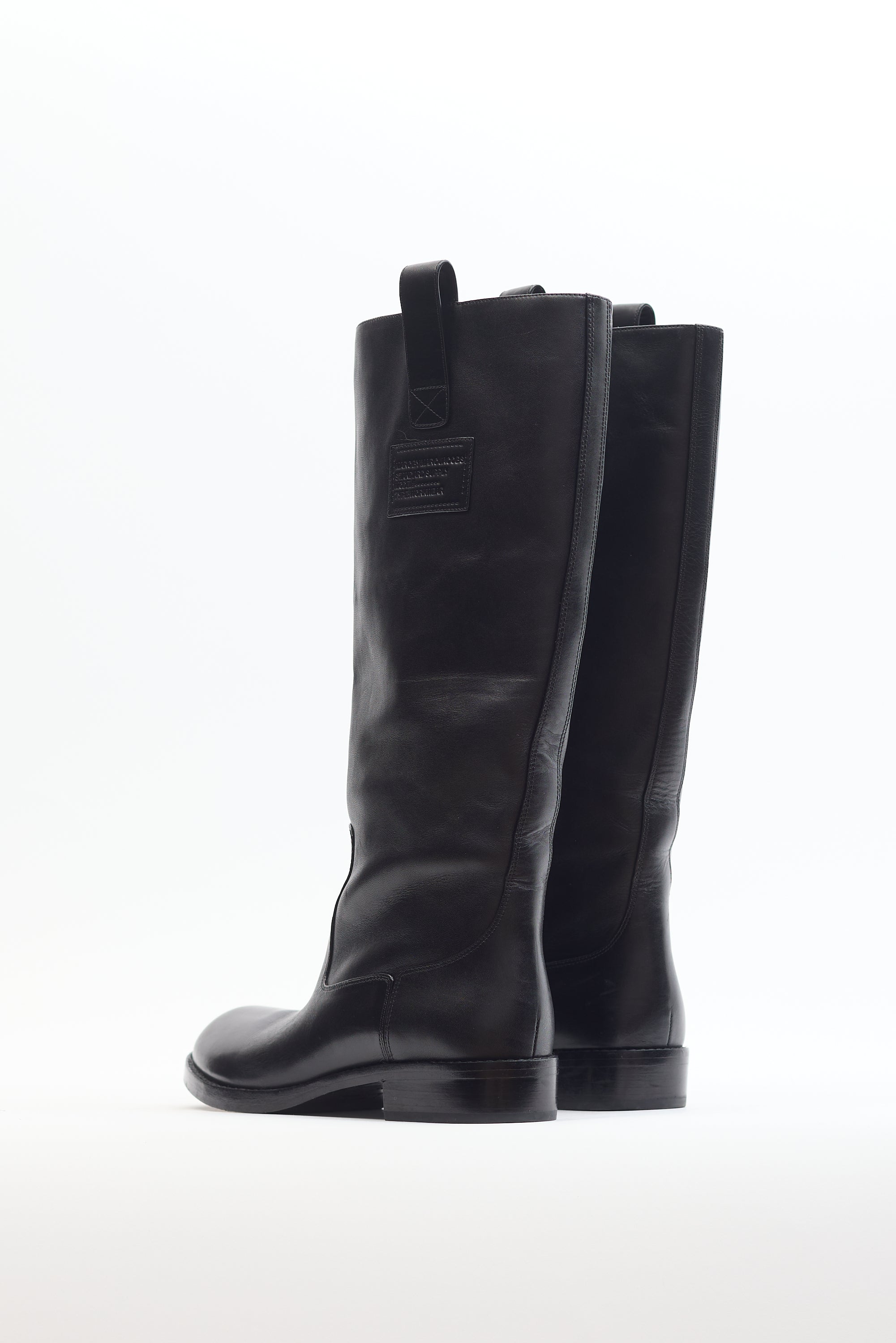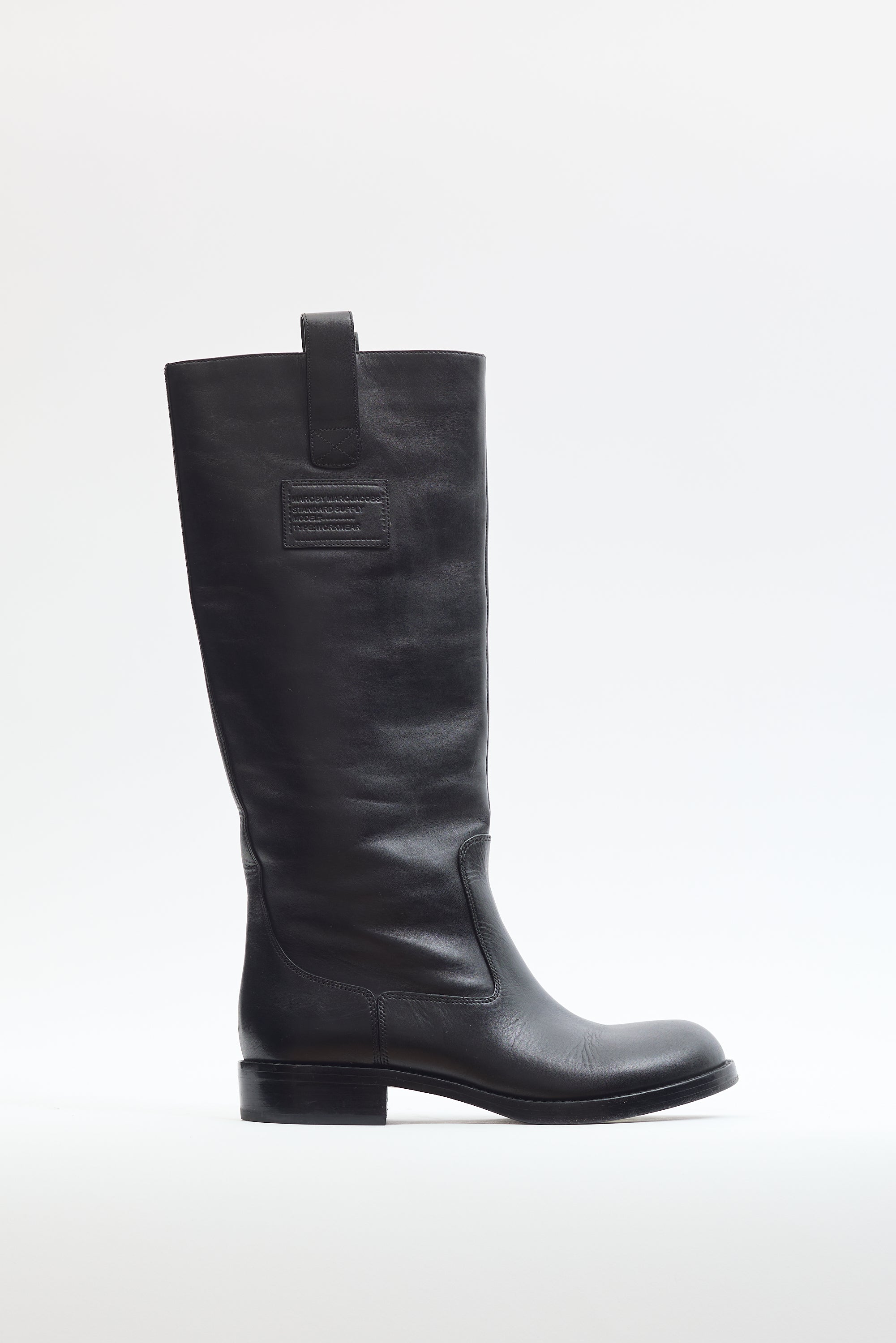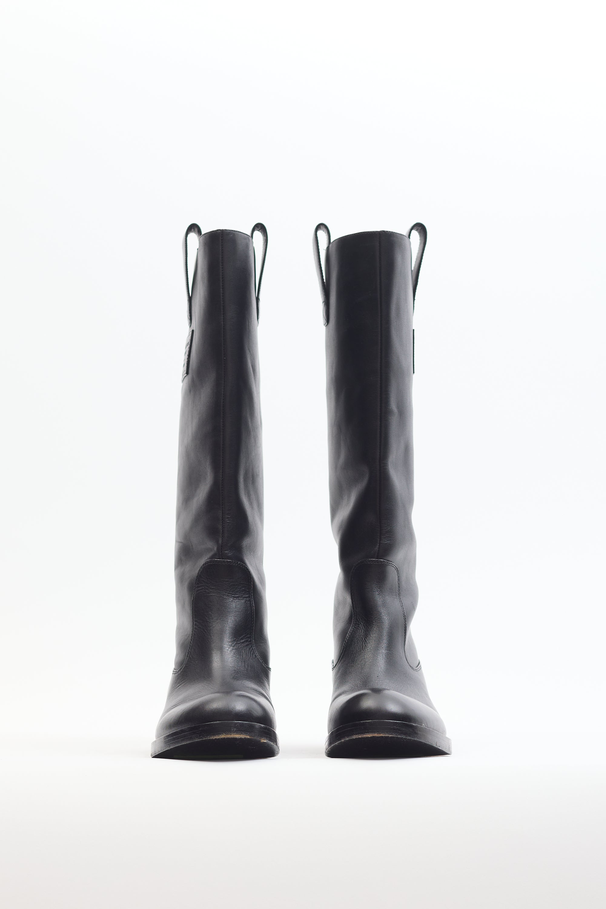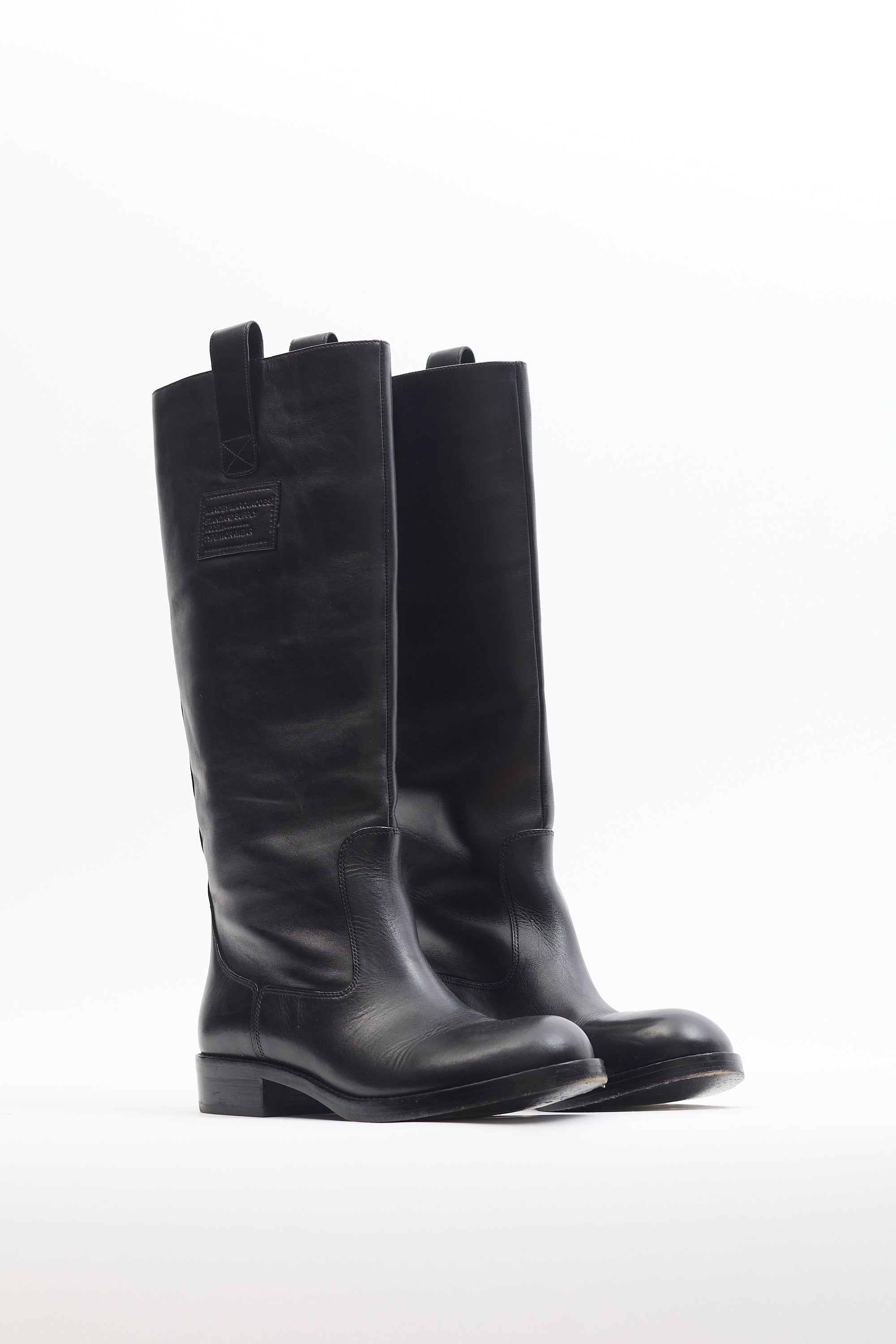 Pre-owned Marc By Marc Jacobs black leather knee high riding boots featuring rounded toe, outer side logo, double pull tabs at collar and short stacked heel.