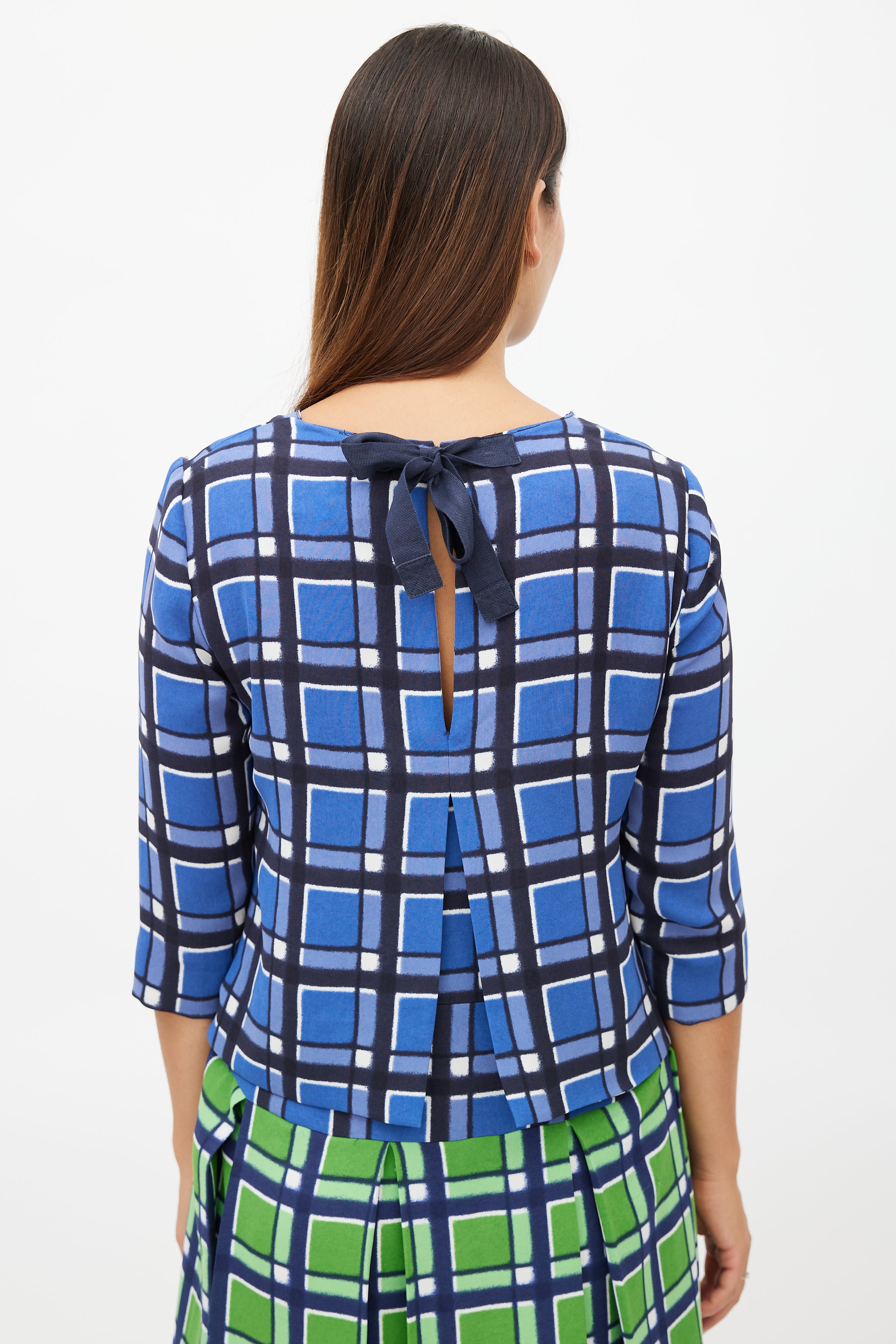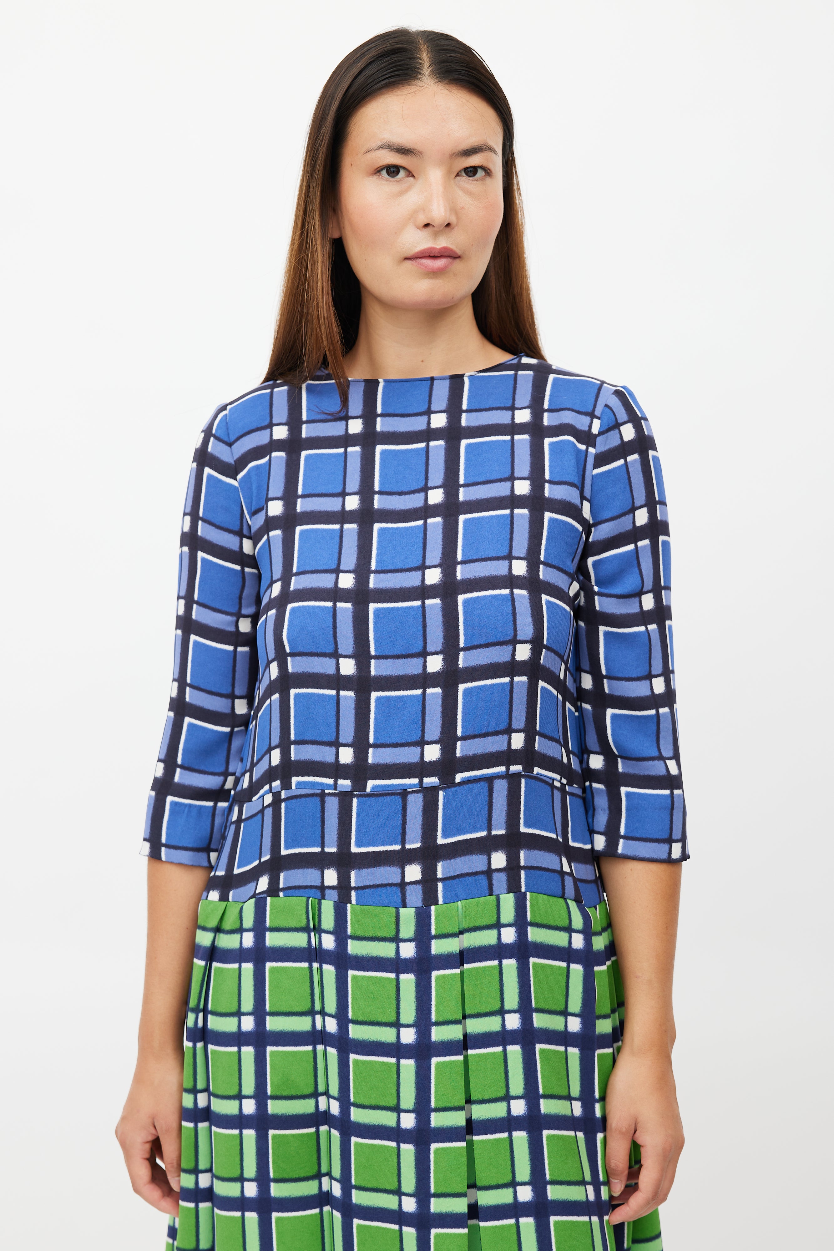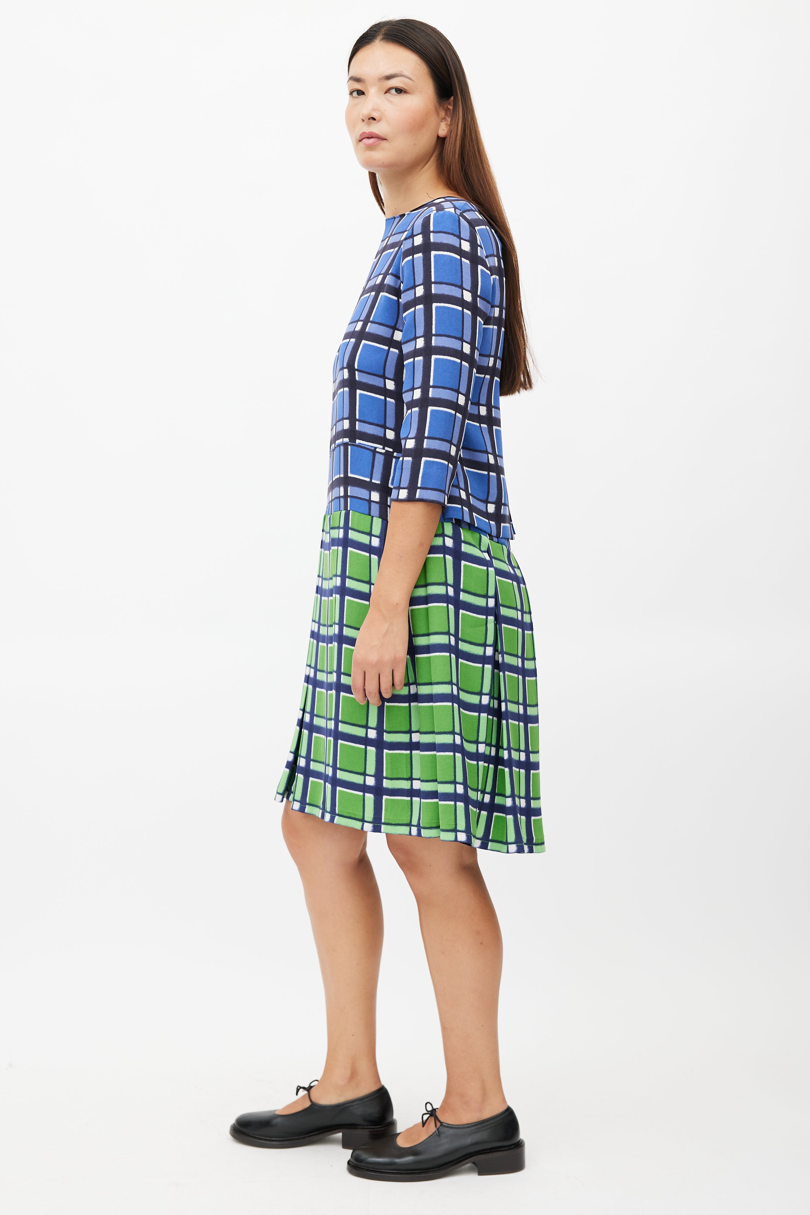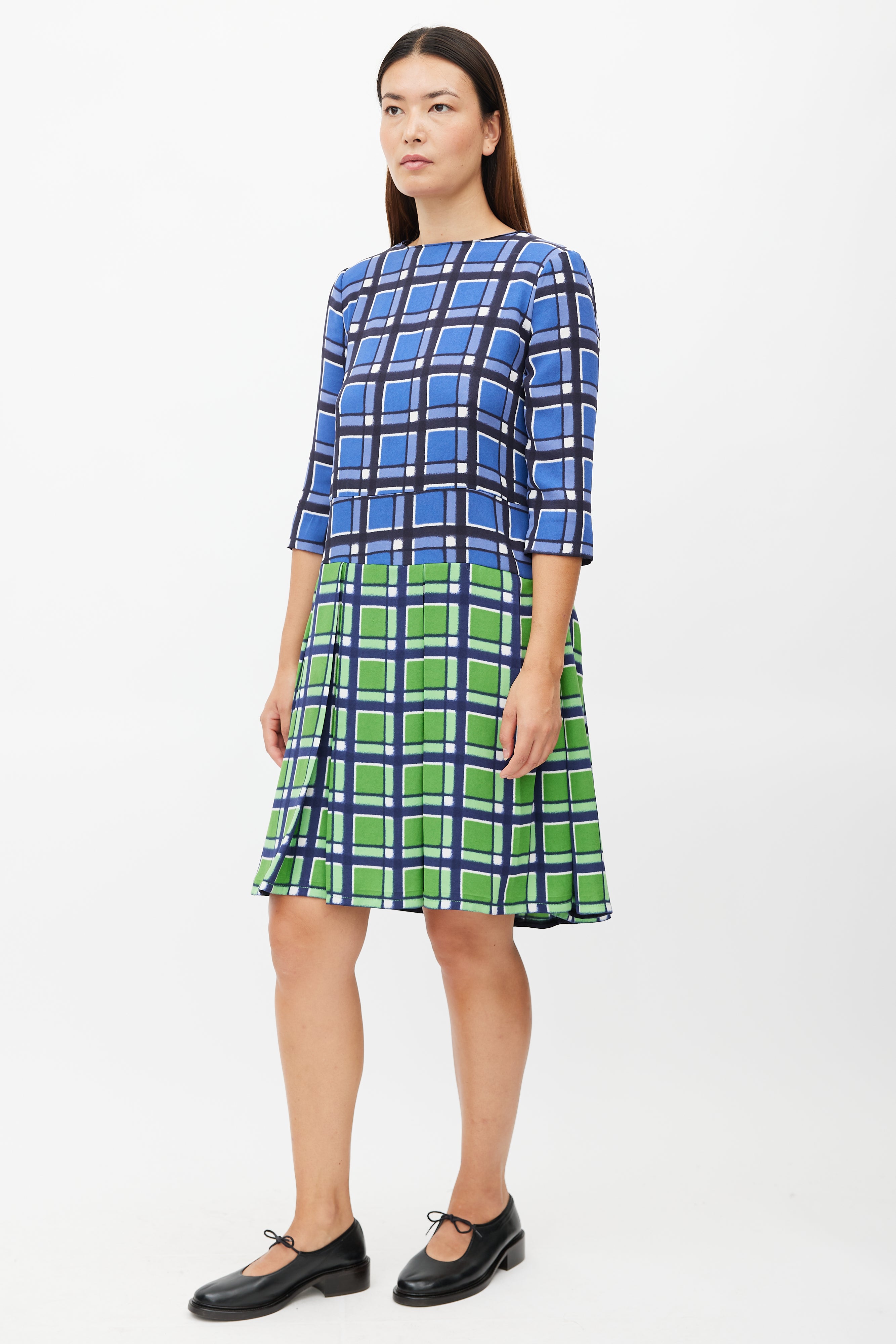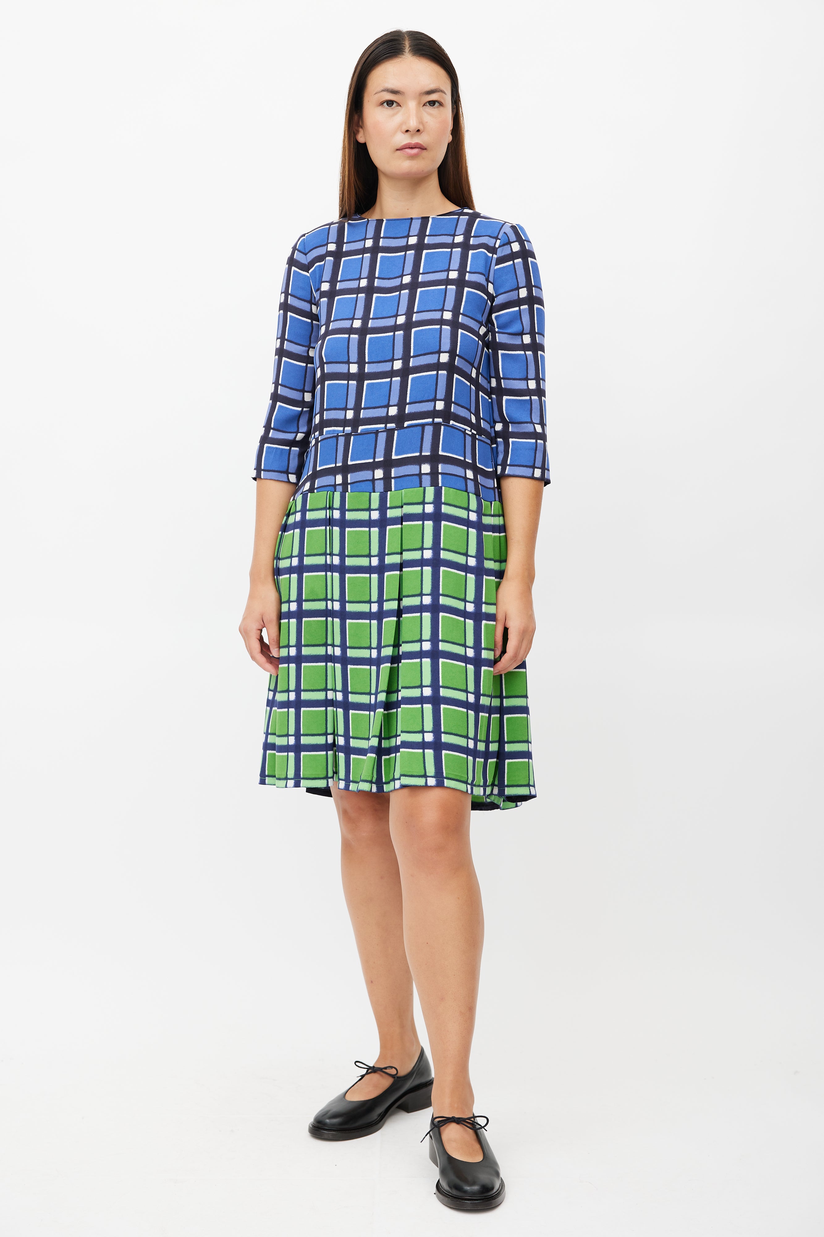 Pre-owned Marc by Marc Jacobs blue and green dress featuring a plaid print throughout, round neckline, three quarter length sleeves, pleated skirt, and tie detail at back with hook and eye closure.