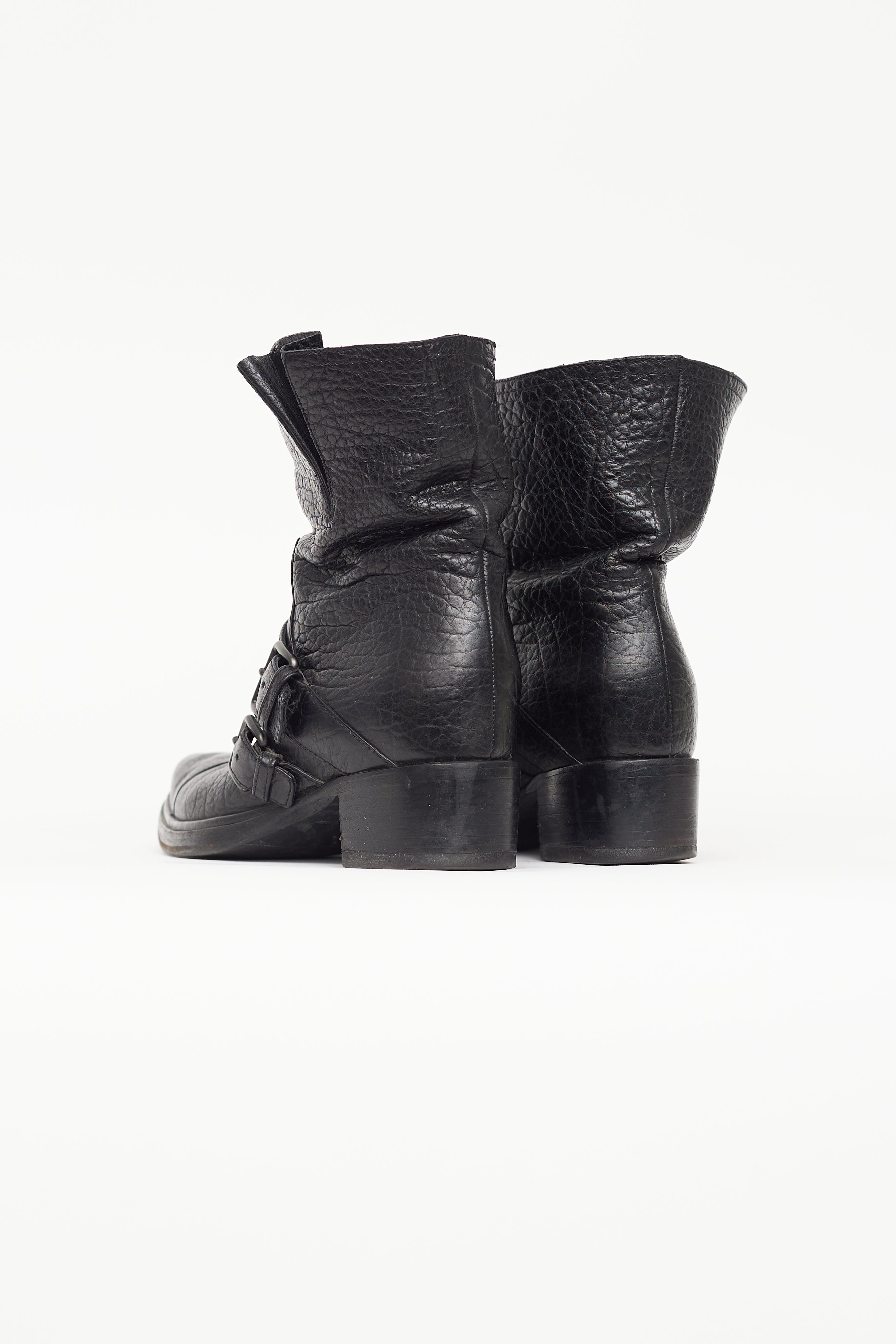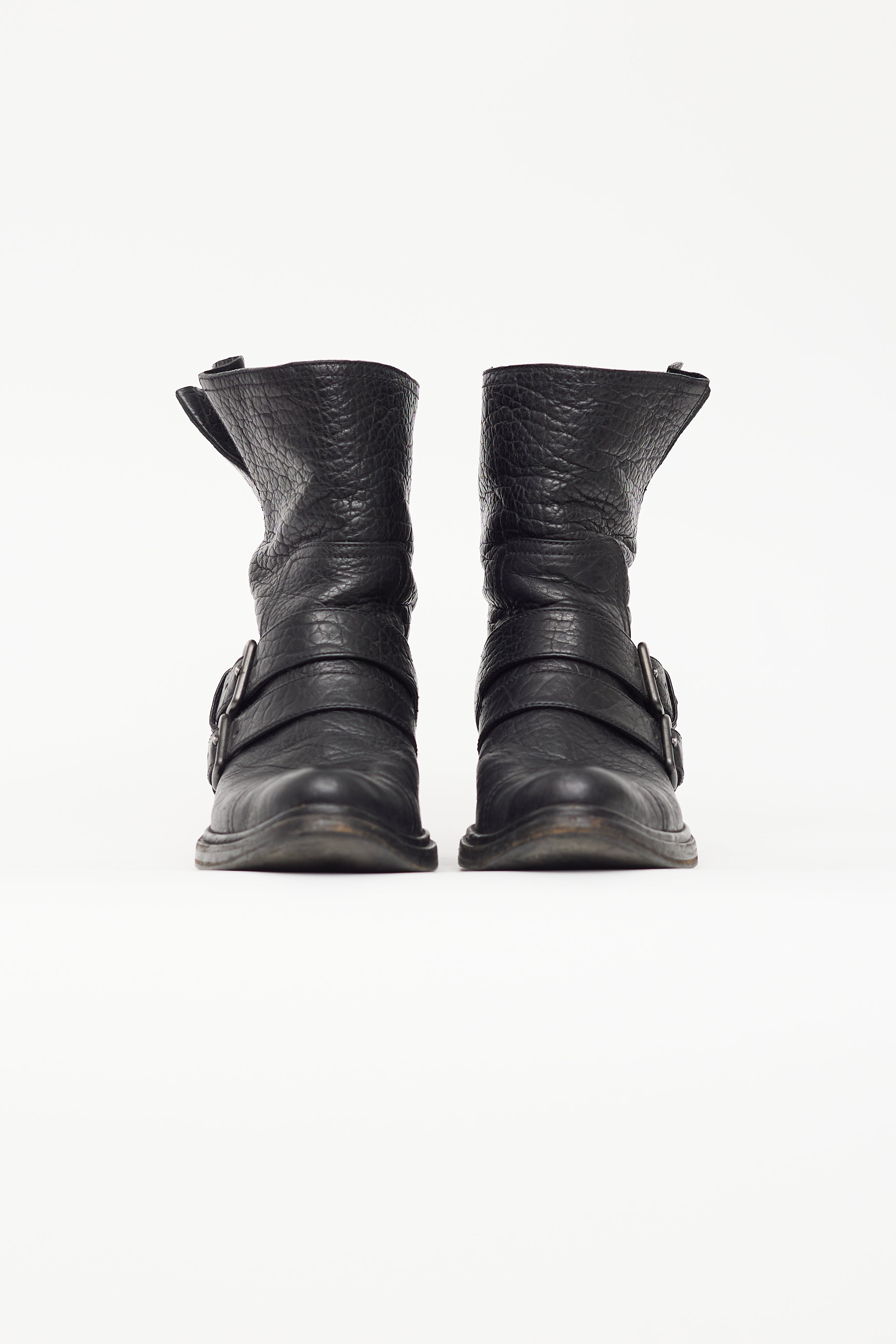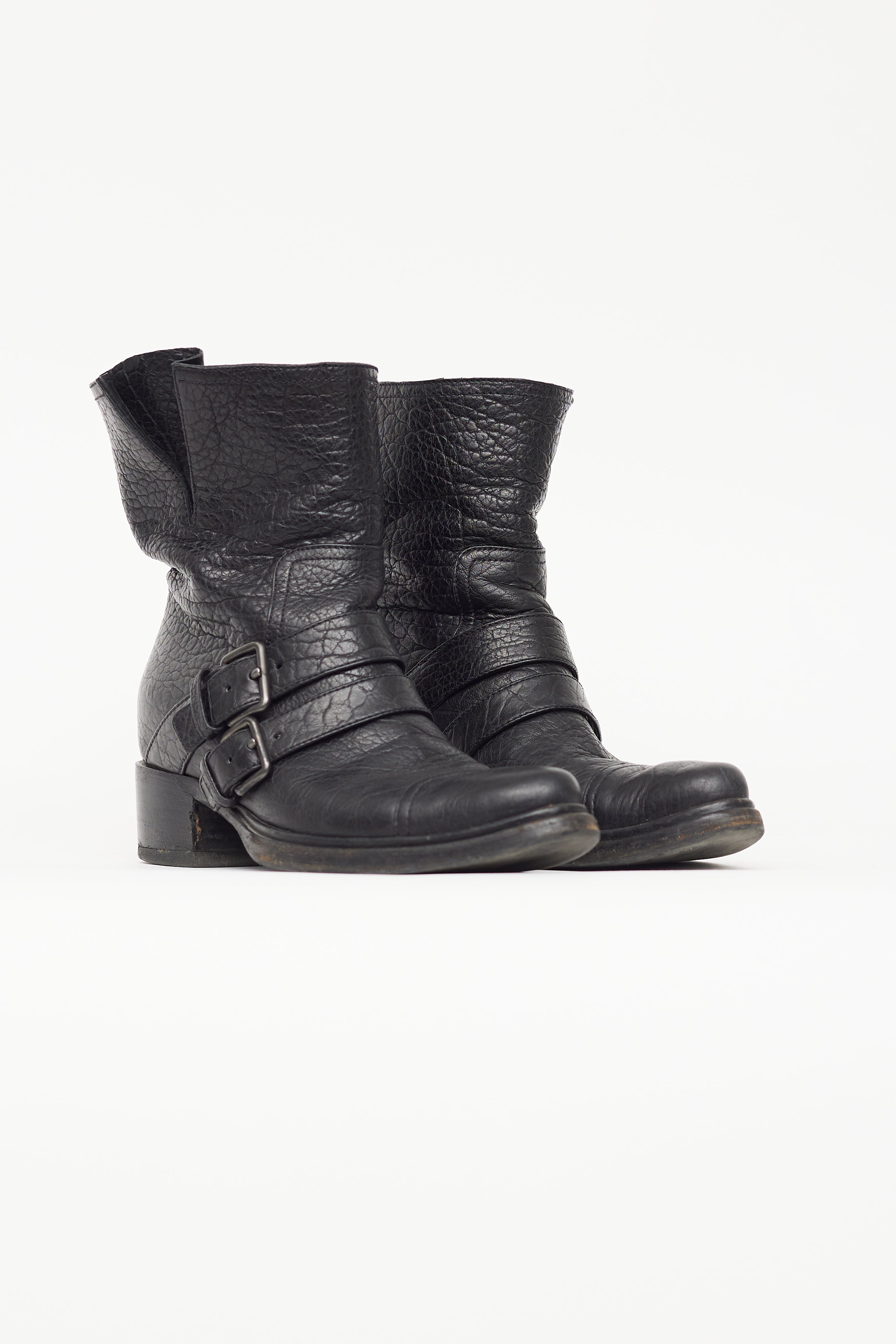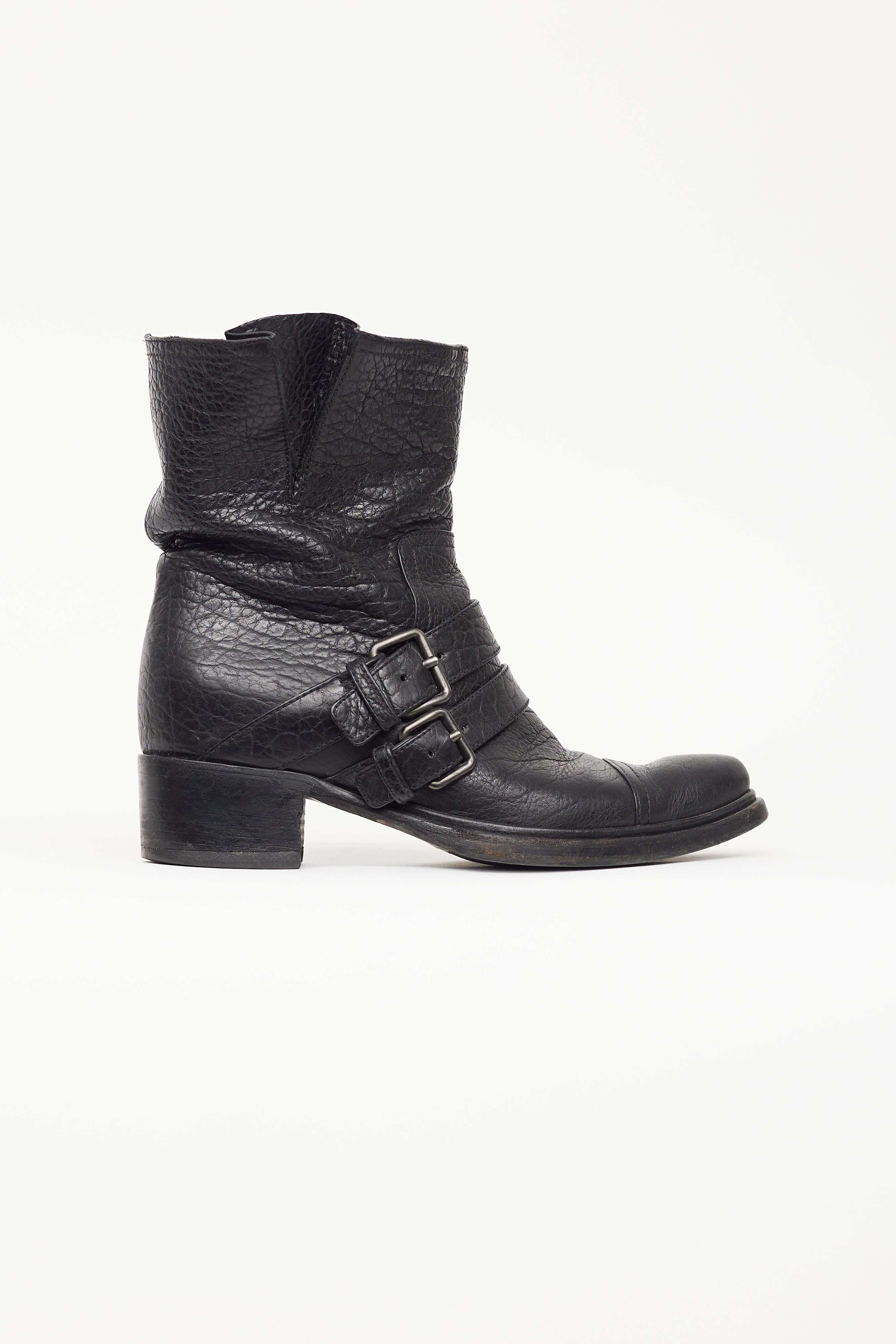 Pre-owned Miu Miu black leather mid calf boot featuring double straps with buckle across vamp, almond toe, wooden block heel, and leather insoles.