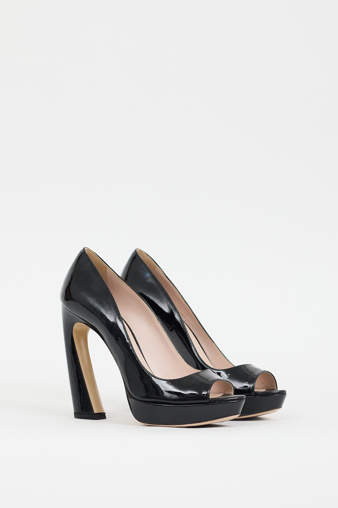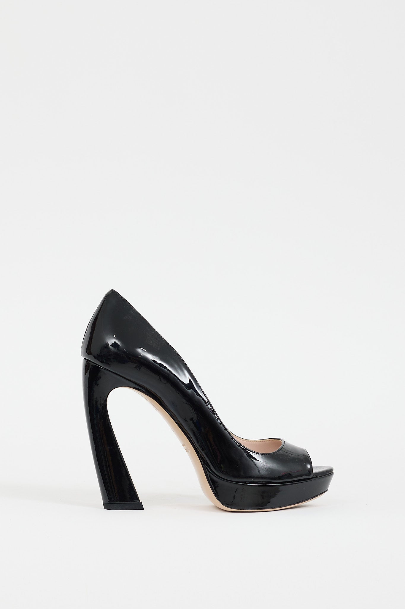 Pre-owned Miu Miu black patent leather pumps featuring an almond peep toe, short covered platform, and covered curved heel. Comes with original box and dust bags.