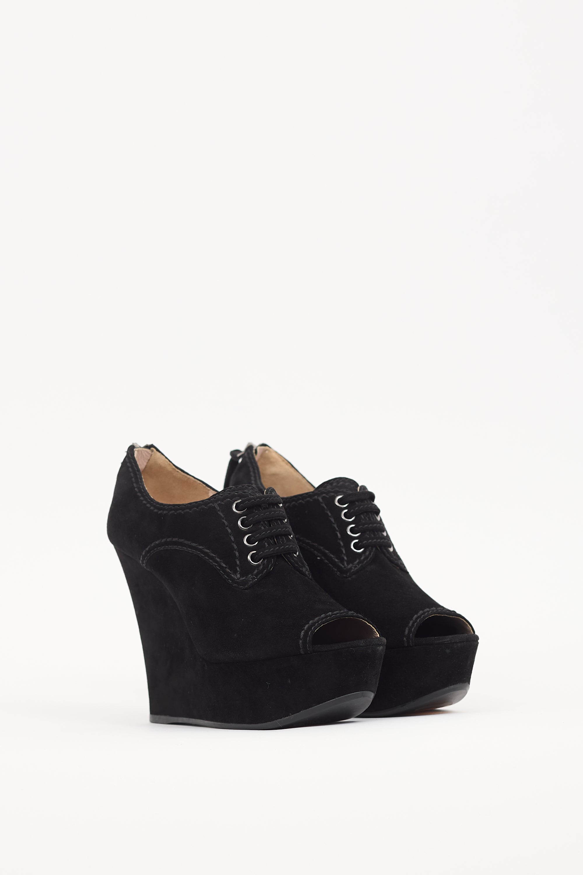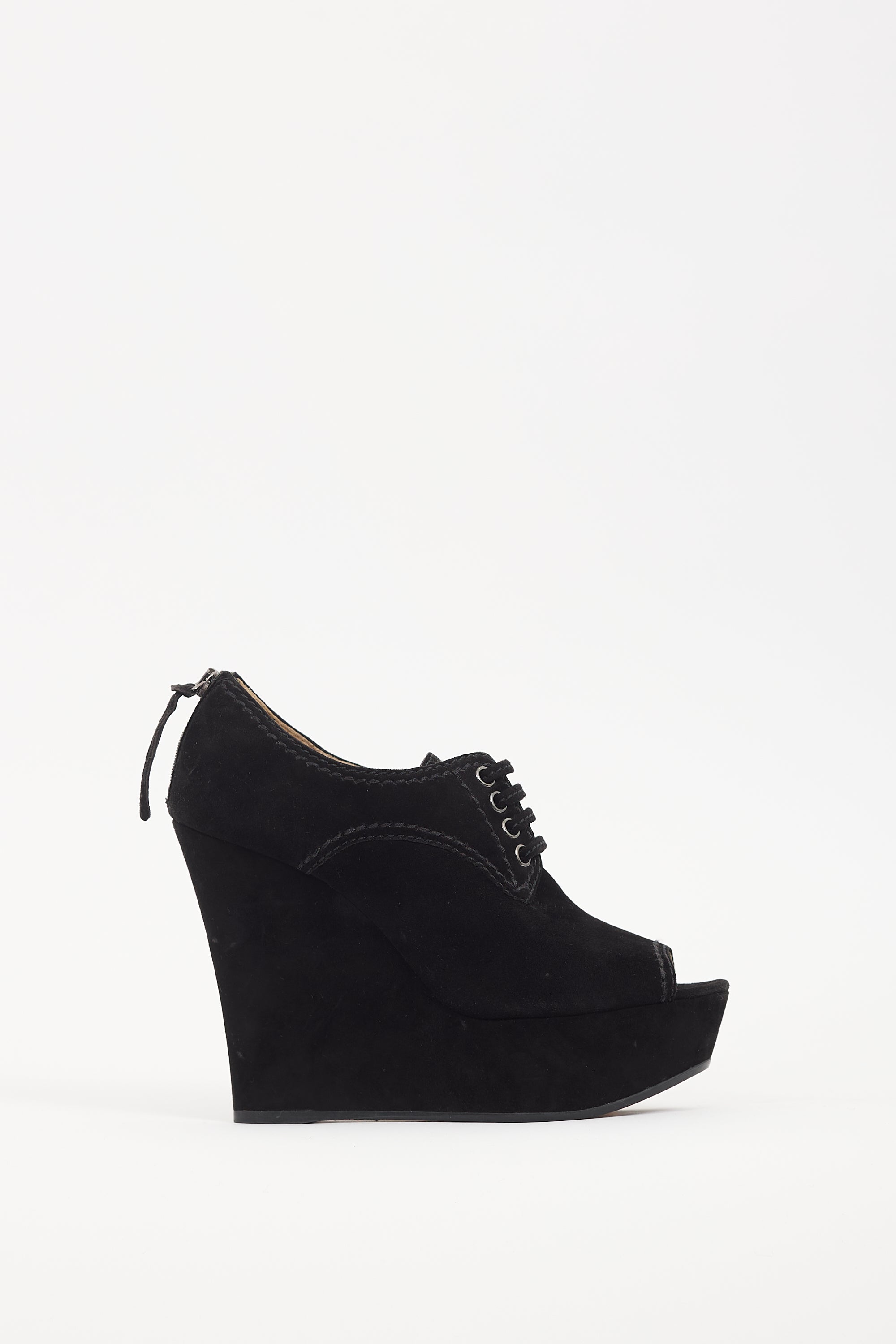 Pre-owned Miu Miu black suede wedge ankle boots featuring almond peep toe, lace up front, back zip closure, covered wedge platform, and rubber sole.
