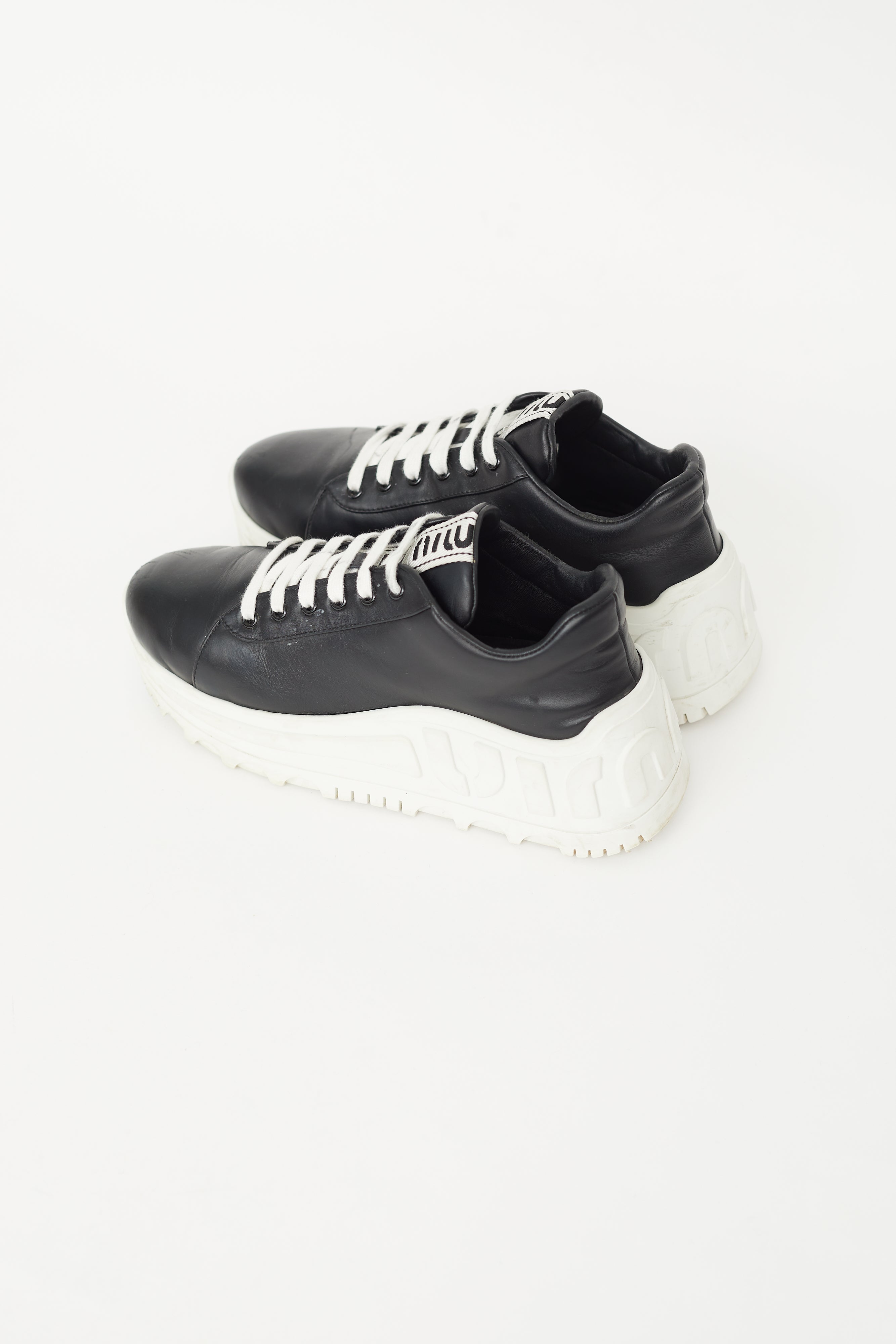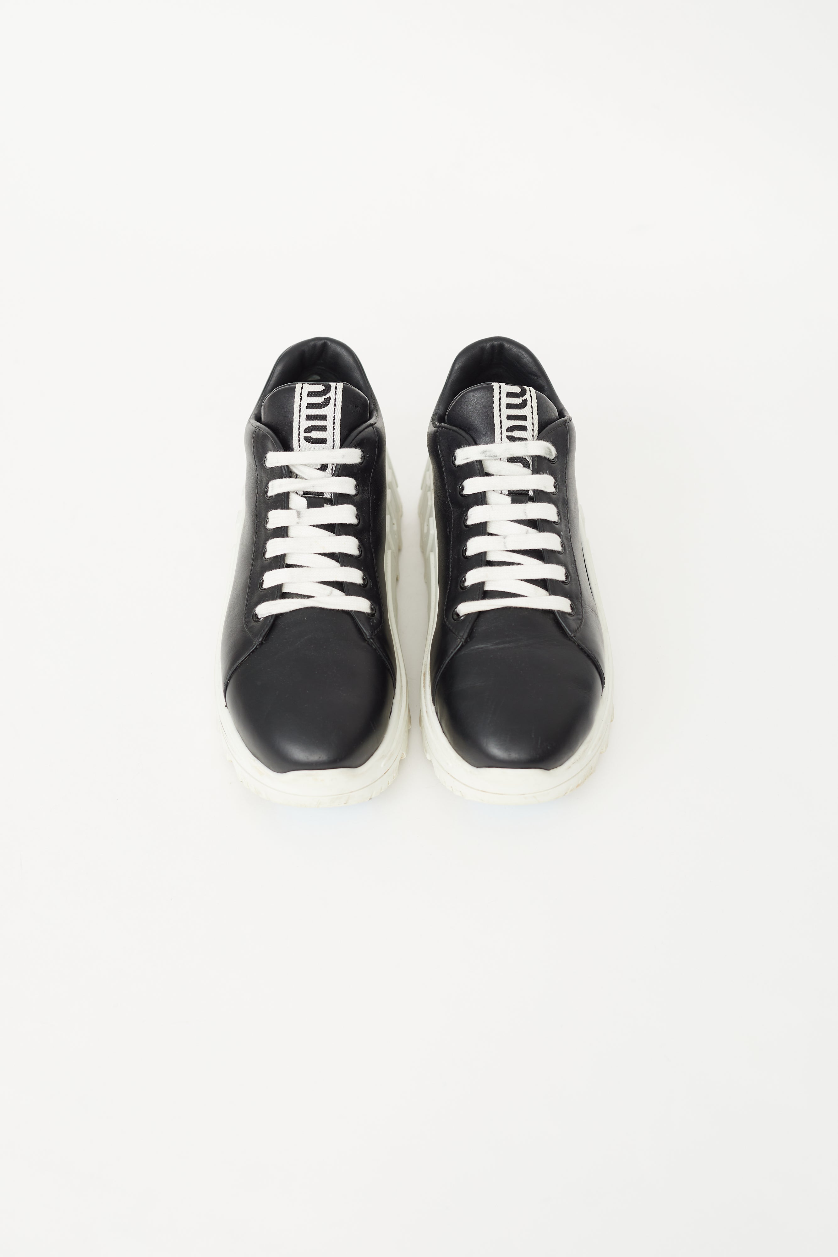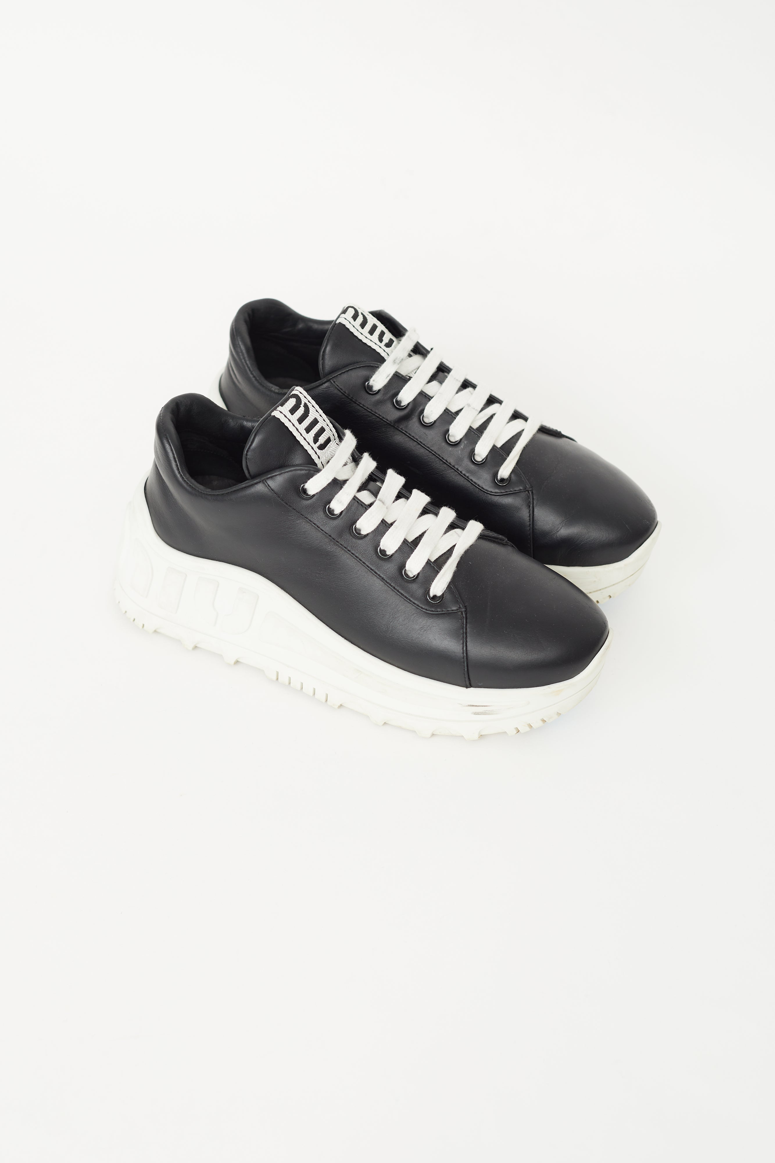 Pre-owned Miu Miu black leather sneakers featuring rubber platform outsole with logo at midsole, lace up vamp, tongue with woven logo textile, round toe and leather insole. Comes with original dust bag.