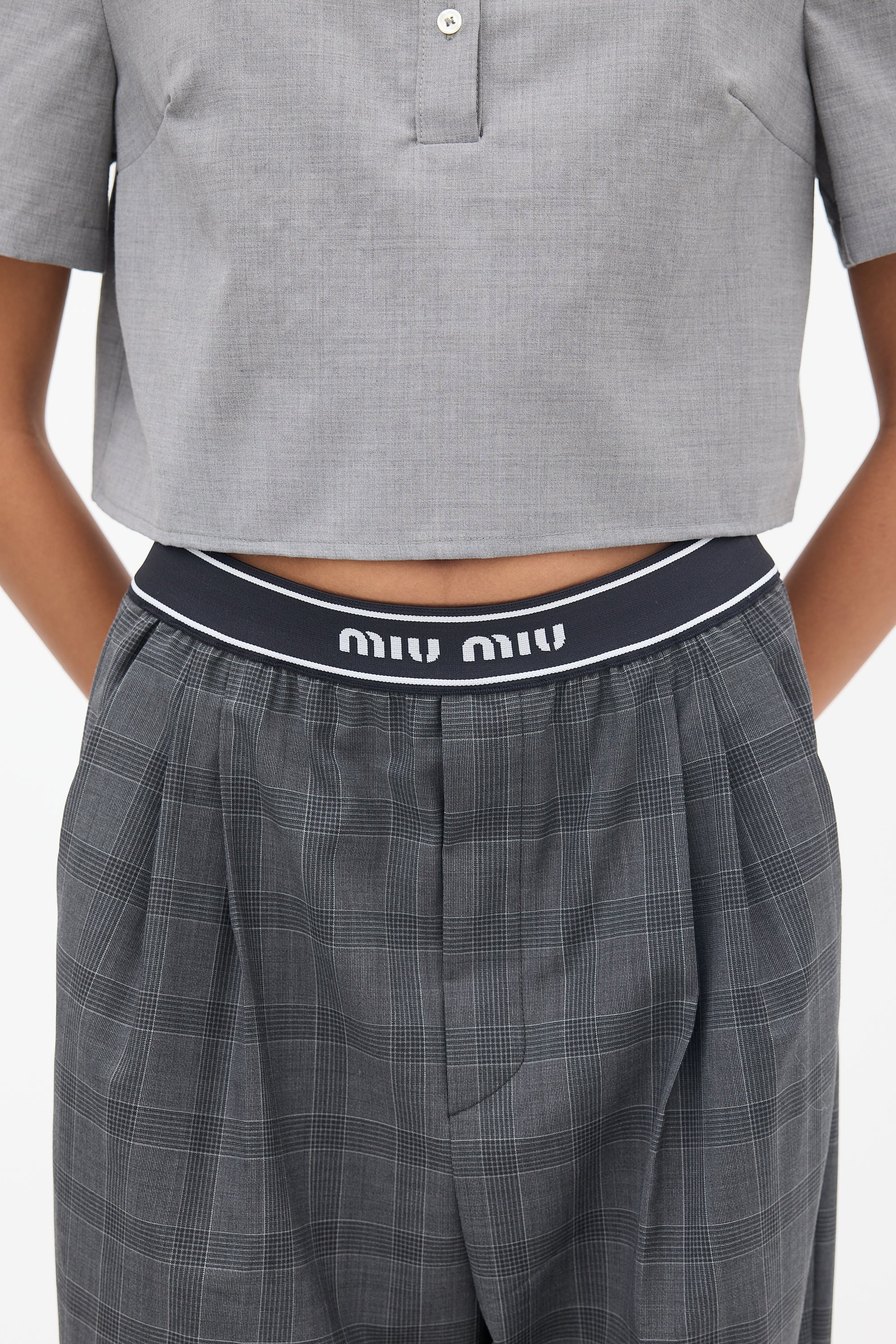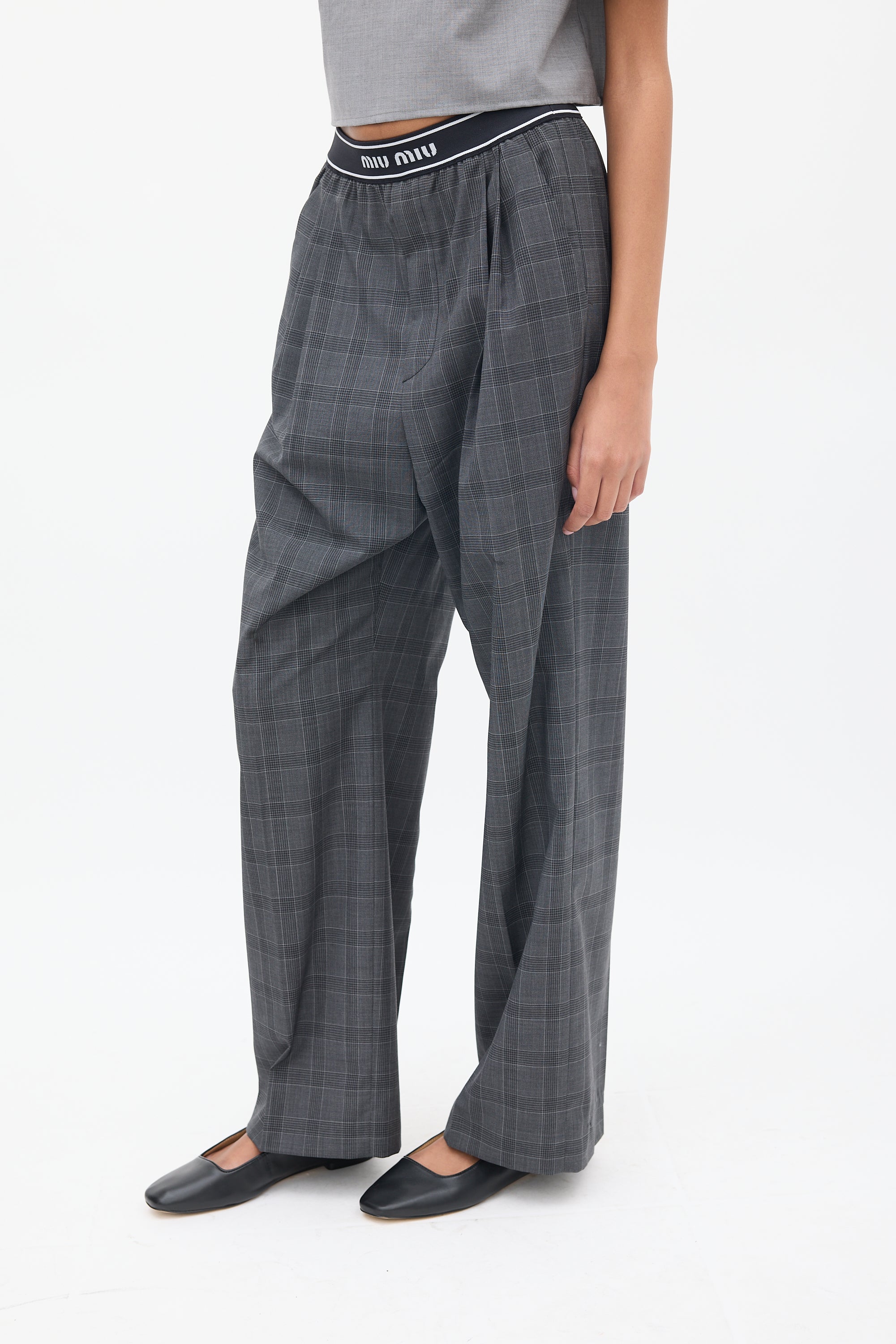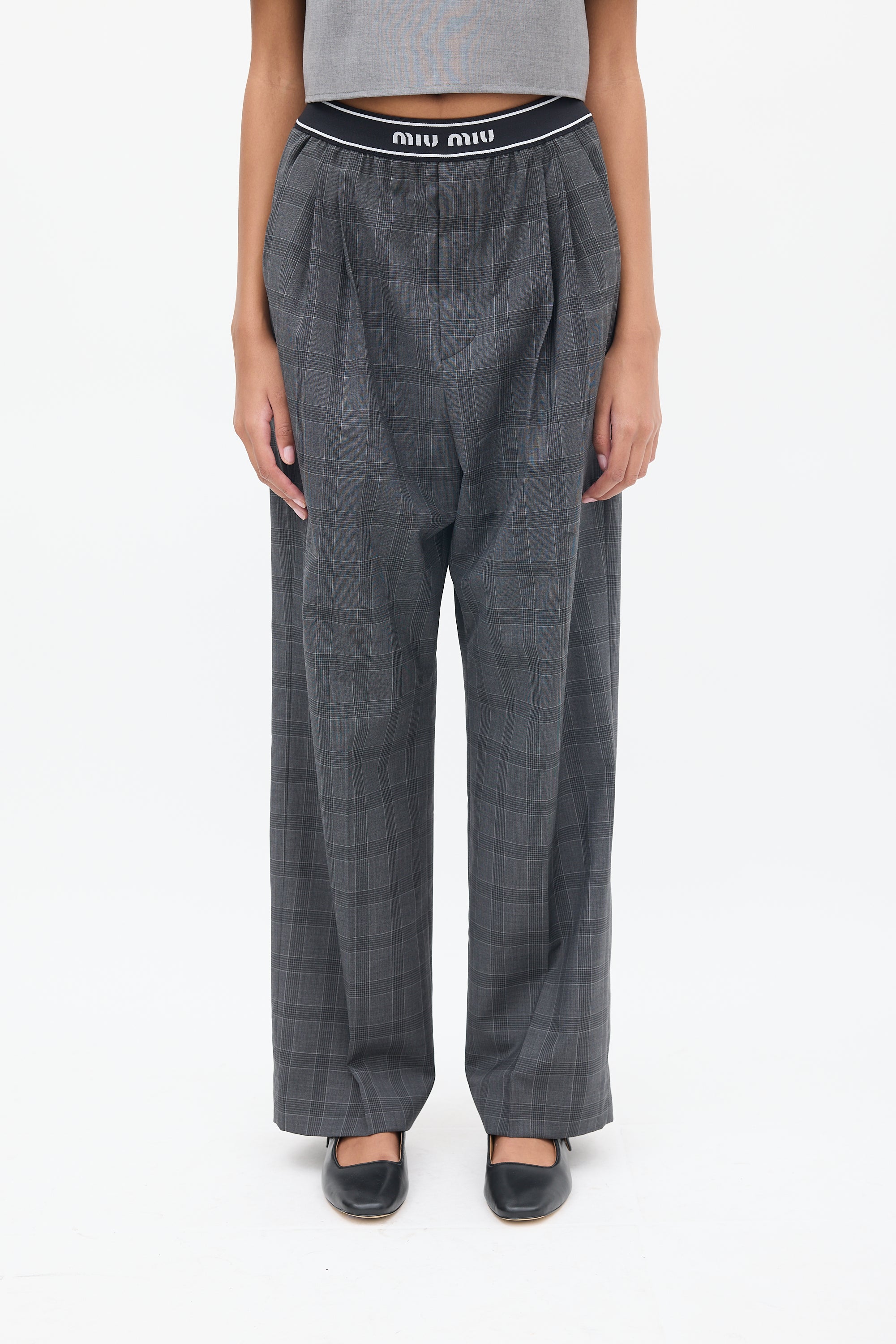 Pre-owned Miu Miu dark grey trousers featuring a high gathered waist, logo elastic waistband, front slash pockets, dropped seat, straight leg with creases, Glen check pattern throughout, and concealed button fly design,