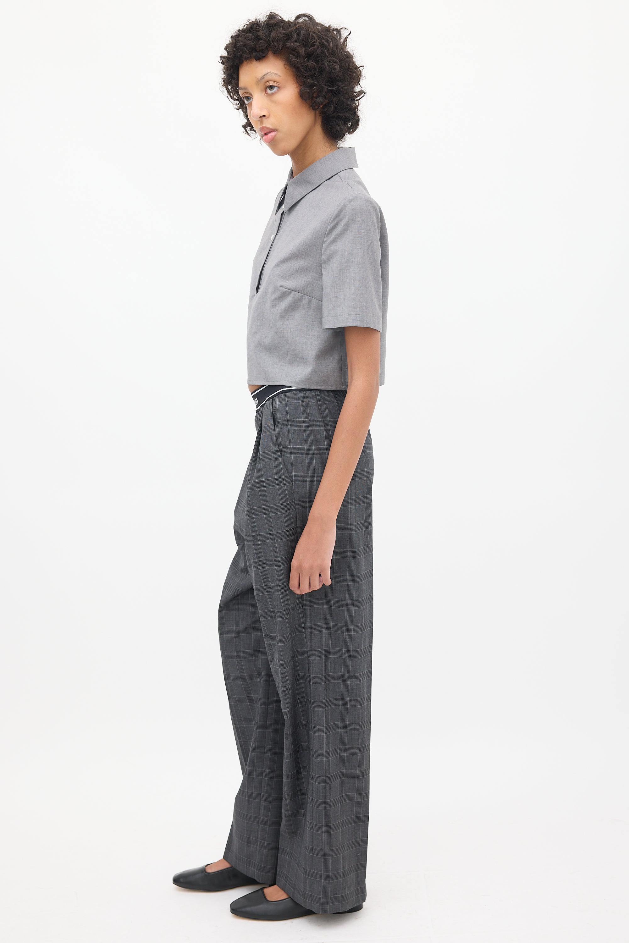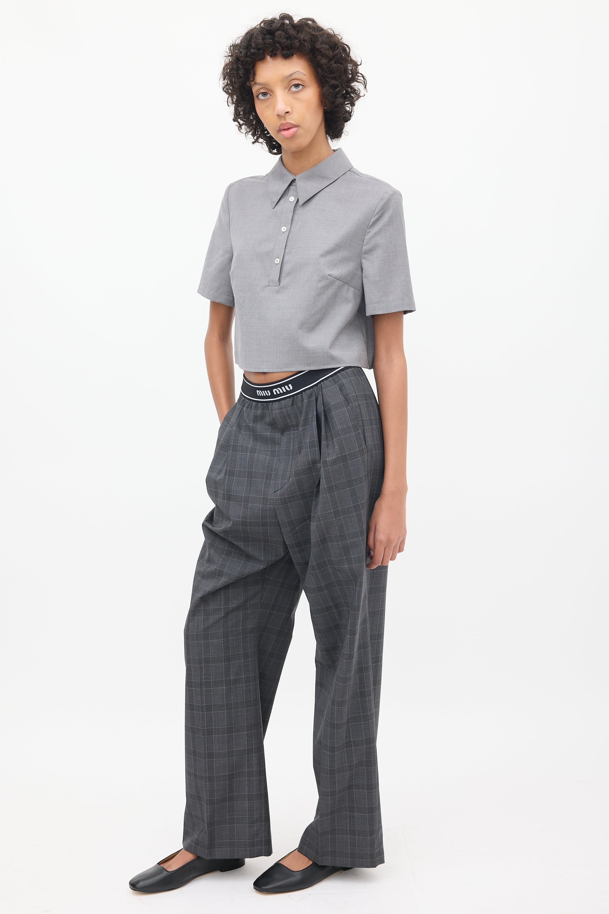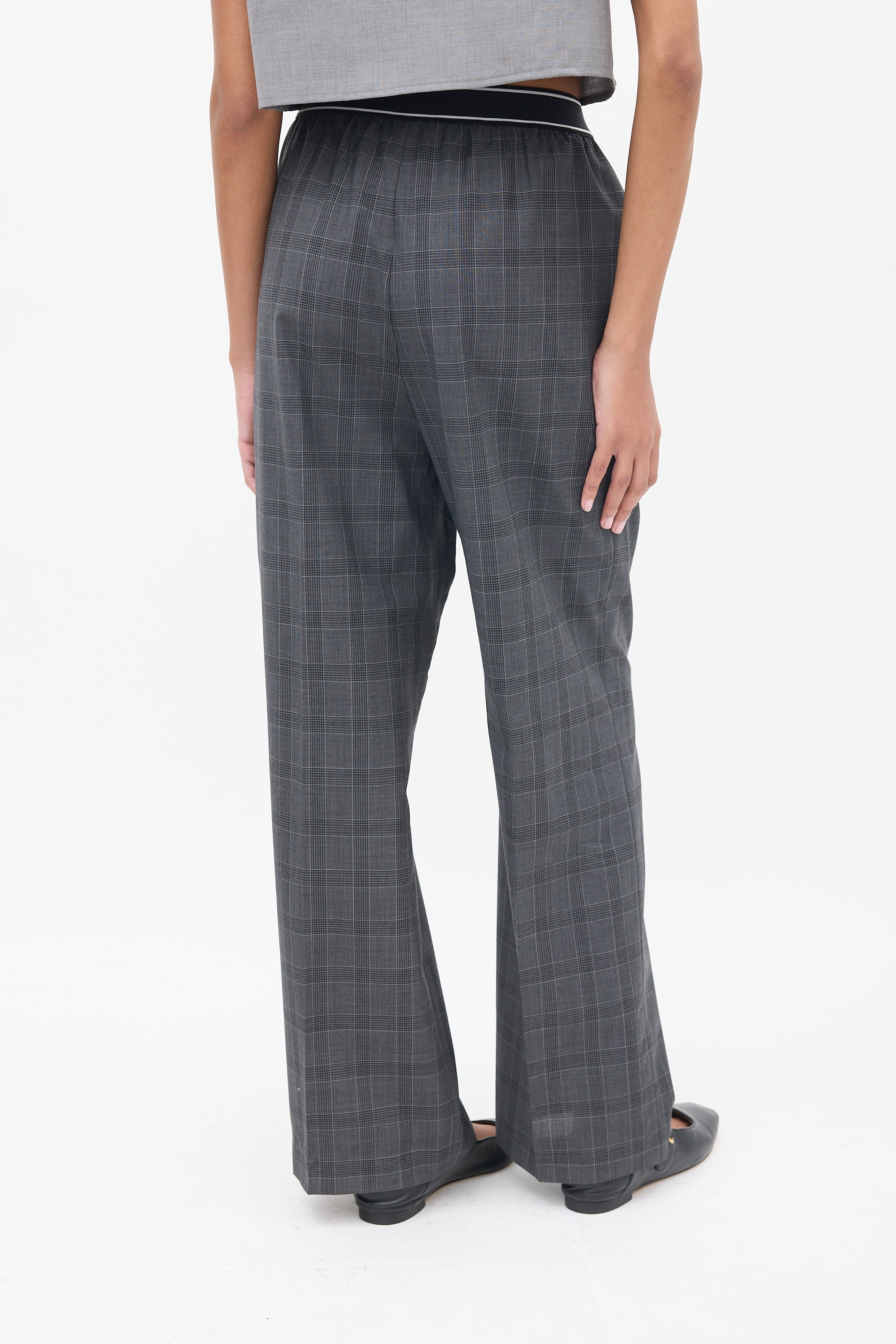 Pre-owned Miu Miu dark grey trousers featuring a high gathered waist, logo elastic waistband, front slash pockets, dropped seat, straight leg with creases, Glen check pattern throughout, and concealed button fly design,