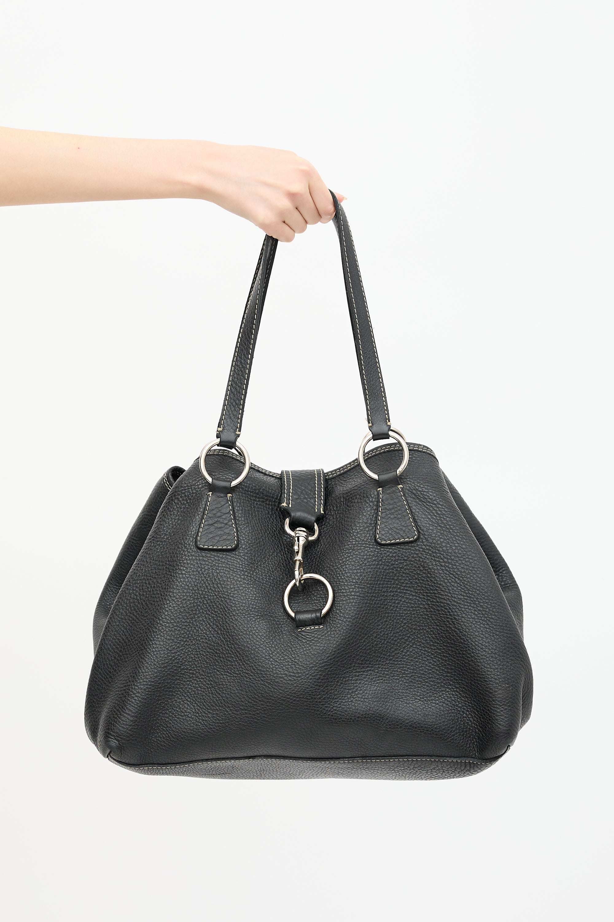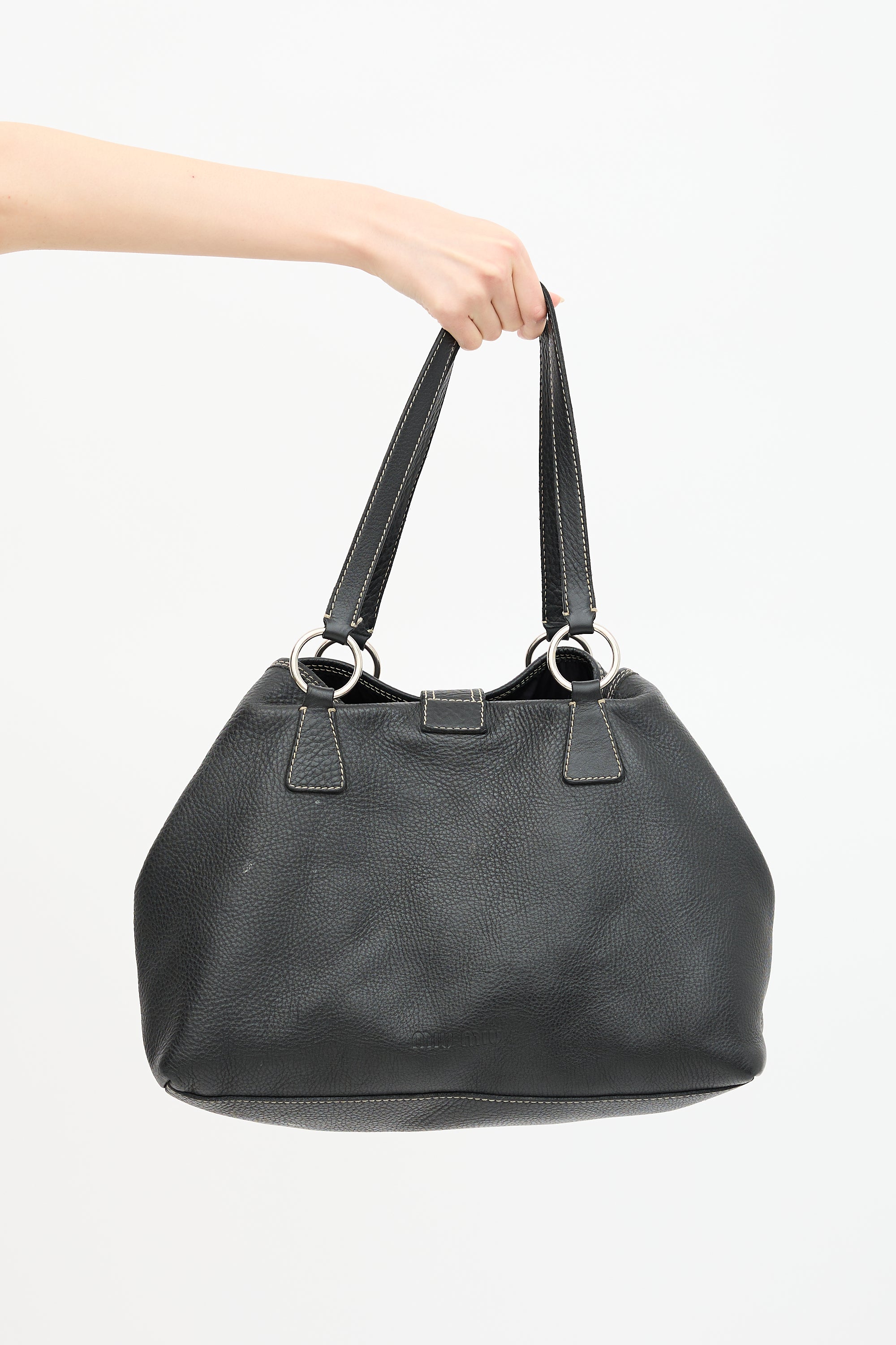 Pre-owned Miu Miu black pebbled leather tote bag featuring beige contrast stitching, silver tone hardware, dual flat top handles, lobster clasp closure, top tie at sides, and one lined main compartment with one zip closure.