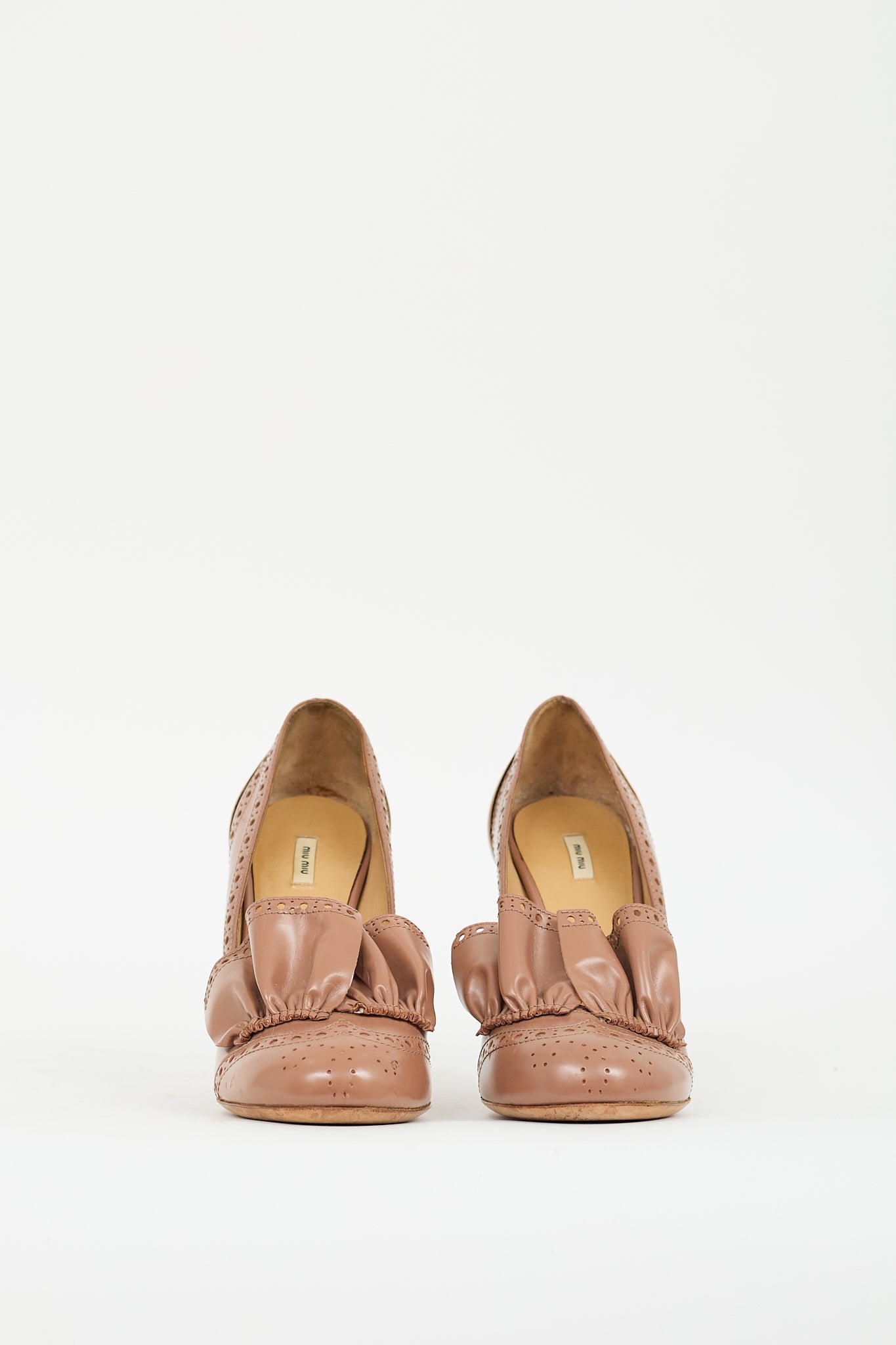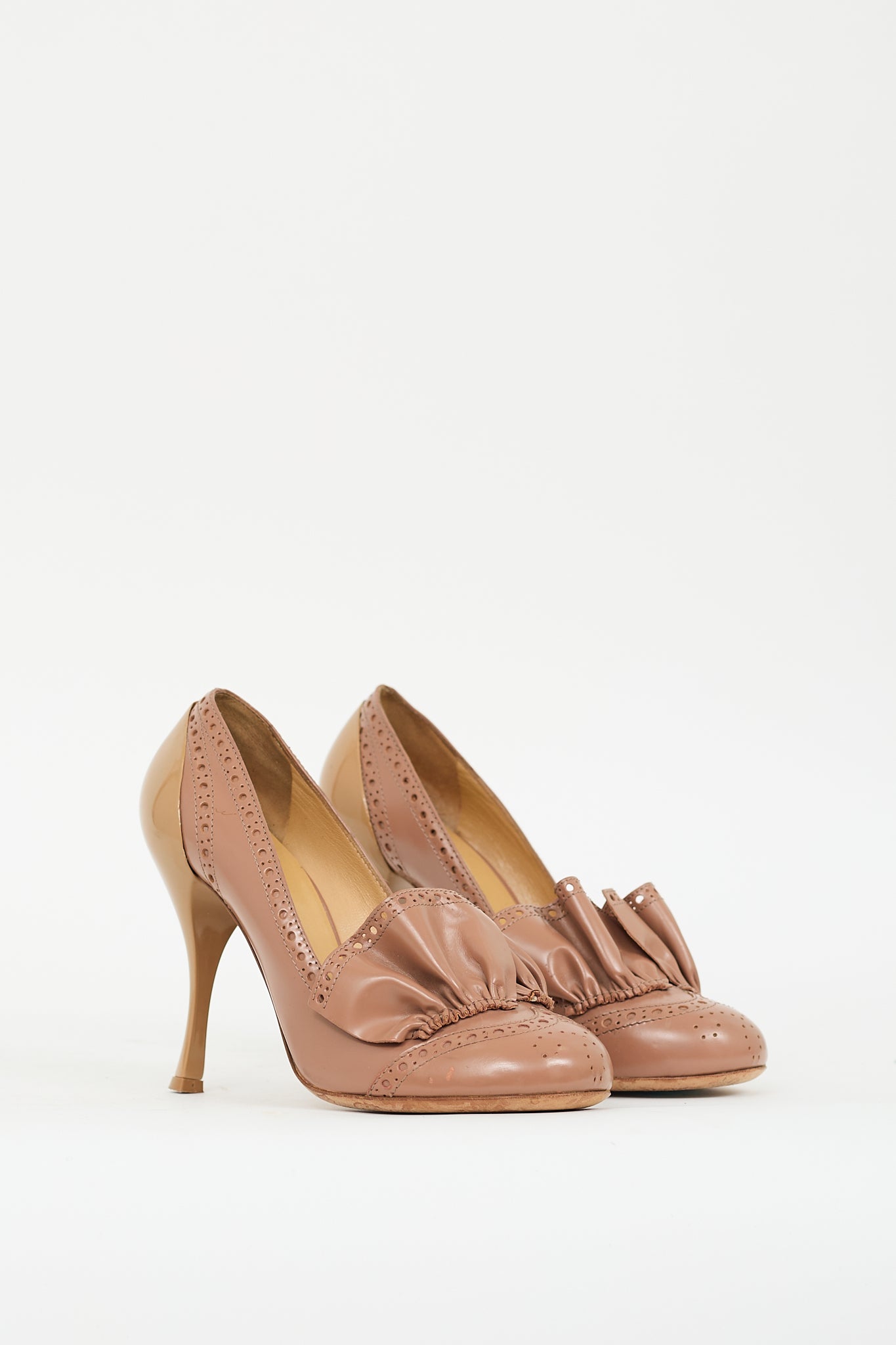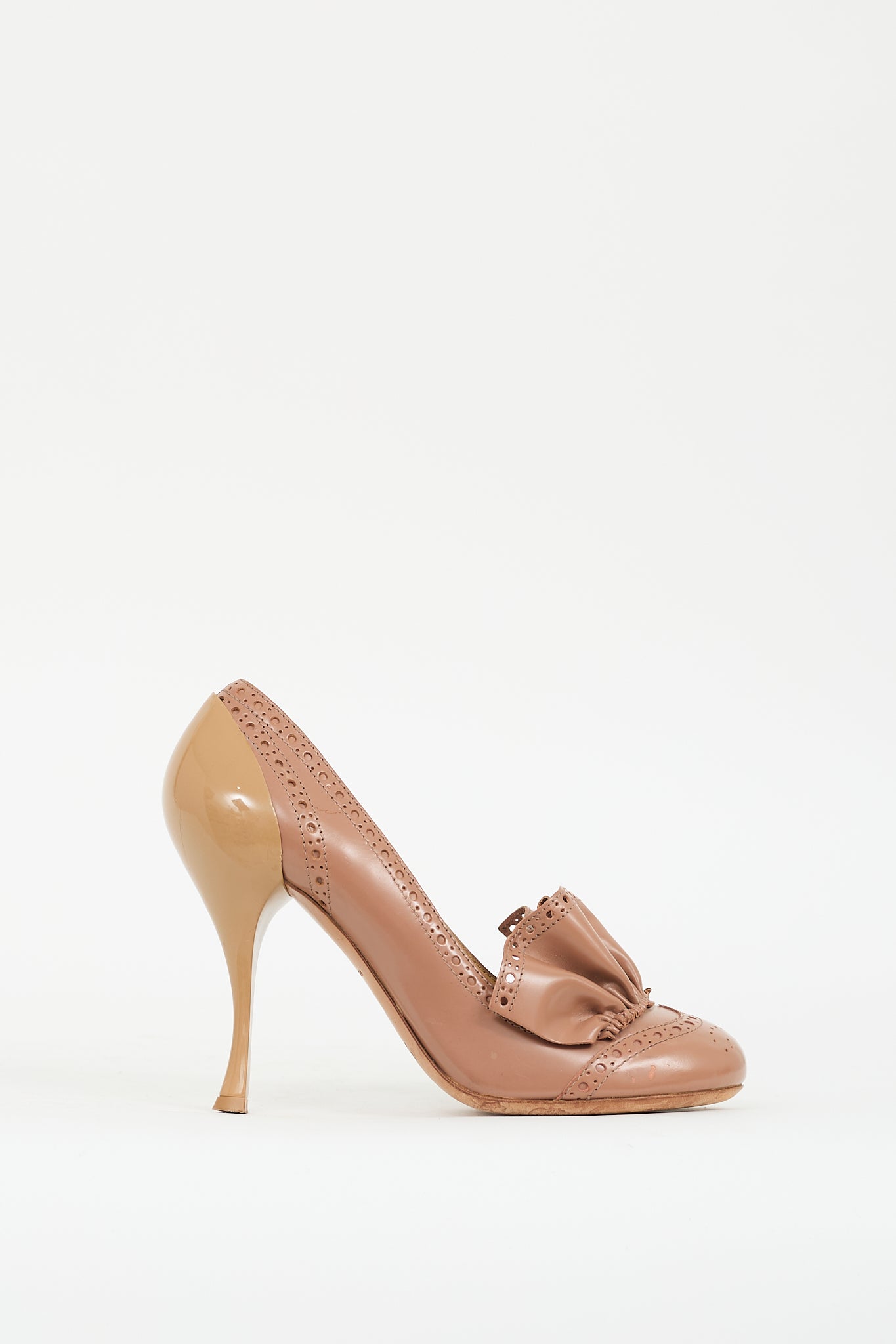 Pre-owned Miu Miu pink patent leather heels featuring rounded toe, attached ruffle at vamp, brogue detailing throughout, and beige patent heel.