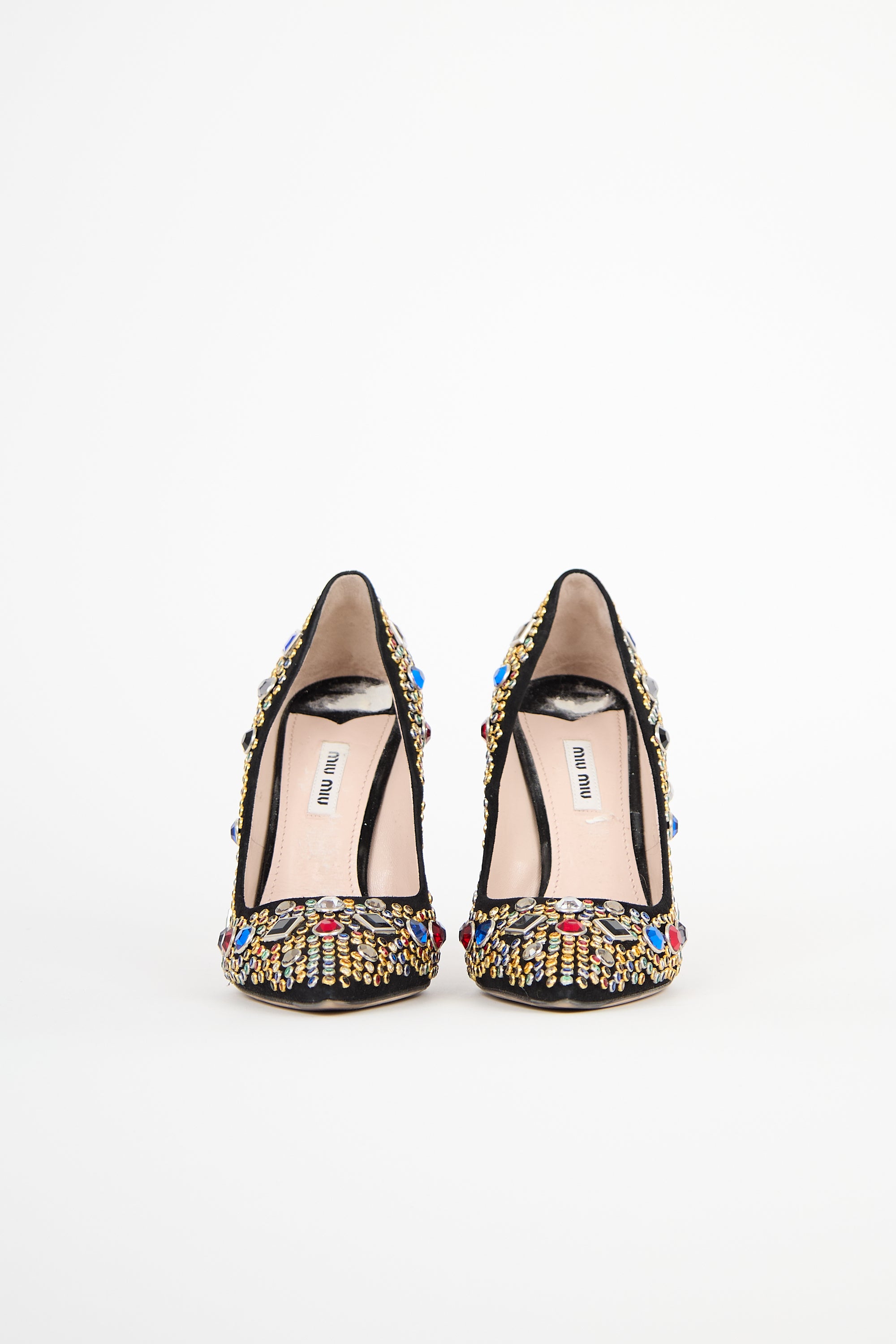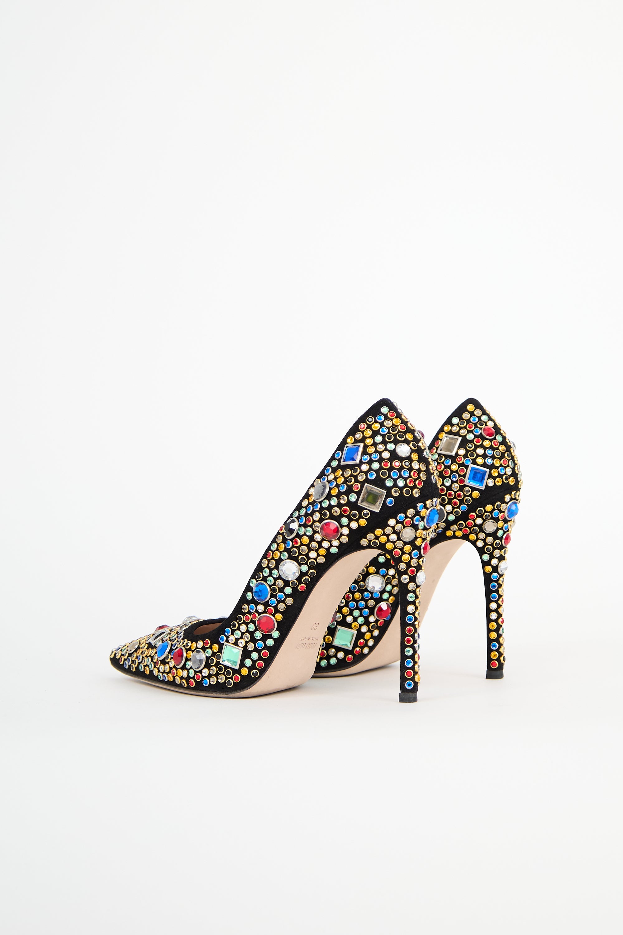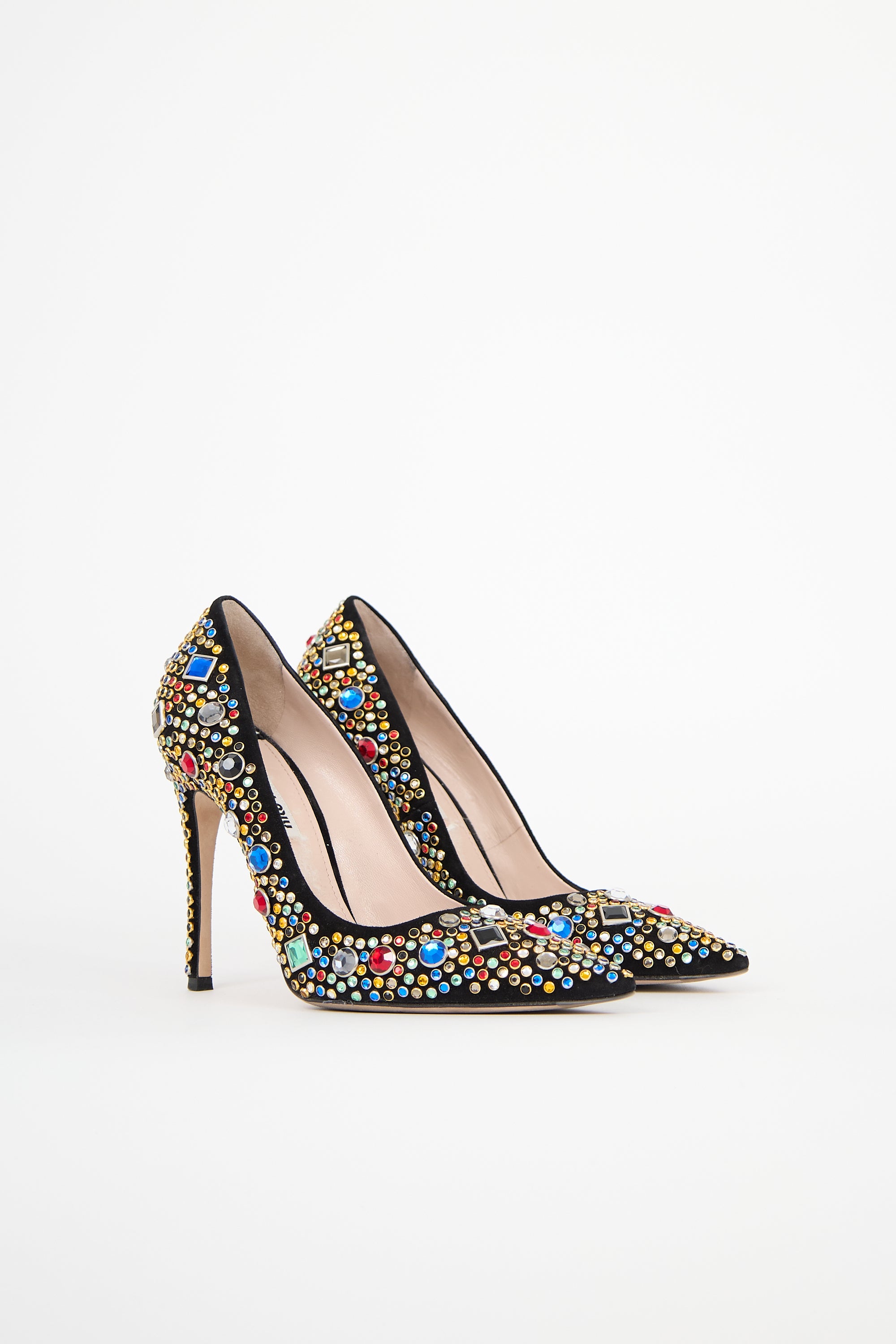 Pre-owned Miu Miu black suede pumps featuring a pointed toe, multicolour crystal embellishment throughout, slip on entry, and stiletto heel. Comes with original dust bag.