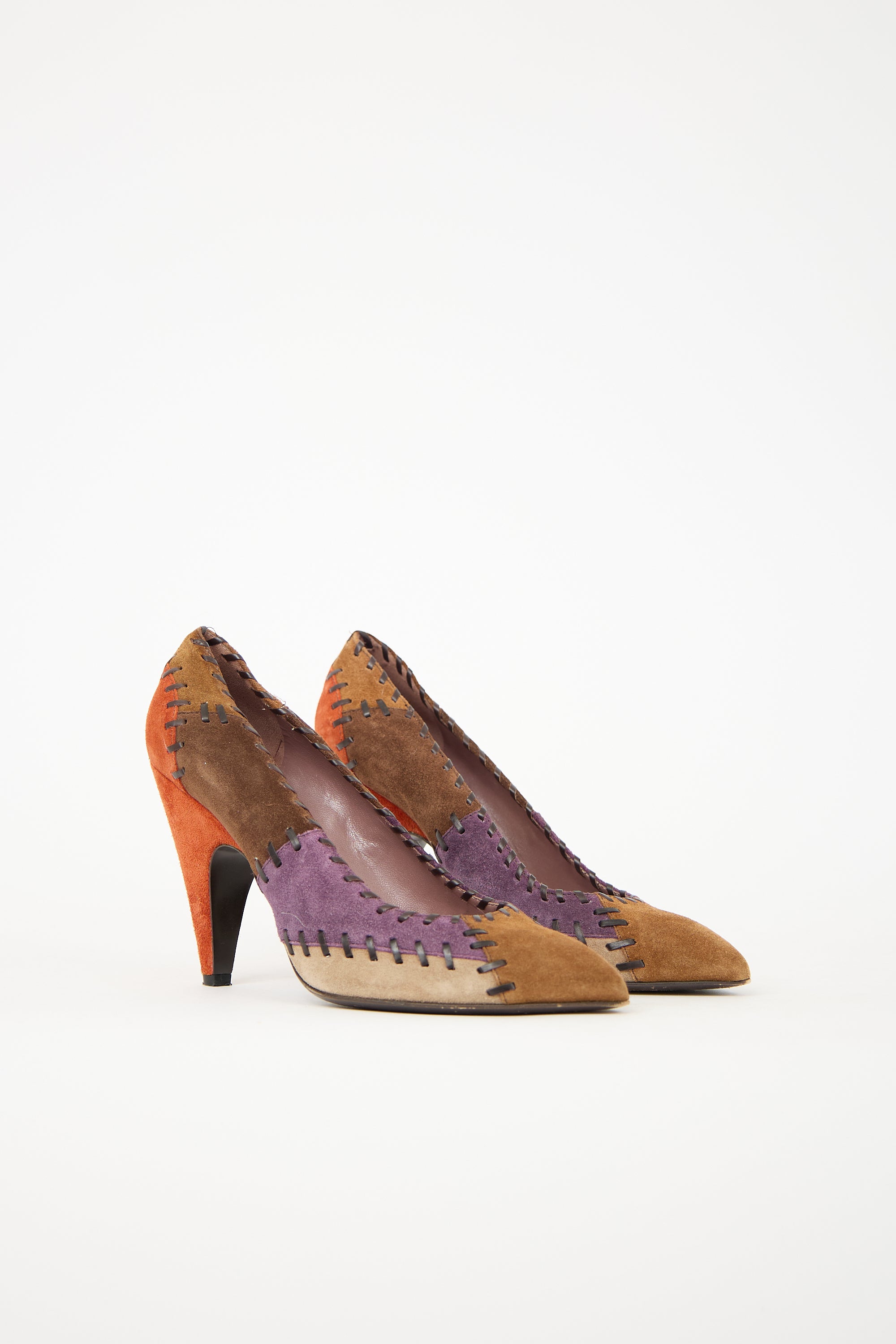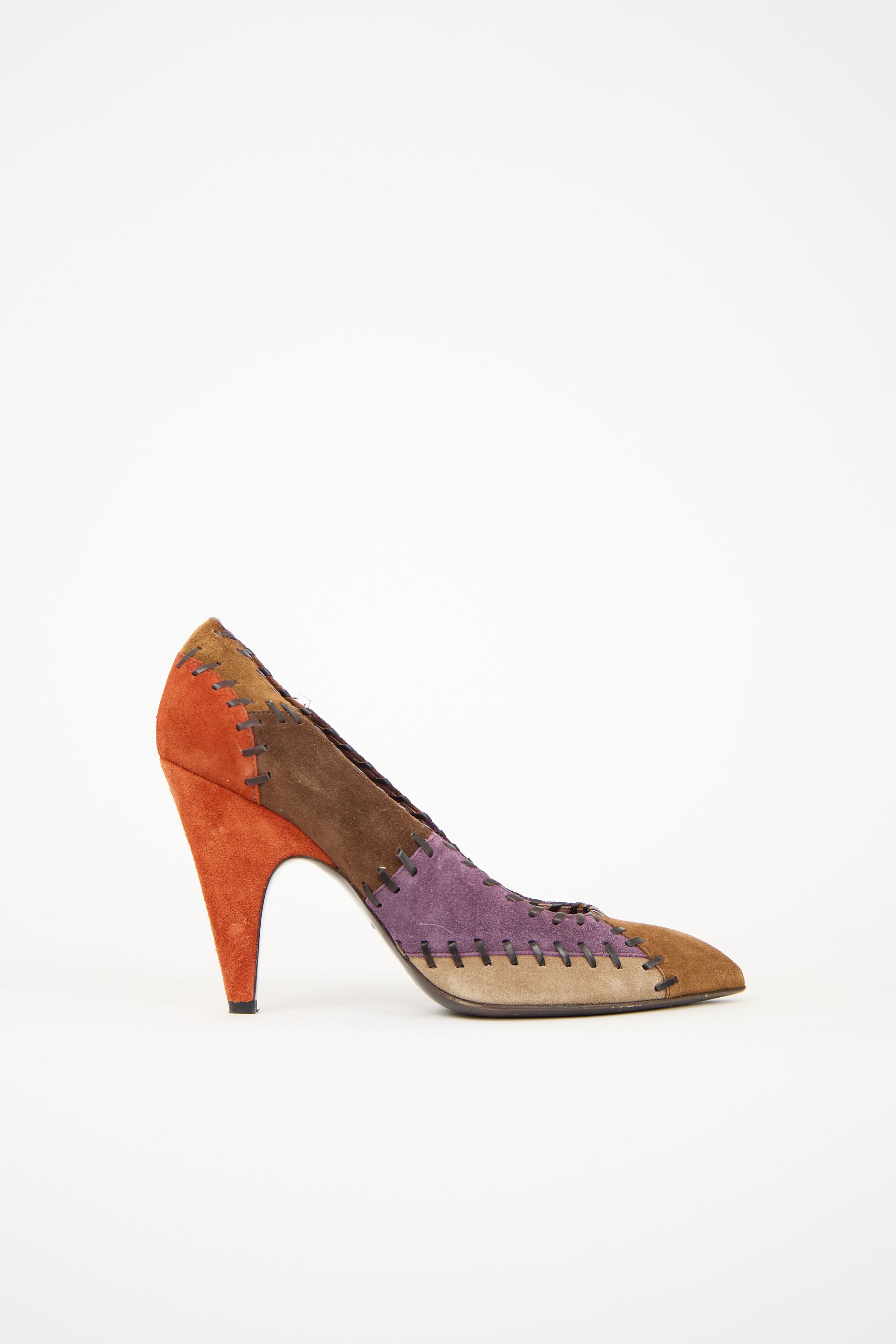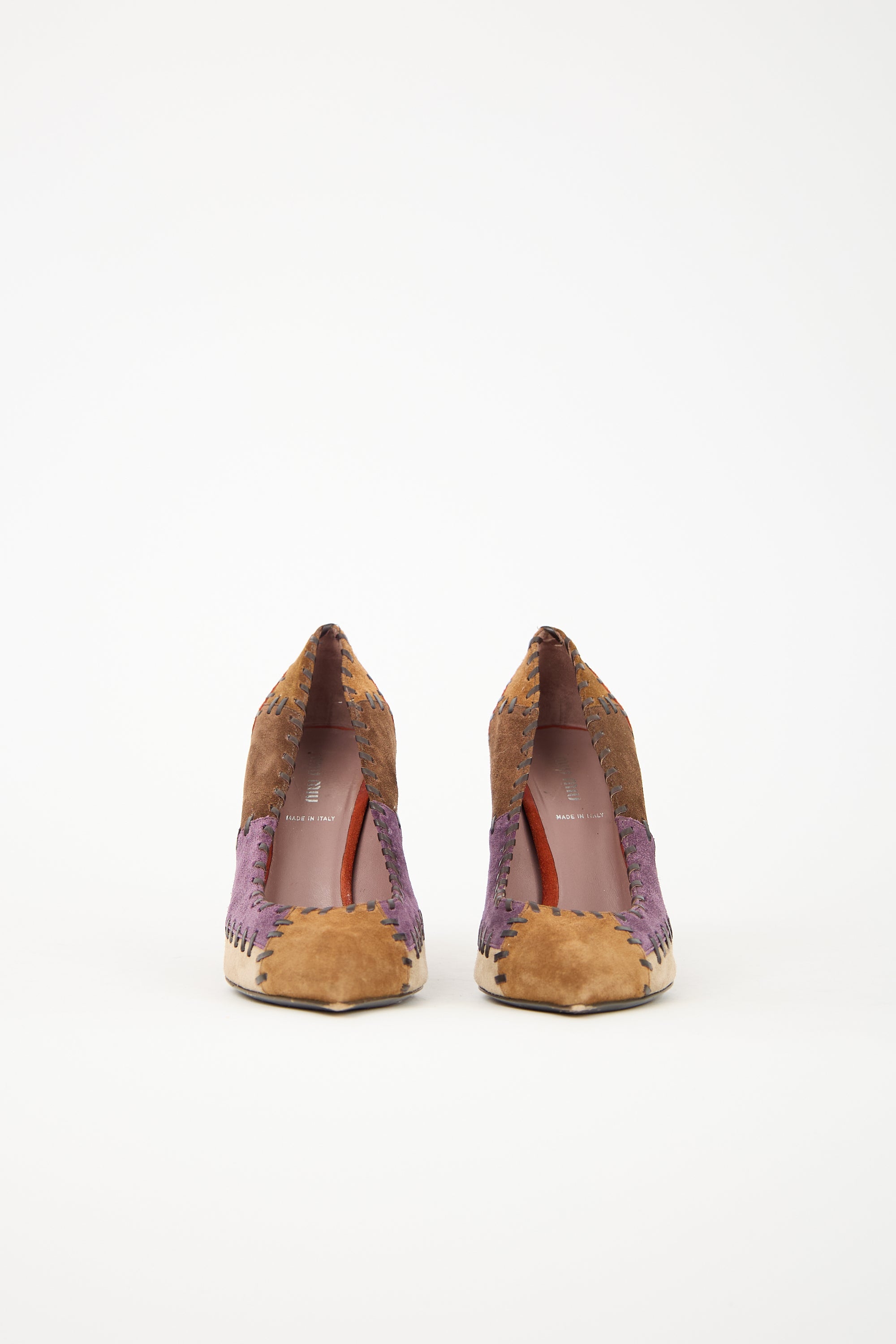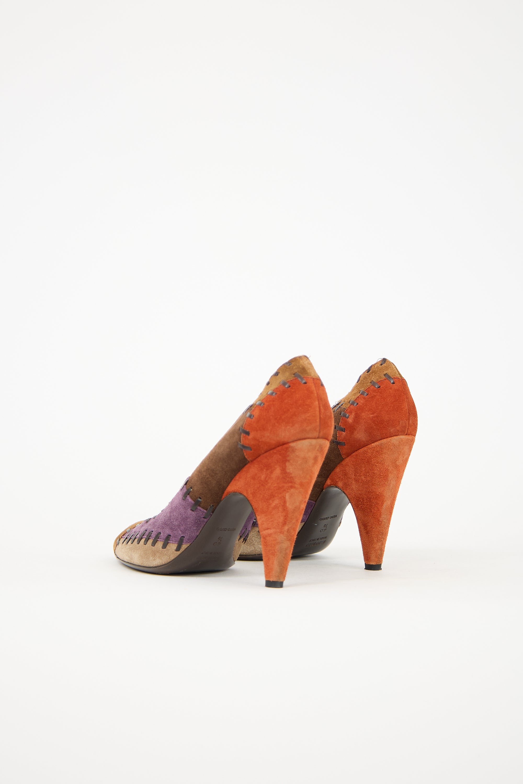 Pre-owned Miu Miu suede pump featuring pointed toe, multicolour patchwork upper with brown stitch, and orange slim heel.