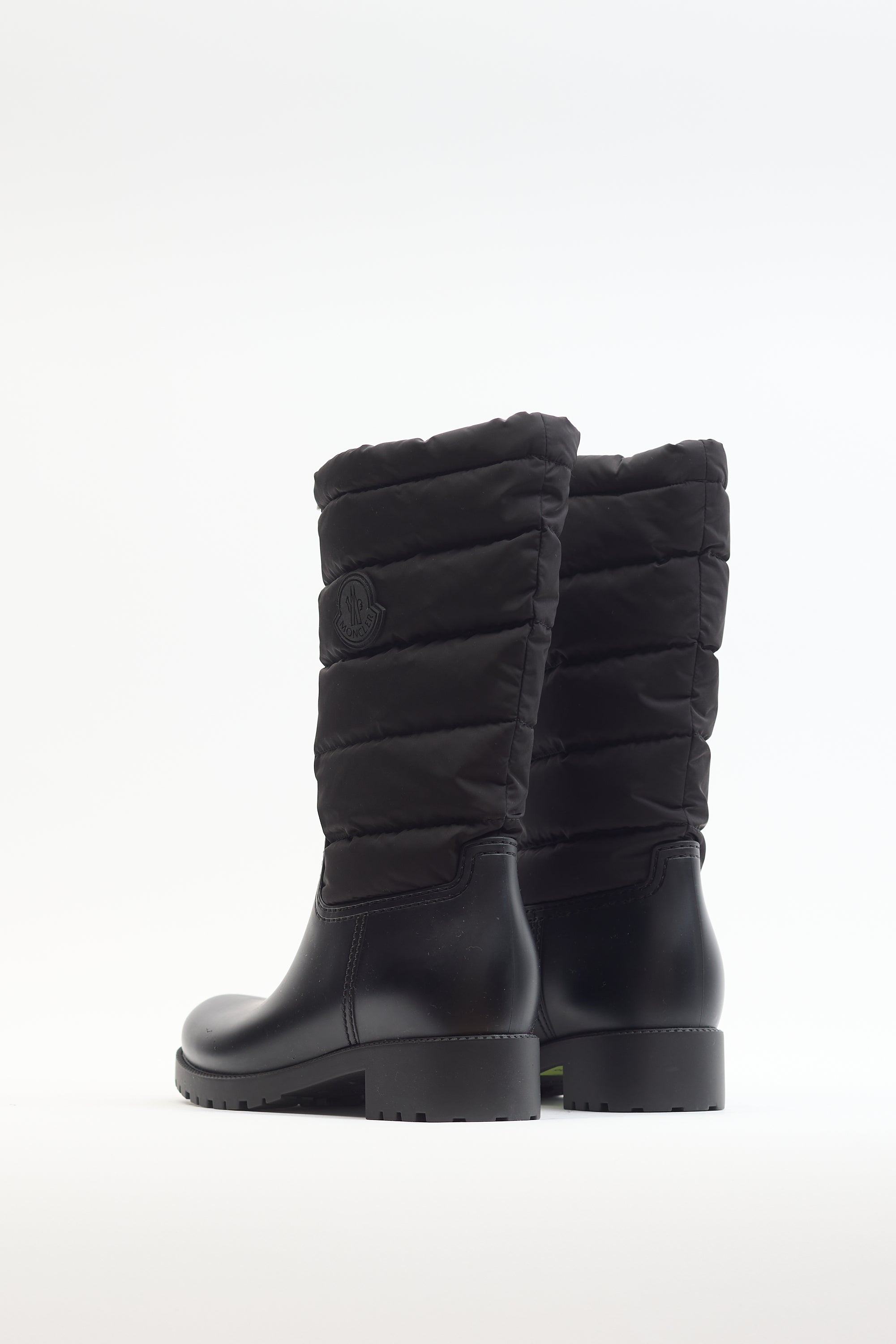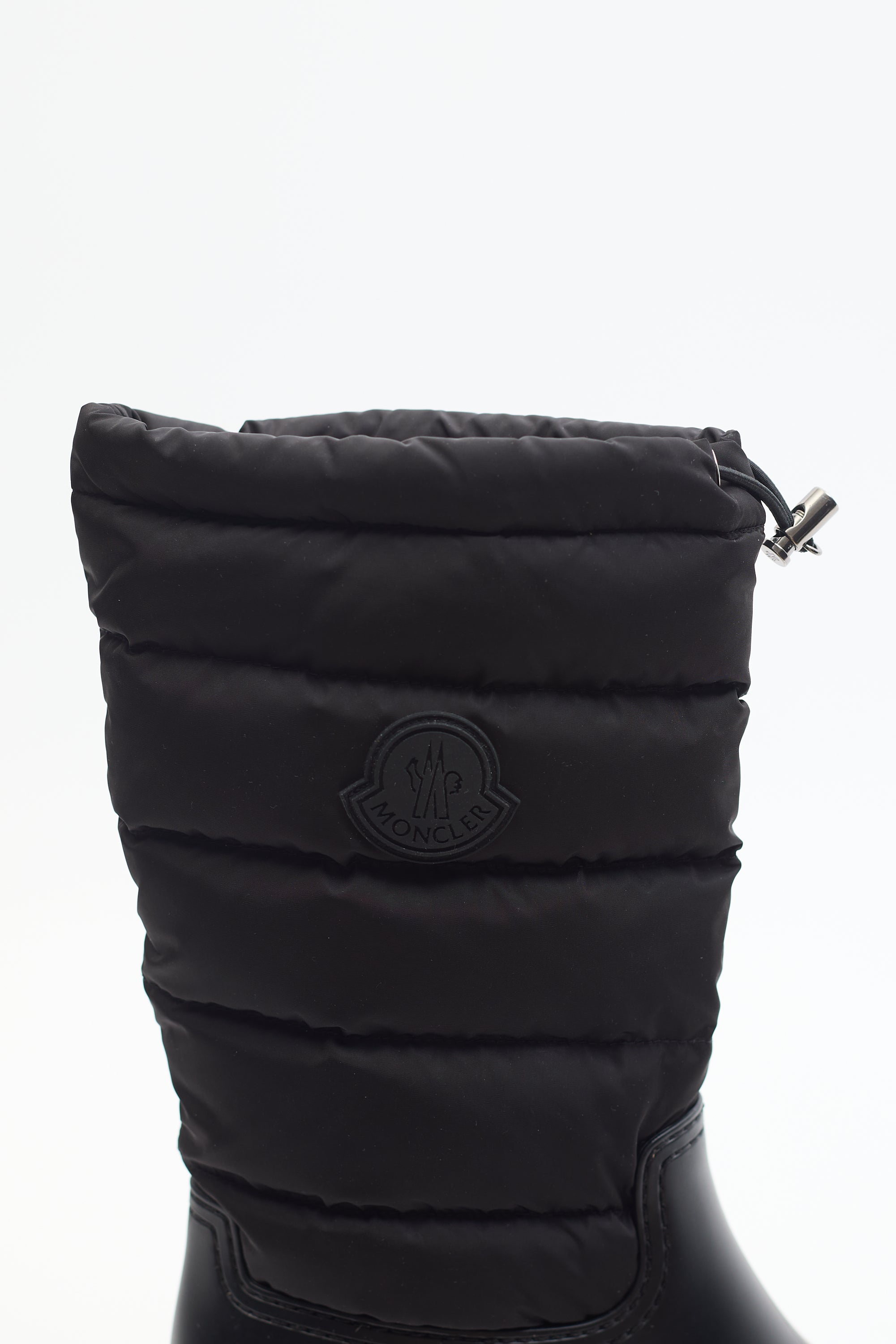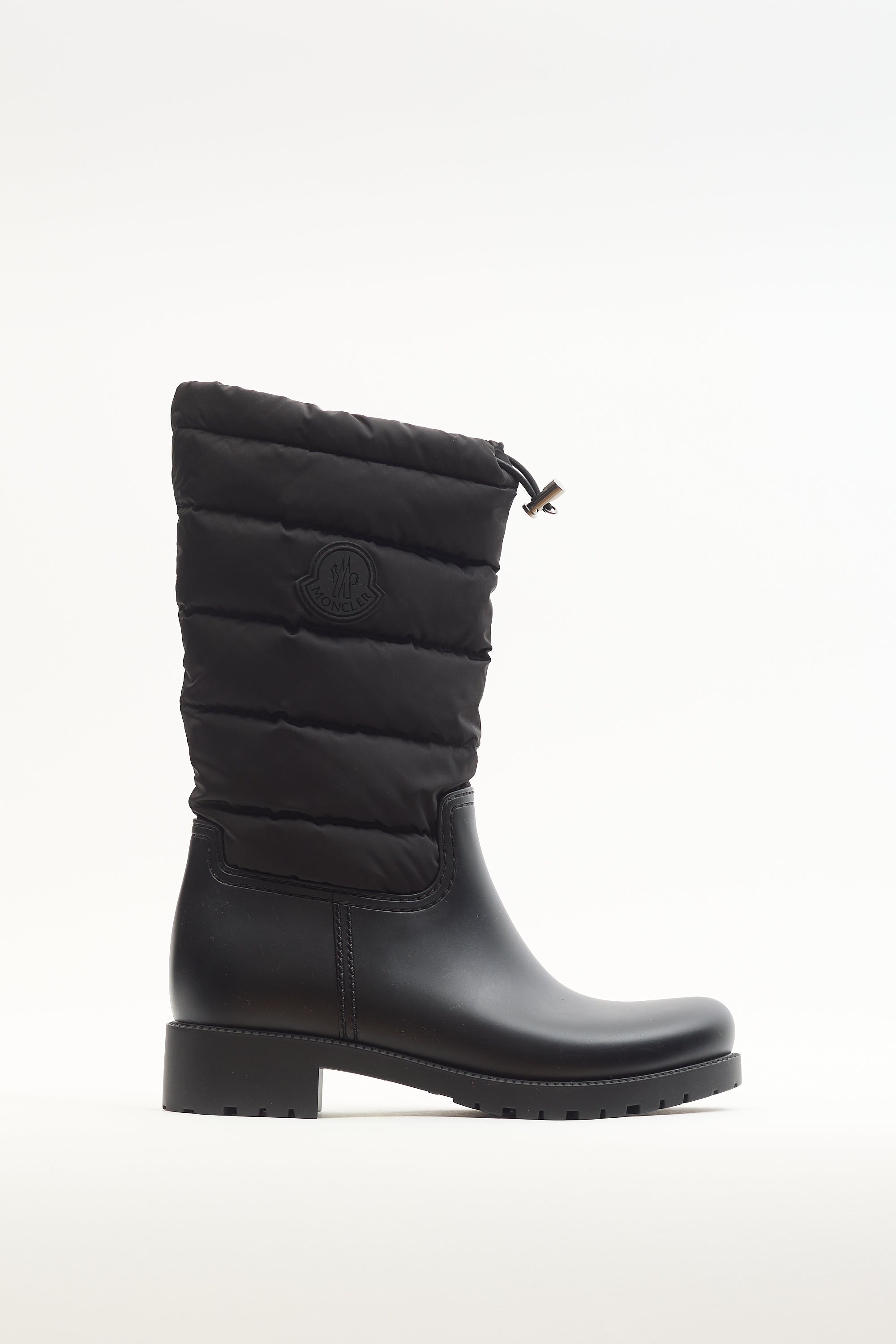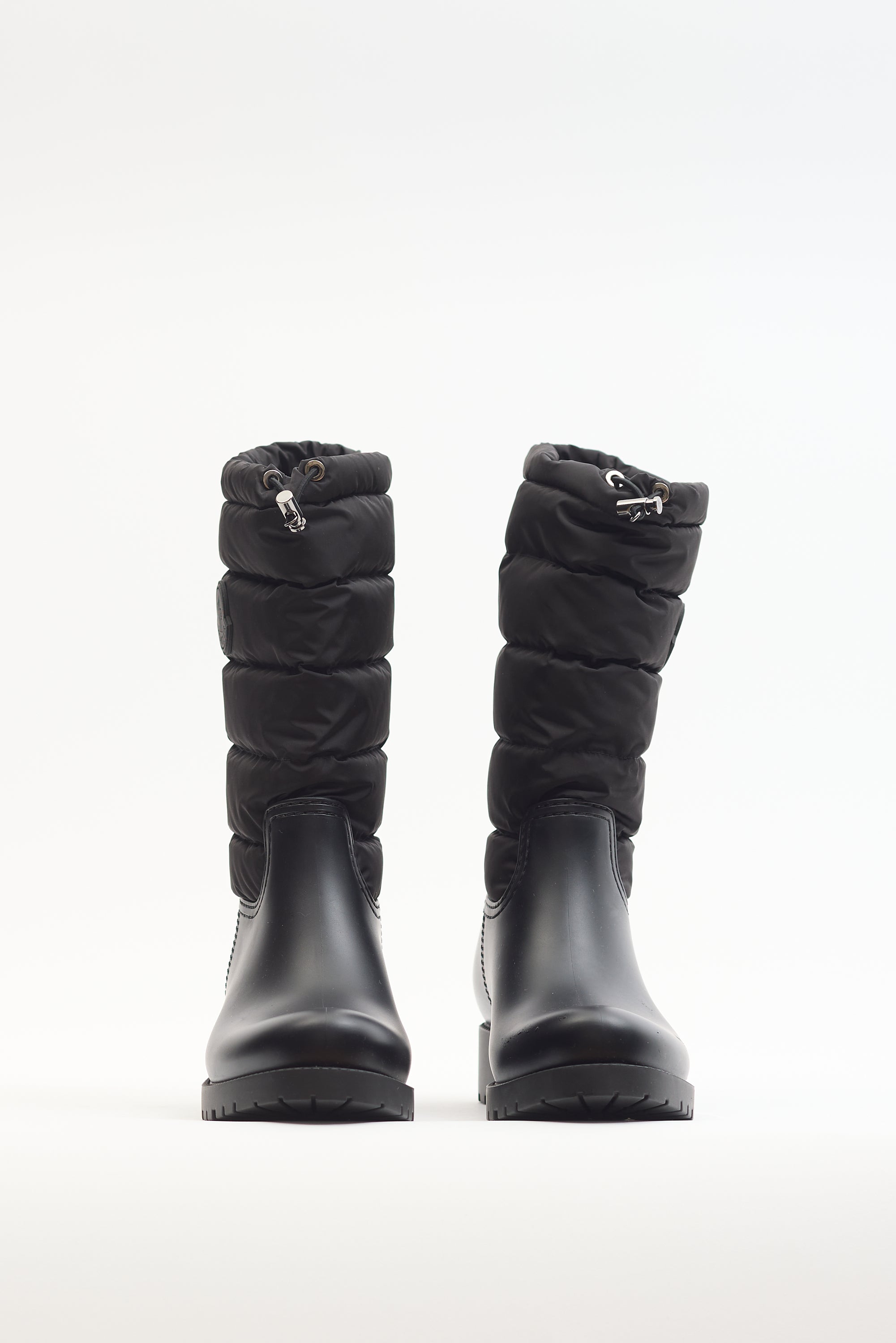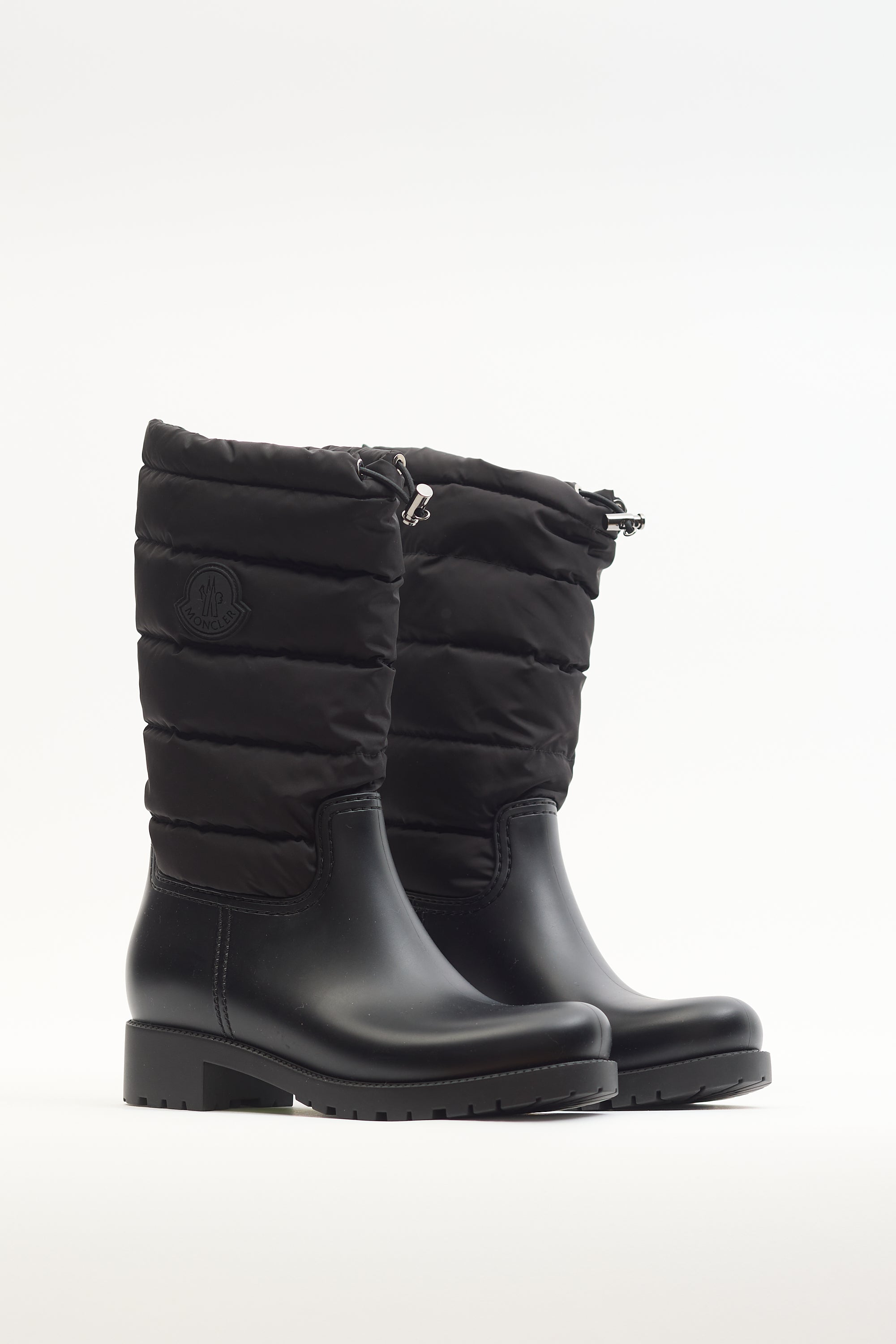 Pre-owned Moncler black nylon Ginette puffer boots featuring rubberized rounded toe, outer side logo, quilted padded shaft, drawstring pull at collar, and chunky rubber outsole. Come with original box and dust bag.