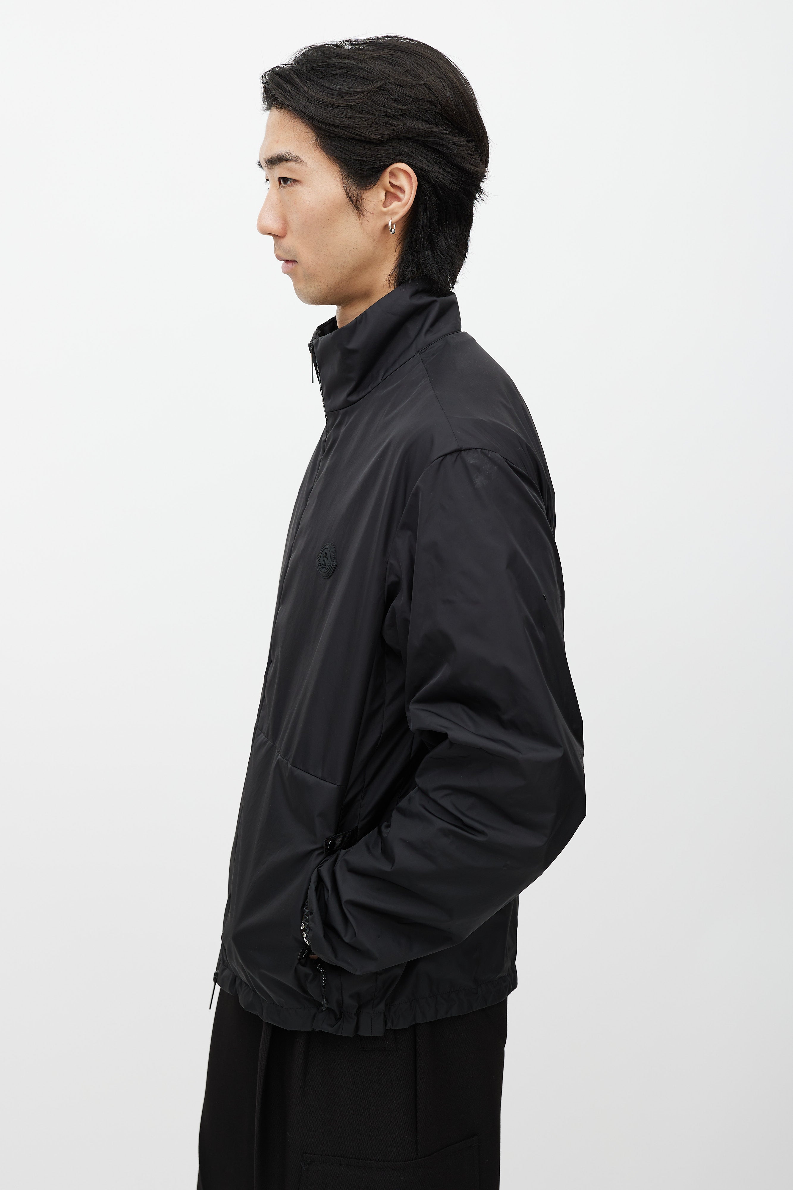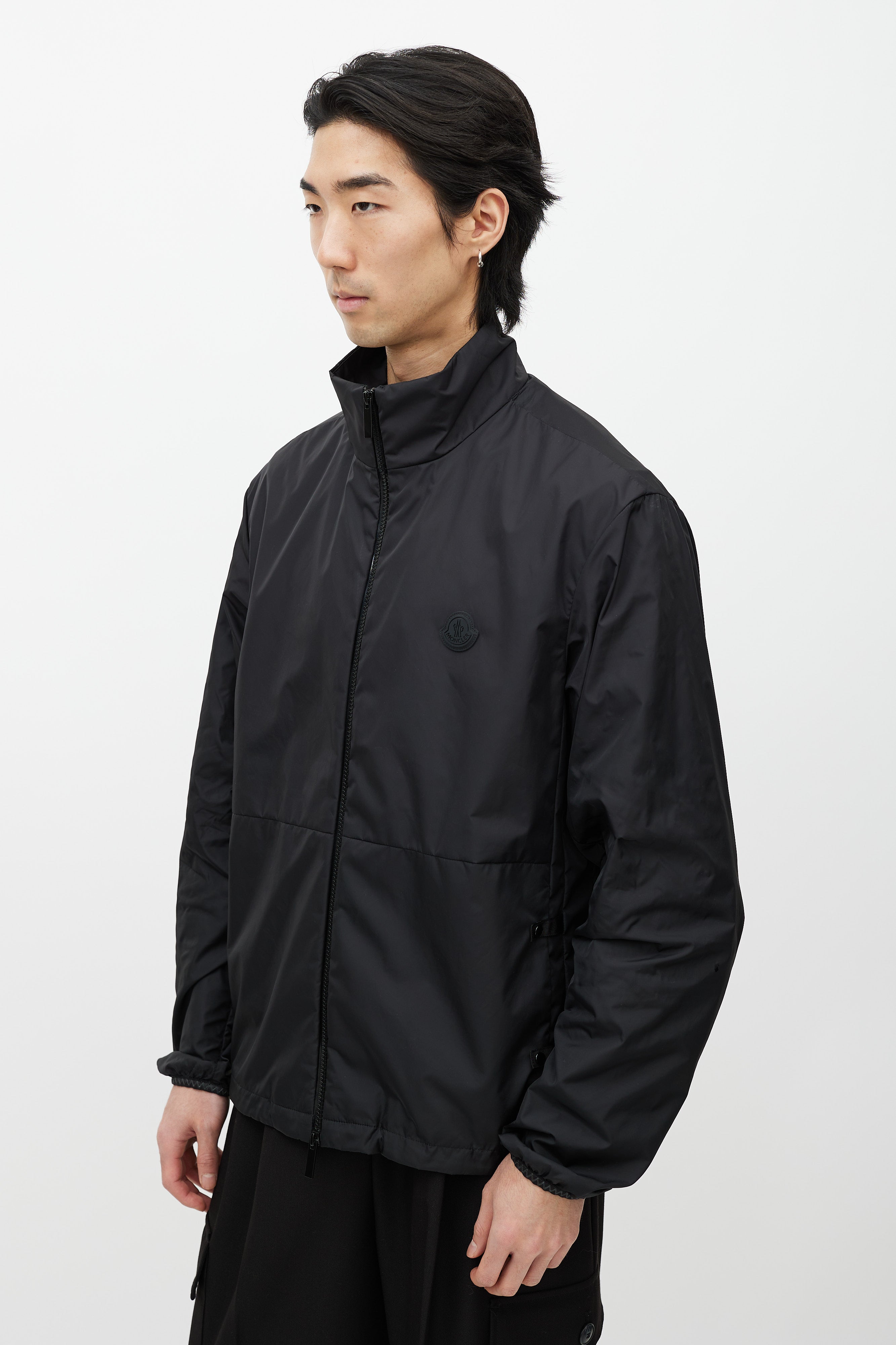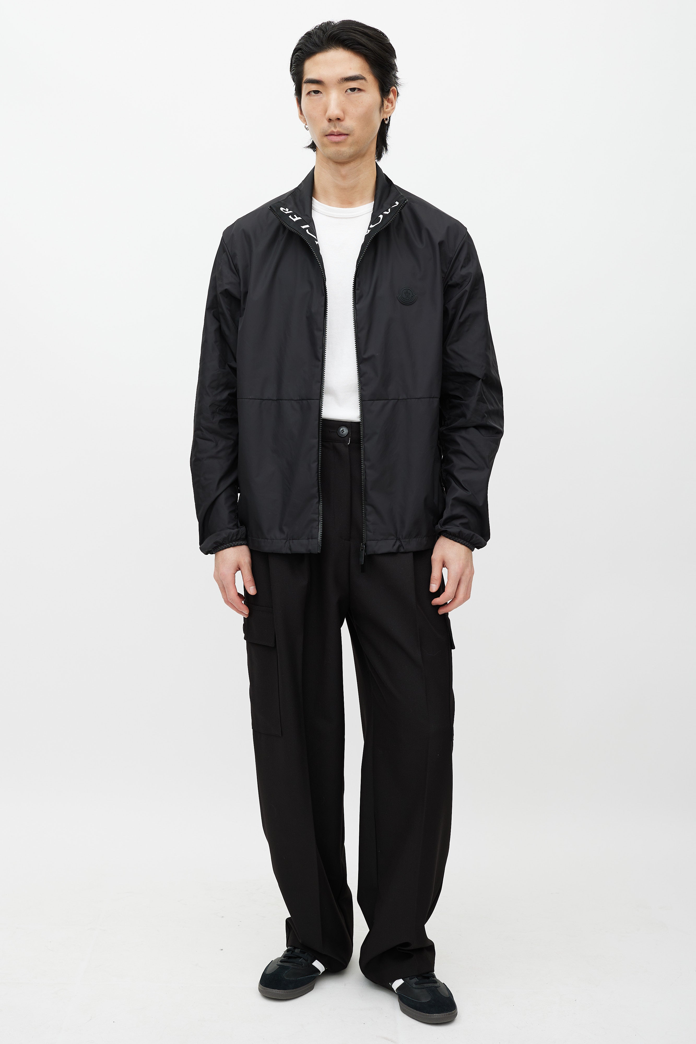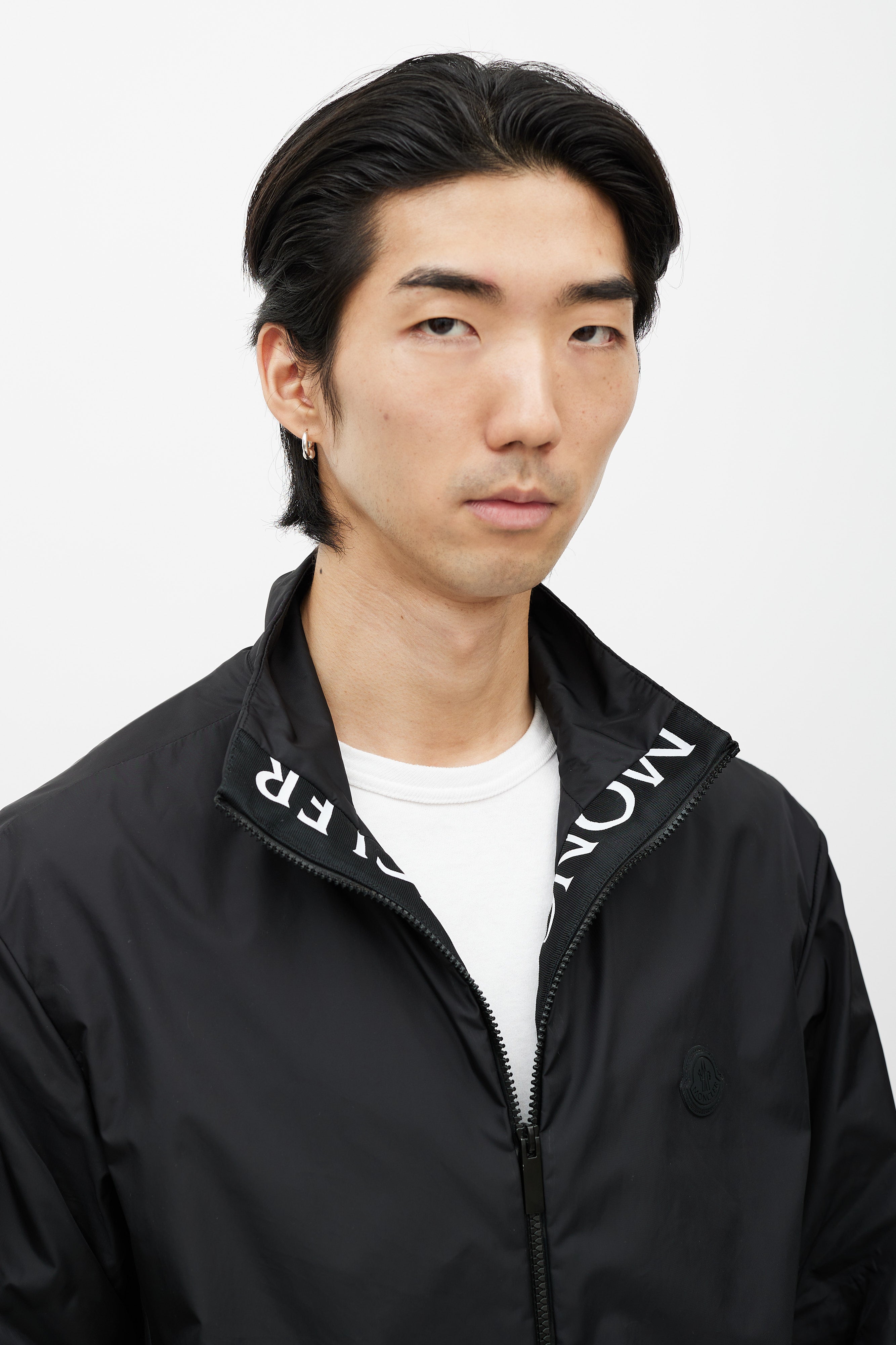 Pre-owned Moncler black nylon zip up jacket featuring tonal rubber logo patch at chest, zip up front closure, two zip pockets at hip, elasticated cuffs and hem, and white printed logo at inner collar.