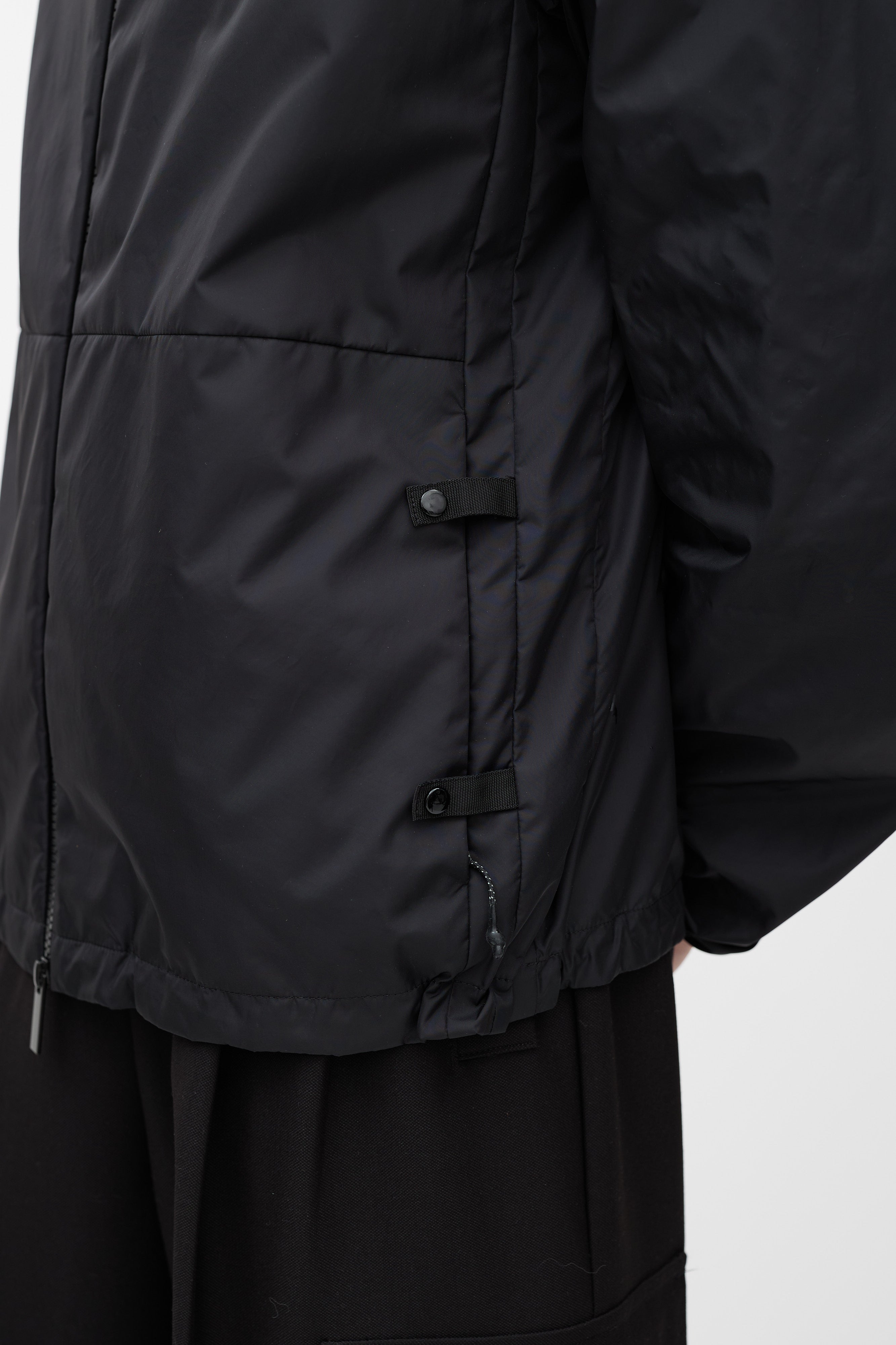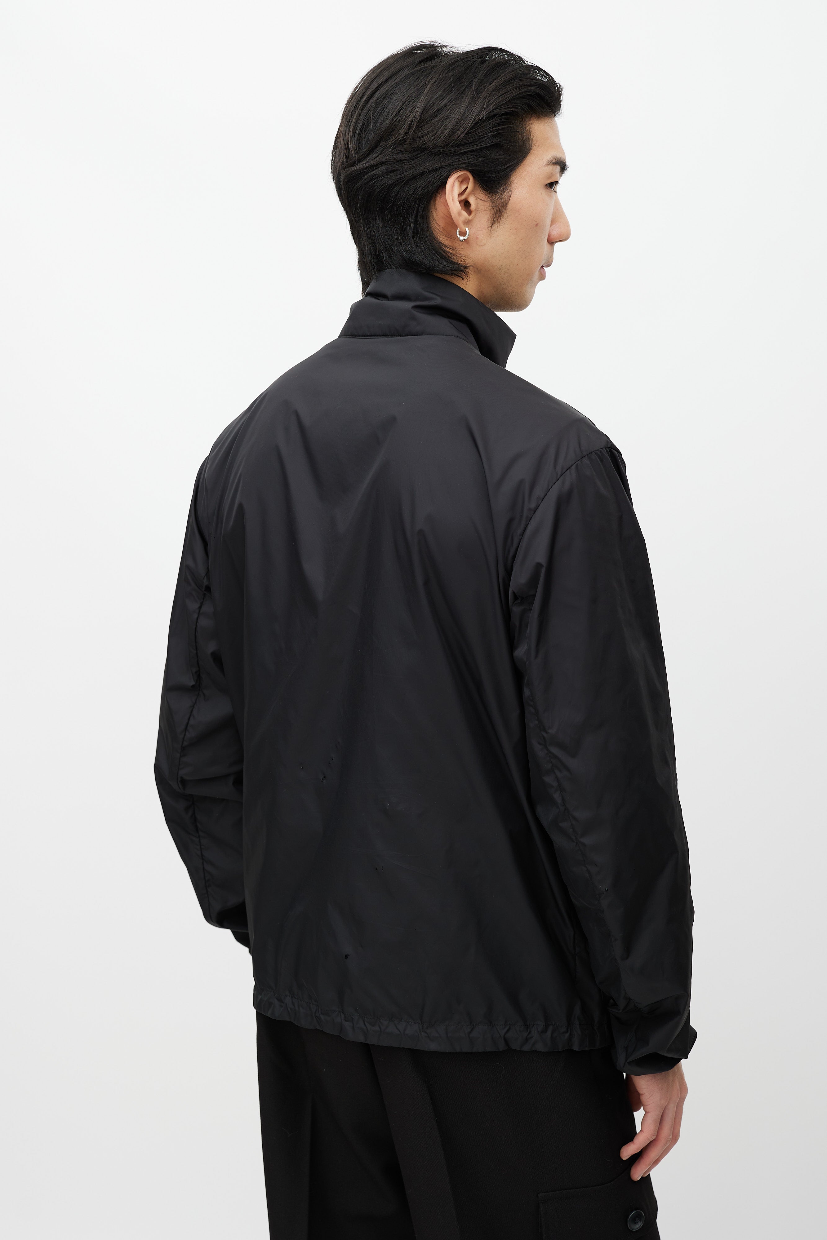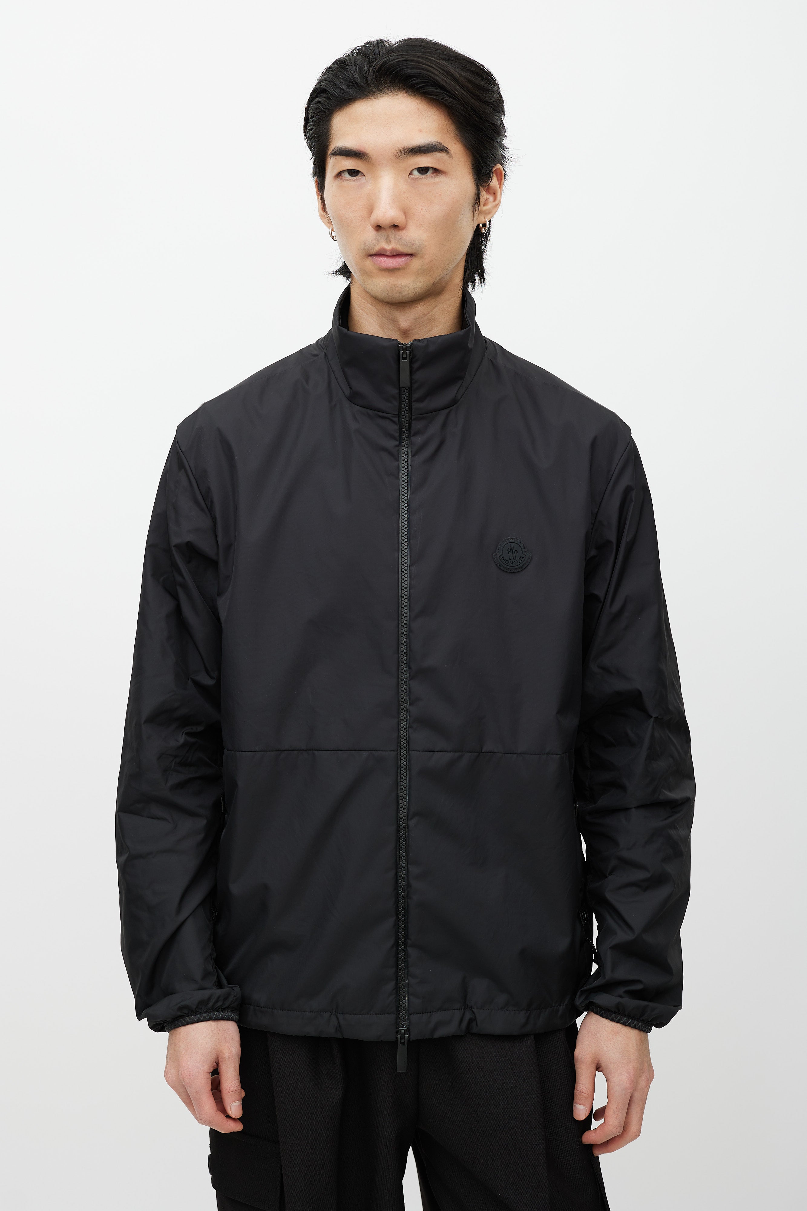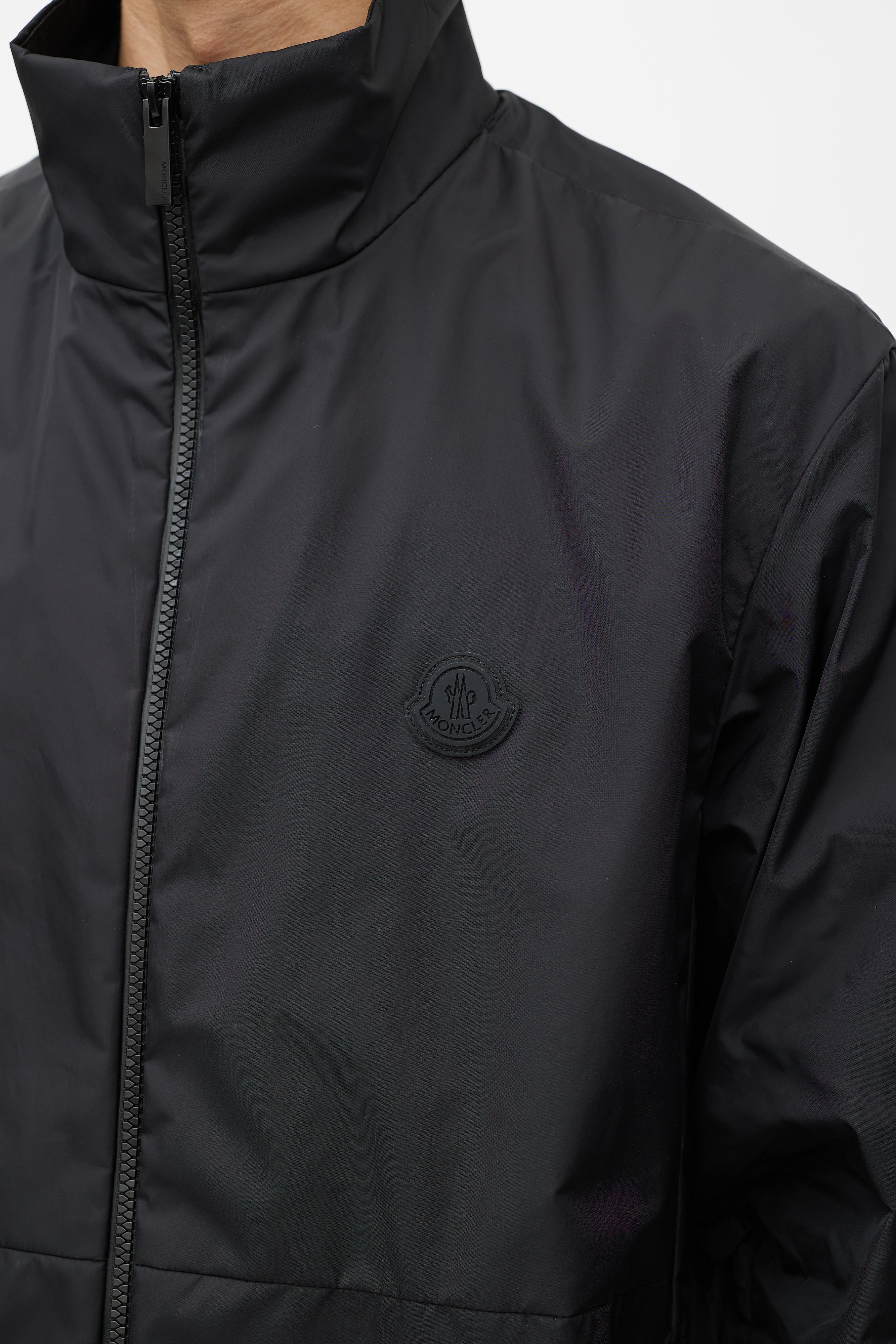Pre-owned Moncler black nylon zip up jacket featuring tonal rubber logo patch at chest, zip up front closure, two zip pockets at hip, elasticated cuffs and hem, and white printed logo at inner collar.
