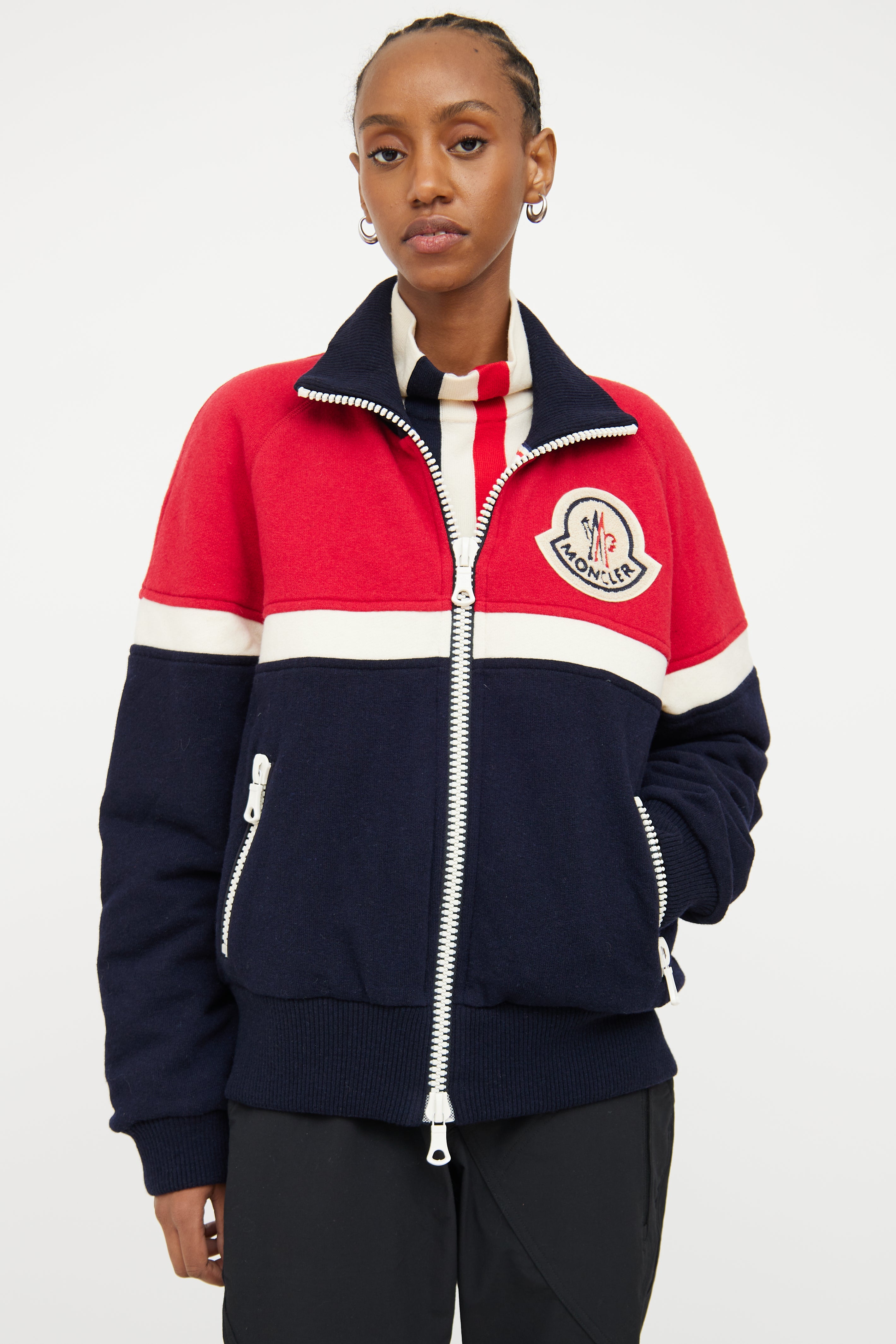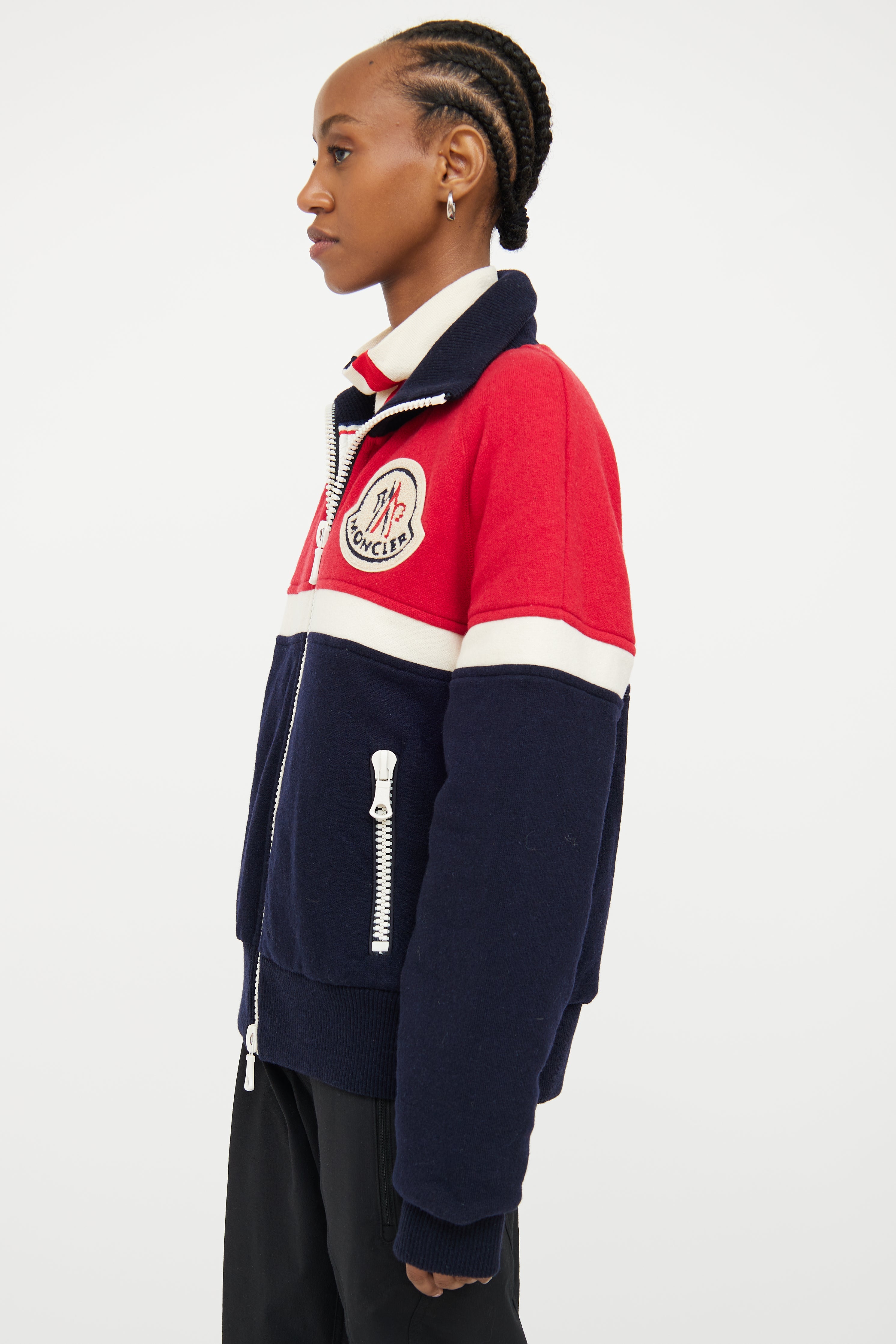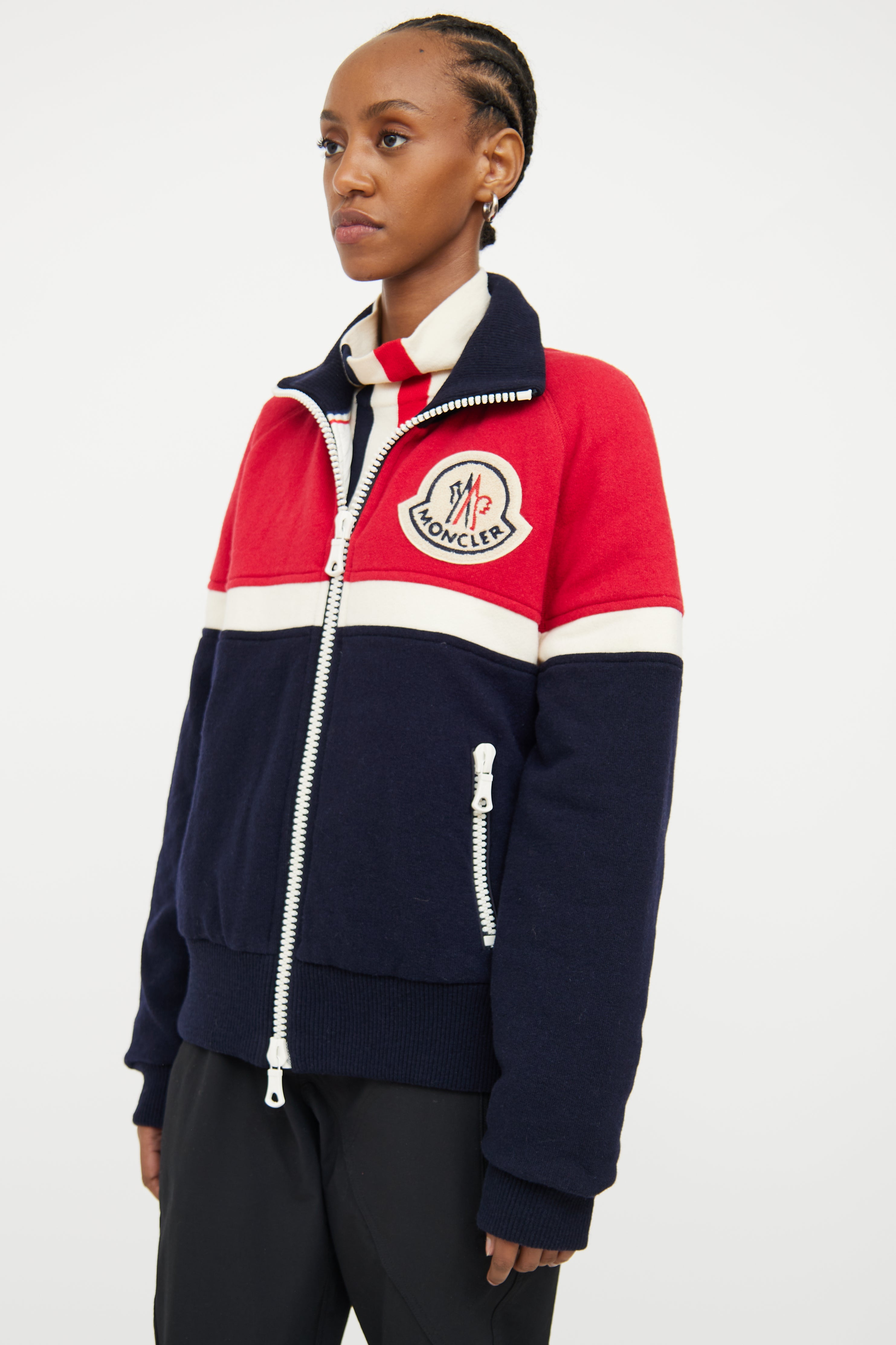 Pre-owned Moncler navy and red Maglion long sleeve cardigan featuring stand collar, zip up, striping, ribbed cuffs and hem, logo patch on left chest and dual zip pockets on waist.