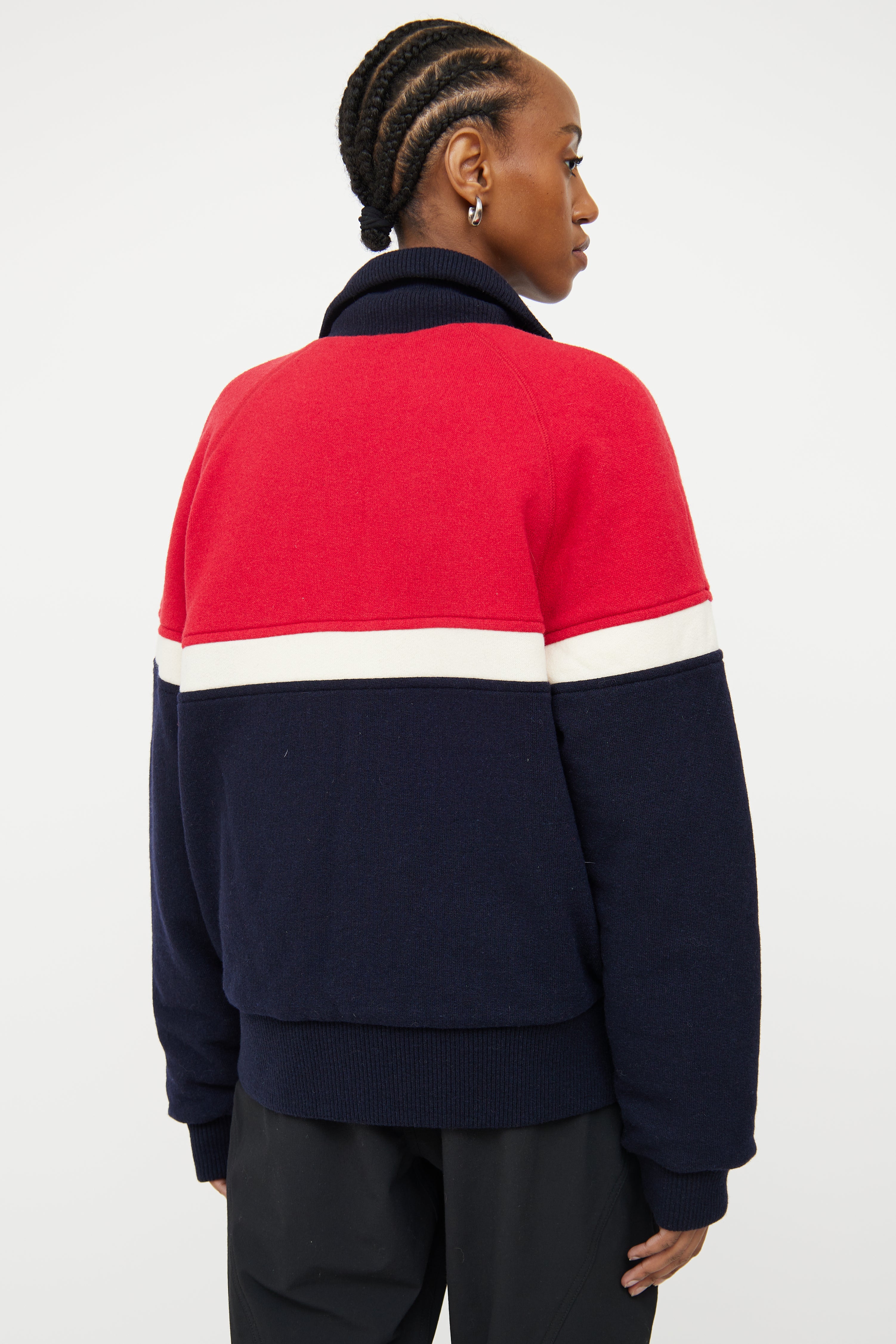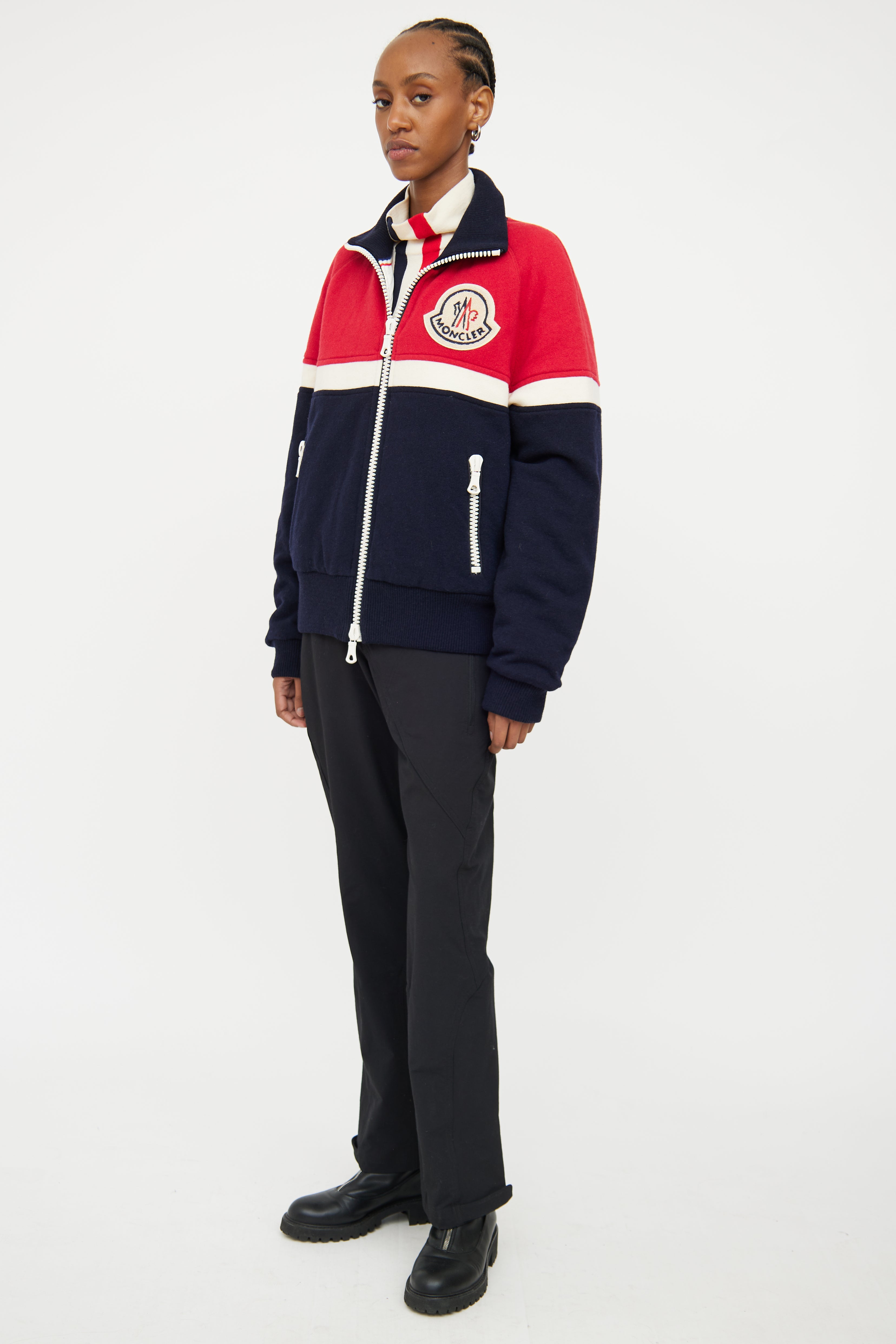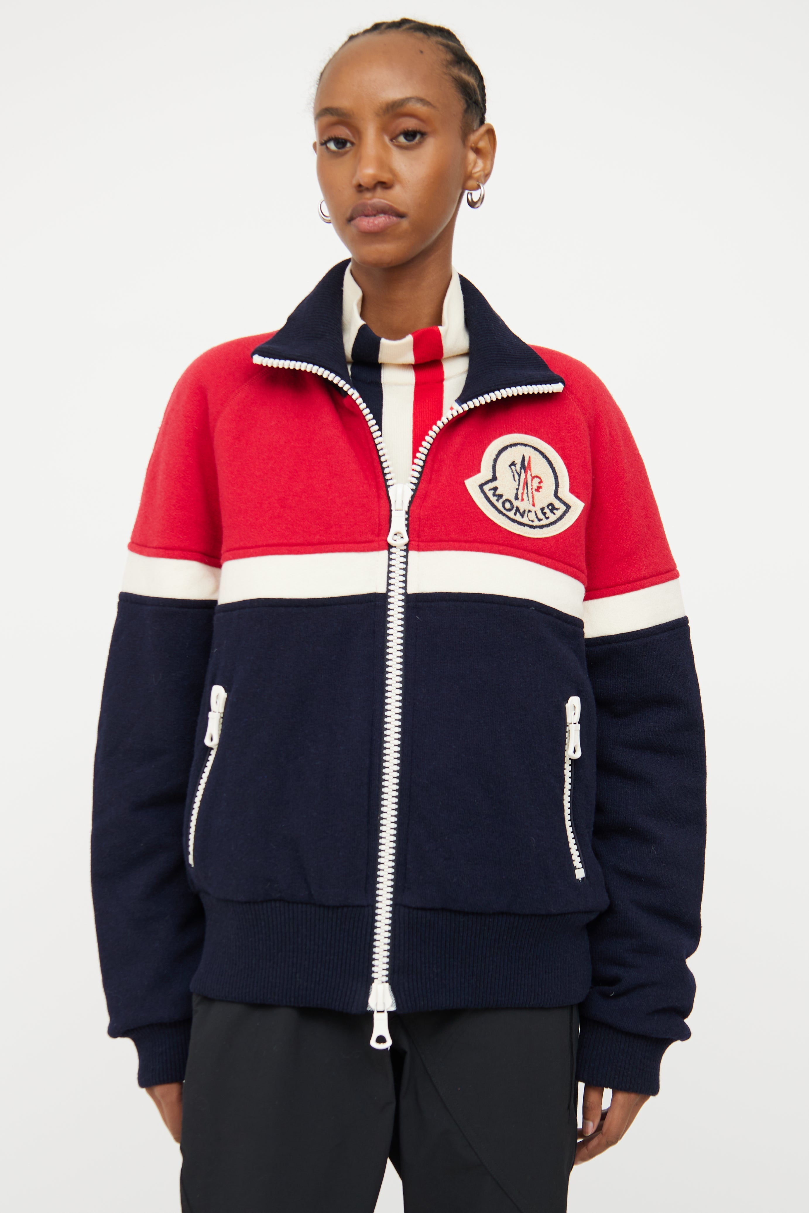 Pre-owned Moncler navy and red Maglion long sleeve cardigan featuring stand collar, zip up, striping, ribbed cuffs and hem, logo patch on left chest and dual zip pockets on waist.
