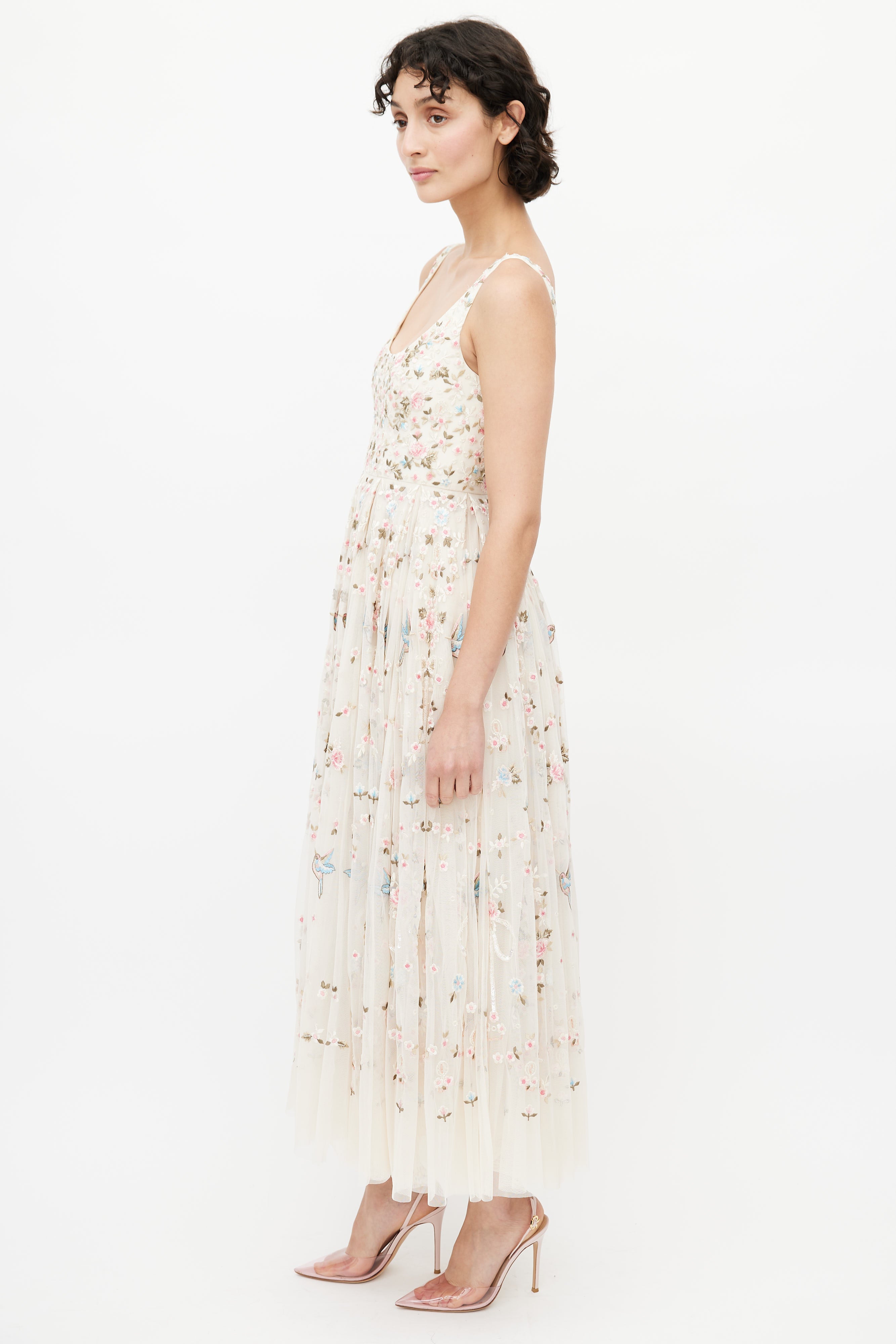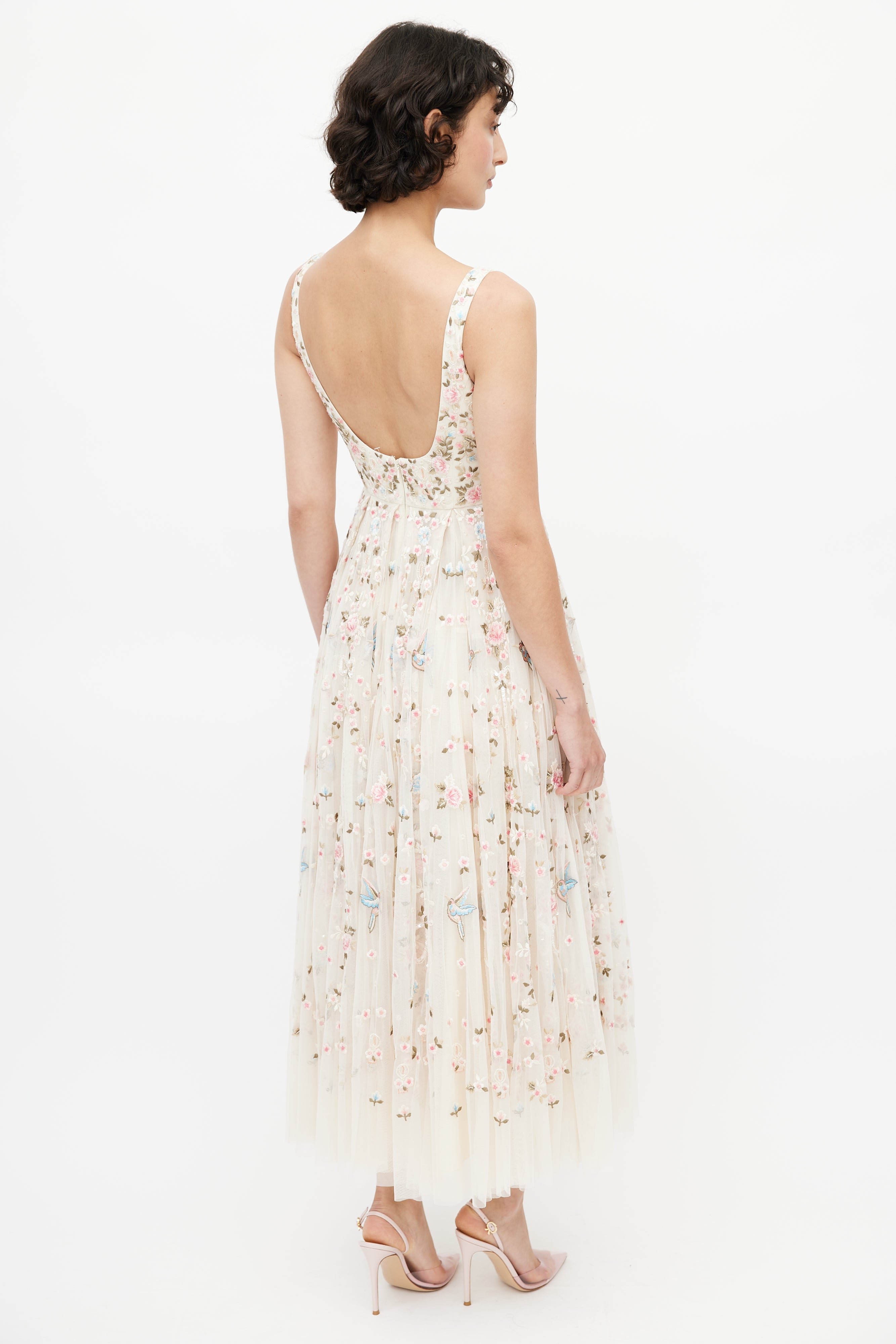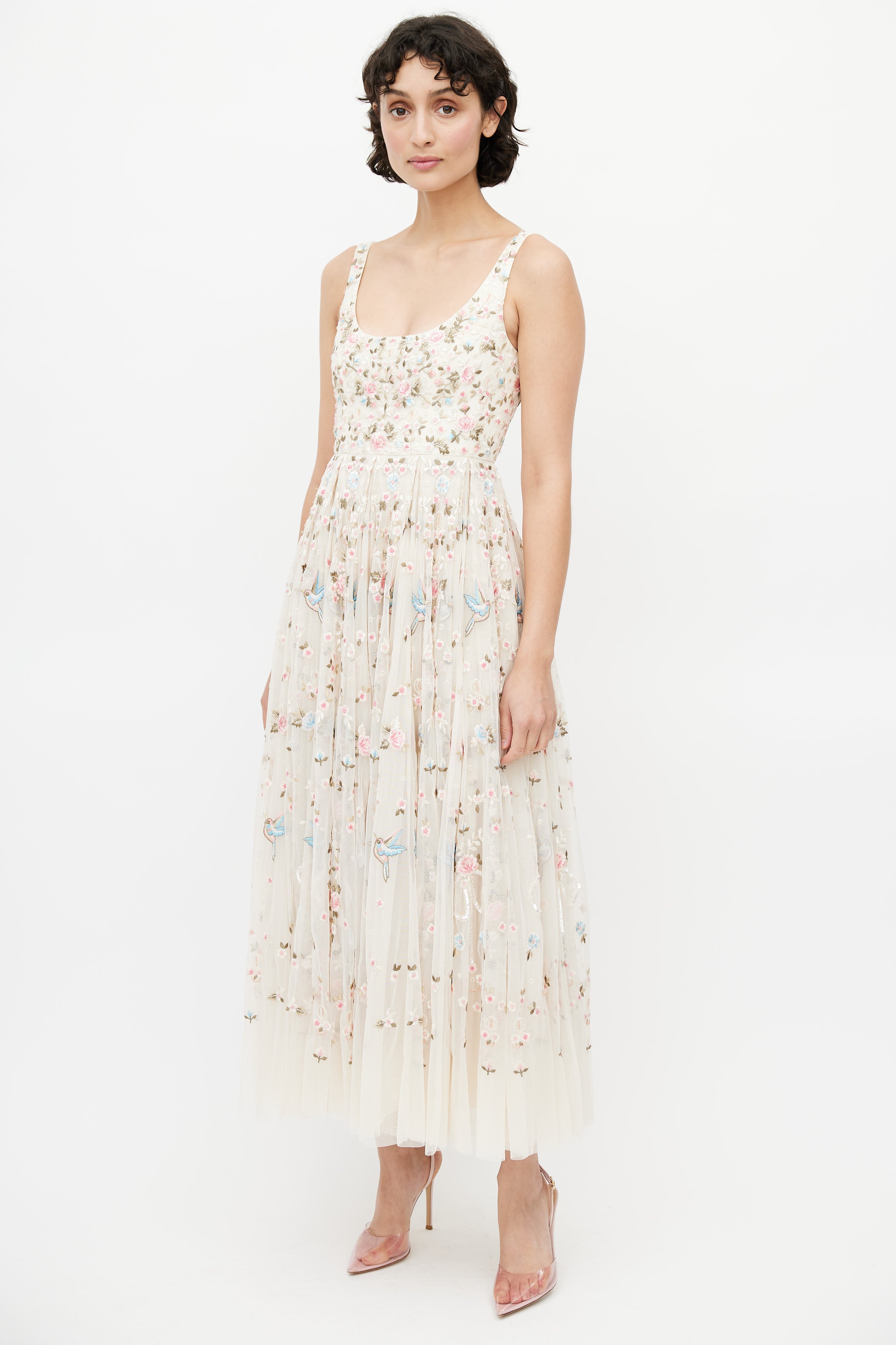 Pre-owned Needle & Thread beige tulle dress featuring a multicolour floral embroidery throughout, scoop neckline, pleated skirt, and zip at back with hook and eye closure. Lined.