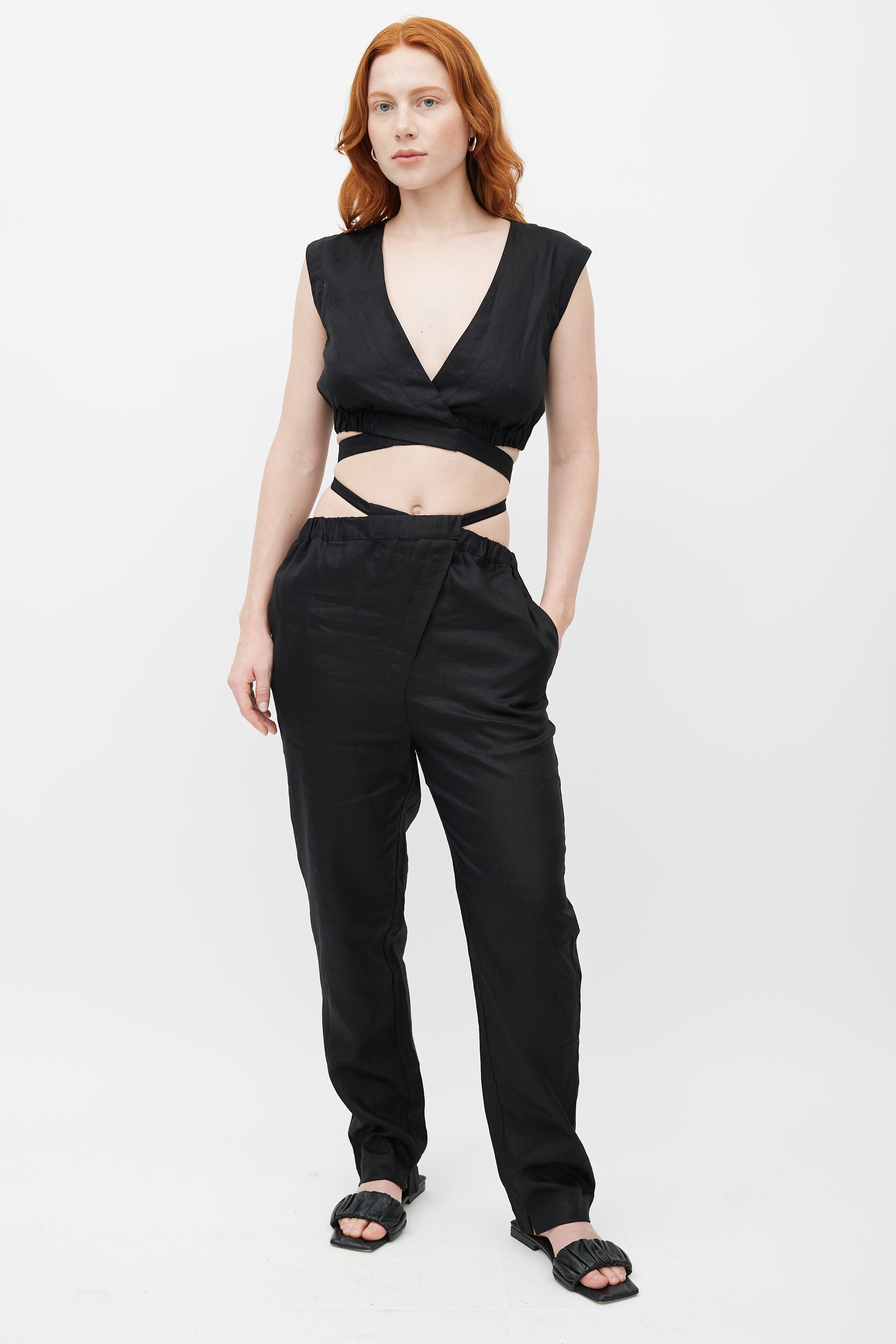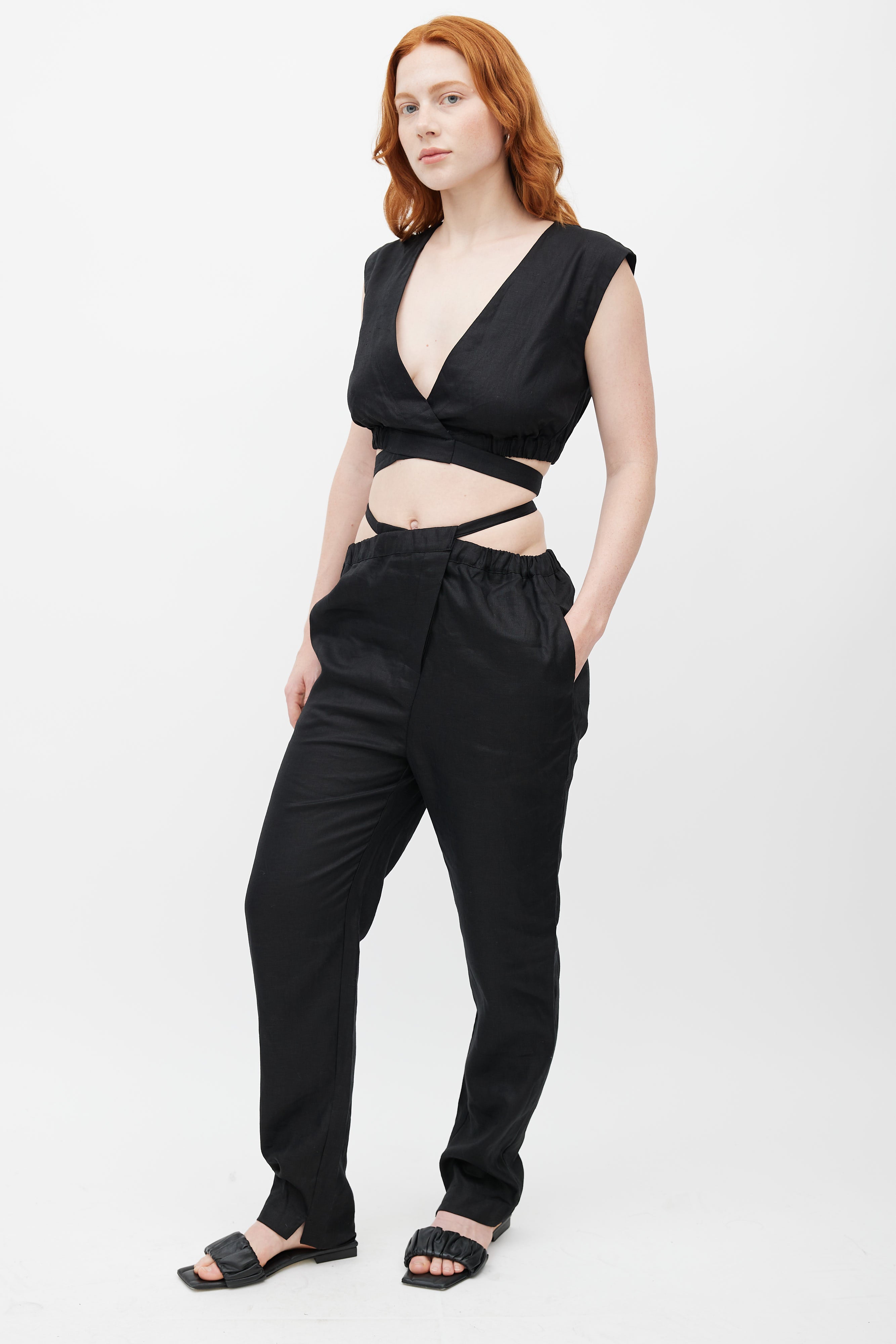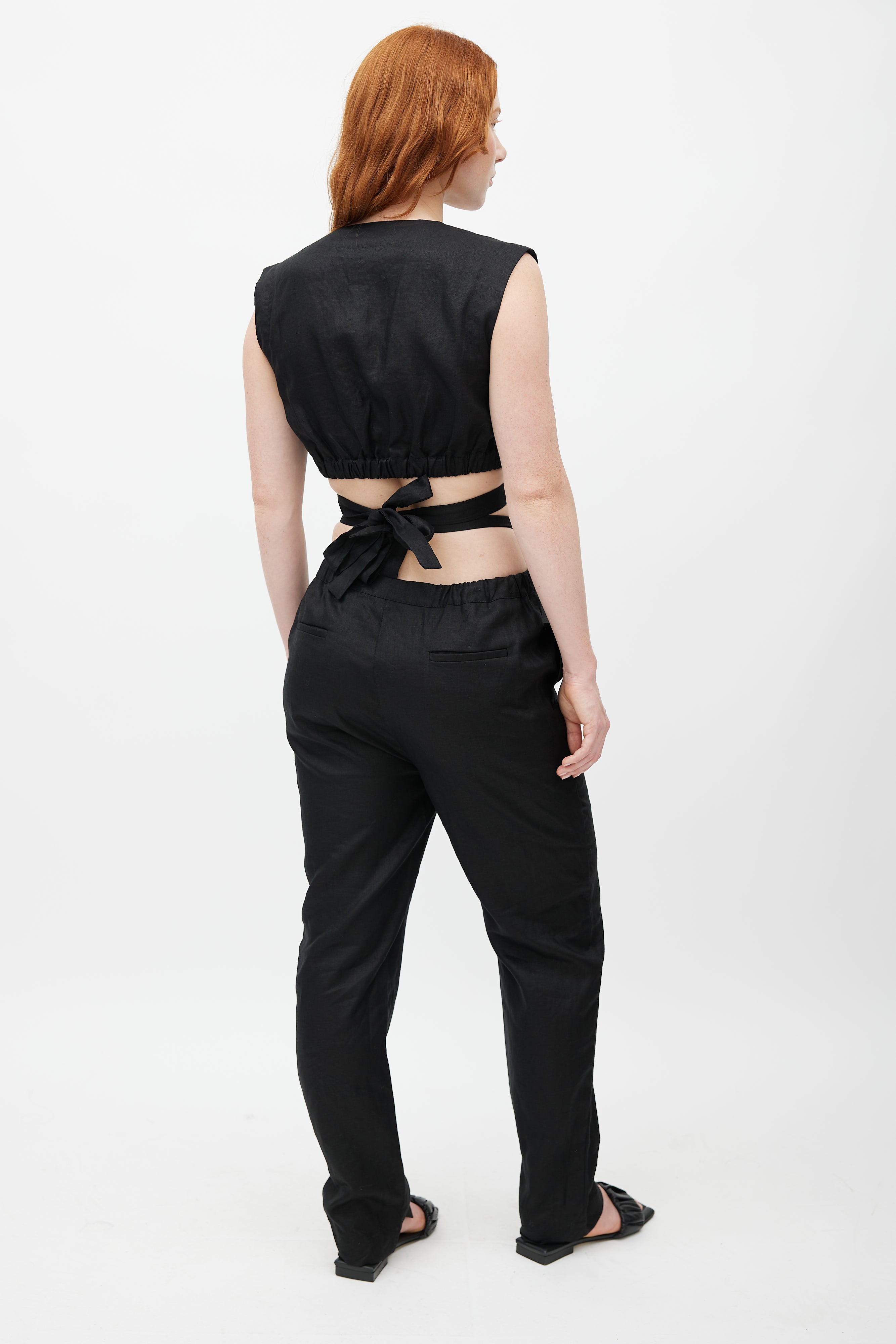 Pre-owned Nicholas black linen top featuring V-neckline, sleeveless styling, elasticized hem, and tie wrap front. Matching trousers feature an elasticized waist, two slash pockets at hip, two welt pockets at back, slim leg, button fly, and tie wrap front.