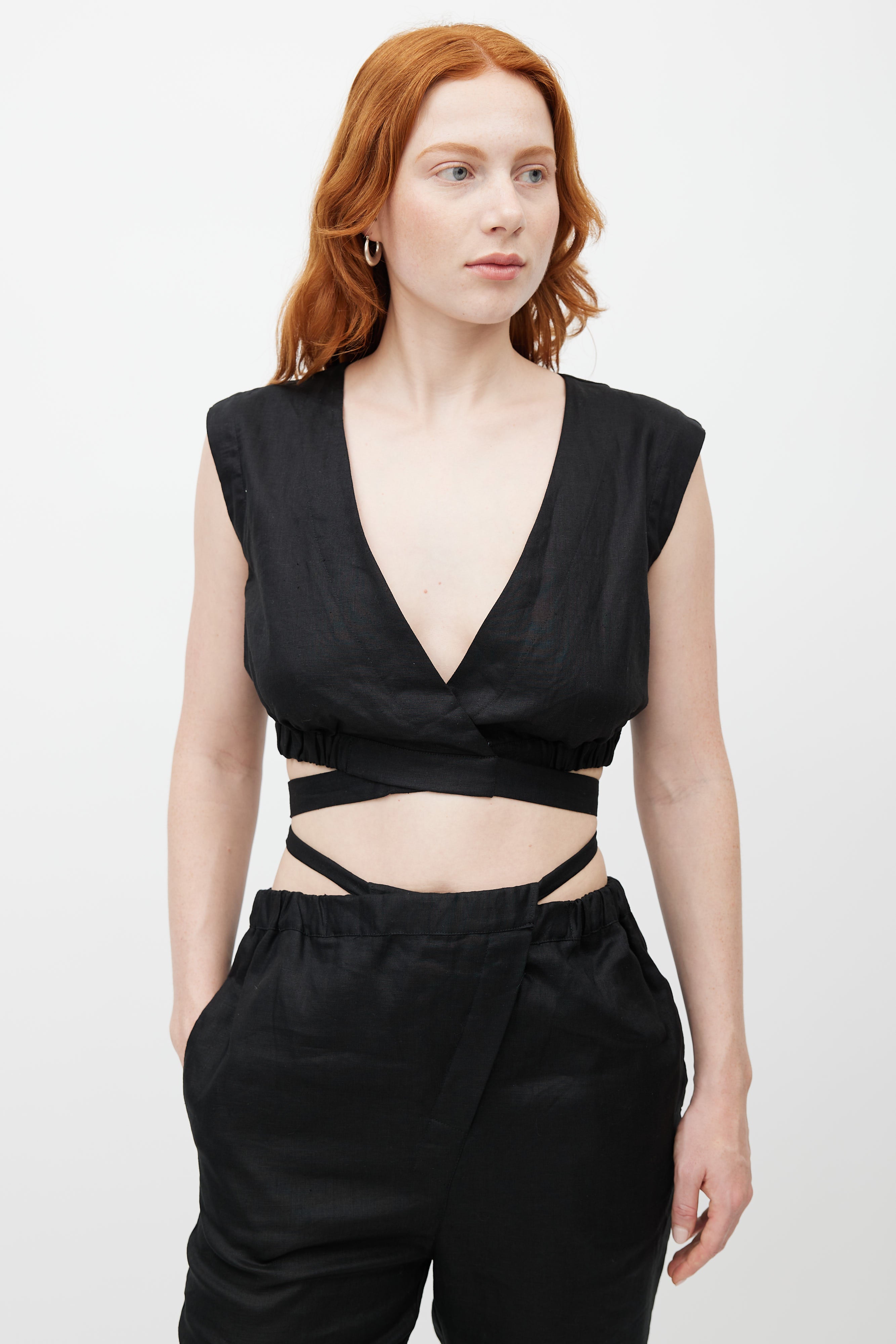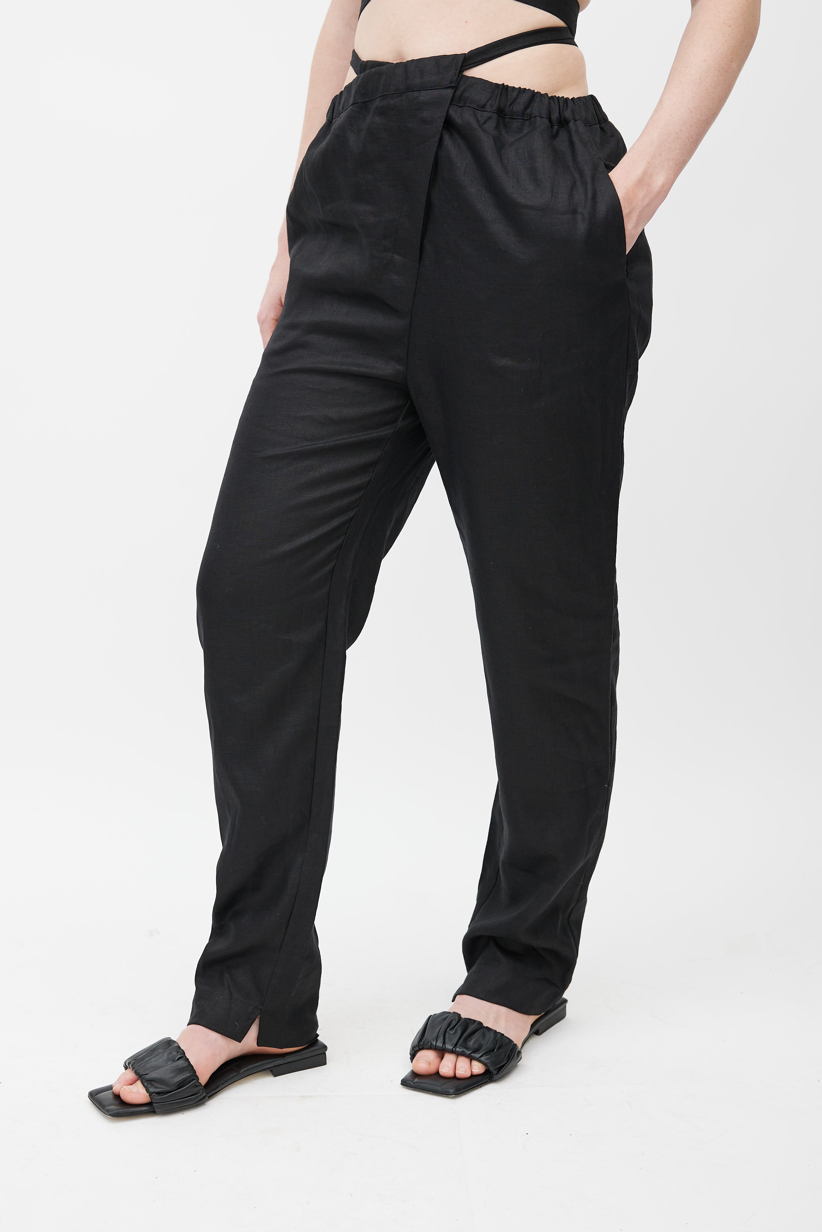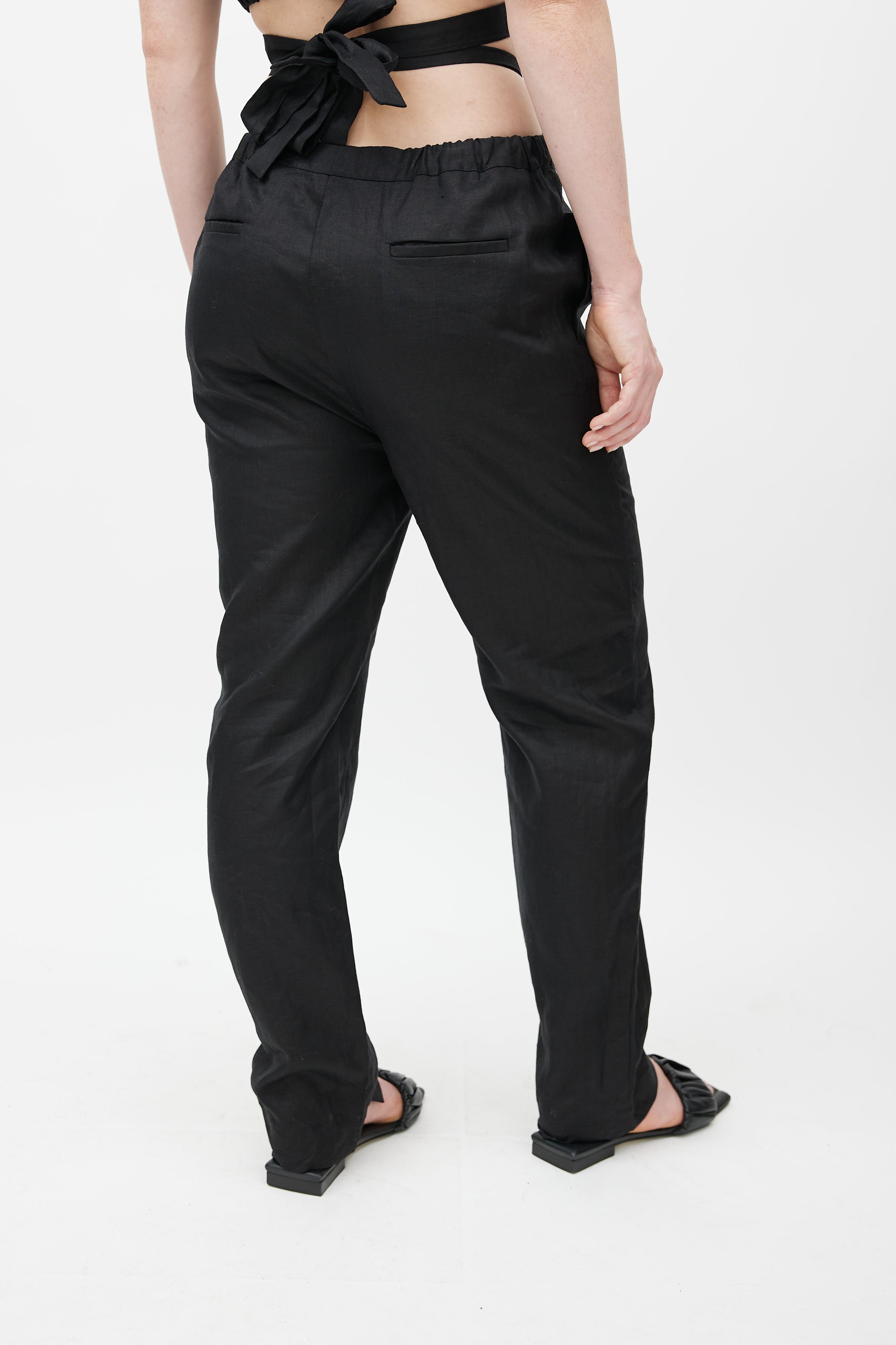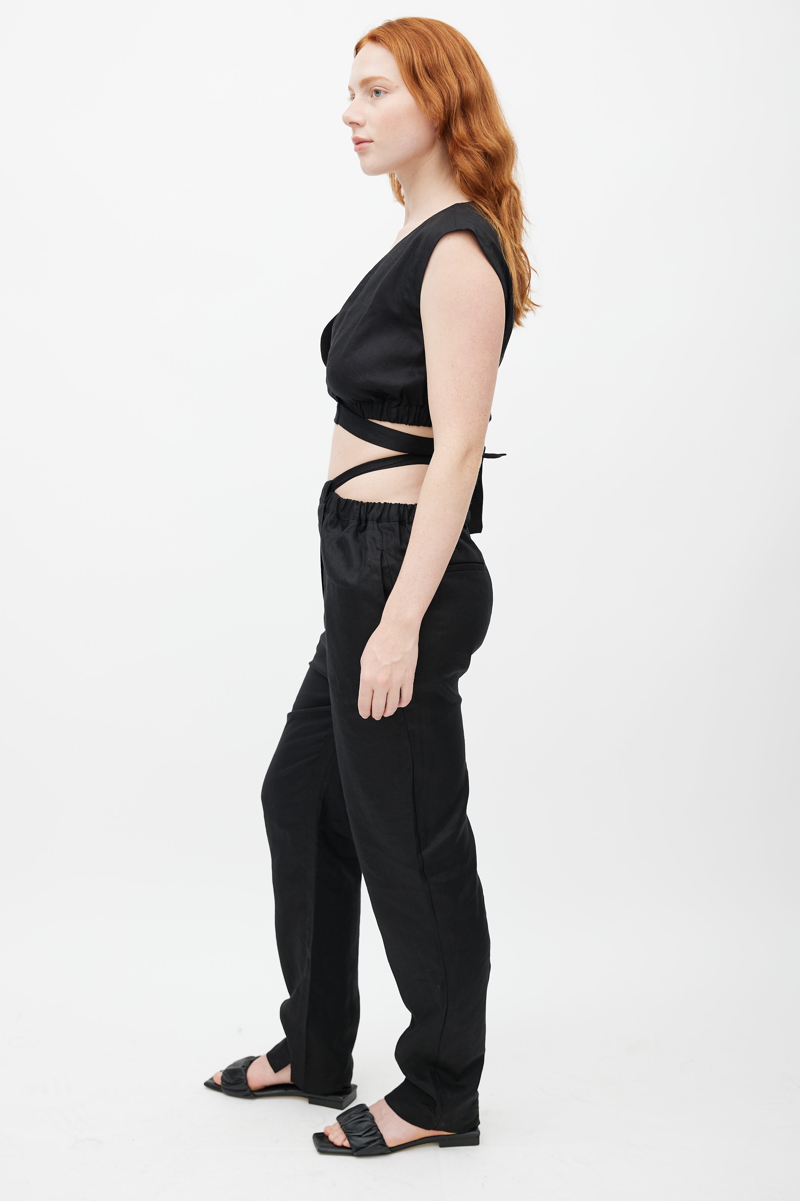 Pre-owned Nicholas black linen top featuring V-neckline, sleeveless styling, elasticized hem, and tie wrap front. Matching trousers feature an elasticized waist, two slash pockets at hip, two welt pockets at back, slim leg, button fly, and tie wrap front.