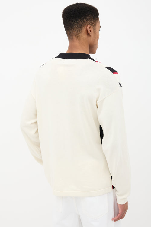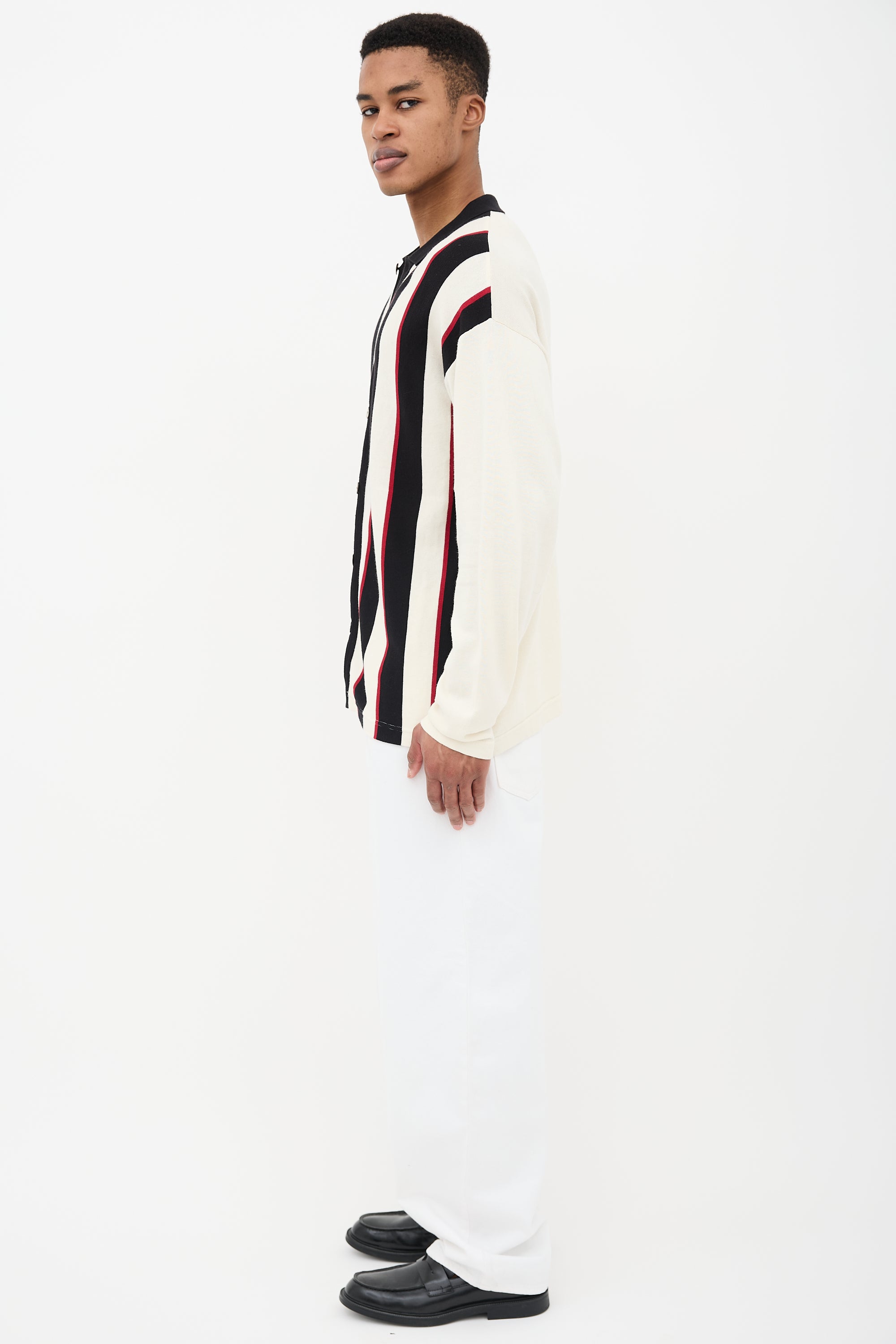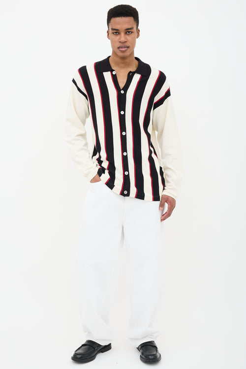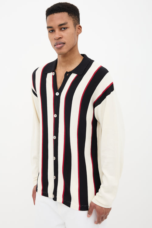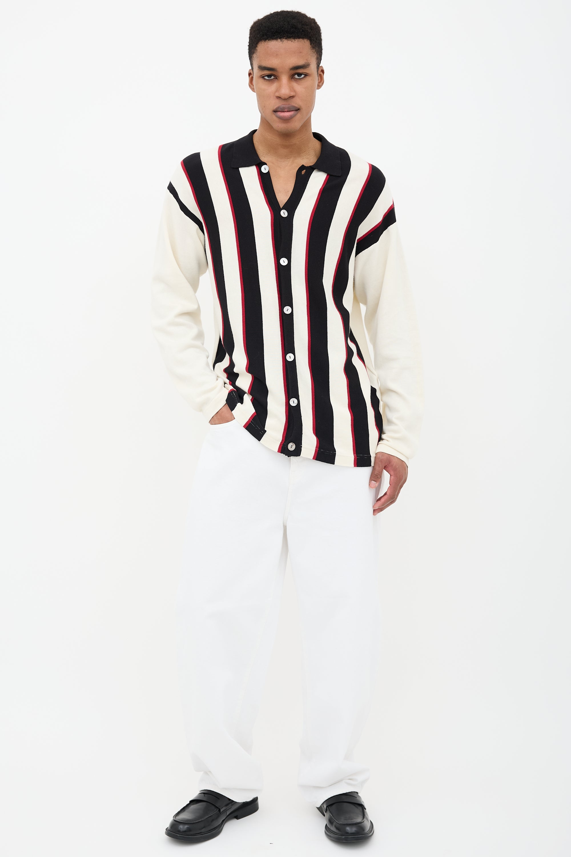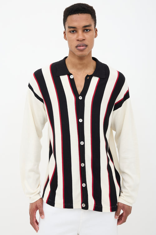 Pre-owned Oscar de la Renta Studio cream, black, and red cardigan featuring vertical stripes at front body, spread collar, and button front.