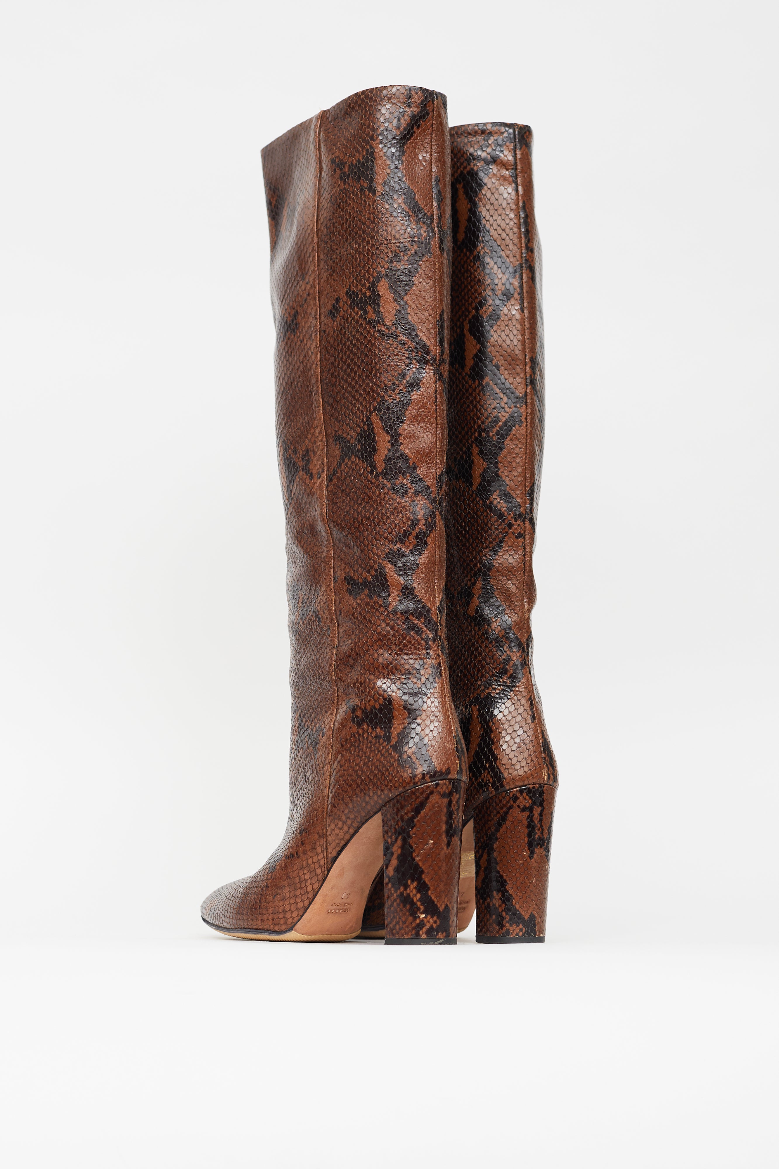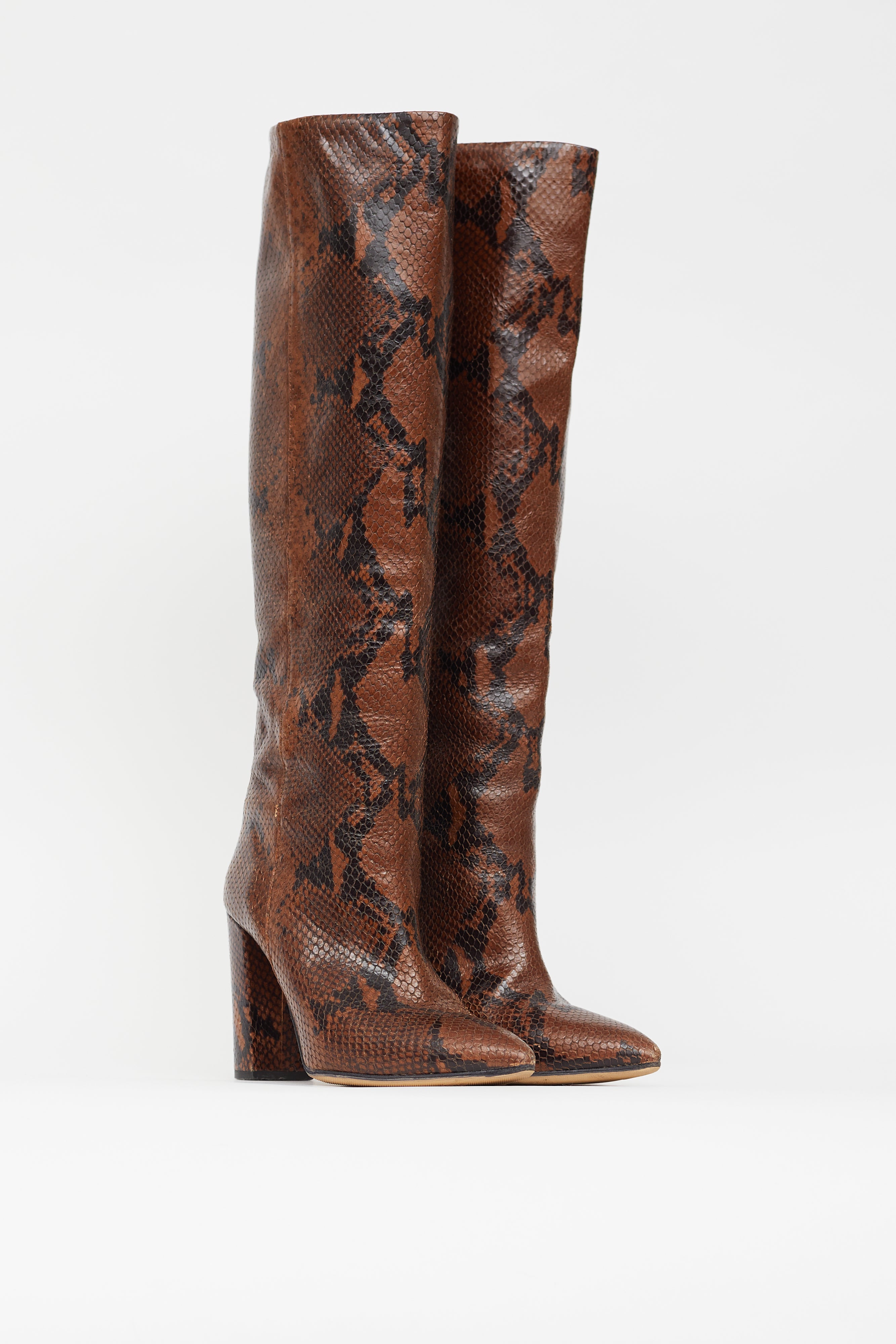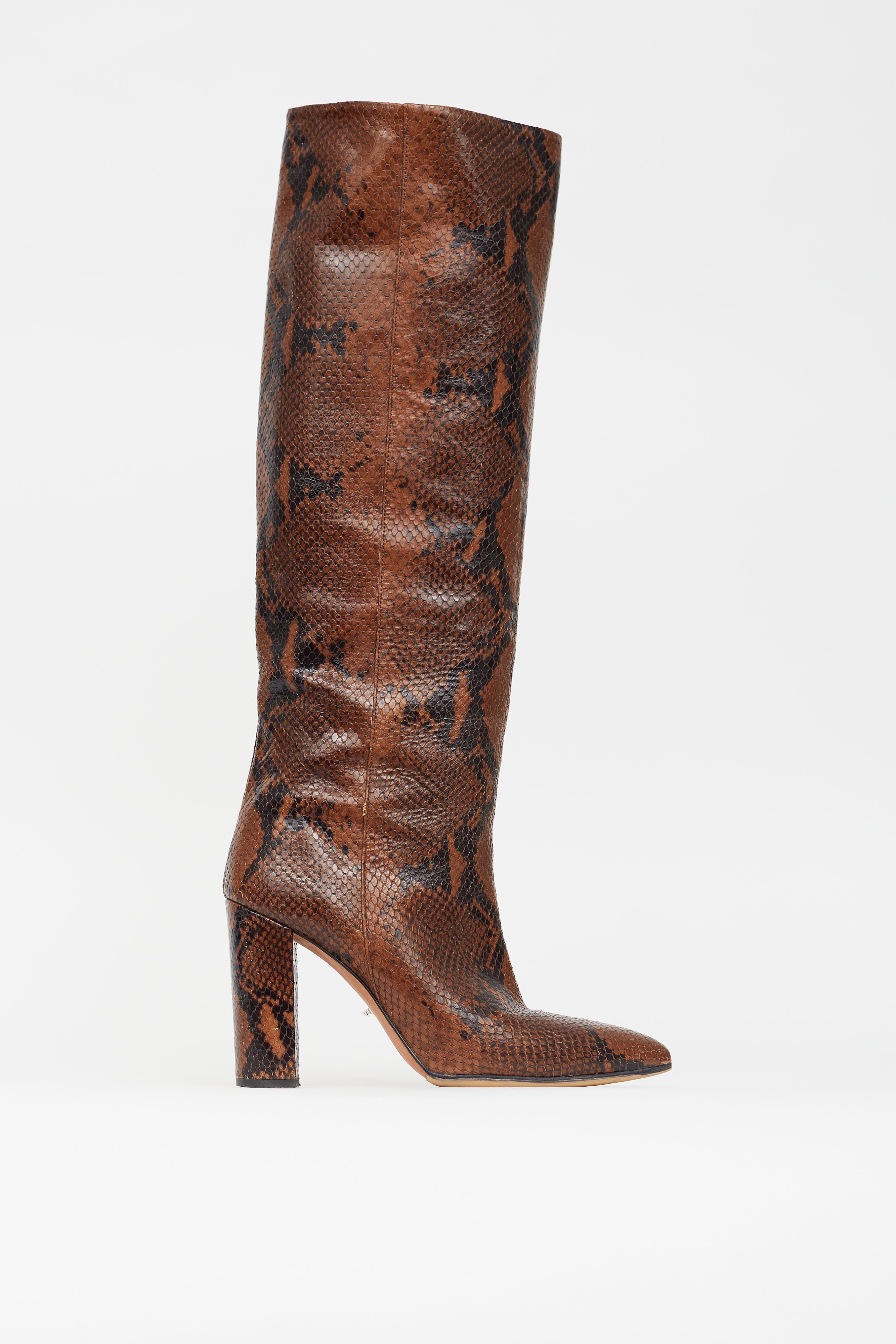 Pre-owned Paris Texas high heeled knee high boot featuring brown snakeskin effect upper, covered heel, pointed toe, leather outsole and leather insole.