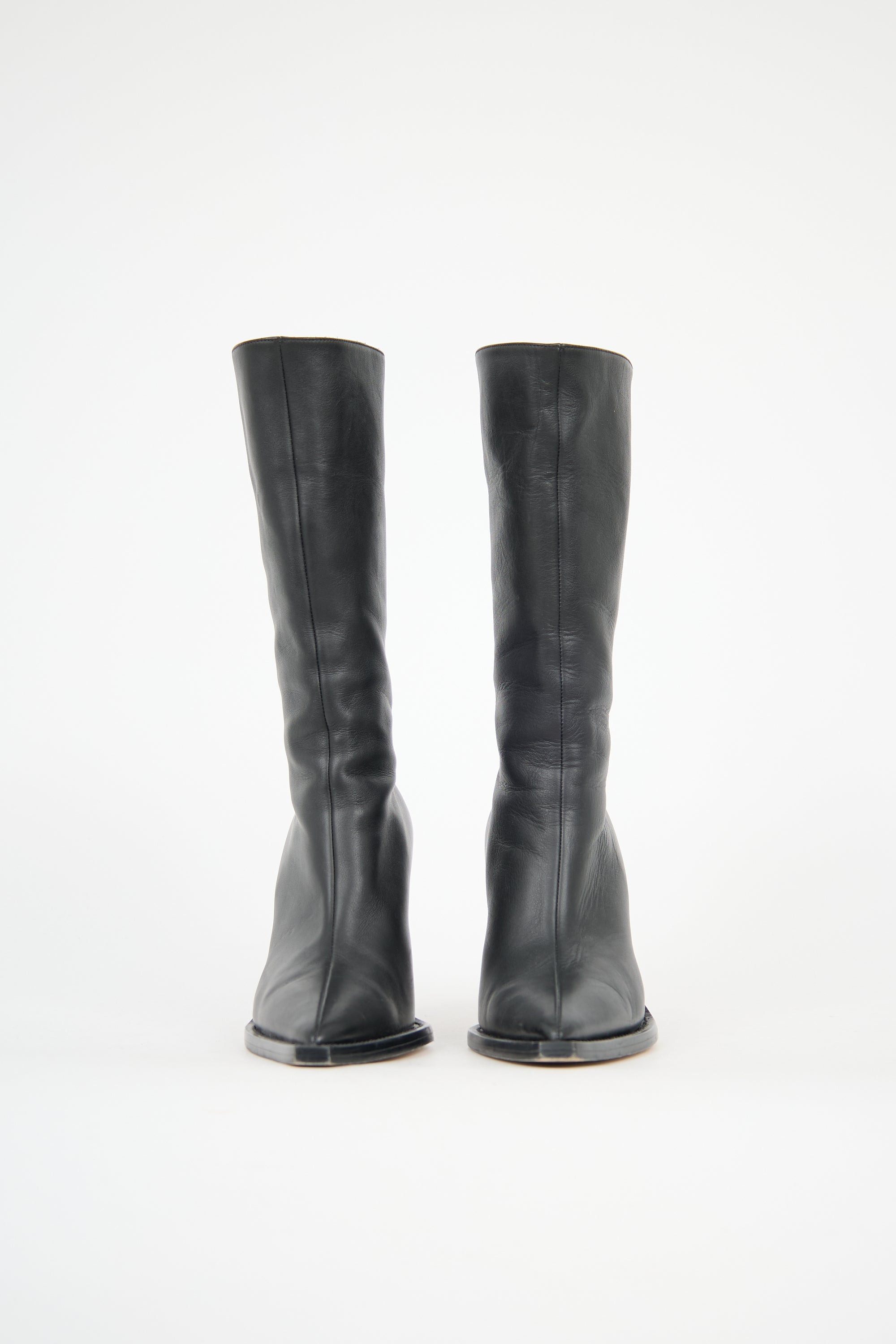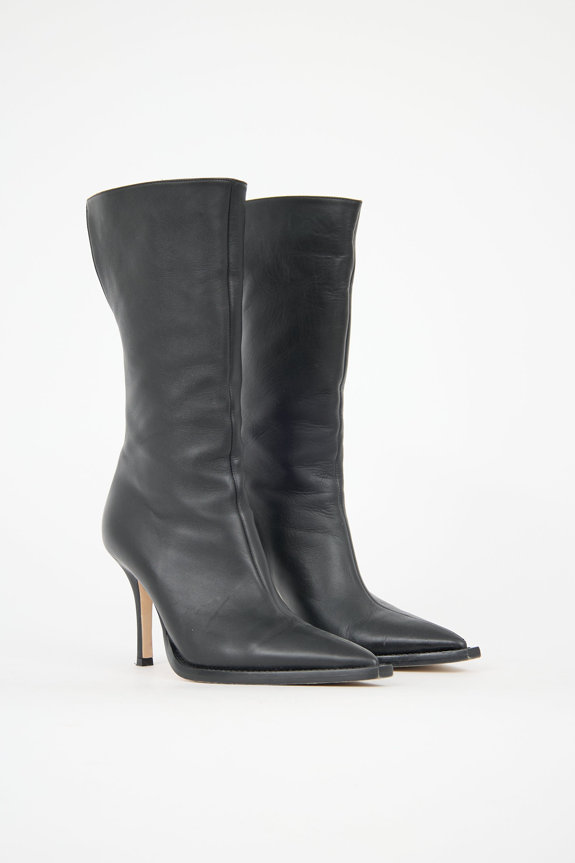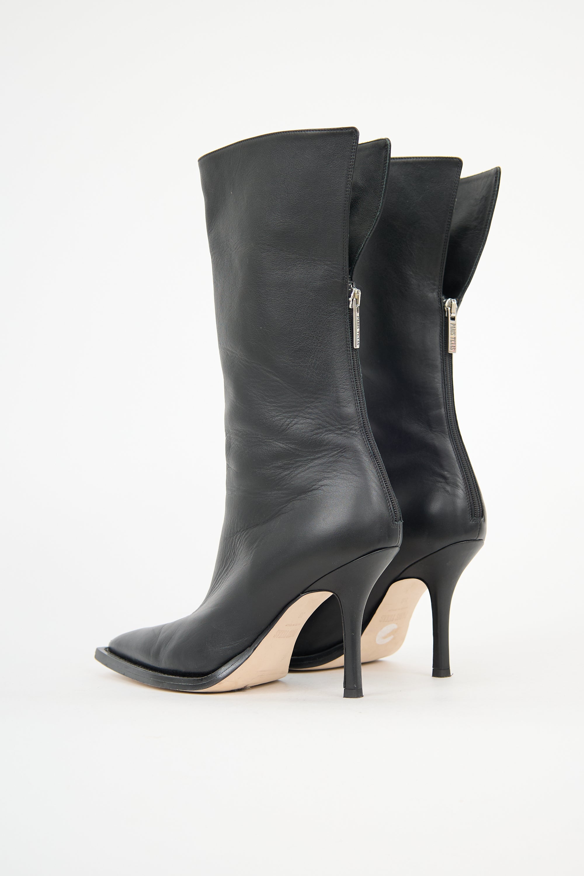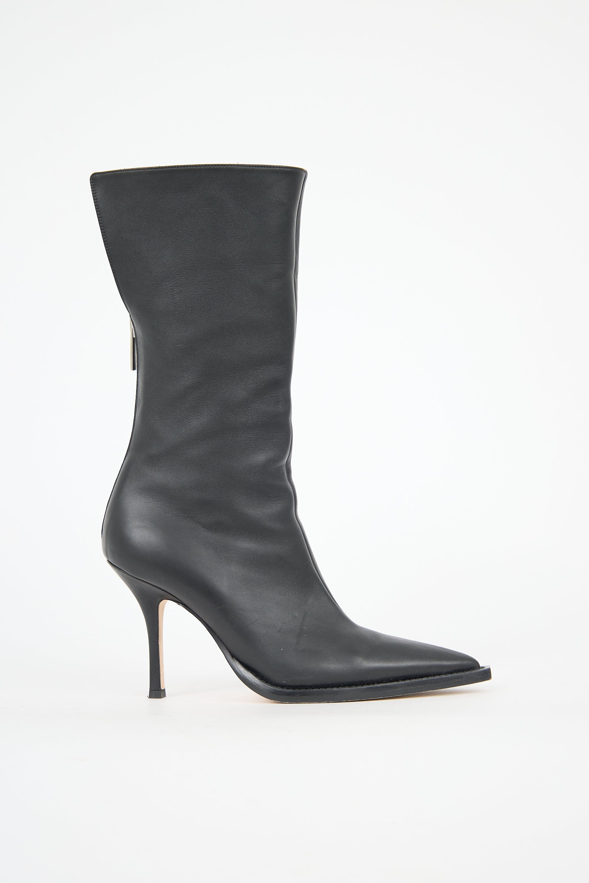 Pre-owned Paris Texas black leather boots featuring a pointed toe, back zip, cutout collar, and covered continental heel.