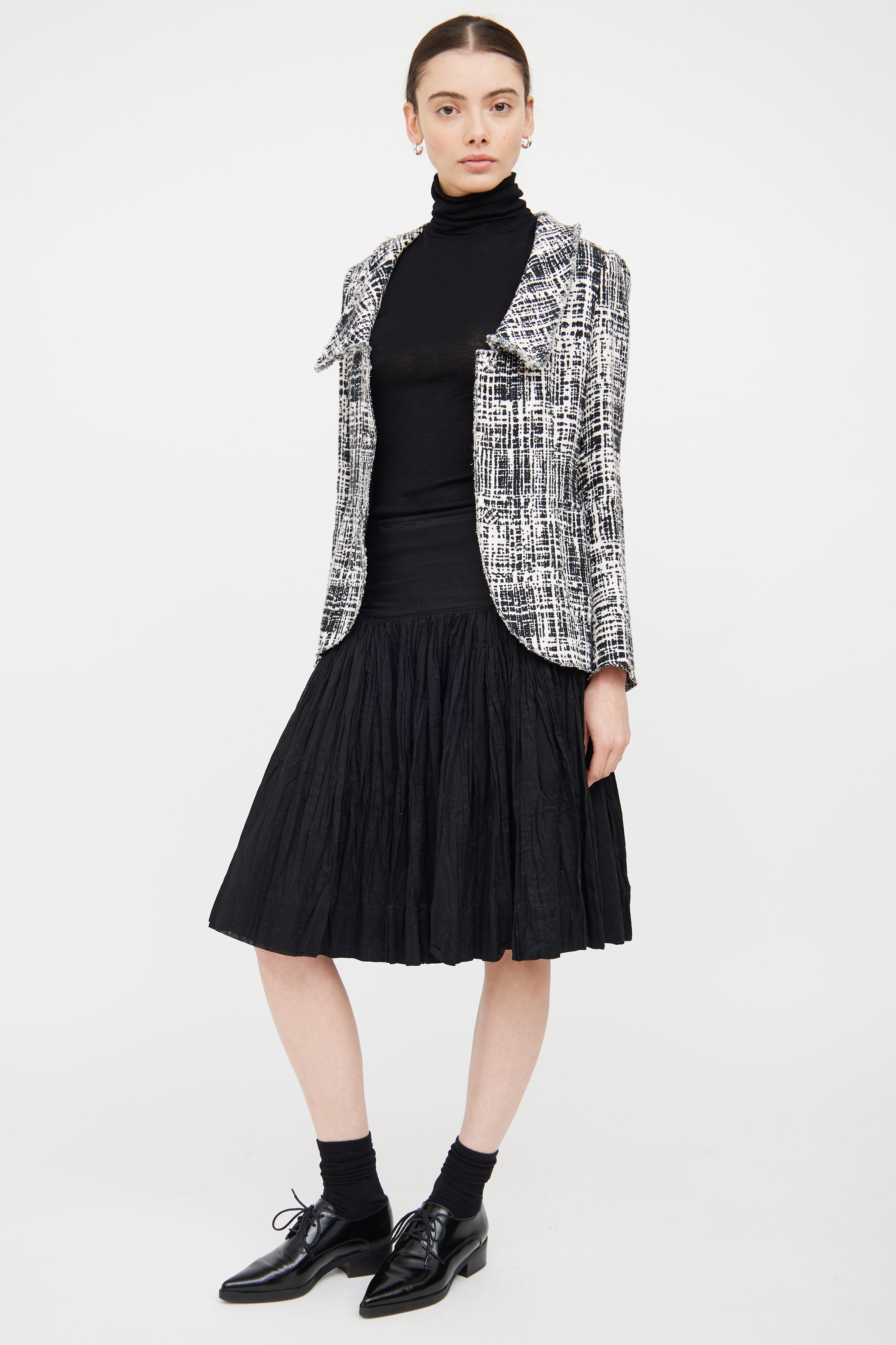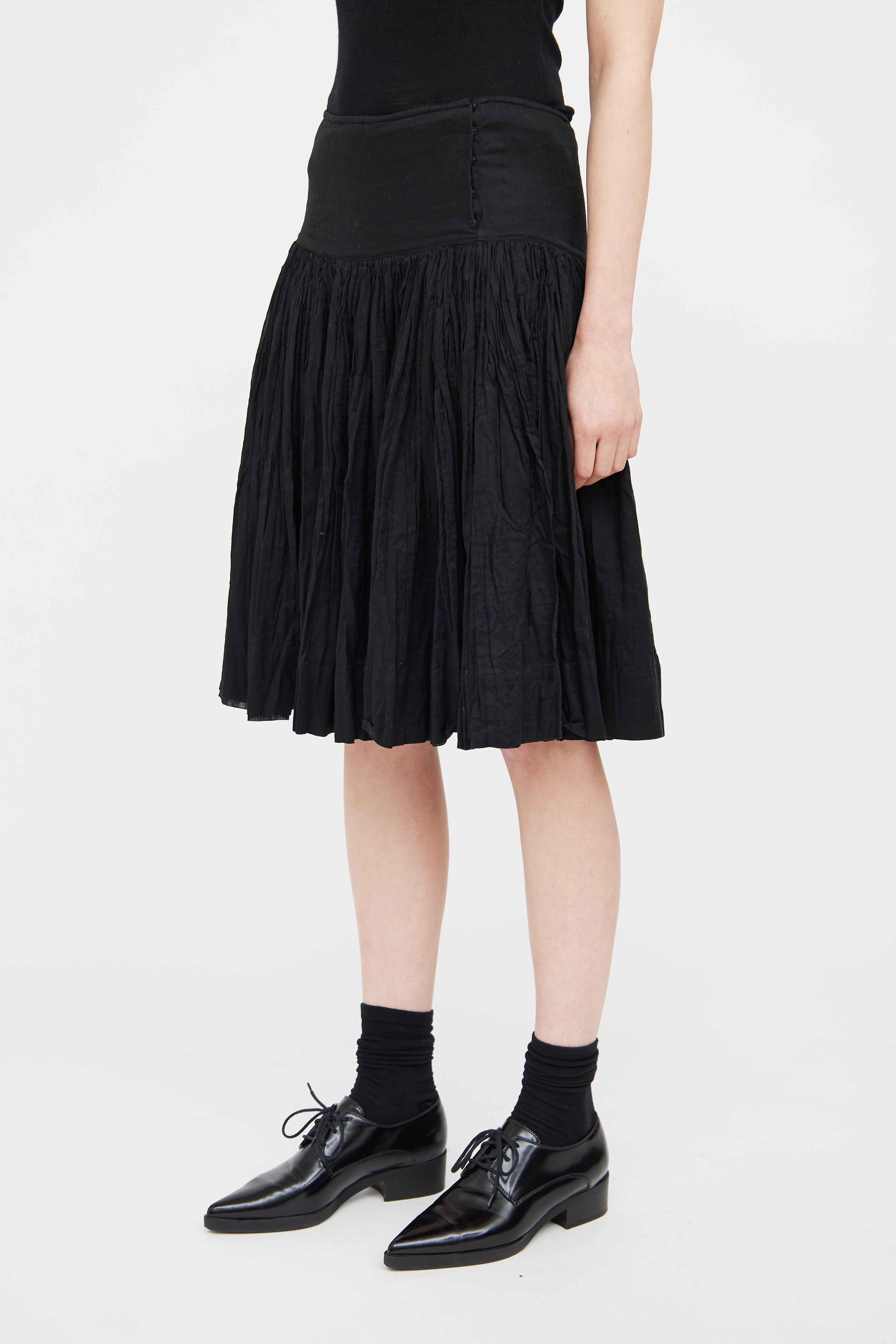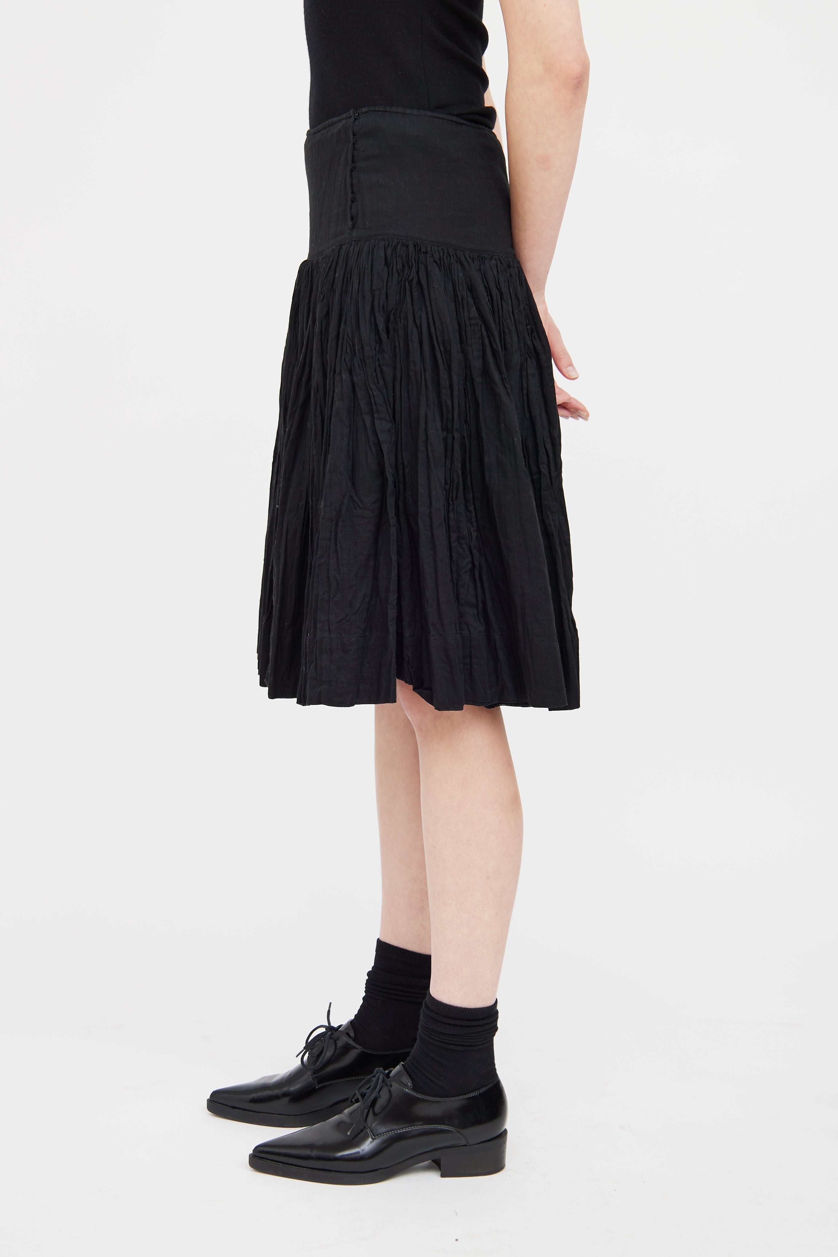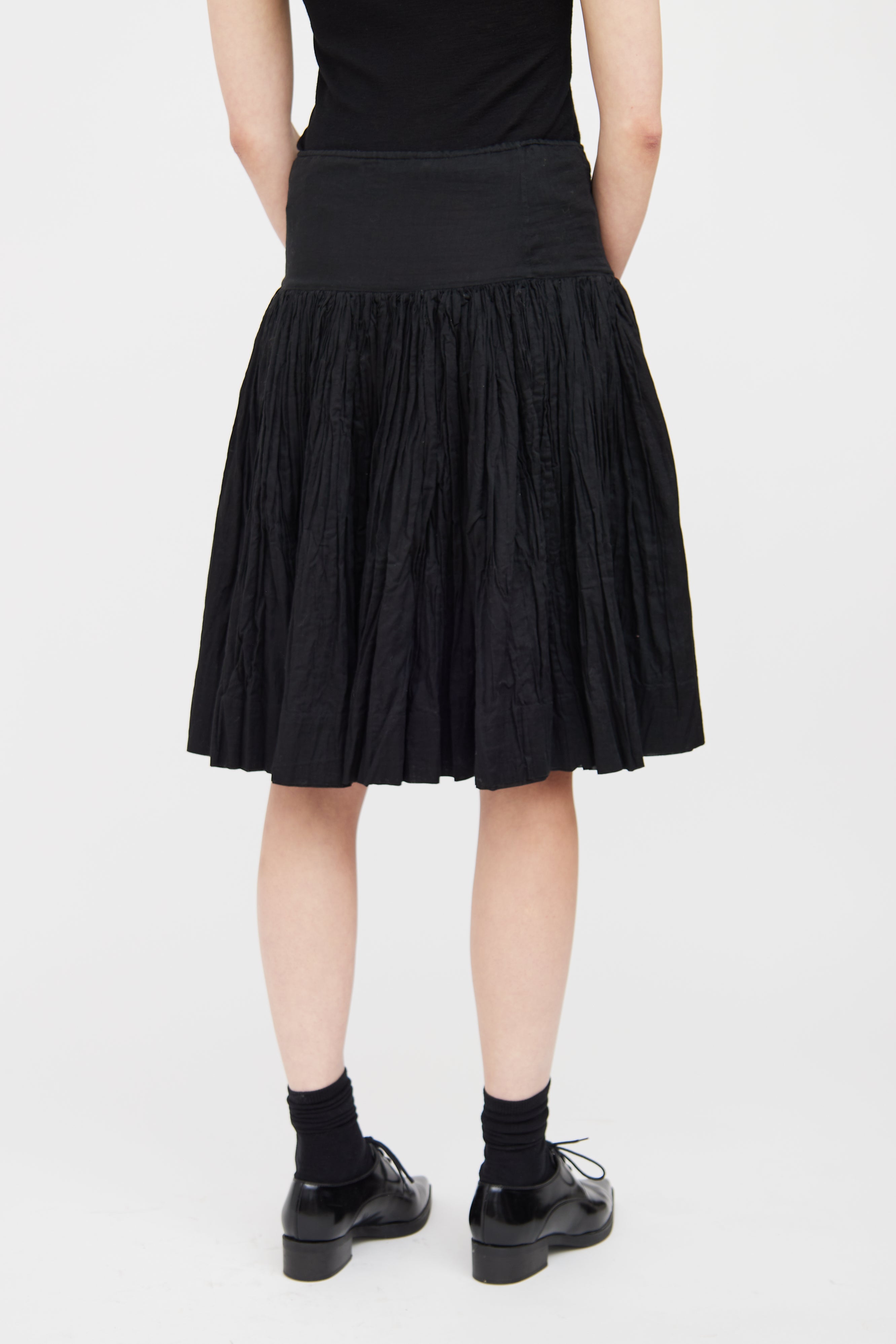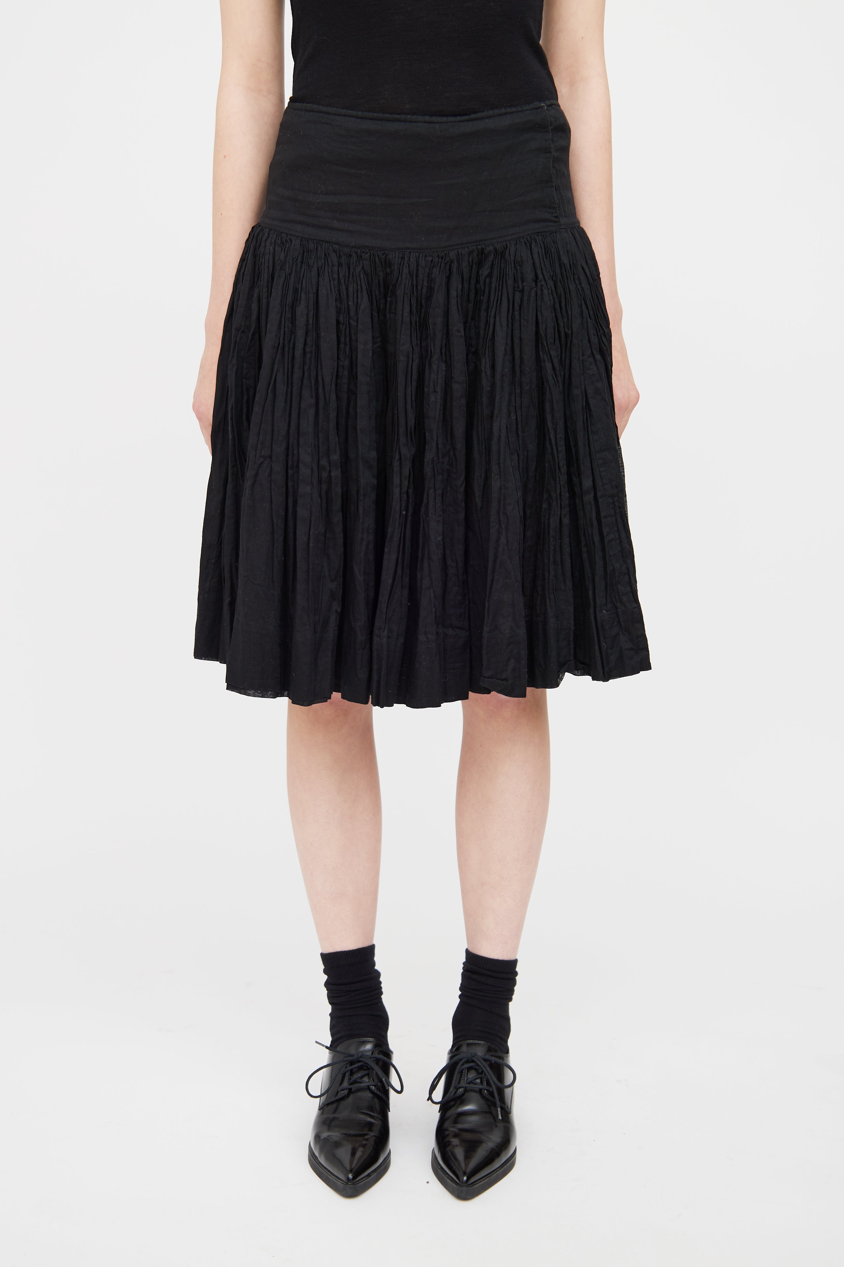 Pre-owned Prada black cotton mid length skirt featuring flat low waistband with concealed snap closure at side, slight flare and pleat detailing throughout. Fully lined.